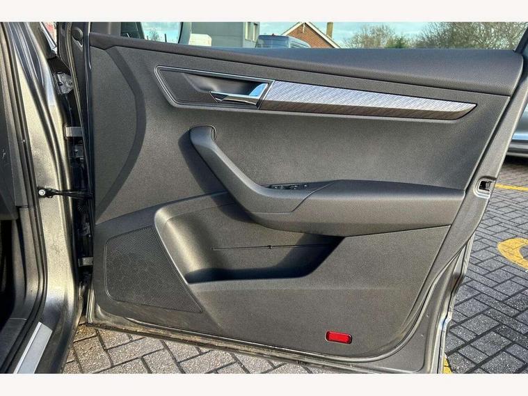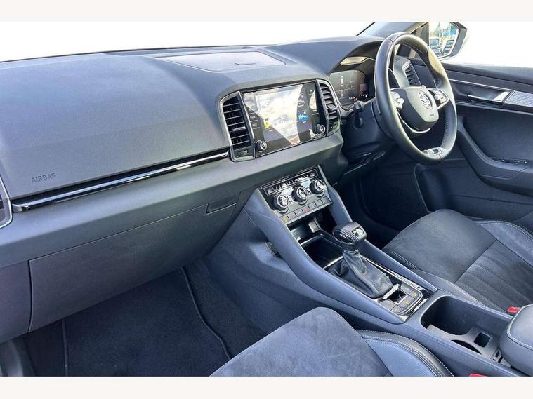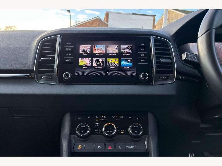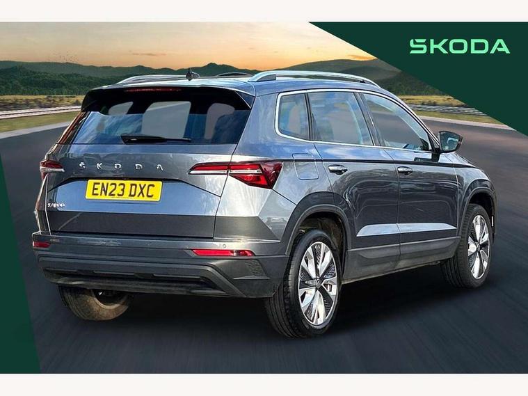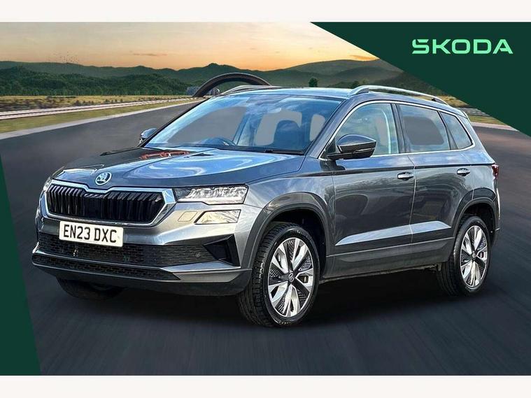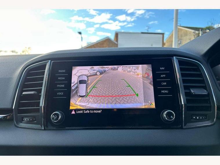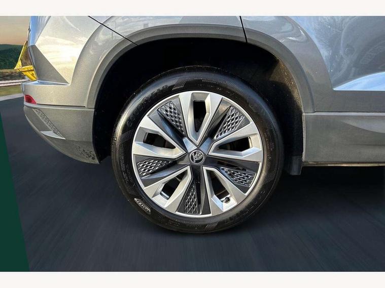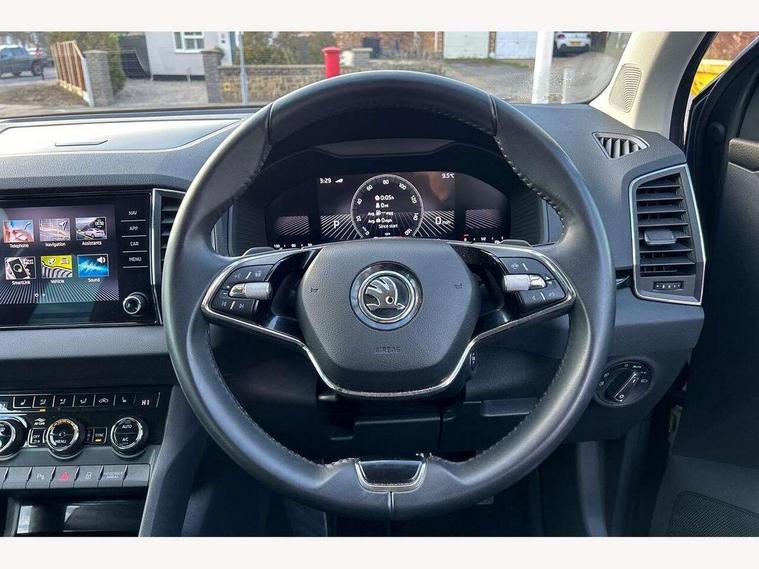 8" Digital display, Care connect, Driver fatigue sensor, Emergency services call system, Outside temperature gauge, Service interval indicator, SmartLink wireless for Apple and wired for Android, Start/stop system with regenerative braking, USB C Port x 2 in front centre console, 8 speakers, DAB radio with Bluetooth, USB connection, Acoustic glass, Aero front windscreen wipers with intermittent function, Auto dimming rear view mirror with light and rain sensors, Black electric window control buttons, Body colour door mirrors and handles, Dynamic headlight range control with cornering light function, Electric front and rear windows with child proof lock, Heated rear windscreen, LED daytime running lights, LED rear lights with high functionality welcome effect and dynamic indicators, Light assistant (coming/leaving home/tunnel light), Plastic scuff plates, Privacy glass, Rear side wing doors, Rear spoiler, Rear window wiper with washer system and intermittent control, Safety reflectors on front doors, 1.5 litre bottle holders in driver and front passenger door panels, 12V socket in boot, 12v socket in front centre armrest with storage compartment and rear air vents, 2 spoke leather heated multifunction steering wheel with DSG paddles, 2 x Tablet holder, 3 rear height adjustable headrests, 3 seat bench in 2nd row, 4 foldable roof handles with rear coat hooks, Black floor carpet, Chrome inner door handles, Decorative door sills with KAROQ badging, Double sided boot floor, Foldable hooks in the boot, Front head restraints, Height adjustable front three point seats belts with tensioners, Height/reach adjust steering wheel, Ice scraper, Illuminated glovebox, Illuminated luggage compartment, Isofix child seat preparation for front passenger seat, Isofix child seat preparation outer rear, Manual lumbar support for front seats, Pen holder, Pollen filter, Rear boot cover, Rear reading lights, Rubbish bin door, Safety vest holder, Single front passenger seat, Storage box in upper central dashboard closed, Sunvisors with illuminated vanity mirrors, Textile floor mats, Ticket holder, Tool kit, VarioFlex seats with standard rear seat release, Boot pack - Karoq, Chrome roof rails + chrome pack - Karoq, Parking pack - Karoq, Automatic door unlocking in case of crash, Automatic fuel cut off in case of crash, Child locks on rear doors, Driver airbag, Electronic parking brake with auto hold function, Emergency rear braking signal, ESC including ABS, MSR, ASR, EDS, HBA, DSR, RBS, MKB and traction control, Front side airbags, Hill hold control, Knee airbags, Passenger airbag with switch-off function, Pedestrian monitor, Seatbelt reminder signalisation and pretensioner for all seats, Three point seatbelts rear, Two tone horn, Tyre pressure display, Tyre pressure monitor, Alarm with interior monitoring, back up horn and tilt sensor with safe function, Electronic engine immobiliser, Keyless entry and start/stop, Remote central locking with 2 remote folding keys, Chrome framed air vents, 18" Procyon silver alloy wheels with anthracite aero inserts, Anti-theft wheel bolts protection, Storage on wheel cover,