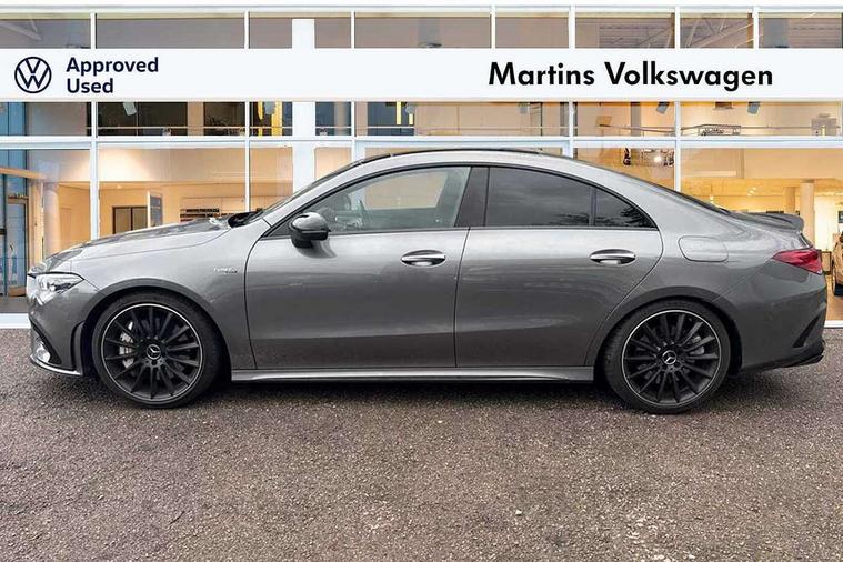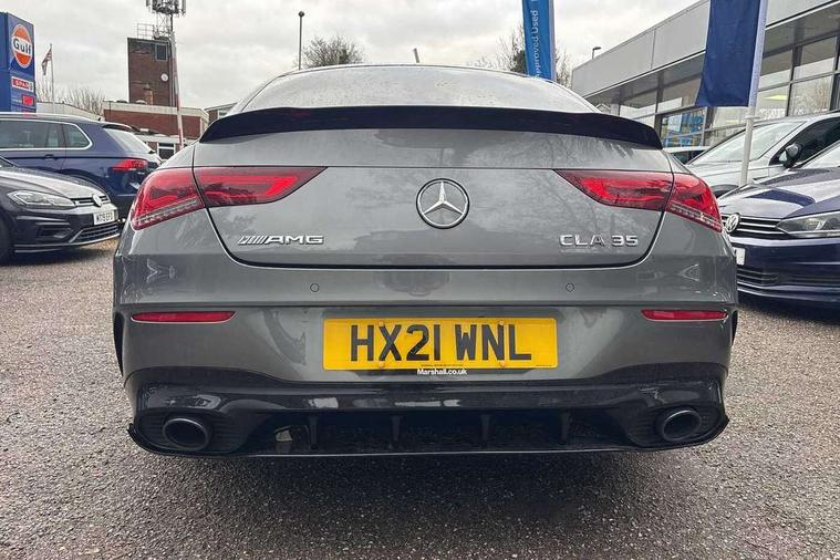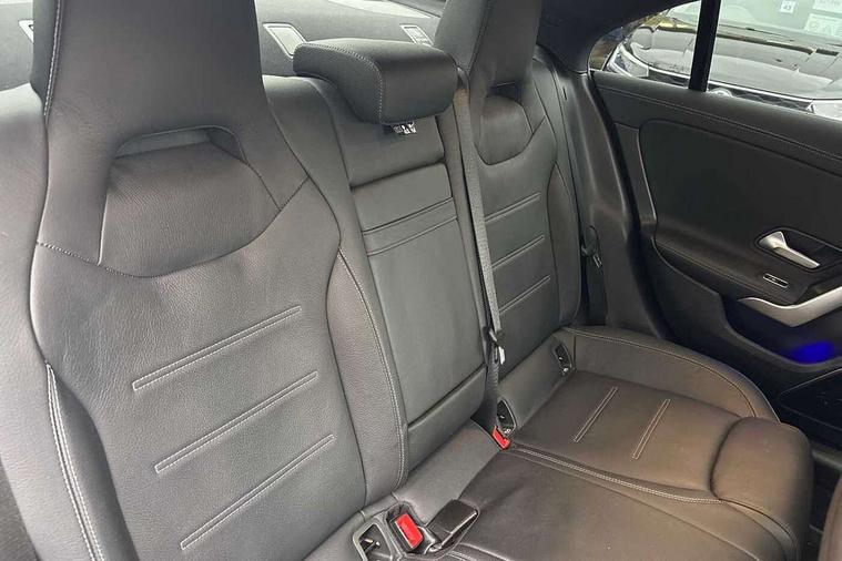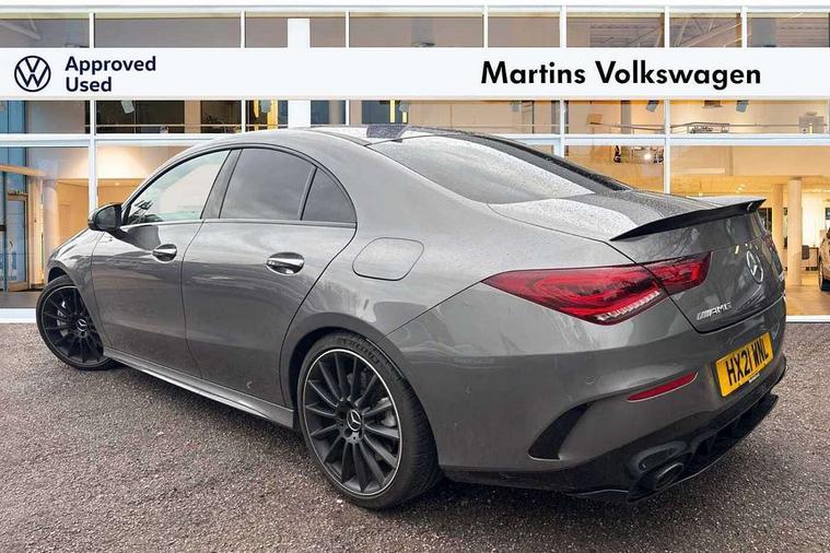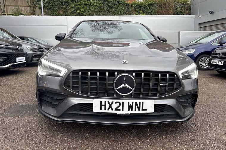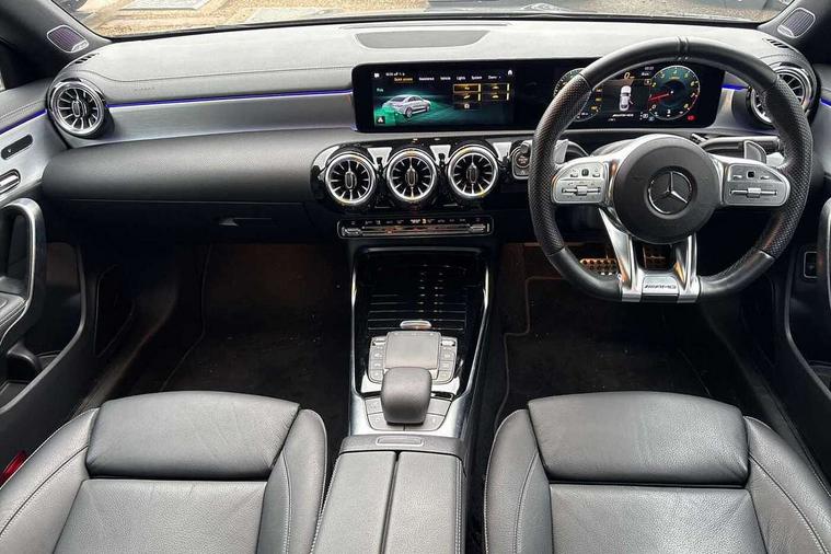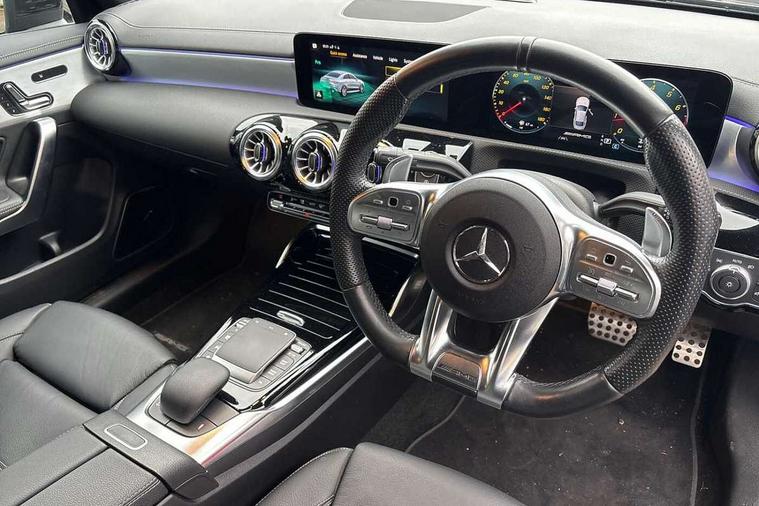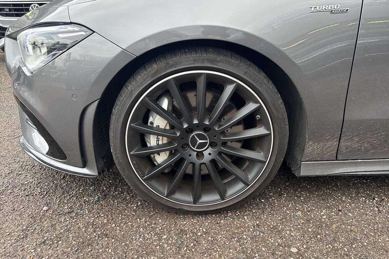 10.25 inch Instrument display with digital cockpit, 10.25 inch touchscreen central media display, Attention assist - Monitors steering behaviour and long journey fatigue, Bluetooth connection, Car wash mode, Digital instrument cluster with three AMG display styles and AMG menu, DYNAMIC SELECT with driving programs (Slippery, Comfort, Sport, Sport+ and Individual), ECO start/stop function, Fluid level warning indicator for fuel, oil, coolant and washer fluid, Hard-disk navigation, Hey Mercedes Voice activation, Lamp failure indicator, MBUX augmented reality for navigation, Mercedes me connect including emergency call system, accident recovery, breakdown management and maintenance, Mercedes me remote services, Outside temperature gauge, Owners manual and service booklet in English, Pre-installation of private car share, Preinstallation for Mercedes Benz link, Radio aerial integrated into front and rear windshields, Remote and charging services plus, Service indicator (ASSYST), Smartphone integration with Apple CarPlay and Android auto, Traffic sign assist, Trip computer in multifunction display with current consumption indicator, Wireless charging, 7G-DCT 7 speed automatic transmission, AMG suspension, Rear axle multi-link, Suspension with adaptive damping system, Burmester surround sound system (590W) with premium mid range speaker, tweeter, 2 speakers in C pillars, subwoofer, DSP amplifier + burmester letter, DAB digital radio tuner, MBUX multimedia system with DAB digital radio and touchpad including satellite navigation, USB (type C) ports (2) in stowage compartment and 1 in front of centre console, Adaptive brake lights, AMG body styling with AMG front apron and rear apron and visible exhaust tailpipe in chrome trim elements, AMG bodystyling side skirts, AMG Front apron with flics as air deflector elements on the outer air intakes, AMG radiator grille with twin blade lamella and AMG Lettering, AMG Rear apron with specific diffuser look with four vertical fins and two round chrome plated tailpipe trim elements with a diameter of 90 mm, AMG Sports exhaust system with two round tailpipes measuring 90 mm in diameter attached in rear apron, AMG lettering plus ribbing on the inside of the, Automatically controlled exhaust flap, Beltline strips in High gloss Black, Body colour bumpers, Body colour door handles, Chrome weather strip, Electric windows, Electrically adjustable and heated door mirrors with integrated LED indicators, Front splitter and trim elements on the louvres in the outer air inlets in silver chrome, Front wings with TURBO 4MATIC lettering, Headlamp assist automatic headlamp activation, Heated glass rear windscreen + timer control, High level LED third brake light, Integrated LED daytime running lights, Interior mirror with black reading lamps and frameless, LED tail lamp, Multibeam LED headlamps with adaptive highbeam assist plus, Privacy glass with dark tinting on rear side windows and rear window, Rain sensing windscreen wipers with two sensitivity settings, Rear fog lamp, Window line trim strip in high gloss black, 40:20:40 split folding rear seats with backrest, Air conditioning - Two zone thermotronic luxury automatic climate control with display, Air vents with surround in silver chrome, AMG Performance steering wheel in nappa leather, Automatic child seat recognition sensor, Black roof lining, Brushed stainless steel sports pedals with rubber studs, Electrically adjustable front memory seats including lumbar support, Floor mats with stitched AMG lettering, Front centre armrest with stowage, Heated front seats, Illuminated front door sills with changeable cover, Illuminated glove compartment stowage, Interior lighting - 64 colour Ambient lighting, Luggage net on driver/front passenger seat backrest, Manually height and reach adjustable steering column, Rear armrest with two integral cup holders for drinks, Rear head restraints, Silver coloured aluminium gear shift paddles on steering wheel, Sport seats with fixed head restraints, Stowage compartment in centre console with retractable cover, Sunvisors with illuminated vanity mirrors, Touchpad on center console, Twin front cupholders, Two outer rear seat isofix and top tether child seat fixing points, Aerodynamics pack - CLA, AMG Night package - CLA 35/45, Keyless go pack - CLA, Light and sight pack - CLA, Mirror pack - CLA, Parking package - CLA, Seat comfort pack - CLA, Active bonnet pedestrain safety measure which detects an impact and raises bonnet by 65mm, Adaptive brake assist with hold function and hill start assist, Anti-lock braking system (ABS), Black seat belts, Bonnet with power domes, Brake pad wear warning indicator, Childproof locks manually operated for rear doors and electrically operated for rear power windows, Crash responsive emergency lighting, Driver and front passenger head and sidebags, Driver and front passenger windowbags, Drivers knee airbag, Dual stage driver and front passenger airbags, Electric parking brake, Electronic stability programme with acceleration skid control, ESP curve dynamic assist, Front and rear seatbelt reminder, Front brake calipers with AMG lettering, Front passenger seat occupancy sensor, Perforated front brake discs, Three point rear seat belts, Tyre pressure monitoring system, Warning triangle and first aid kit, Remote central locking and crash sensor with emergency opening function, Urban guard vehicle protection system with immobiliser and interior protection, Light aluminium with longitudinal grain interior trim, 19" AMG multi-spoke matt black painted light alloy wheels with high sheen finish, Summer tyres, Tirefit tyre sealant kit, Wheel arches wider for AMG wheels,