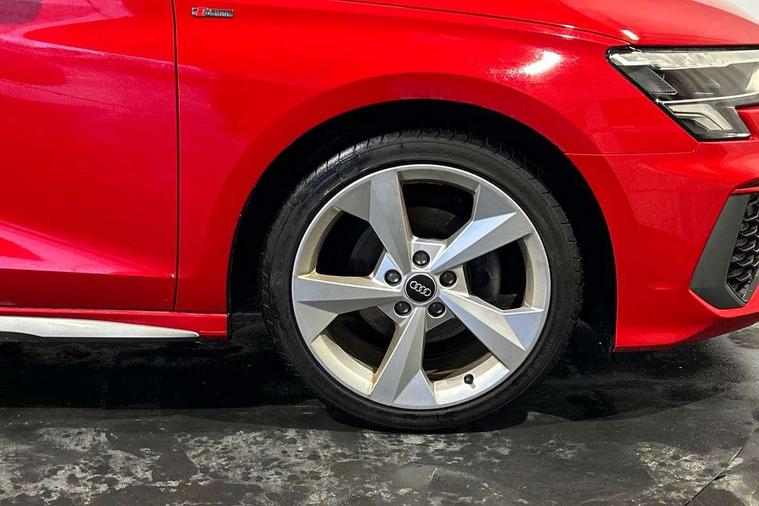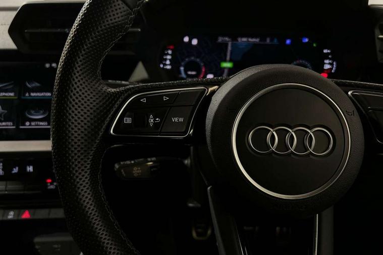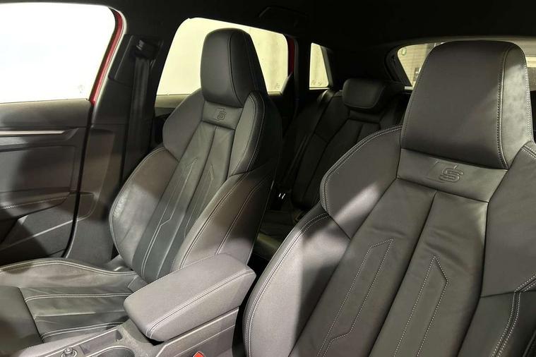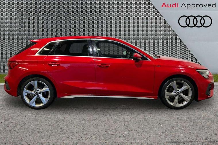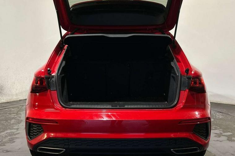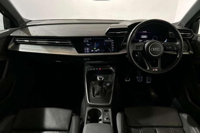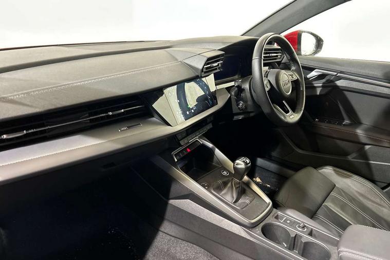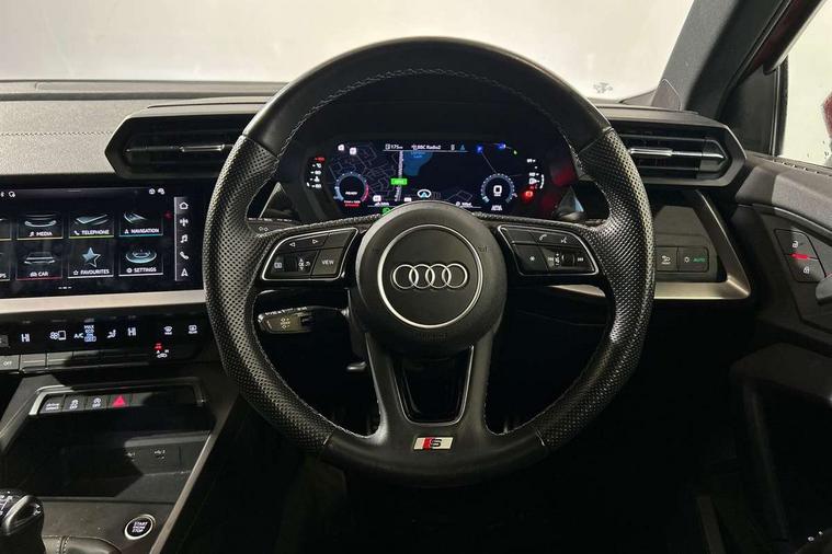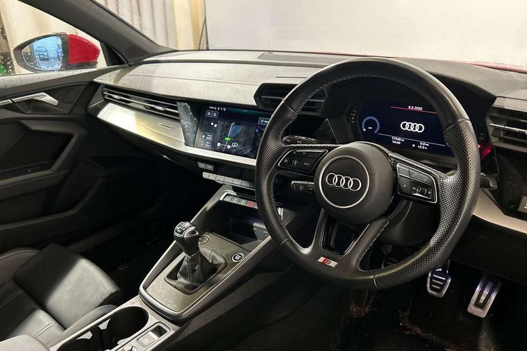 Audi drive select (Auto, Comfort, Dynamic and Individual), Audi smartphone interface, Audi Virtual Cockpit - 10.25" digital and colour instrument cluster, Automatic start/stop system with recuperation, Bluetooth interface, Camera based traffic sign recognition, Collision avoidance assistant, Cruise control, e-Call (emergency call), Electromechanical power speed sensitive steering, Lane departure warning system, MMI Navigation Plus with high resolution 10.1" colour touch screen display, Rear parking sensors, Service indicator, Trip computer, Voice control system with natural language interaction, Sports suspension, 2xUSB-C connection with data and charging functions, 6 passive loudspeakers, DAB Digital radio, 3rd brake light, Acoustic glass windscreen, Aluminium window trim, Auto dimming frameless rear view mirror, Body colour exterior mirrors, Electrically adjustable/heated/folding/auto dimming door mirrors with integrated LED indications + kerb view function for passenger side, Front electric windows, Illuminated aluminium inserts front door sills with S logo, LED daytime running lights, LED headlights with LED rear lights and dynamic rear indicators, Light and rain sensors, Privacy glass - dark tinted rear window, rear door and side windows, Rear electric windows, Rear side air outlets in grained matt black, Rear side wing doors, Rear wiper, S line bumpers, S roof spoiler, 12V socket and storage compartment in front centre console, 3 seat bench in 2nd row, 3 spoke leather multifunction steering wheel, 4 way electrically adjustable lumbar support for driver and front passenger, 60/40 split folding rear seat bench, Black cloth headlining, Dual zone electronic climate control, Front and rear centre armrest in leather, Front and rear headrests, Front/rear floor mats, Height and reach adjustable steering wheel, Interior lighting - glove compartment light and right hand side, Luggage compartment floor covering, Manual boot compartment lid, Manually adjustable front seats, Seat side bolsters, Single front passenger seat, Stainless steel pedals and front footrest in black, Twin leather upholstery with front sports seats S embossed logo, Aluminium interior elements pack - A3 Sportback, LED interior lighting pack - A3 Sportback, S line styling pack - A3 Sportback, 3x3 point rear seat belts, Driver and front passenger airbag with passenger airbag deactivation, Electronic Stabilisation Control (ESC) including ABS, ASR and EDL, First aid kit with warning triangle and 2 safety vests, Front side airbags with head airbags and interaction airbag, Pre-sense front with pedestrian and cyclist detection, Seatbelt monitoring, Tyre pressure loss indicator, Anti theft alarm, Anti-theft wheel bolts, Electronically operated child lock, Immobiliser, Remote control central locking, Dark spectrum aluminium inlays, accent surfaces in the dashboard and centre console in platinum grey silk effect paint finish,
