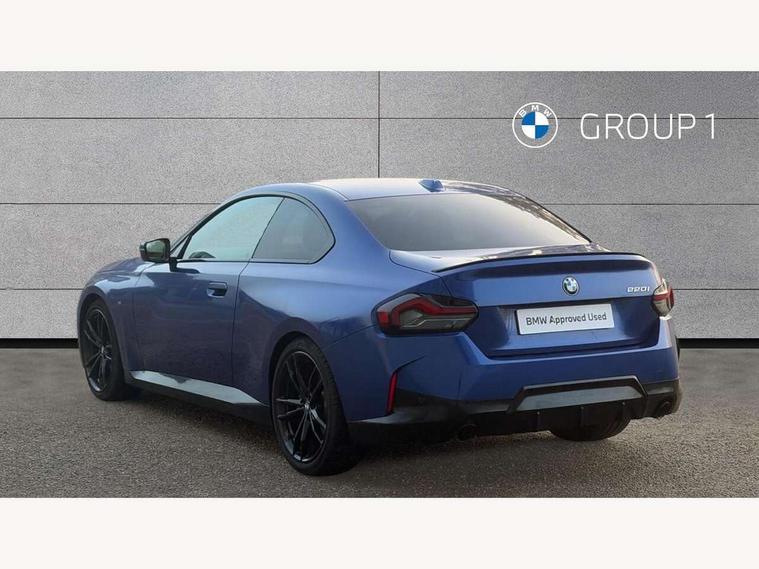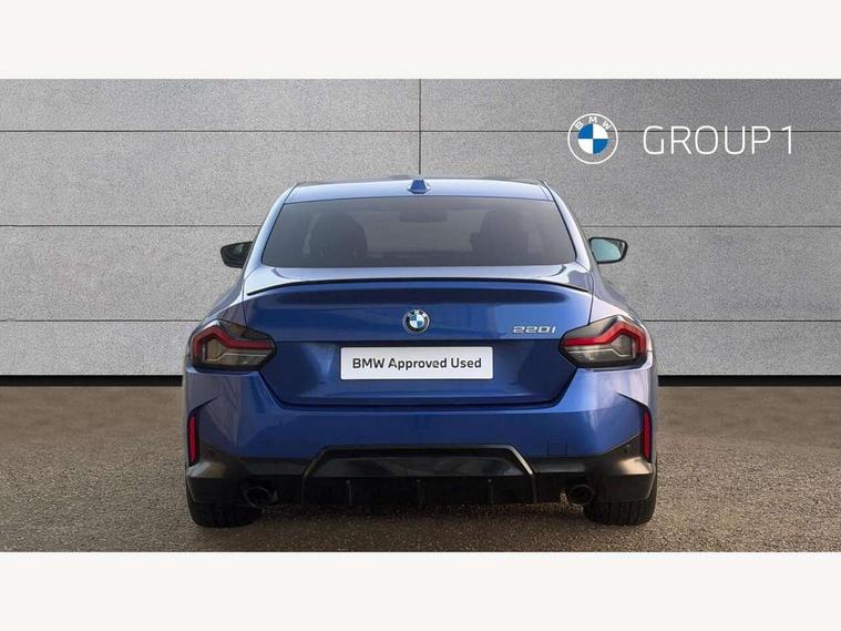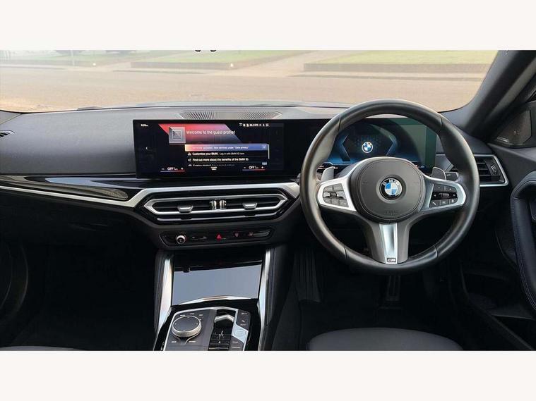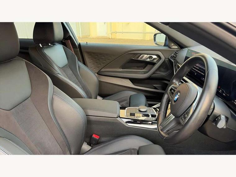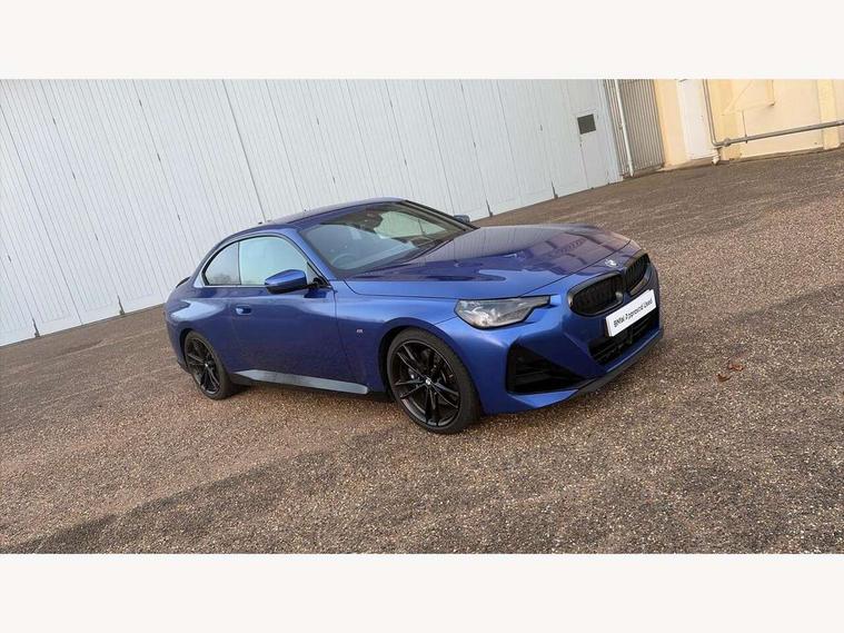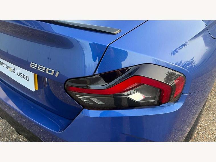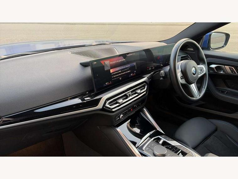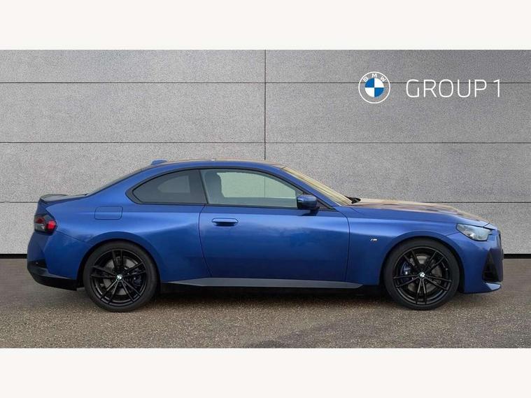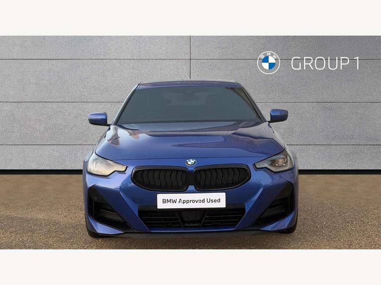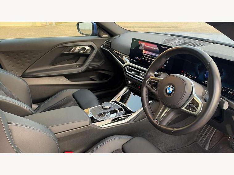 2 USB connections for charging and transferring data, 4G LTE connectivity with hard wired 4G network sim card, Attentiveness assist, Bluetooth with USB, BMW ConnectedDrive online services, BMW Intelligent Personal Assistant, BMW operating system 8 with variable, configurable widgets display information in real time, BMW Teleservices, Check Control warning system for monitoring of lights and door/luggage compartment open warning, Direct selection buttons, Drive off assistant, Eco pro mode, Electric power steering, Front and rear parking sensors, Front/rear Parking distance control, iDrive controller with turn and press function, Integrated owners handbook, Intelligent functions, Live cockpit plus with nav function 12.3" instrument cluster and 14.9" centre display, Oil sensor for level and grade, Optimum shift indicator, Personal Profile, Touch operation on control display, Variable sport steering, Widescreen multi-media display, WiFi interface for wireless connection of mobile terminal devices, Aluminium lightweight construction, Balancer shaft, BMW TwinPower Turbo four-cylinder petrol engine, Double VANOS, Drive performance control with ECO PRO comfort + sport mode, Electronic differential lock, High precision injection, M sport suspension, Petrol Particulate Filter, Sport automatic steptronic transmission with gearshift paddles, manual gearshift time display, launch control, coasting idle ECO PRO/COMFORT modes, Twin scroll turbocharger with Valvetronic, DAB tuner, Acoustic windscreen wipers for reduced driving noise, Adaptive LED Headlights, Automatic windscreen wipers and automatic headlight, Automatically dimming rear view mirror, Body colour door handles flush with door surface, Body colour door mirrors, Body colour front and rear bumpers, Daytime running lights, Electric windows - front and rear, with open/close fingertip control and trap release, Exhaust tailpipes x2 - 90mm in left and right, Fading support, Front and rear bumper system with replaceable deformation elements, Front door sill finishers in black plastic with BMW designation, Front windscreen wipers with integrated washer jets, Green tinted heat protection glazing, High beam assistant, High gloss black sill, bumper trim sides and diffuser insert, High gloss shadowline exterior trim in mirror triangle cover, mirror cover panel, mirror bezel and window border, High level third brake light, Indicators integrated int mirror housing, LED registration plate light, LED technology rear tail lights, brake lights and turn indicators, Lightweight engineering, Model designation on right side of tailgate, One piece kidney grille with hight gloss chrome surround, Rear boot, Rear fog lights, Reversing light in rear light cluster, Shark fin antenna, Single part LED rear lights with smoked glass components, Trailer stabilisation logic, Visible VIN plate, 12V power socket in front centre console with blanking plug, 2 cupholders in front centre console, 2 zone automatic air conditioning, Ambient lighting, Compartment in front of cupholder, Conditioned based service, Driver seat backrest width adjustment, Front and rear side armrests integrated into door trim, Front armrest, Front door pockets, Front head restraints, Front sport seats, Heated front seats, Illuminated glove compartment with separate small compartment, M headliner Anthracite, M sport leather steering wheel, Manually adjustment steering wheel column, Rear seat backrest with manual 40:20:40 split folding, Rear seat centre foldable armrest with integrated cup holder, Single front passenger seat, Storage compartment between rear seats, Storage tray and compartment with cover in centre console, Sun visors with vanity mirrors and insert tab, Through loading system with 40/20/40 split folding 2 rear seat in 2nd row, Two folding rear seat headrests, Velour floor mats, Additional storage compartment pack without USB - 2 Series Coupe, Connected pack professional - 2 Series Coupe, Interior and exterior mirror pack - 2 Series Coupe, M Sport exterior styling aerodynamics pack - 2 Series Coupe, 2 tone horn, Anti lock braking system (ABS) with cornering brake control, Automatic Stability Control (ASC), BMW emergency call, Brake drying, Child seat ISOFIX attachment for the two outer rear seats, Crash sensor activating of airbags, Unlocking doors, hazard warning lights, interior light, safety battery terminal, Deactivation of fuel pump in the event of a crash, Driver and front passenger airbags, Driver and front passenger side airbags, integrated in the door side seat backrest bolsters for all seat variants, Dynamic brake control, Dynamic stability control + (DSC+), Dynamic Traction Control - DTC, Electrically operated hand brake including automatic hold function and automatic release when driving off, Front and rear disc brakes, Head airbags for all 4 outer seats, Manual deactivation of front passenger airbag, Seat belt security check for driver and front passenger, Seatbelt warning, Side impact protection, Three point seat belts on 4 seats including front belt stopper, pyrotechnic belt tensioners and belt force limiters, Tyre pressure sensor, Warning triangle and first aid kit, Alarm system (Thatcham 1) with remote control and electronic engine immobiliser, Central locking switch for all doors, fuel filler cap and luggage compartment, Deadlocking function system to all doors, Drive away locking system on all doors and luggage compartment, Locking wheel bolts, Start/Stop button (illuminated) in centre console with keyless engine start and Auto Start-Stop deactivation button, Two remote control key with integrated key - one button for open and close doors/fuel flap/tailgate and separate button for unlock luggage compartment, BMW mobility tyre sealing system, Electrically powered 12V compressor, Reduced rolling resistance tyres,