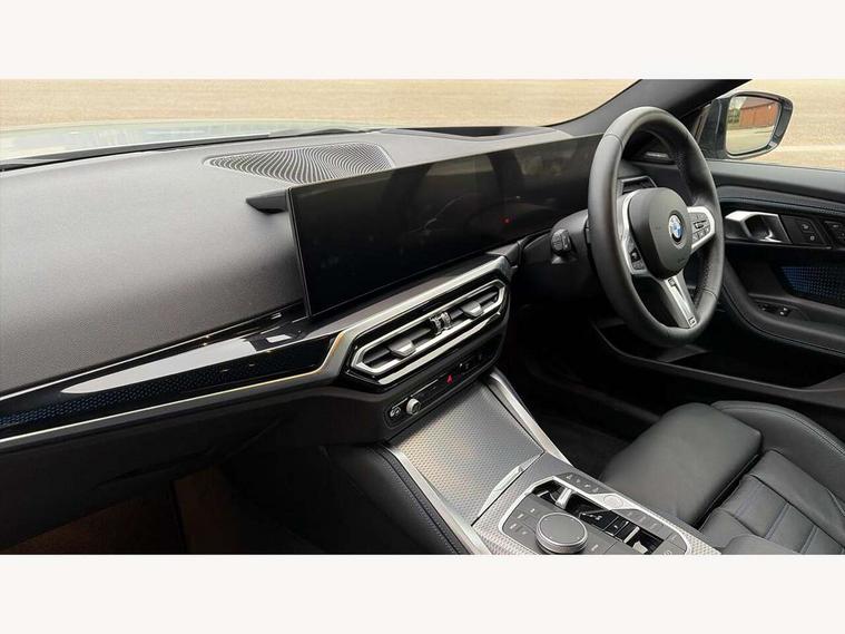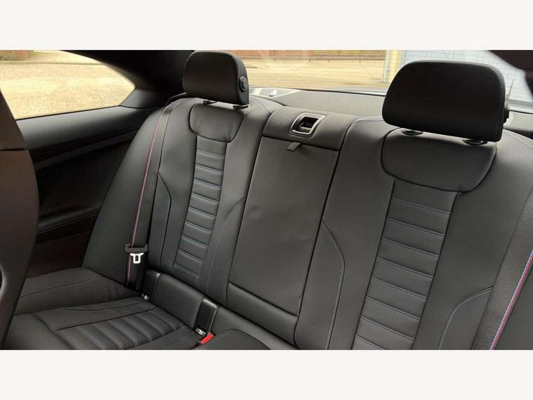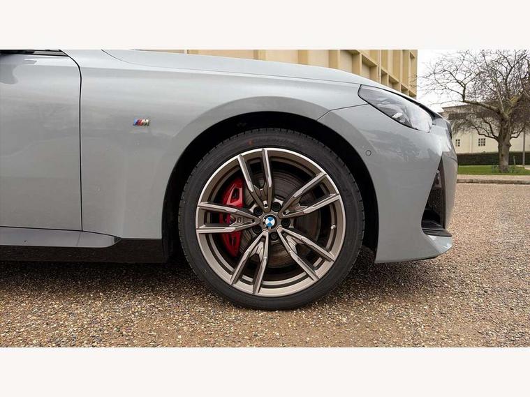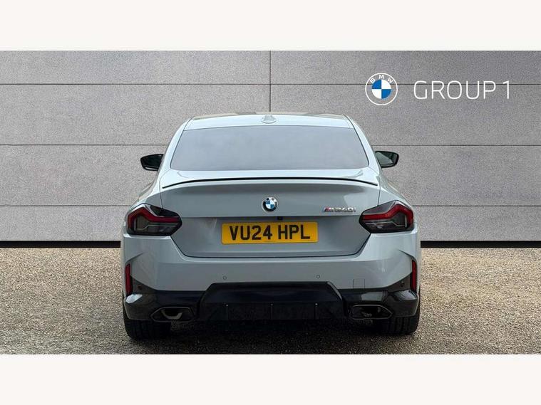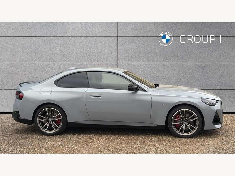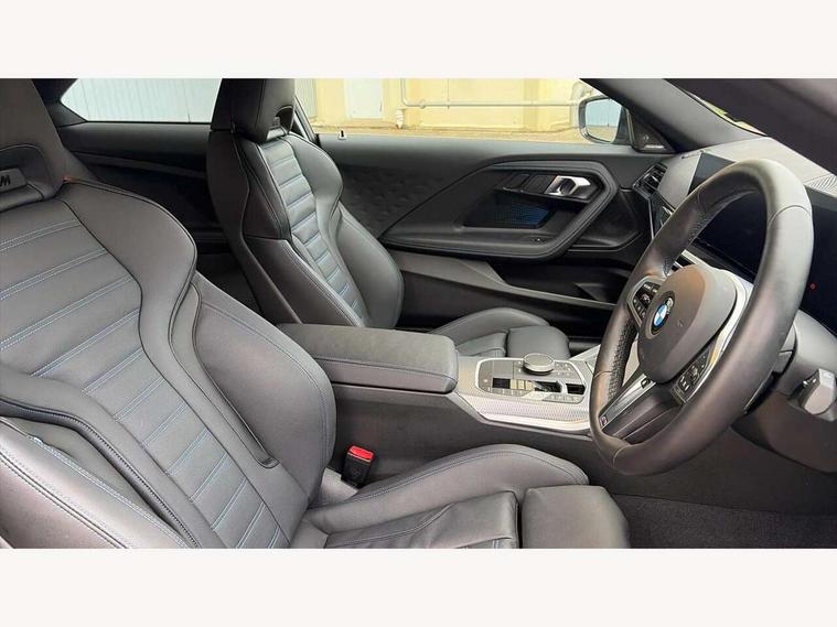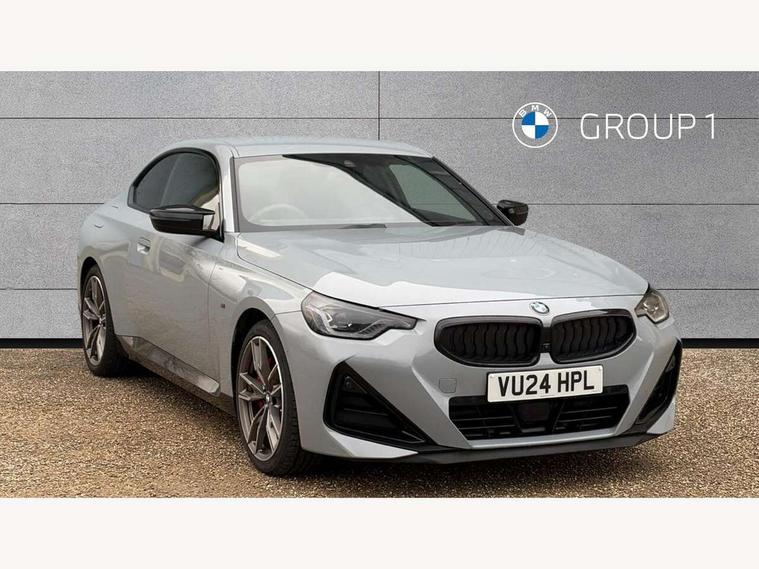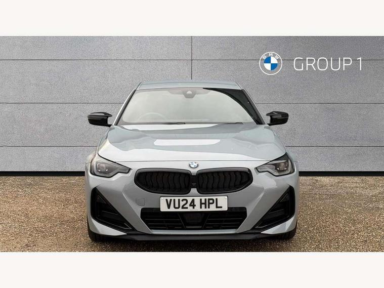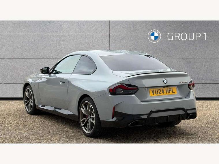 2 USB connections for charging and transferring data, 4G LTE connectivity with hard wired 4G network sim card, Attentiveness assist, Bluetooth with USB, BMW ConnectedDrive online services, BMW Intelligent Personal Assistant, BMW operating system 8 with variable, configurable widgets display information in real time, BMW Teleservices, Check Control warning system for monitoring of lights and door/luggage compartment open warning, Direct selection buttons, Drive off assistant, Driving experience switch with sport+ mode, Eco pro mode, Electric power steering, Front and rear parking sensors, Front/rear Parking distance control, iDrive controller with turn and press function, Integrated owners handbook, Intelligent functions, Live cockpit plus with nav function 12.3" instrument cluster and 14.9" centre display, Oil sensor for level and grade, Optimum shift indicator, Personal Profile, Touch operation on control display, Variable sport steering, Widescreen multi-media display, WiFi interface for wireless connection of mobile terminal devices, Aluminium lightweight construction, Balancer shaft, BMW TwinPower Turbo inline 6-cylinder petrol engine, Double VANOS, Drive performance control with ECO PRO comfort + sport mode, High precision injection, M Sport differential, Petrol Particulate Filter, Sport automatic steptronic transmission with gearshift paddles, manual gearshift time display, launch control, coasting idle ECO PRO/COMFORT modes, Twin scroll turbocharger with Valvetronic, xDrive with rear orientated application, DAB tuner, Acoustic windscreen wipers for reduced driving noise, Adaptive LED Headlights, Automatic windscreen wipers and automatic headlight, Automatically dimming rear view mirror, BMW individual lights shadow line, Body colour door handles flush with door surface, Body colour front and rear bumpers, Daytime running lights, Electric windows - front and rear, with open/close fingertip control and trap release, Exhaust tailpipes x 2 - free form finisher in black chrome in left and right, Exterior air inlets in front bumper with embellishers in high gloss black, Fading support, Flap controlled M Sport exhaust system, Front and rear bumper system with replaceable deformation elements, Front door sill finishers in black plastic with BMW designation, Front ornamental grille frame in high gloss black, Front windscreen wipers with integrated washer jets, Green tinted heat protection glazing, High beam assistant, High gloss black exterior M mirror caps, High gloss black sill, bumper trim sides and diffuser insert, High gloss shadowline exterior trim in mirror triangle cover, mirror cover panel, mirror bezel and window border, High level third brake light, Indicators integrated int mirror housing, LED registration plate light, LED technology rear tail lights, brake lights and turn indicators, Lightweight engineering, M Sport spoiler - Gurney in body colour, Model designation and M badges in cerium grey, Model designation on right side of tailgate, Rear boot, Rear fog lights, Reversing light in rear light cluster, Shark fin antenna, Side frame decorative moulding black high gloss, Single part LED rear lights with smoked glass components, Sun protection glass, Trailer stabilisation logic, Visible VIN plate, xDrive designation on left tailgate, 12V power socket in front centre console with blanking plug, 2 cupholders in front centre console, 2 zone automatic air conditioning, Ambient lighting, Compartment in front of cupholder, Conditioned based service, Driver seat backrest width adjustment, Electric front seat adjustment with driver memory, Front and rear side armrests integrated into door trim, Front armrest, Front door pockets, Front head restraints, Front M Sport seats, Front passenger seat lumbar support, Heated front seats, Illuminated glove compartment with separate small compartment, Lumbar support for driver, M headliner Anthracite, M sport leather steering wheel, M240i badge in instrument cluster, Manually adjustment steering wheel column, Rear seat backrest with manual 40:20:40 split folding, Rear seat centre foldable armrest with integrated cup holder, Single front passenger seat, Storage compartment between rear seats, Storage tray and compartment with cover in centre console, Sun visors with vanity mirrors and insert tab, Through loading system with 40/20/40 split folding 2 rear seat in 2nd row, Two folding rear seat headrests, Velour floor mats, Vernasca leather upholstery, Additional storage compartment pack without USB - 2 Series Coupe, Connected pack professional - 2 Series Coupe, Interior and exterior mirror pack - 2 Series Coupe, M Sport exterior styling aerodynamics pack - 2 Series Coupe M240i, 2 tone horn, Anti lock braking system (ABS) with cornering brake control, Automatic Stability Control (ASC), BMW emergency call, Brake drying, Child seat ISOFIX attachment for the two outer rear seats, Crash sensor activating of airbags, Unlocking doors, hazard warning lights, interior light, safety battery terminal, Deactivation of fuel pump in the event of a crash, Driver and front passenger airbags, Driver and front passenger side airbags, integrated in the door side seat backrest bolsters for all seat variants, Dynamic brake control, Dynamic stability control + (DSC+), Dynamic Traction Control - DTC, Electrically operated hand brake including automatic hold function and automatic release when driving off, Front and rear disc brakes, Head airbags for all 4 outer seats, M seat belts, M Sport brake with red calipers, Manual deactivation of front passenger airbag, Seat belt security check for driver and front passenger, Seatbelt warning, Side impact protection, Three point seat belts on 4 seats including front belt stopper, pyrotechnic belt tensioners and belt force limiters, Tyre pressure sensor, Warning triangle and first aid kit, Alarm system (Thatcham 1) with remote control and electronic engine immobiliser, Central locking switch for all doors, fuel filler cap and luggage