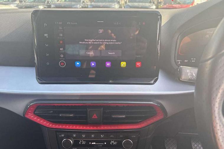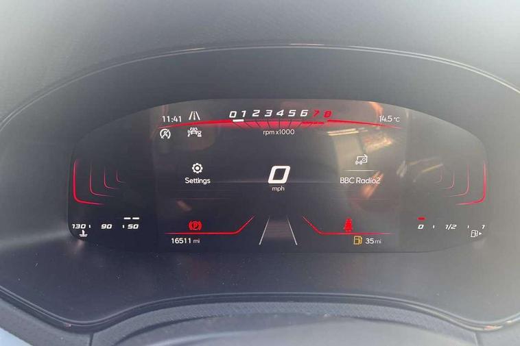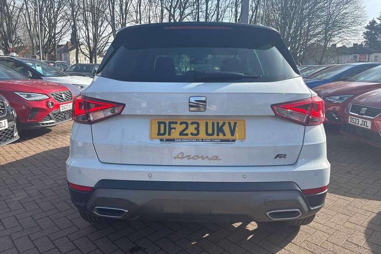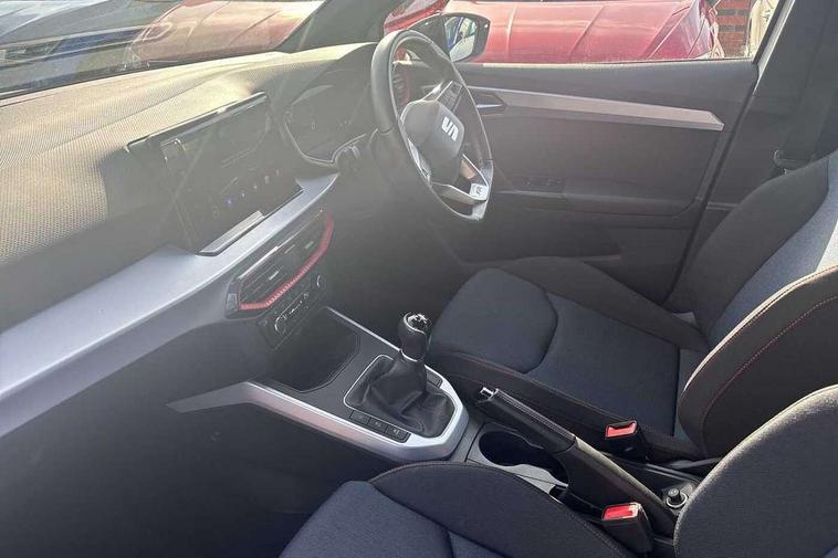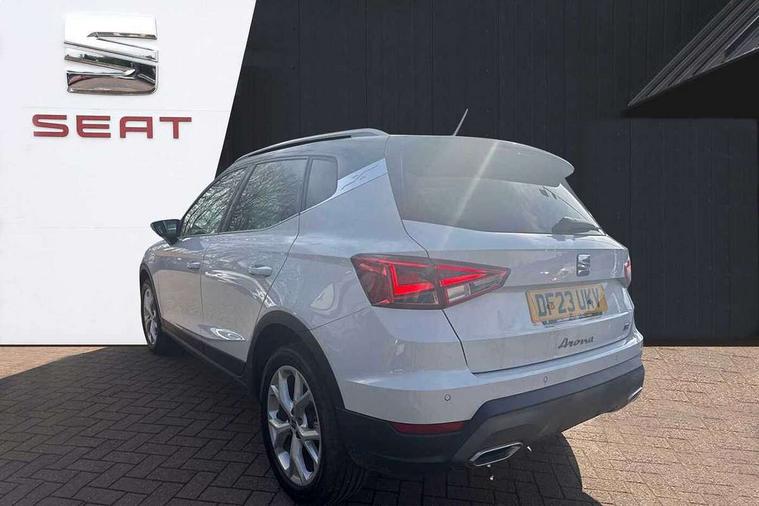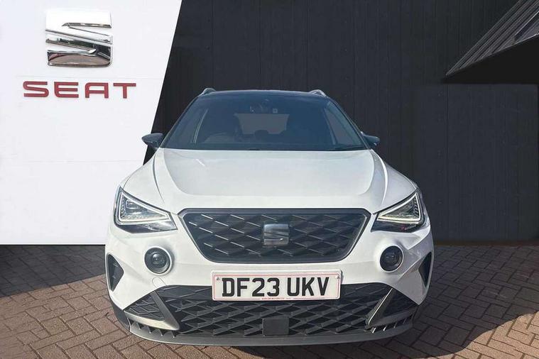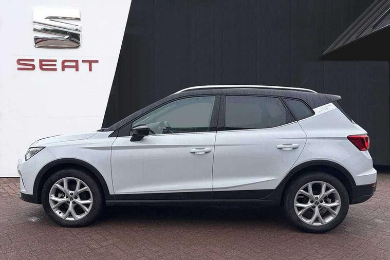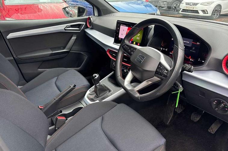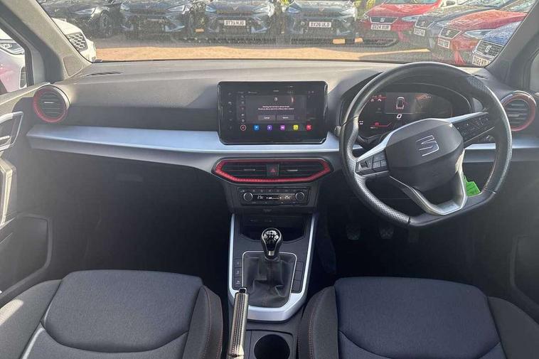 'Lights On' Reminder warning buzzer, 8" Digital cockpit, Digital clock, E-call, Electric speed sensitive power steering, Full Link Smartphone Integration with Mirror Link, Apple Car Play, Google Android Auto with USB Type C cable for Apple and Android compatibility, Lane keeping system, Low fuel warning light, Outside temperature display, Rear parking sensor, RPM counter, Seat connect with safety, service, remote and online, SEAT Drive profile - Four different models normal-sport-eco-individual, steering response, throttle response, Trip computer, Wireless phone charger, 9.2" colour touchscreen with navigation system, voice control and USB port (type c), Bluetooth interface for hands free and audio streaming, DAB digital radio and AM/FM radio, Steering wheel mounted audio controls, Anti theft roof antenna, Auto dimming interior rear view mirror, Automatic activation of hazard warning lights, Body coloured bumpers, Body coloured door handle inserts, Chrome roof rails and window surrounds, Dark tinted rear windows, Electric front/rear windows, Electrically adjustable, heated and folding door mirrors, Front fog lights with cornering function and rear fog light, FULL LED automatic headlights with dynamic headlight range control, coming and leaving home, LED daytime running lights, LED rear tail lights and licence plate lights, Protective side mouldings, Rain sensing wipers, Rear side wing doors, Rear spoiler, Rear window wash/wipe, Roof colour door mirrors, Third brake light, Twin exhaust pipe styling hidden exhaust pipe, Visible VIN plate, Windshield wiper with intermittent control and potentiometer, 2 cupholders, 3 seat bench in 2nd row, 60/40 split folding rear seat, Aircare filter, Black interior roof, Cloth upholstery, Double boot floor, Driver sunvisor with covered mirror + card holder, Dual zone climate control, Front courtesy light with front reading lights, Front sport seats, Gear shift indicator, Height adjustable front seats, Height/reach adjustable steering column, Illuminated boot, Instrument lighting with brightness control, Interior ambient lighting, Interior light in footwell, central console and door panel, ISOFIX points in outer rear seats with top tether anchorage points, Passenger sunvisor with vanity mirror, Perforated flat bottomed leather steering wheel/gear knob/handbrake with red stitching and FR logo, Single front passenger seat, Two front and three rear height adjustable headrests, Interior chrome pack - Arona, 3 point seatbelts on all rear seats, ABS, Active front headrests, Child locks on rear doors, Driver and front passenger airbags with front passenger airbag de activation, front side and curtain airbags, Electronic stability control, Emergency Brake Assist (EBA) and front assist, Front and rear seatbelt reminder, Hill hold control, Multi-Collision braking, Tiredness recognition system, Traction control, Tyre pressure monitoring system, Alarm with back-up horn, Electronic engine immobiliser, Locking wheel bolts, Remote central locking + deadlocks, Tow away protection, Titan black dashboard, 17" Dynamic alloy wheels,