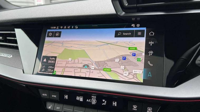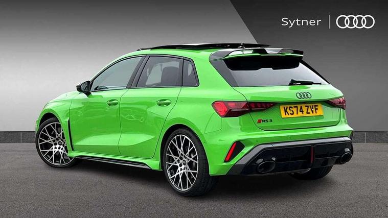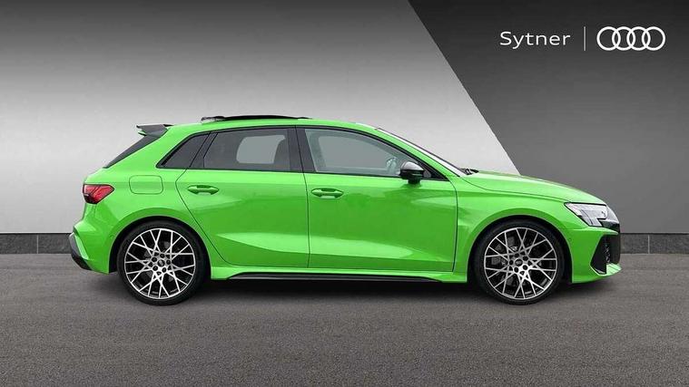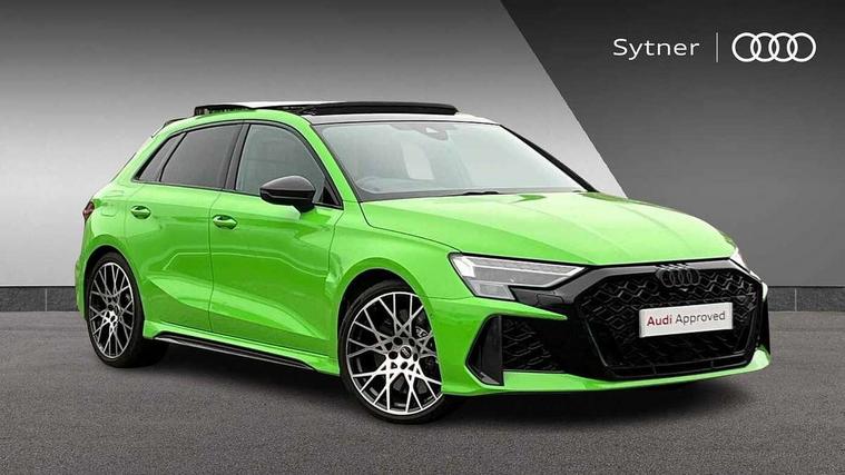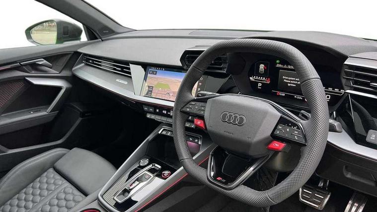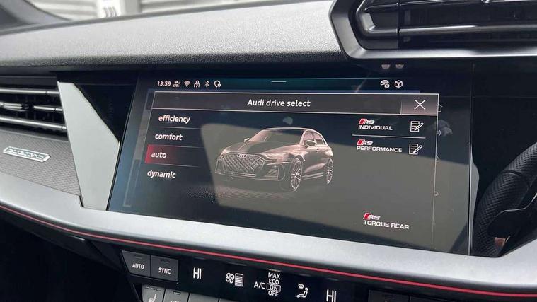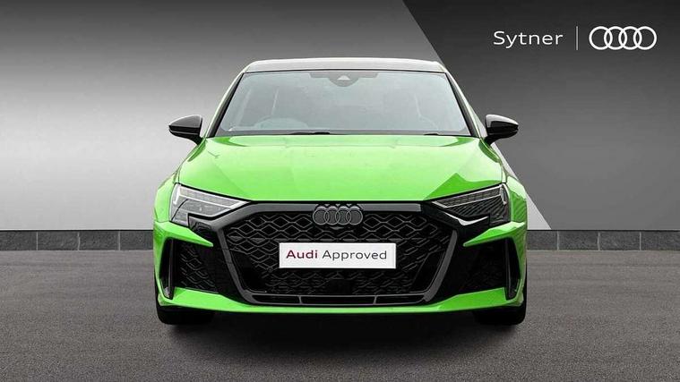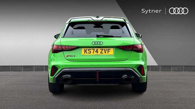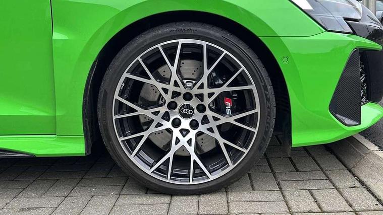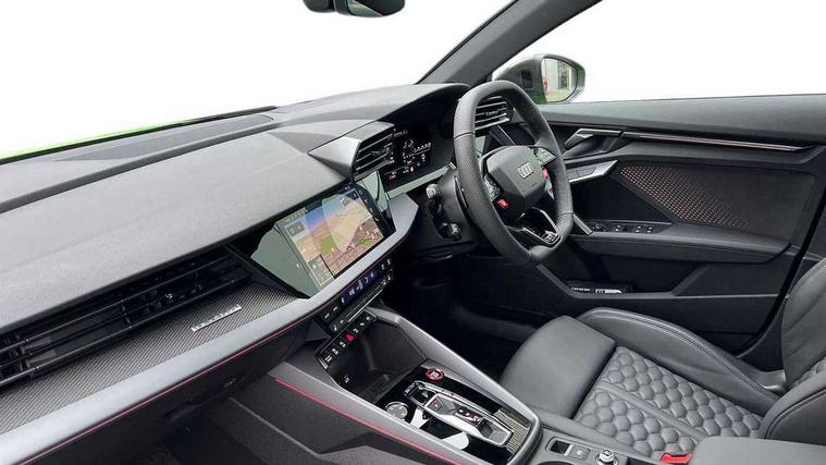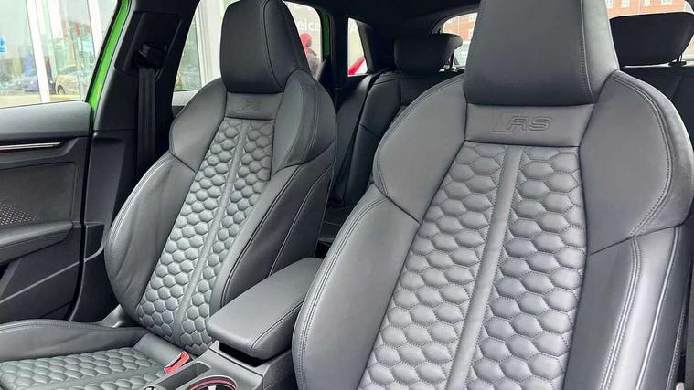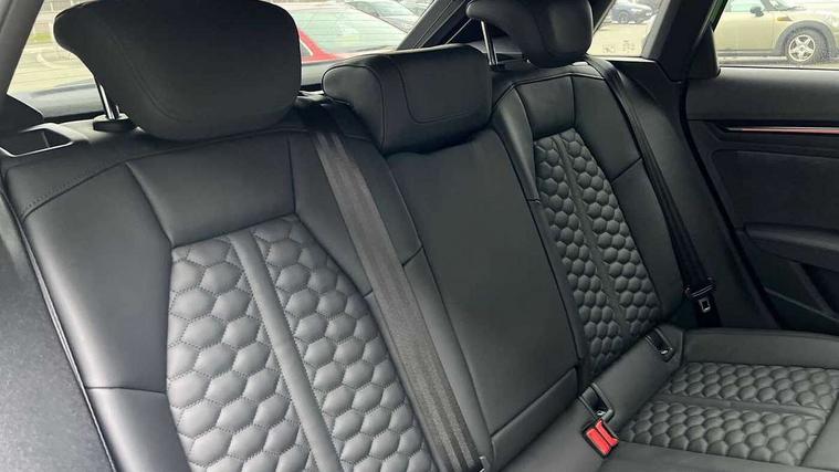 Adjustable speed limiter, Audi drive select comfort, auto, dynamic and efficiency, Audi smartphone interface with app store includes wireless Apple carplay, Android auto and Amazon alexa integration, Audi virtual cockpit plus with RS specific design and 12.3" display with additional graphic display options, Automatic start/stop system with recuperation, Bluetooth interface, Camera based traffic sign recognition, Collision avoidance assistant, Distraction and Fatigue warning, e-Call (emergency call), Lane departure warning system, MMI Navigation Plus with high resolution 10.1" colour touch screen display, Park Assist with parking system Plus, Progressive steering, RS specific driving modes - RS Individual, RS Performance and RS Torque rear, Voice control system with natural language interaction, Adaptive suspension with audi drive select, Increase of top speed to 174 mph, Quattro permanent four wheel drive, Audi Phonebox light with wireless charging, DAB Digital radio, USB ports with charging function in the rear, Audi beam LED projection of RS logo on ground as you exit, Auto dimming frameless rear view mirror, Automatic dynamic range control, Carbon door mirror housings, Carbon fibre engine cover, Dipped beam, main beam, position light and turning light, Electrically adjustable/heated/folding/auto dimming door mirrors with integrated LED indications + kerb view function for passenger side, Exterior model badging, Front electric windows, Heat insulating glass windscreen, LED 3rd brake light, LED brake lights, LED daytime running x3, LED rear number plate lights, LED reverse light, LED tail lights, Light and rain sensors, Privacy glass - dark tinted rear window, rear door and side windows, Rear electric windows, Rear side wing doors, Rear wiper, Roof edge spoiler in carbon, RS dual branch exhaust system with two chrome plated oval tailpipe trims, 12V socket and storage compartment in front centre console, 3 seat bench in 2nd row, 3 Spoke flat top and bottomed black leather multi function steering and gear shift paddles, 3-zone deluxe automatic air conditioning, 40/20/40 split folding rear seat bench, Black cloth headlining, Front and rear headrests, Front centre armrest, Front door sill trims with RS 3 logo, Front sports seats RS embossed logo, Front/rear floor mats, Heated front seats, Height and reach adjustable steering wheel, Manual boot compartment lid, Rear centre armrest with cupholder, Seat side bolsters, Single front passenger seat, Stainless steel pedals and front footrest in black, Vanadium look - Interior door handles, Door trim, power latching, Air vents, window controls, mirror adjust, rear door lock, Selector lever in centre console, Black Styling plus package - RS3, Extended ambient lighting package Pro with Multi-coloured contour lighting of instrument panel - RS3, RS exterior features pack in carbon and gloss black - RS3, RS sport suspension pack - RS3, Storage package - RS3 Sportback, 3x3 point rear seat belts, Driver and front passenger airbag with passenger airbag deactivation, Electronic Stabilisation Control (ESC) including ABS, ASR and EDL, First aid kit with warning triangle and 2 safety vests, Hill hold assist, Pre-sense front with pedestrian and cyclist detection, RS steel brakes, Seatbelt monitoring, Tyre pressure loss indicator, Anti theft alarm, Anti-theft wheel bolts, Electronically operated child locks, Inlays in carbon atlas structure, Tyre repair kit,