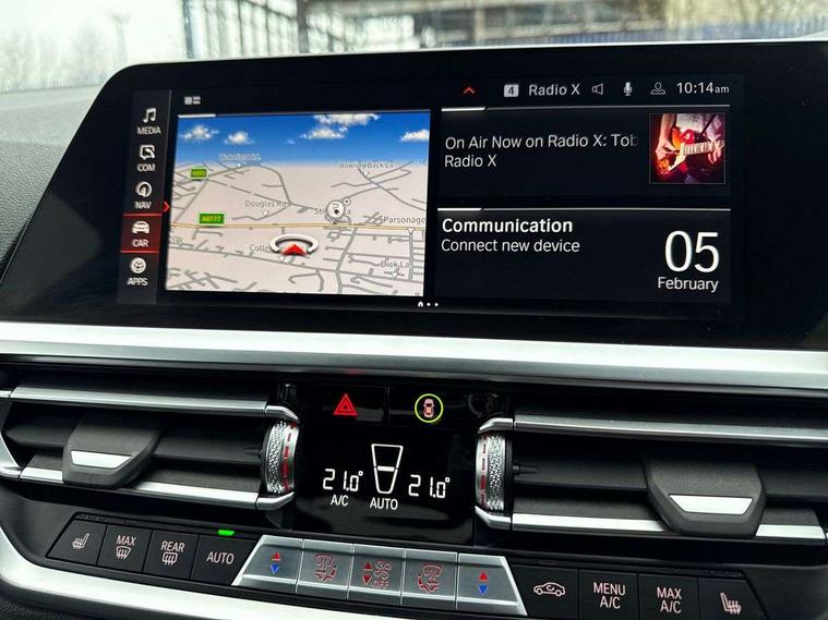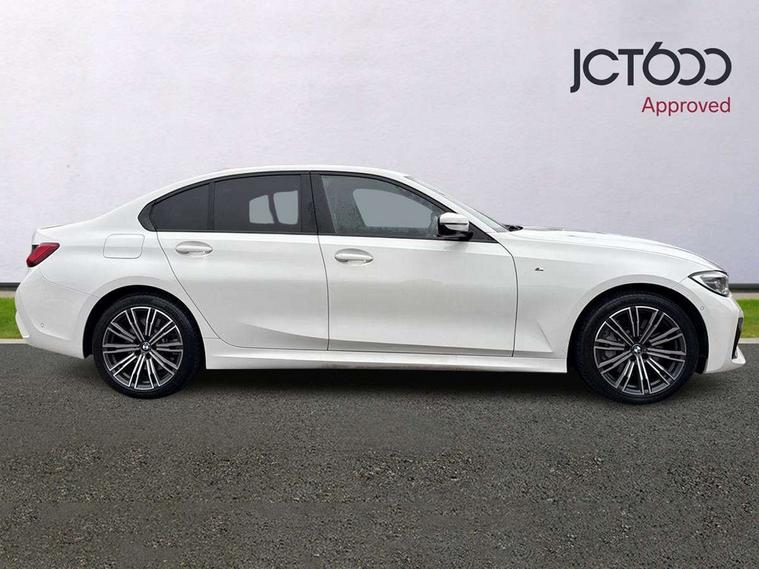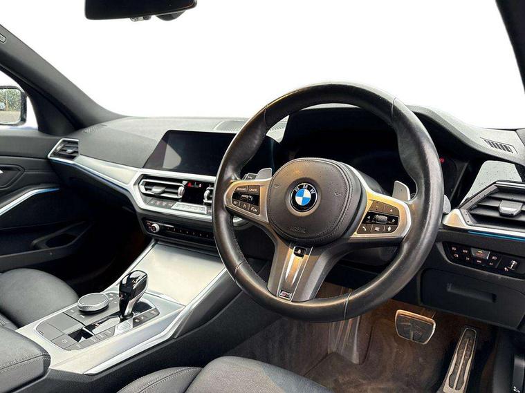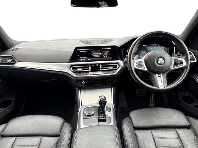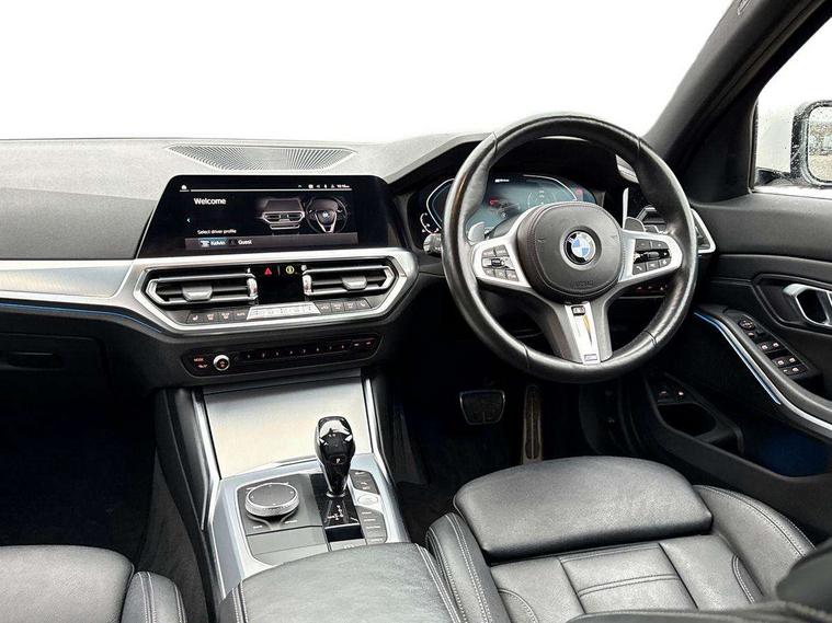 Active guard plus, Attentiveness assist, Auto start-stop, Bluetooth hands free facility with USB audio interface with audio streaming, BMW Live Cockpit Professional Nav with 12.3" instrument display + 10.25" display, Intelligent Voice Assist, BMW OS 7, HDD, 2USB, 4G LTE connect, BMW service history, BMW Teleservices, Brake pad wear indicator in front and rear, Check Control warning system for monitoring of lights and door/luggage compartment open warning, Condition based service, Cruise control with brake function + speed limiter, Electric power steering with Servotronic steering optimised at all speed ranges, iDrive controller on centre console, Instrument cluster with speedometer with mph readout, tachometer, fuel gauge and oil temperature gauge, Integrated owners handbook, Oil sensor for level and grade, warning by check control system, On board computer - average speed+fuel consumption, service interval, clock/date, odometer/trip meter, outside temperature display and ice warning, Optimum shift indicator, Personal Profile - automatic lock when driving away selectable, Balanced 50/50 weight distribution, Battery cut-out switch, Charging cable - Mode 2, Drive performance control - ECO PRO, comfort and sport modes, Petrol Particulate Filter, Stroke dependent dampers, DAB tuner, Electronic service booklet, Stereo speaker system with 2 mid range speakers in the front door trims and rear parcel shelf + 2 central bass speakers underneath the front seats, Acoustic glazing, Active airstream chrome frame kidney grille with 8 high gloss black vertical slats, Automatic headlight beam throw control with load dependent regulating reaction, dynamic compensation of braking dive and acceleration squat, Black roof mouldings, Body colour door handles, Body colour front and rear bumpers, Body colour fuel filler flap, Body colour mirror caps with bottom segment in matt black, Dynamic brake lights, Electric windows - front and rear, with open/close fingertip control, anti-trap facility and comfort closing, Exhaust tailpipe - split left and right, Exterior mirrors - electrically folding with anti-dazzle, Fading support, Front and rear bumper system with replaceable deformation elements, Front black door sill finishers with BMW designation, Green tinted heat protection glazing, High gloss shadow line exterior trim, Interior rear view electrochromatic mirror with automatic anti dazzle function, LED daytime running lights, LED front fog lights, Lightweight engineering, M designation on front side panels, left and right, Matt black exterior B pillar, Model designation on right side of tailgate, Rain sensor with automatic headlight activation, Shark fin antenna, Two part LED tailights in L-shape with components in smoked glass, brake light, LED turn indicator and rear fog light, Visible VIN plate, Welcome lights in interior and door handle area, Windscreen wipers with integrated washing jets, 12V power socket in front storage compartment, 2 front cupholder in centre console with clamping elements and matt black inlay, 3 rear seats with non folding headrests with 3 point seat belts, 3 zone automatic air conditioning, 4 pieces lashing eyelets in luggage compartment, 40:20:40 split folding rear seat with loading system, Ambient lighting with welcome carpet light, Anthracite headlining, Armrest integrated in front and rear door trim + front centre console armrest, Backrest width adjustment, Centred top Luggage compartment lights, Four grab handles integrated in roof lining, Front and rear door exit lighting (left / right), Front and rear door pockets, Front and rear reading lights, Front and rear velour floor mats, Front head restraints, Front sport seats, Heated front seats, Height adjustable mechanically and infinitely variable steering column, Illuminated armrest storage compartment, Illuminated glove compartment with separate small compartment, Interior lighting - front centre over interior mirror with soft light, rear centre and front and rear footwell lighting, M sport leather steering wheel, Make-up mirror lights, Rear centre armrest with 2 cupholders, Rear centre console with storage compartment and ventilation grille, Sunvisors with vanity mirrors and ticket pocket, Toolkit located in luggage compartment, Connected pack professional - 3 Series Saloon/Touring, M sport exterior styling pack - 3 Series Saloon/Touring, 2 tone horn, BMW emergency call, Brake energy regeneration, Braking pre-tensioning, Child proof locking system in rear door, Child seat ISOFIX attachment rear outer seats, Coasting in idle in ECO PRO mode, Crash sensor activating of airbags, Unlocking doors, hazard warning lights, fuel cut off, interior lighting+activation of safety battery terminal clamp, Driver and front passenger side airbags, integrated in the door side seat backrest bolsters for all seat variants, Driver/Front Passenger airbags, Dry braking, Dynamic brake control, Dynamic stability control + (DSC+) - Anti-lock Braking System (ABS) with brake assist and cornering brake control + Automatic Stability Control (ASC), Dynamic Traction Control - DTC, Electromechanical parking brake including automatic hold function and automatic release of the parking brake when pulling away, Electronic differential lock control (EDLC), Front passenger manual airbag deactivation, Head airbags for all 4 outer seats, Hill start assist, Seat belt security check for driver and front passenger, Side impact protection, Three 3 point seat belts on all seats including front belt stopper, pyrotechnic belt tensioners and belt force limiters, Tyre pressure monitoring with three level warning strategy, Ventilated front and rear disc brakes, Warning triangle and first aid kit, Alarm system (Thatcham 1) with remote control and electronic engine immobiliser, Central locking switch for all doors, fuel filler cap and luggage compartment, Remote control with integrated key one button open/close vehicle and windows, sole opening of the luggage compartment lid and pa
