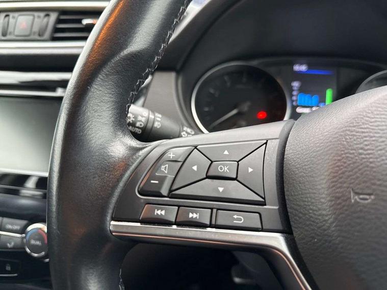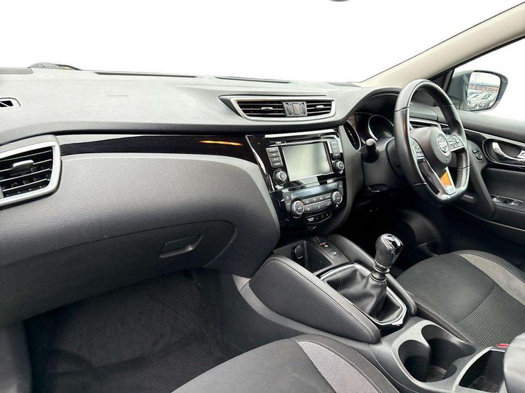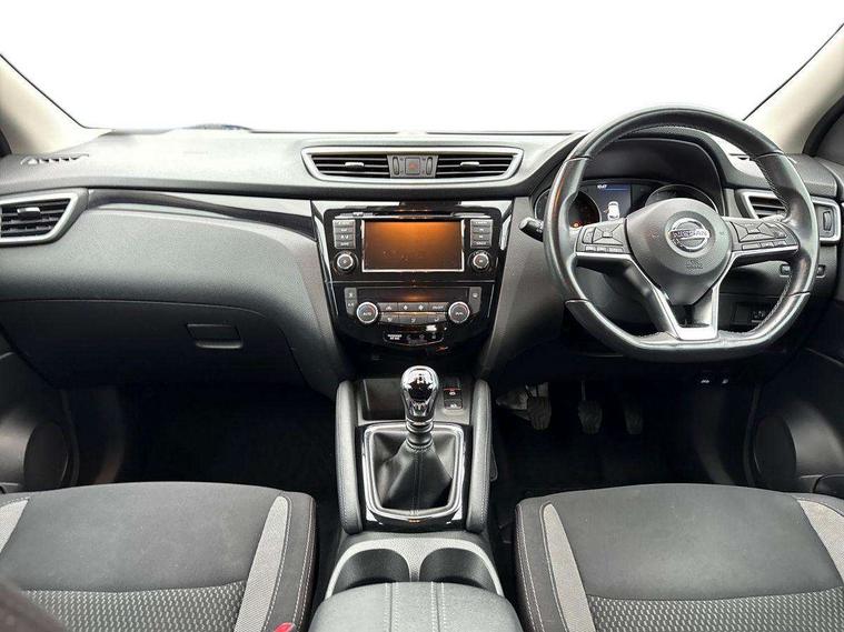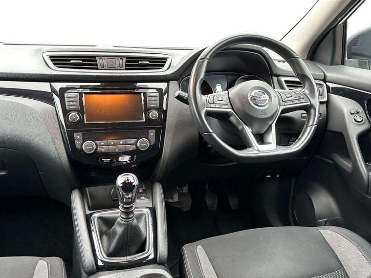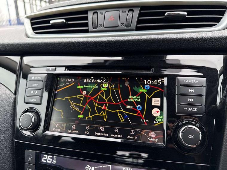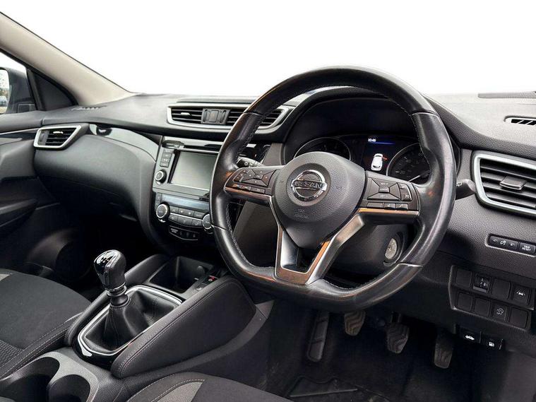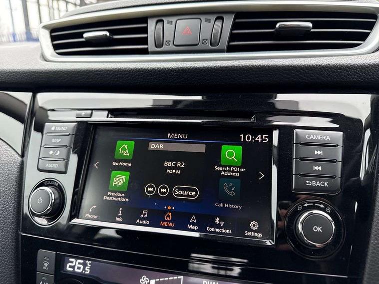 Advanced drive assist display 5'' TFT coloured screen, Android Auto, Apple CarPlay preparation, Bluetooth connectivity, Cruise control + speed limiter, Electric speed sensitive power steering, Front parking sensors, Lane departure warning system, Nissan connect evo 7" touchscreen navigation and entertainment system, Normal or sport selectable steering, Outside temperature sensor, Rear parking sensors, Rear view camera, Service interval indicator, Smartphone integration, Stop/start system, Tomtom connected services, Traffic sign recognition, Trip computer, Voice control system, Nissan chassis control (intelligent ride control, intelligent trace control, intelligent engine brake), 6 speakers, AM/FM radio, CD audio system, Aux-in socket, DAB Digital radio, Steering wheel mounted audio controls, USB port, Anti dazzle rear view mirror, Auto wipers, Body colour bumpers, Body coloured door handles, Body coloured door mirrors, Chrome window surround, Daytime running lights dip function when turn signal applied, Electric folding door mirrors, Electric front and rear windows with one touch illuminated window controls, Electric front/rear windows, Electrically adjustable door mirrors, Front fog lights, Halogen headlights, Heated door mirrors, High beam assist, Intelligent auto headlights, LED indicators in door mirrors, Rear roof spoiler, Rear wiper with reverse link, Shark fin antenna, Signature LED daytime running lights, Underbody vortex generators, 2 X front 12v power sockets, 3 height adjustable rear headrests, 60/40 split folding rear seat, Ambient lighting in centre console, Boot lighting, Centre console storage box/armrest, Chrome interior door handles, Cloth upholstery, Driver's seat manual height adjust, Dual zone climate control, Front and rear door pockets with bottle holders, Front and rear seat belt pre-tensioners with load limiters, Height adjustable front headrests, ISOFIX on outer rear seats, Leather D shaped steering wheel, Leather gear lever, Leather knee pad, Manual height adjustable front passenger seat, Manual lumbar support on driver seat, Parcel shelf stow function under luggage board, Pollen filter, Rear armrest with 2 cupholders, Tilt/telescopic adjustable steering wheel, 6 airbags - Driver, front passenger, curtain and side airbags, ABS, ESP, EBD and brake assist, Auto hold function, Child locks on rear doors, Electronic parking brake, Front and rear seat belt warning, Front passenger airbag deactivation, Height adjustable front seatbelts, Hill start assist, Intelligent emergency braking with pedestrian recognition, Three 3 point rear seatbelts, Tyre pressure monitoring system, Anti-theft immobiliser, Remote central locking, Thatcham Cat.1 alarm, Piano black dash trim, 17" Alloy wheels, Tyre puncture repair kit,