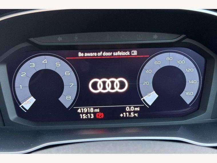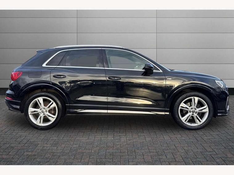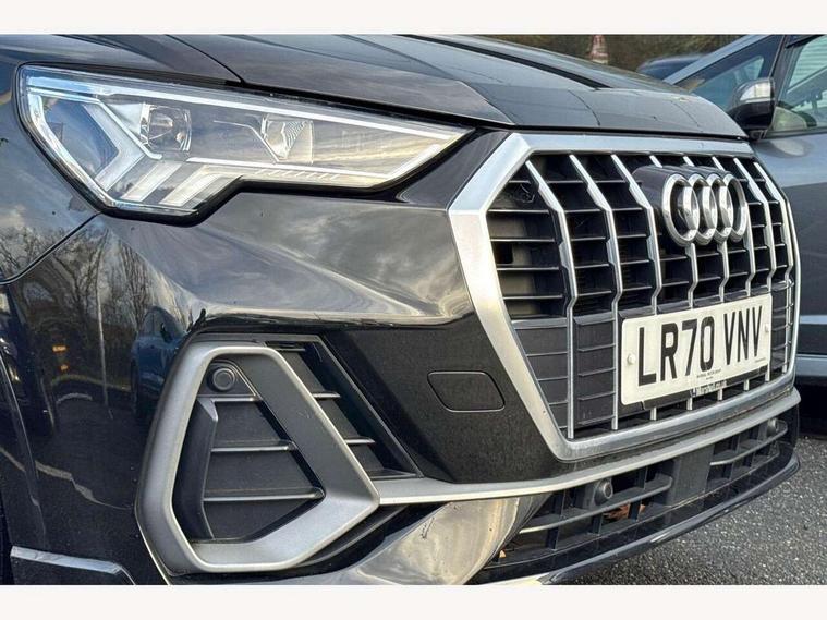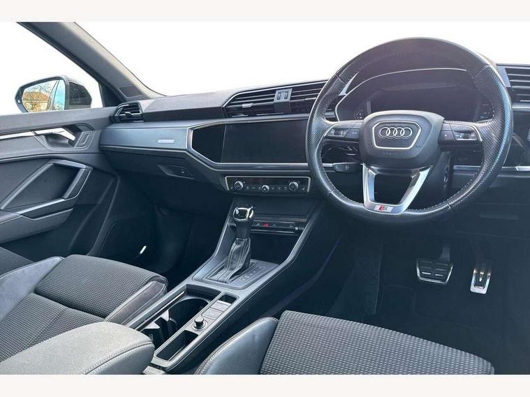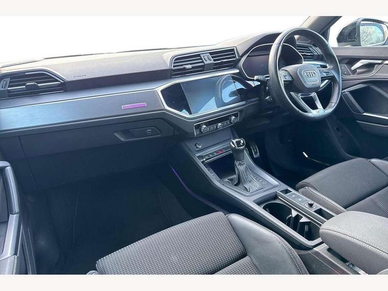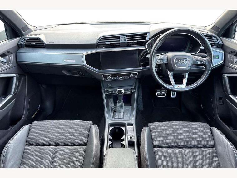 Audi connect safety and service (e-call), Audi drive select, Audi lane departure warning, Audi side assist, Audi smartphone interface includes wireless Apple carplay/Android Auto, Audi Virtual Cockpit - 10.25" display, Bluetooth interface, Camera based traffic sign recognition, MMI Navigation Plus with high resolution 10.1 inch touchscreen colour display, Power operated tailgate, Progressive steering, Service interval indicator, Start stop system with recuperation, Voice control system with natural language interaction, 48V Mild hybrid technology, Sports suspension, 1 x USB type C and 1 USB type A charging points, 6 passive loudspeakers, DAB digital radio module, Acoustic windscreen, Aluminium roof rails, Aluminium window trim, Auto dimming frameless rear view mirror, Body coloured bumpers, Electrically folding, adjustable and heated door mirrors with integrated LED side indicators and kerb view function for passenger side, Front and rear electric windows, Front fog lights, Front side air inlets in matt platinum grey, Front spoiler blade in matt platinum grey, Grille vertical bars in aluminium silver/Matt, High gloss black finish B and C pillars, LED headlights with LED daytime running lights and dynamic rear indicator, LED rear lights, Privacy glass dark tinted rear and rear-side windows (from B-pillar backwards), Rain and light sensors, Rear diffuser strip in matt titanium black, S line badges on front wings, S Line front and rear bumpers, Side skirt insert in matt Platinium grey, Silver chrome grille surround, Titanium black radiator grille, 12V socket in rear centre console, 40:20:40 folding with manual adjustment for 60:40 forwards/backwards position and backrest angle, Adjustable rear seat bench/backrest with centre armrest and cupholder, Black cloth headlining, Dual zone electronic climate control, Front and rear black floor mats with contrast stitching in rock grey, Front and rear headrests, Front and rear roof module including reading lights, Front centre armrest, Glove compartment lighting, Height and reach adjustable steering wheel, Illuminated door sill trims with S logo, ISOFIX child seat mounting for front passenger with airbag deactivation and outer rear seat including top tether attachment point for outer rear seats, Luggage compartment light, Manual front seats with height adjustment, Perforated leather gearknob, Stainless steel luggage compartment sill finisher, Stainless steel pedals, Tool kit, Non smoking pack - Q3, 3x3 point rear seatbelts, 6 airbags - Driver, front passenger, curtain and side windows, Electrically operated child locks on rear doors, Electromechanical parking brake, Electronic stabilisation control including ABS, ASR and EDL, Hill descent control, Hill hold assist, Pre sense basic, Seatbelt monitoring, Tyre pressure warning, Warning triangle and first aid kit, Anti theft alarm, Anti theft wheel bolts, Audi pre-sense front with pedestrain and cyclist recognition, Remote central locking, Dark matt brushed aluminium inlay, Leatherette door armrest, MMI touch colour display in glass look, black with surround in aluminium look, Tyre repair kit,