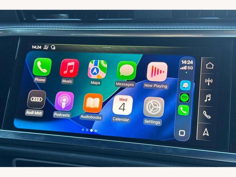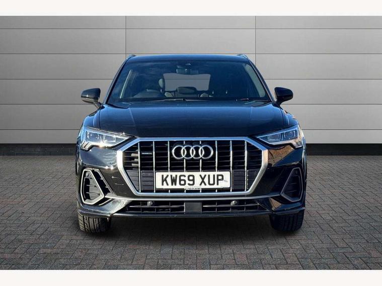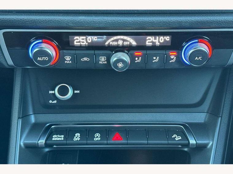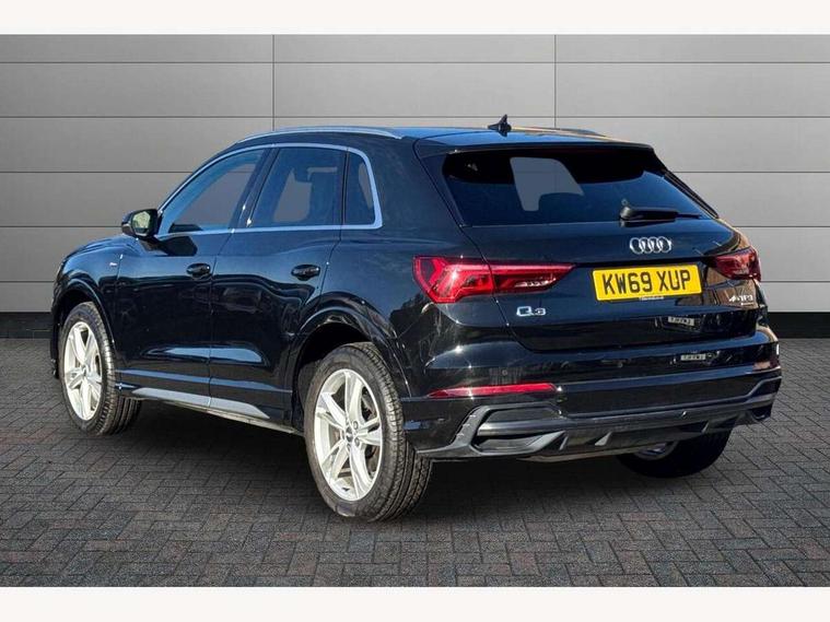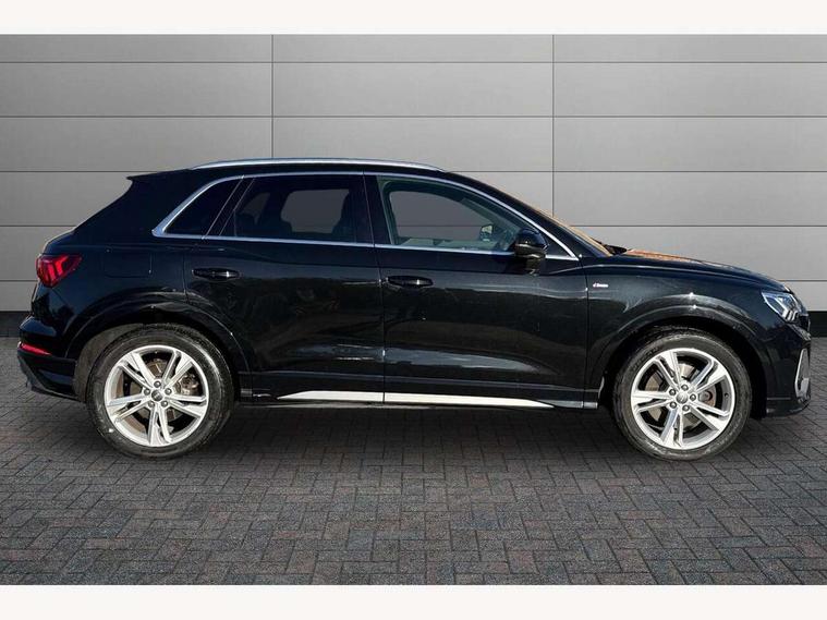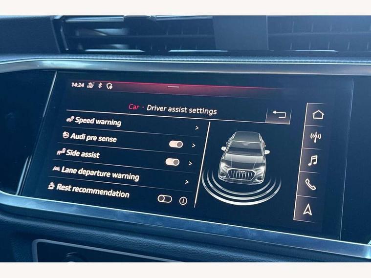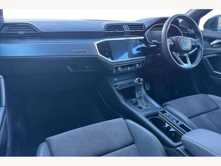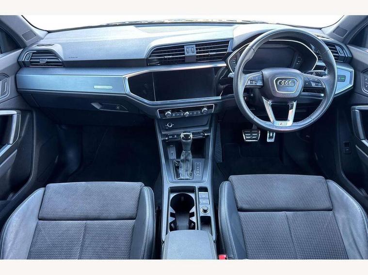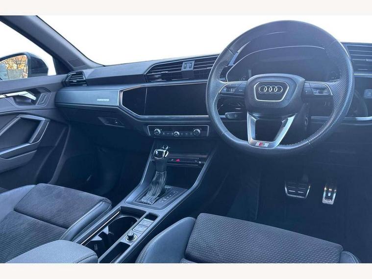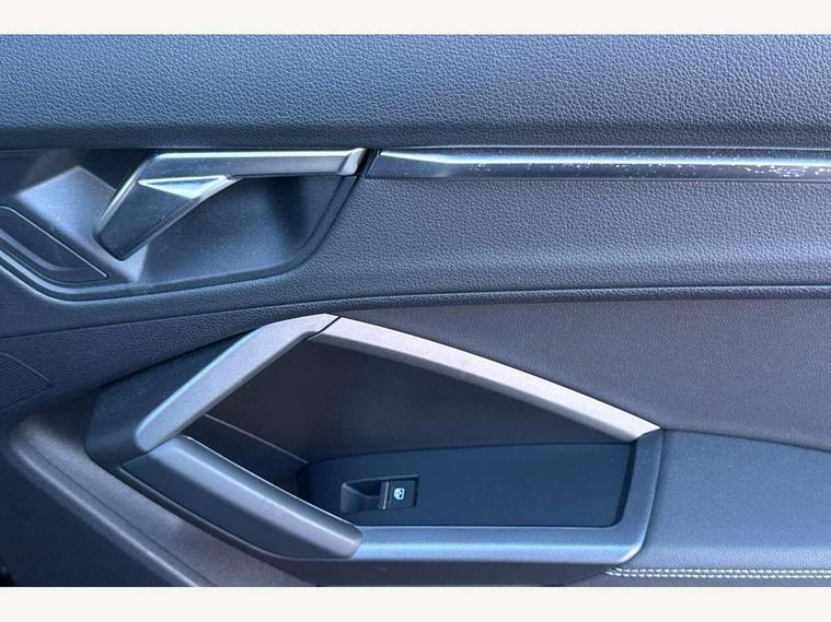 Audi connect safety and service (e-call), Audi drive select, Audi lane departure warning, Audi side assist, Audi smartphone interface, Audi Virtual Cockpit - 10.25" display, Bluetooth interface, Camera based traffic sign recognition, MMI navigation plus with MMI touch, Power opening/closing tailgate, Progressive steering, Service interval indicator, Stop/start system, Voice control system, Sports suspension, 1 x USB type C and 1 USB type A charging points, 6 speakers, DAB digital radio module, Acoustic windscreen, Aluminium roof rails, Aluminium window trim, Auto dimming rear view mirror, Body coloured bumpers, Diffuser in matt Platinum grey, Electrically adjustable and heated door mirrors with integrated LED side indicators, Front and rear electric windows, Front fog lights, Front side air inlets in matt platinum grey, Front spoiler blade in matt platinum grey, Grille vertical bars in aluminium silver/Matt, High gloss black finish B and C pillars, LED headlights with LED daytime running lights and dynamic rear indicator, LED rear lights, Privacy glass, Rain and light sensors, Rear diffuser strip in matt titanium black, S Line badge on wings, S Line front and rear bumpers, Side skirt insert in matt Platinium grey, Titanium black radiator grille, 12V socket in rear centre console, 40:20:40 split folding rear seat, Adjustable rear seat bench/backrest with centre armrest and cupholder, Aluminium door sill trims, Black cloth headlining, Dual zone climate control, Front and rear black floor mats with contrast stitching in rock grey, Front and rear headrests, Front and rear roof module including reading lights, Front centre armrest with storage compartment and angle adjustment, Glove compartment lighting, Height and reach adjustable steering wheel, Illuminated door sill trims with S logo, ISOFIX child seat mounting and Top Tether with front passenger airbag deactivation, Luggage compartment light, Manual front seats with height adjustment, Perforated leather gearknob, Stainless steel luggage compartment sill finisher, Stainless steel pedals, Non smoking pack - Q3, 3x3 point rear seatbelts, 6 airbags - Driver, front passenger, curtain and side windows, Electrically operated child locks on rear doors, Electromechanical parking brake, Electronic stabilisation control including ABS, ASR and EDL, Hill descent control, Hill hold assist, Pre sense basic, Seatbelt monitoring, Tyre pressure warning, Warning triangle and first aid kit, Anti theft alarm, Anti theft wheel bolts, Audi pre-sense front with pedestrain and cyclist recognition, Remote central locking, Dark matt brushed aluminium inlay, MMI touch colour display in gloss black with aluminium surround,