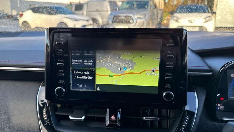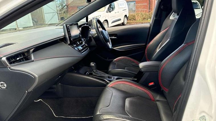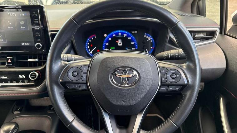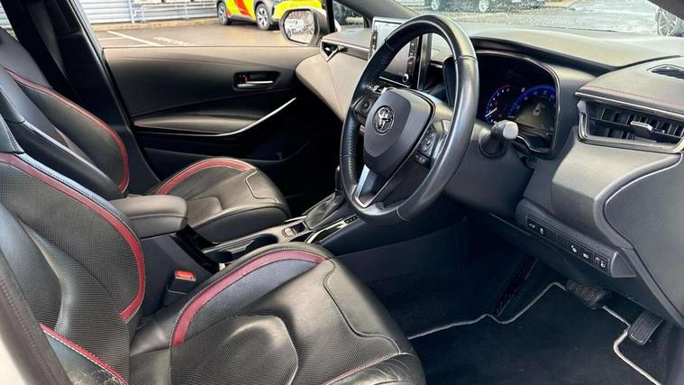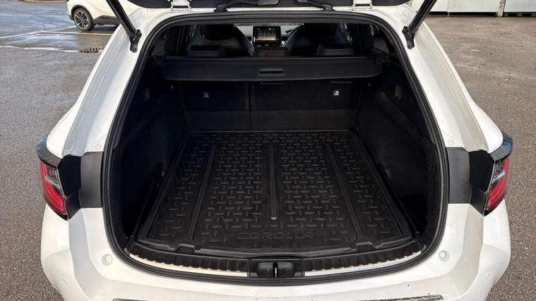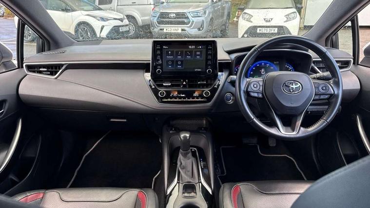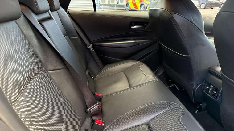 7" Multi information display screen, Bluetooth telephone connectivity, Connected car functionality upgrade, tracker, remote status and e-care, Dynamic radar cruise control (with RSA) including switch on steering wheel, E-call, Electrically assisted power steering, EV drive indicator, Intelligent park assist, Kick sensor for power tailgate, Lane Departure Alert (LDA) switch on steering wheel, Memory on adjustable speed limiter, Push button start, Reversing camera, Smartphone integration with Apple CarPlay and Android auto, Gasoline particulate filter, Vehicle Stability Control (VSC), 6 speakers, 8" Touchscreen with MM19 Multimedia system and voice recognition, AM/FM radio, DAB Digital radio, Toyota touch 2 with go navigation system, USB and Aux in connectors + 12V front outlet, USB charging port in centre storage box, Aluminium roof rails, Anti-jam protection on power windows, Auto dimming inside rear view mirror, Auto up and down function on all power windows, Automatic folding mirrors, Automatic headlights with high beam assist, Black toyota logo in front, Body colour rear spoiler, Body coloured bumpers, Body coloured door mirrors, Body coloured outside door handles, Chrome door scuff plates, Follow me home headlights, LED daytime running lights, LED dual-beam projector headlights with manual headlight levelling, LED front fog lights, LED High mounted stop light, LED rear combi lights with LED lightguide, Noise reduction layer on front windows, Power adjustable heated door mirrors, Power front windows, Power rear windows, Rain sensing wipers, Rear privacy glass, Rear window defogger, Rear window wiper, Reverse tilting door mirrors, Satin chrome surround on lower front grille, Shark fin antenna, Time adjustment on intermittent wiper, Turning signal integrated indicators in door mirrors, Unique lower skirt, Unique side rocker with black insert, UV-filter on driver and passenger windows, 12v power outlet - luggage side, 3 rear headrests, 3 spoke leather steering wheel + gear knob, 60/40 split folding rear seat, Adjustable speed limiter switch on steering wheel, Audio, multimedia and telephone switches on steering wheel, Blue ambient interior illumination to centre tray, front cup holders and front door trim, Boot underfloor storage, Clean air filter, Driver and front passenger personal light, Driver and passenger assist grip, Driver and passenger seatback pockets, Driver and passenger sun visor with mirror and light, Dual sided deck board in boot, Dual zone automatic air conditioning with ECO mode switch, Front and rear cup and bottle holders, Front and rear door pockets, Front head restraints, Full leather upholstery, Heated driver and front passenger seats, Illuminated entry system in room lamp, ISOFIX seat fixing (2 fixings on rear outer seats), Leather gear shift with satin chrome on gear shift console, Leather style armrests, LED boot light, Luggage utility boot rails, Manual height adjustable for driver and front passenger seat, Pollen filter, Power adjustable lumbar support on driver seat, Power window switches with satin chrome inserts, Rear armrest with 2 cupholders, Rear passenger air vents, Rear passenger coat hooks (2), Rear passenger personal lights, Retractable tonneau cover with luggage partition net, Satin chrome inside door handles, Shopping bag hooks in luggage compartment, Side storage in boot, Sliding armrest on centre console box, Slow opening glovebox with lights, Sports seats, Tilt/telescopic steering column, Tonneau cover with under floor storage, Voice recognition switch on steering wheel, Whiplash Injury Lessening (WIL) feature (active headrest) for seats, Parking pack - Corolla, Toyota safety sense 2 pack - Corolla, 3x3 point rear seatbelts, Adjustable driver and front passenger seat belt extender to top anchor point, Anti lock braking system + Electronic brake force distribution, Brake assist function, Downhill Assist Control (DAC), Electronic parking brake, Emergency brake light signal (EBS), Front passenger airbag on/off switch, Front seatbelt reminder, HAC - Hill start assist control, Rear seat belt reminder, Seatbelt pretensioners and force limiters, Supplemental restraint system (SRS) 7 airbags - dual driver, dual side curtain, side impact and driver knee airbags, Traction control, Tyre pressure warning system, Acoustic vehicle alert system (AVAS), Alarm with motion sensor and immobilizer, Remote central locking + deadlocks, Smart entry, Satin chrome dash trim, Soft touch texture on upper dashboard, Stitching on lower dashboard, Stitching on upper dashboard, 17" machined face alloy wheels, Tyre repair kit, Unique wheel finish with red wheel cap,