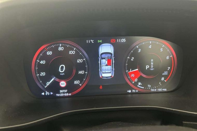 12.3" Active TFT crystal driver's instrument display, 9" Touch screen, Adjustable steering wheel force, Bluetooth hands free telephone kit, Drive mode selector, Lane keep assist with driver alert control, Oncoming Lane Mitigation, Sensus navigation system, Speed limiter, Speed sensitive steering, Voice control system, Volvo on call, DAB Digital radio, Steering wheel mounted remote controls, Adaptive brake lights, Auto dimming interior mirror, Automatic headlamp levelling, Black stone door mirrors, Black stone roof, Dark tinted glass for rear windows + rear screen + side luggage area window, Dual integrated exhaust pipes with high gloss black surround, Electrically adjustable and heated door mirrors, Embossed rear side roof pillar, Front and rear electric windows, Front tread plates, High gloss black front and rear skid plate, High gloss black lower front bumper, High gloss black mesh grille, High gloss black roof rails, High gloss black window trim, Home safe and approach lighting, LED front fog lights, LED Headlights + Active high beam incorporating daytime running lights, Rain sensor windscreen wipers, Rear wiper, Roof antenna, Roof spoiler, Visible VIN plate, 12V socket in front tunnel console, 2 zone electronic climate control with air quality system, 3 spoke leather steering wheel with chrome trim, 60/40 split folding rear seat, A-pillar parking ticket holder, Ambient lighting in door panels, Black headlining, Bright metal luggage threshold, Centre console cupholders, Centre console storage box, Contour sports seats with leather/nubuck upholstery, Cooled glovebox, Courtesy lights, Driver seat height/tilt/lumbar adjust, Driver's lower storage shelf, Extended front seat cushions, Front door pockets, Front footwell illumination, Front tunnel storage net, Front/rear reading lights, Glovebox bag hook, Glovebox illumination, Height/reach adjustable steering column, High gloss centre tunnel deco, Illuminated driver/passenger vanity mirrors, Illuminated front cupholder, Illuminated luggage compartment, Illuminated tailgate, Isofix attachments on outer rear seats, Load protection net, Multicolour theatre lights, Passenger seat adjustable for lumbar support, Perforated leather gearknob, Perforated Leather Key Integrated Remote, Perforated leather steering wheel, Pollen filter, Rear armrest / integral cup holders / storage tray, Sports pedals, Underfloor stowage compartment, ABS/EBD, City safety, Drivers knee airbag, DSTC-Dynamic Stability and Traction Control, Dual stage driver/passenger airbags, EBA, Electronic parking brake with auto hold, Fasten seatbelt reminder, First aid kit, Front seat side impact airbags, Hill descent control, Hill start assist, Inflatable curtain, Passenger airbag cut-off device, Road sign information display, Run off Road Mitigation, Run off Road Protection, Seatbelt pre-tensioners, Side impact protection, Tyre pressure monitoring system, Warning triangle, WHIPS whiplash protection system - front, Anti-theft alarm including immobiliser/volume sensor + level sensor, Fuel flap with deadlocking system, Key integrated remote control central locking, Locking wheel nuts, Private locking, Cutting edge aluminium inlay,