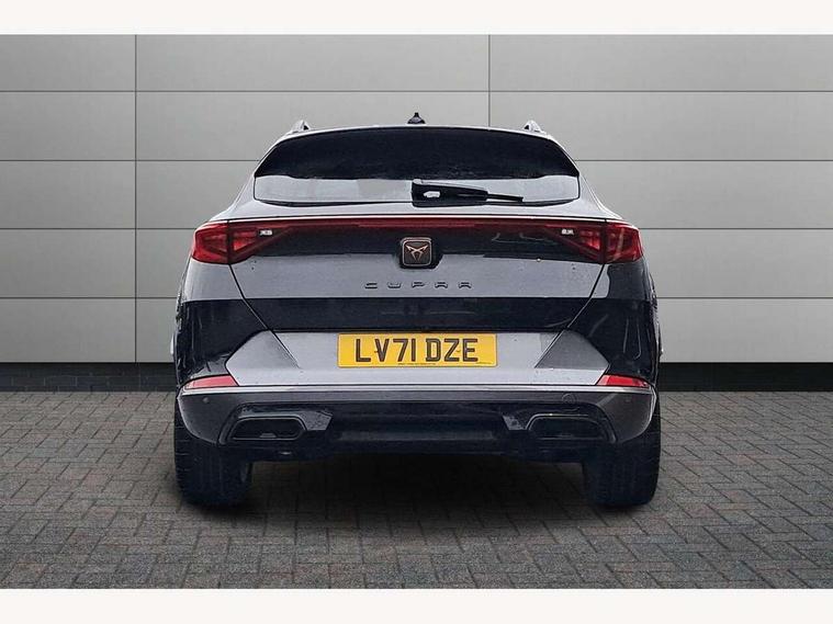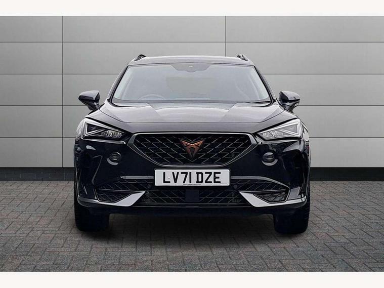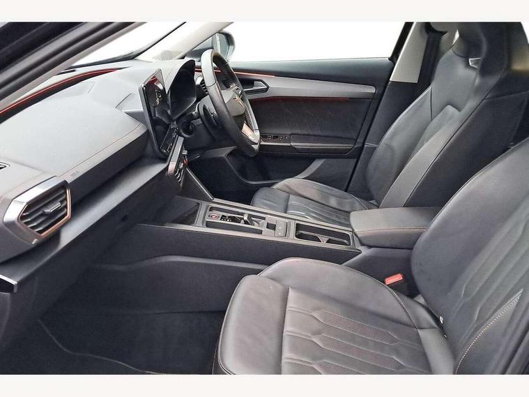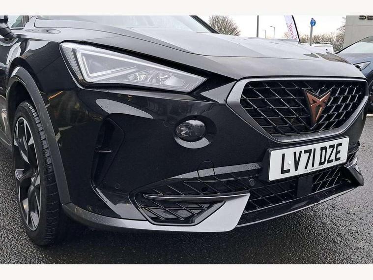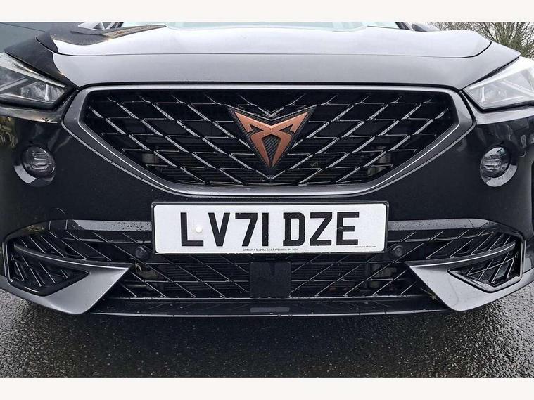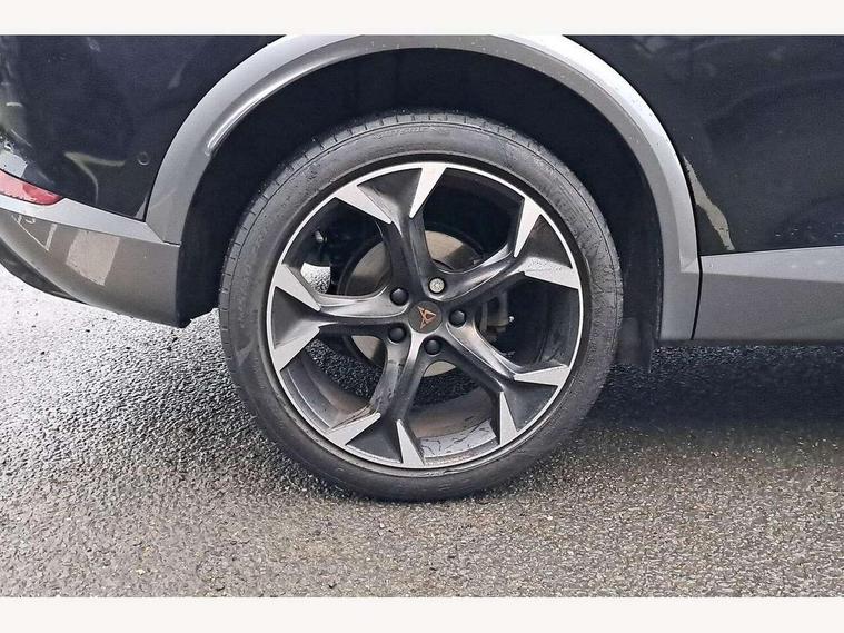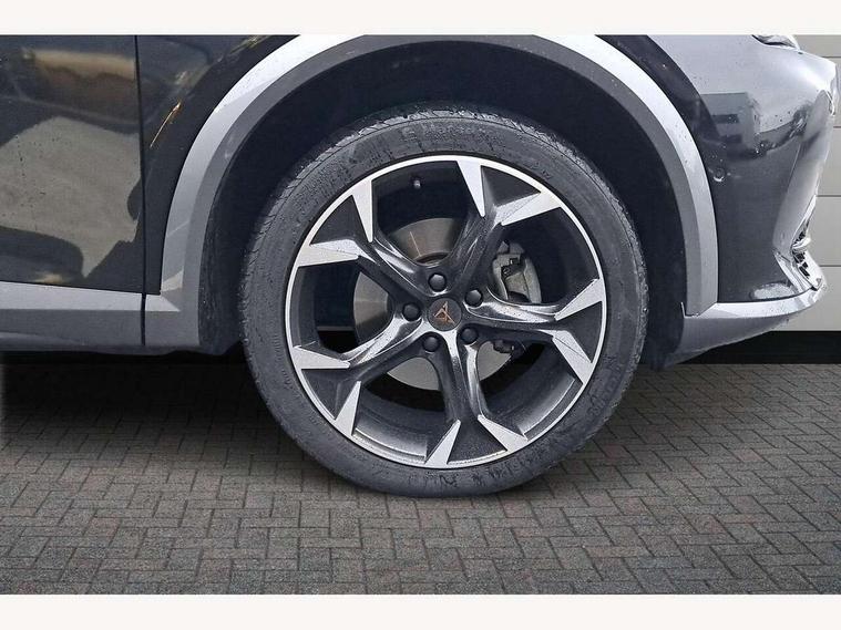Digital cockpit and configurable dashboard, Driver alert system, Driving profile selection, Forward collision warning with automatic braking, Lane assist, Park assist (inc front/rear parking sensors), PAS, Predictive adaptive cruise control with speed limiter, Rear view camera, RPM, trip computer, outside temp gauge, instrument light brightness, low fuel warning light, lights on reminder, gearshift indicator, Service interval indicator, Start/stop system with regenerative braking, Wireless apple carplay, Wireless phone charger, Electronic locking differential and dynamic traction support, Standard suspension, 2 front and 2 rear USB type C sockets, Auxiliary input socket, DAB radio, Auto dimming rear view mirror, Body colour door handles, Body coloured bumpers, Dark grey wing mirror, Daytime running light with automatic headlight control and coming home feature, Dynamic headlight range control, Electric front/rear windows, Electrically adjustable heated and folding door mirrors with memory function, Electrically adjustable, heated and folding door mirrors, Front fog lamps with cornering function, Gloss black roof rails and window surrounds, LED Headlights, LED Taillights with dynamic indicator, Rain sensing wipers, Rear diffuser with black simulated exhaust pipes, Rear wash/wipe, Tinted rear windows, Welcome lights, 12v power supply in centre console, 12V socket, 12v socket in loadspace, 2 front and 2 rear reading lights, 230V socket, 60/40 split rear bench seat with armrest and mechanical seat release, Dust/pollen filter, Front and rear head restraints, Front centre armrest, Heated steering wheel, Height/reach adjust steering wheel, Illuminated interior front door sills, Illuminated sunvisor with mirror, Isofix, Leather multi function heated steering wheel with gear shift paddles, Leather multi function steering wheel with gear shift paddles, Luggage tie-down hooks, Three zone climate control with control panel in rear, Variable luggage/load compartment floor, Wraparound lighting, Genuine Nappa leather Pack - Cupra, Navigation system pack with 10" navigation system - Formentor, 3 point seatbelts on all rear seats, ABS, Brake control system - ESC and brake booster, Child proof door locks, Driver and front passenger airbags with front passenger airbag de-activation, Electronic parking brake, Front and rear disc brakes, Front side curtain airbags, Hill hold control, Seat belt reminder for front and rear seats, Tyre pressure monitoring system, Anti theft alarm system, Keyless entry and start system (KESSY), Locking wheel bolts, Copper and aluminium interior detailing, 19" 'Exclusive' machined sport matte black and silver alloy wheels,