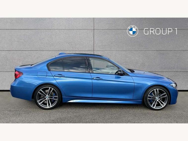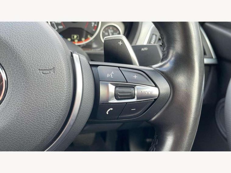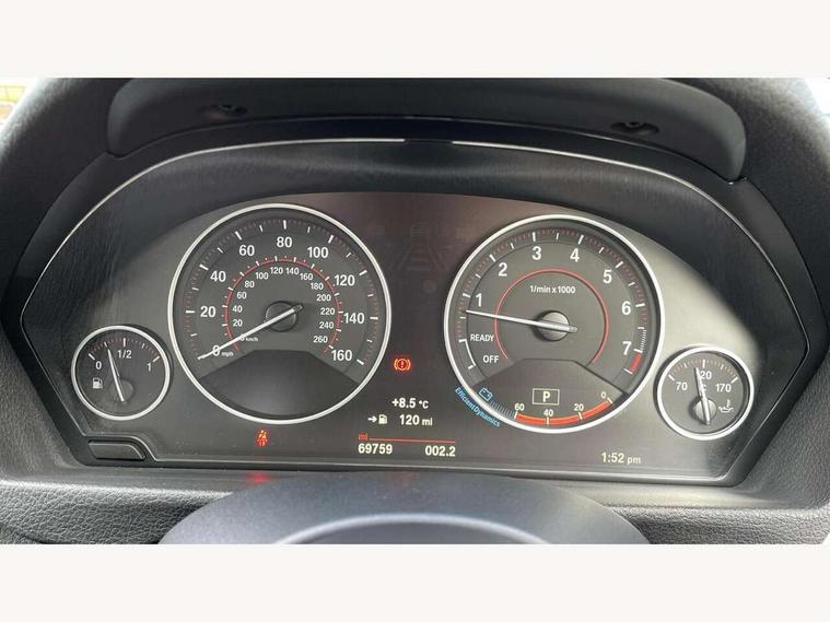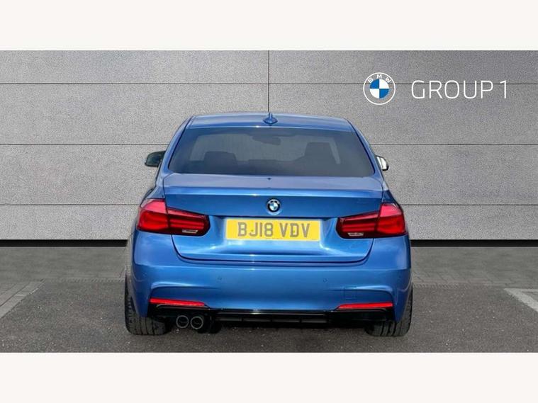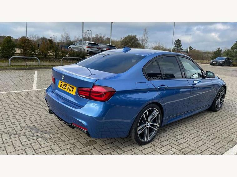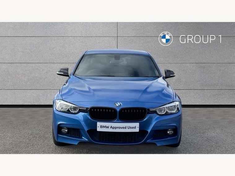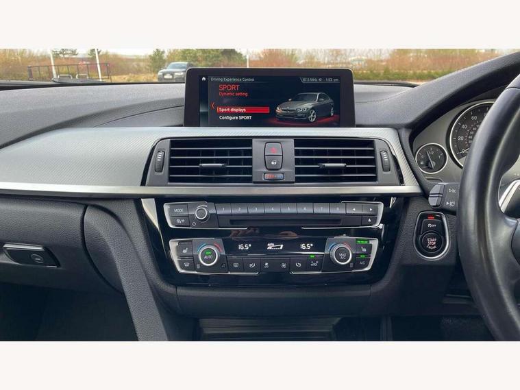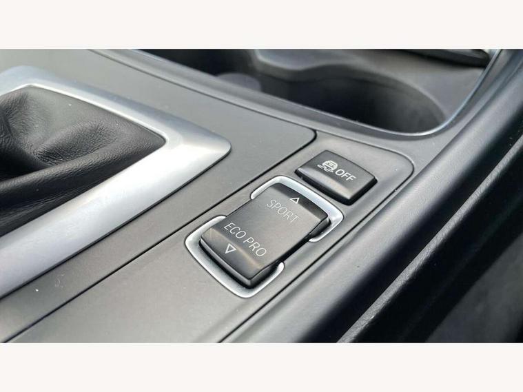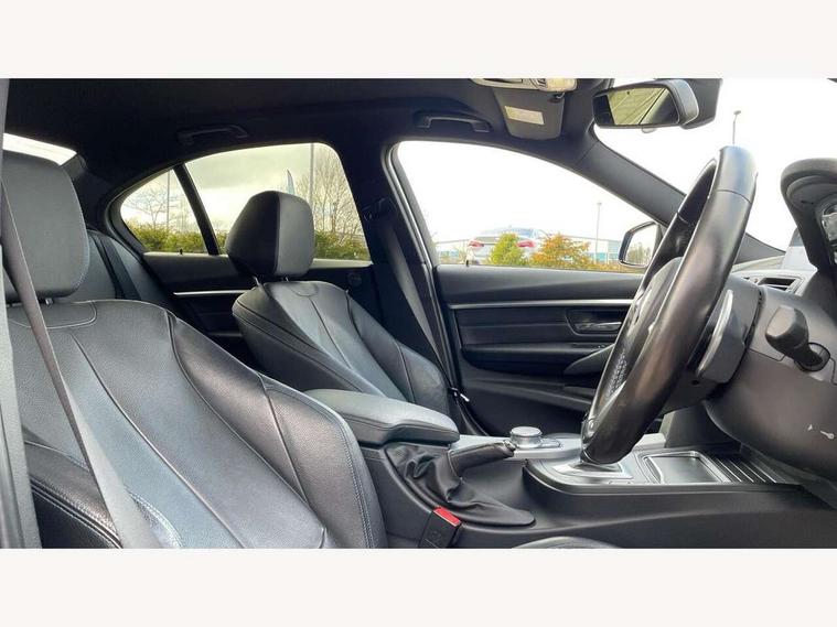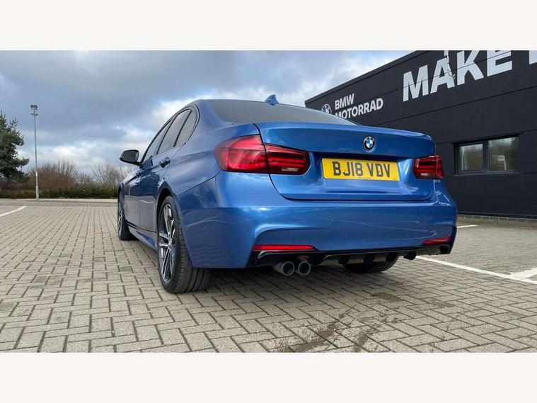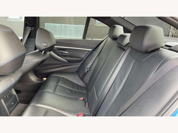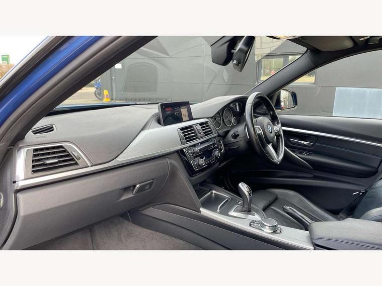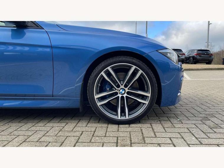 BMW Online services, BMW remote services, BMW Teleservices, Brake force display, Brake pad wear indicator warning light, Check control system, Digital clock, Door/boot open warning light, Lights on warning, Oil temperature gauge, On board computer, On board diagnostics, Operation warning of all exterior lights, Outside temperature display, Push button starter, Real time traffic information, Run flat tyre indicator, Service interval indicator, Traffic message channel (TMC), Drive Performance Control, Electronic differential lock, Sports function on gearbox with steering wheel mounted gearshift paddles, BMW professional radio/CD/MP3, CD Changer preparation, DAB Digital radio, Harman/Kardon logic 7 surround sound system, 'Guide me home' headlamps, 2 speed adjustable intermittent wipers with wash/wipe function, Auto dimming rear view mirror, Automatic headlight beam throw control, Black high gloss door mirrors, Body colour bumpers, Body colour door handles, Body colour roof mouldings, Clear indicator lenses, Dark chrome exhaust tailpipe, Dark headlamp surround, Door sill finishers, Dynamic brake lights, Electric adjustable door mirrors, Electric front and rear windows with one touch/convenient open/close function, Green tinted heat insulating glass, Heated rear window with automatic switch off, Heated windscreen washer jets, High beam assistant, High gloss shadow line, Individual sun protection dark tinted glazing for rear window and rear side door windows, kidney grille with high gloss black vertical slats, LED daytime running lights, LED fog lights, Rain sensor + automatic driving lights control, Shark fin roof aerial, 12V sockets in front centre console and passenger footwell, 2 x folding cupholders in instrument panel above glovebox, 3 rear seat head restraints, 4 foldable grab handles - rear with clothes hook, 4 lashing points to secure luggage, 40:20:40 split folding rear bench seat, Automatic interior light soft on/soft off system, Driver and passenger sunvisors with vanity mirrors + slide cover, Dual zone automatic air conditioning, Folding front centre armrest + storage, Front and rear door armrests, Front and rear velour floor mats, Front door storage bins with bottle holder, Front sports seats with electric side bolster adjustment, Glovebox light, Height adjustable front headrests, Indirect front interior illumination - soft-light function, Individual anthracite headlining, Isofix system on outer rear seats, Leather gear knob, Leather gear selector lever handle, Leather handbrake grip, Lockable glovebox, Luggage compartment lighting, Multi-function controls for steering wheel, Reach + rake adjustable steering column, Rear centre armrest with 2 cupholders, Rear storage compartment in multifunction centre console with sliding cover, Storage compartment in rear doors, Toolkit located in luggage compartment, Extended lighting package - 3 Series, Extended storage pack - 3 Series Saloon, 3 point inertia reel seatbelts + pre-tensioners on outer rear seats, ABS, Automatic Stability Control (ASC), BMW emergency call, Cornering brake control (CBC), Crash sensor, Driver and passenger airbags, DSC+, Dynamic brake control, Dynamic Traction Control - DTC, Front and rear head airbags, Front passenger airbag deactivation, Front seat side impact airbags, Front seatbelt pretensioners + load limiters, Hill start assist, M Sport braking system, Rear child proof door locks, Seatbelt warning, Three 3 point rear seatbelts, Twin horns, Tyre pressure monitor, Warning triangle and first aid kit, Automatic drive away locking facility, Central locking fuel filler cap, Centre lock switch, Electronic immobiliser, Key integrated remote control central locking, Remote control alarm, 19" M double spoke alloy wheels style in bicolour orbit grey - style 704M, Low rolling resistance tyres, Run-flat tyres,