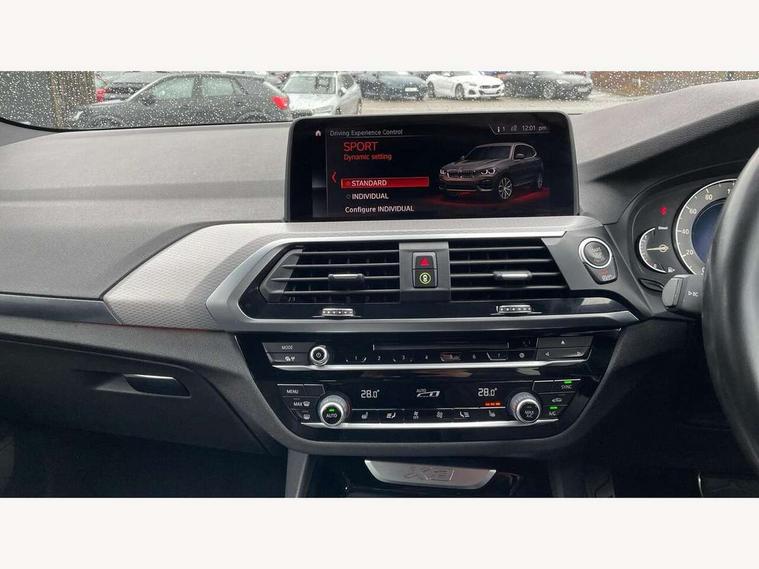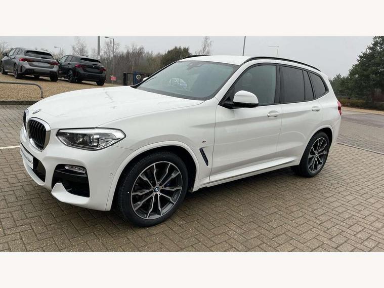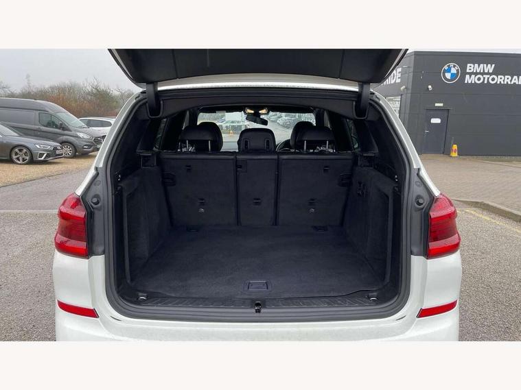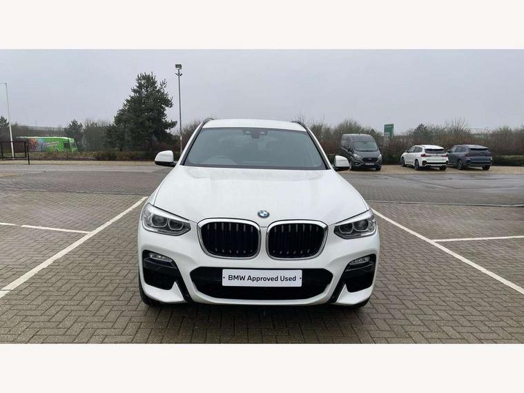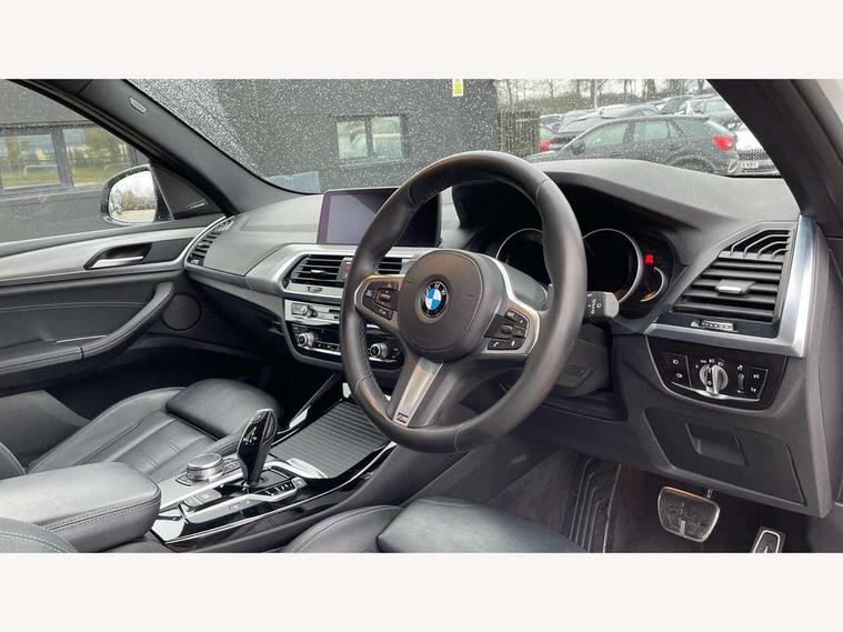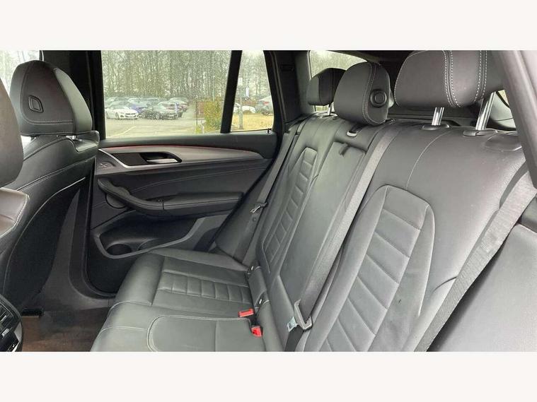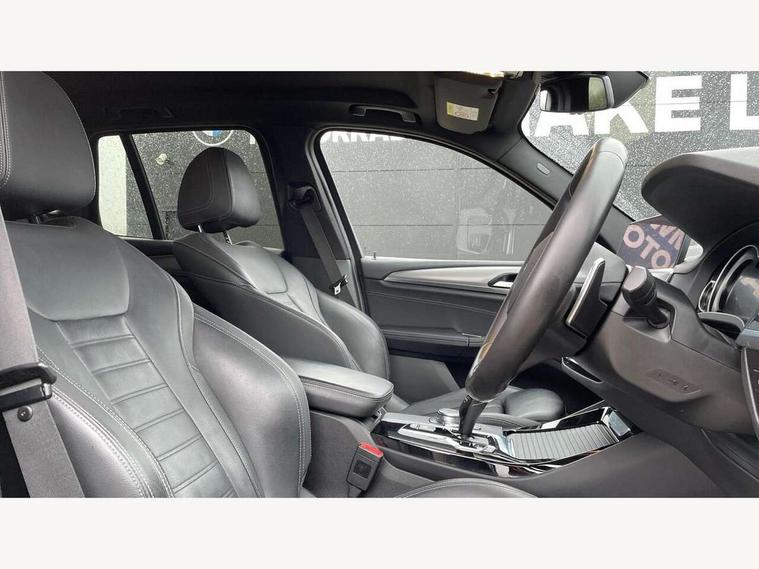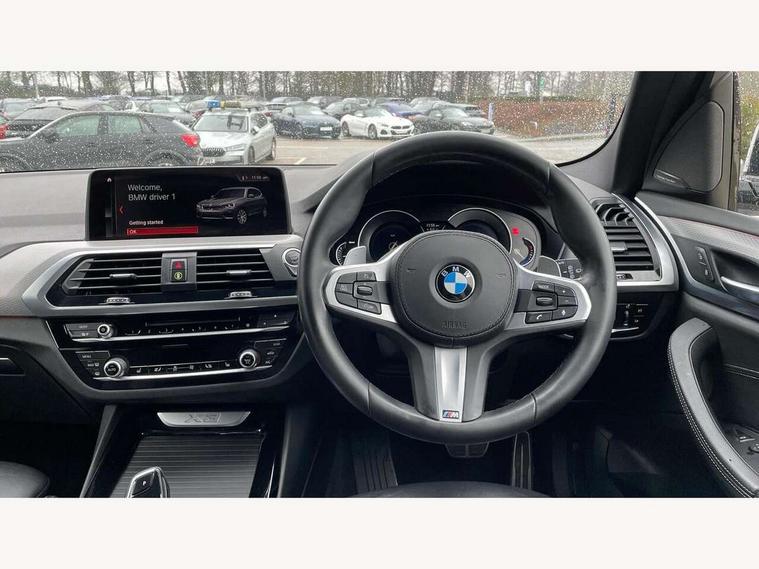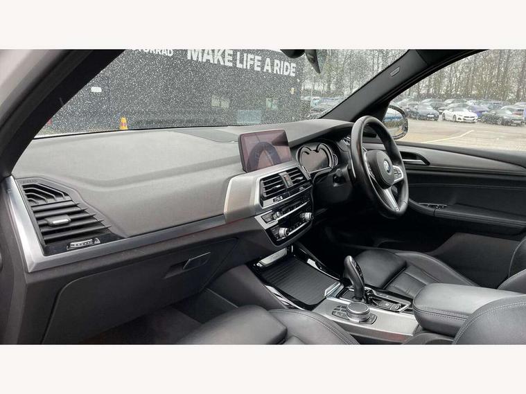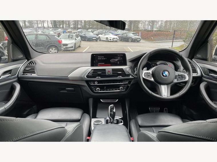 Active Guard incl speed limiting and lane departure functions with auto steering, and front collision warning with brake intervention, Attentiveness assist, Automatic tailgate operation, BMW Live Cockpit Professional sat nav system including 10.25" high resolution display and Intelligent Voice Assistant, BMW Online services, BMW Teleservices, Brake pad wear indicator in front and rear, Check Control warning system for monitoring of lights and door/luggage compartment open warning, Control display - 6.5" colour display screen, Electric Power Steering (EPS) with Servotronic, Front/rear Parking distance control, iDrive Controller with 8 favourite buttons, Lights on warning by audio warning signal when ignition is switched off, Navigation system - BMW Professional multimedia with Hard disc drive (HDD) and 10.25" touch display, Oil sensor for level and grade, warning by check control system, On board computer - average speed+fuel consumption, service interval, clock/date, odometer/trip meter, outside temperature display and ice warning, Optimum shift indicator, Personal Profile - automatic lock when driving away selectable, Real time traffic information, Semi digital instrument cluster, Stop/start system, Automatic transmission with gearshift paddles, Diesel particulate filter, Incorrect fuelling protection, Larger capacity fuel tank, Multi-link rear suspension, Performance Control, Auxiliary socket for external MP3 player, BMW professional radio/CD/MP3, DAB Digital radio, Acoustic glazing, Black finish on B pillars, Body colour door handles, Body colour electric adjust heated aspherical door mirrors, Body colour roof mouldings, Body coloured bumpers, Chrome kidney grille with high gloss black vertical slats, Direction indicator, side repeaters, integrated in exterior mirrors, Dual chrome exhaust, Dynamic brake lights, Exterior mirrors - electrically folding with anti-dazzle, Fingertip control / anti-trap function on electric window, Follow me home headlights, Front and rear bumper system with replaceable deformation elements, Front and rear electric windows, Green tinted heat insulating glass, Heated windscreen washer jets, Height adjustable headlamps, High gloss black door sill finishers, High gloss black shadow line roof rails, High gloss shadowline exterior trim in decorative moulding side frame/recess cover/guide rail/B, C pillars/mirror frame and triangle with mirror base, High level 3rd brake light incorporating LED Technology, Interior rear view electrochromatic mirror with automatic anti dazzle function, LED front fog lights, LED tail lights, Lightweight engineering, M aerodynamic bodystyling, Model designation, Rain sensor including auto headlights activation, Rear wiper, Shark fin antenna, Visible VIN plate, Welcome lighting, Windscreen wipers with adjustable interval, 12V socket in centre console and luggage area, 3 rear headrests, 3 zone automatic air conditioning, 4 lashing points to secure luggage, Ambient lighting, Anthracite headlining, Anthracite Velour floor mats, Driver/passenger sunvisors with ticket holders + illuminated vanity mirrors, Foldable boot floor with storage compartment, Four grab handles integrated in roof lining, Front and rear bottle holders integrated into door trim storage compartments, Front and rear side armrests integrated into door trim, Front centre armrest with storage compartment, Front footwell lights, Front sports seats, Front/rear courtesy lights with soft on/off dimming, Front/rear reading lights, Height adjustable front/rear head restraints, Isofix rear child seat preparation, Leather gear knob, Luggage area underfloor compartment, Luggage compartment lighting, M Sport multifunction leather steering wheel, Parcel shelf removeable and storable under boot floor, Reach and rake adjustable steering column, Rear centre armrest with 2 cupholders, Rear seat centre armrest with two cupholders, Removable / retractable luggage cover, Slope adjustable rear seats, Storage compartment in rear centre console and front/rear door trims, Through loading system with 40/20/40 split folding rear seat, Toolkit located in luggage compartment, Two front cupholders with removable oddments tray/lid, Vernasca leather upholstery, Connected pack professional - X3, ABS/EBD, ADB - Automatic Differential Brake, Automatic Stability Control (ASC), Battery safety cut-off, BMW emergency call, Brake assist, Brake assist function, Brake drying, Brake energy regeneration, Braking pre-tensioning, Child locks on rear doors, Cornering brake control (CBC), Crash Sensor - activation of central locking release, hazard warning light and interior lighting, Deactivation of fuel pump in the event of a crash, Driver and front passenger front and side airbags with passenger deactivation and ITS front and rear head airbags, DSC+, Dynamic brake control, Dynamic Traction Control - DTC, Electromechanical parking brake, Front seat belts warning, Hill descent control, Hill start assist, Seatbelt security check for front seats, Side impact protection, Three point seatbelts to all seats with front and outer rear pyrotechnic belt tensioners and seat belt force limiters, Two tone horn, Tyre pressure monitoring system, Ventilated front and rear disc brakes, Warning triangle and first aid kit, Central locking switch for all doors, fuel filler cap and luggage compartment, Electronic engine immobiliser, Locking wheel nuts, Remote control including two integrated key - one button for open/close all lockable content, windows and separate button for open luggage compartment, Remote control Thatcham category 1 alarm, Start/stop button with Comfort Go keyless engine start and auto Start/stop deactivation button, Low rolling resistance tyres,