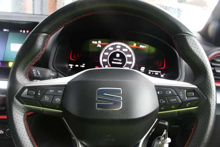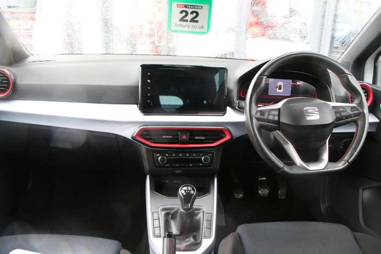'Lights On' Reminder warning buzzer, 8" Digital cockpit, Digital clock, E-call, Electric speed sensitive power steering, Full Link Smartphone Integration with Mirror Link, Apple Car Play, Google Android Auto with USB Type C cable for Apple and Android compatibility, Lane keeping system, Low fuel warning light, Outside temperature display, Rear parking sensor, RPM counter, Seat connect with safety, service, remote and online, SEAT Drive profile - Four different models normal-sport-eco-individual, steering response, throttle response, Trip computer, Wireless phone charger, 9.2" colour touchscreen with navigation system, voice control and USB port (type c), Bluetooth interface for hands free and audio streaming, DAB digital radio and AM/FM radio, Steering wheel mounted audio controls, Anti theft roof antenna, Auto dimming interior rear view mirror, Automatic activation of hazard warning lights, Body coloured bumpers, Body coloured door handle inserts, Chrome roof rails and window surrounds, Dark tinted rear windows, Electric front/rear windows, Electrically adjustable, heated and folding door mirrors, Front fog lights with cornering function and rear fog light, FULL LED automatic headlights with dynamic headlight range control, coming and leaving home, LED daytime running lights, LED rear tail lights and licence plate lights, Protective side mouldings, Rain sensing wipers, Rear side wing doors, Rear spoiler, Rear window wash/wipe, Roof colour door mirrors, Third brake light, Twin exhaust pipe styling hidden exhaust pipe, Visible VIN plate, Windshield wiper with intermittent control and potentiometer, 2 cupholders, 3 seat bench in 2nd row, 60/40 split folding rear seat, Aircare filter, Black interior roof, Cloth upholstery, Double boot floor, Driver sunvisor with covered mirror + card holder, Dual zone climate control, Front courtesy light with 2x front and 2x rear reading lights, Front sport seats, Gear shift indicator, Height adjustable front seats, Height/reach adjustable steering column, Illuminated boot, Instrument lighting with brightness control, Interior ambient lighting, Interior light in footwell, central console and door panel, ISOFIX points in outer rear seats with top tether anchorage points, Passenger sunvisor with vanity mirror, Perforated flat bottomed leather steering wheel/gear knob/handbrake with red stitching and FR logo, Single front passenger seat, Two front and three rear height adjustable headrests, Interior chrome pack - Arona, 3 point seatbelts on all rear seats, ABS, Active front headrests, Child locks on rear doors, Driver and front passenger airbags with front passenger airbag de activation, front side and curtain airbags, Electronic stability control, Emergency Brake Assist (EBA) and front assist, Front and rear seatbelt reminder, Hill hold control, Multi-Collision braking, Tiredness recognition system, Traction control, Tyre pressure monitoring system, Alarm with back-up horn, Electronic engine immobiliser, Locking wheel bolts, Remote central locking + deadlocks, Tow away protection, Titan black dashboard, 17" Dynamic alloy wheels,