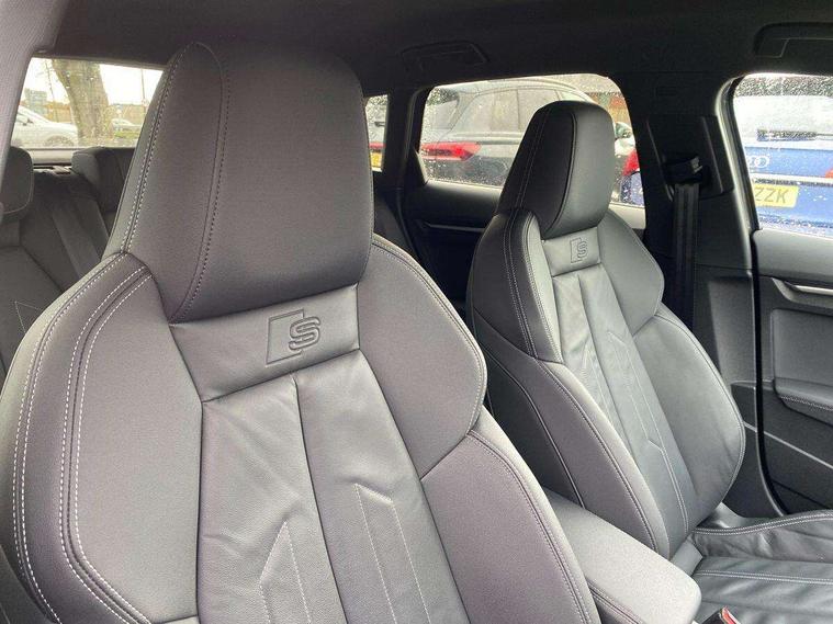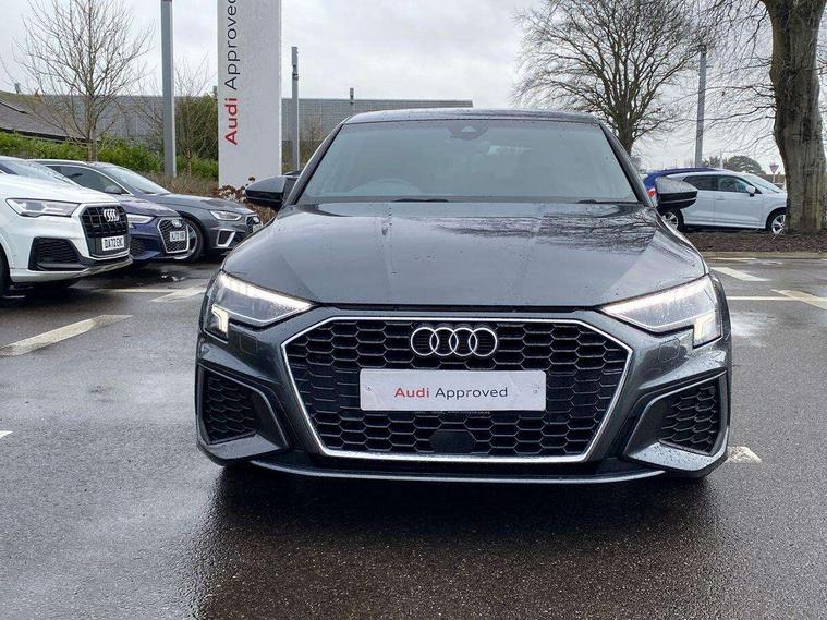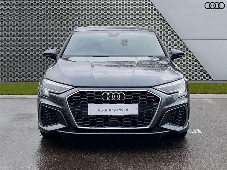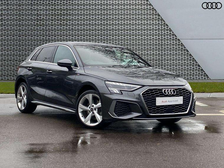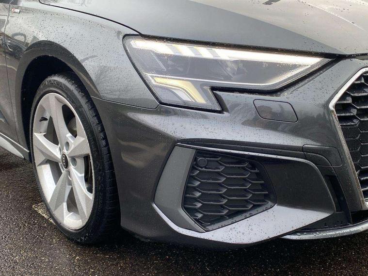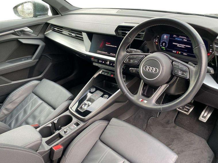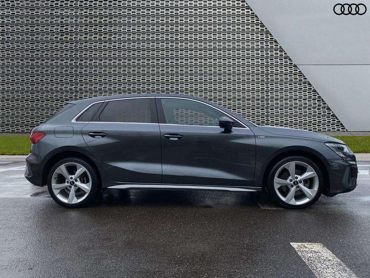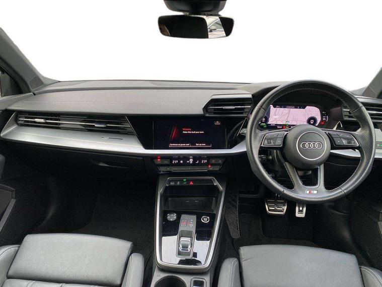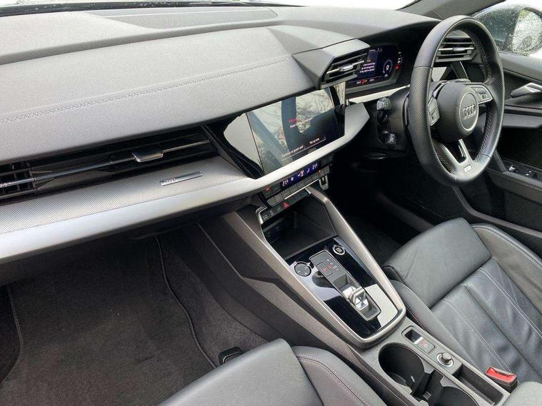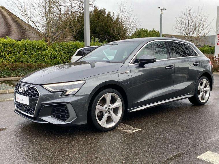 Audi drive select (Auto, Comfort, Dynamic, Efficiency and Individual), Audi smartphone interface, Audi Virtual Cockpit - 10.25" digital and colour instrument cluster, Automatic start/stop system with recuperation, Bluetooth interface, Collision avoidance assistant, e-Call (emergency call), Electromechanical power speed sensitive steering, Lane departure warning system, MMI Navigation Plus with high resolution 10.1" colour touch screen display, Service indicator, Trip computer, Voice control system with natural language interaction, 3 pin 10 amp domestic charging cable, 3.6 kw On-board charger, Standard suspension, Type 2 mode 3 32 amp charging cable, Type 2 socket for AC charging, 2xUSB-C connection with data and charging functions, 6 passive loudspeakers, DAB Digital radio, 3rd brake light, Acoustic glass windscreen, Aluminium window trim, Auto dimming frameless rear view mirror, Electrically adjustable/heated/folding/auto dimming door mirrors with integrated LED indications + kerb view function for passenger side, Front electric windows, Illuminated aluminium inserts front door sills with S logo, LED daytime running lights, LED headlights with LED rear lights and dynamic rear indicators, Light and rain sensors, Privacy glass - dark tinted rear window, rear door and side windows, Rear electric windows, Rear side air outlets in grained matt black, Rear side wing doors, Rear wiper, S line bumpers, S roof spoiler, 12V socket and storage compartment in front centre console, 3 seat bench in 2nd row, 40/20/40 split folding rear seat bench with cupholder, Black cloth headlining, Dual zone electronic climate control, Front and rear centre armrest in leather, Front and rear headrests, Front/rear floor mats, Height and reach adjustable steering wheel, Illuminated vanity mirror, Interior lighting - glove compartment light and right hand side, Luggage compartment floor covering, Manual boot compartment lid, Manually adjustable front seats, Seat side bolsters, Single front passenger seat, Stainless steel pedals and front footrest in black, Twin leather upholstery with front sports seats S embossed logo, Aluminium interior elements pack - A3 Sportback, S line styling pack - A3 Sportback, 3x3 point rear seat belts, Audi pre sense front, Driver and front passenger airbag with passenger airbag deactivation, Electronic Stabilisation Control (ESC) including ABS, ASR and EDL, First aid kit with warning triangle and 2 safety vests, Front side airbags with head airbags and interaction airbag, Pre-sense front with pedestrian and cyclist detection, Seatbelt monitoring, Tyre pressure loss indicator, Anti theft alarm, Anti-theft wheel bolts, Immobiliser, Manual child locks, Remote control central locking, Accent surfaces in the dashboard and centre console in platinum grey silk effect paint finish, Dark spectrum aluminium inlays, Tool kit, Tyre repair kit,
