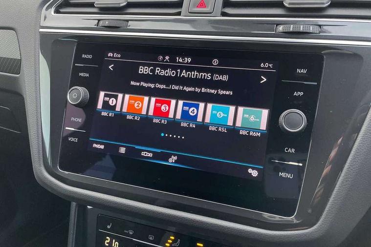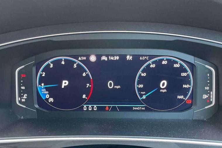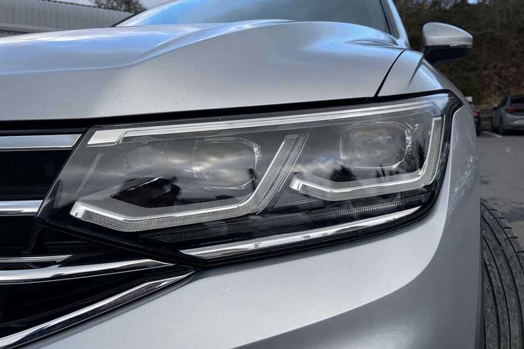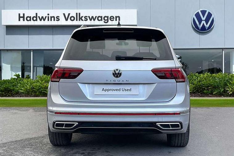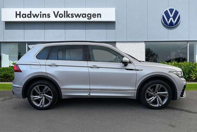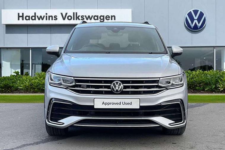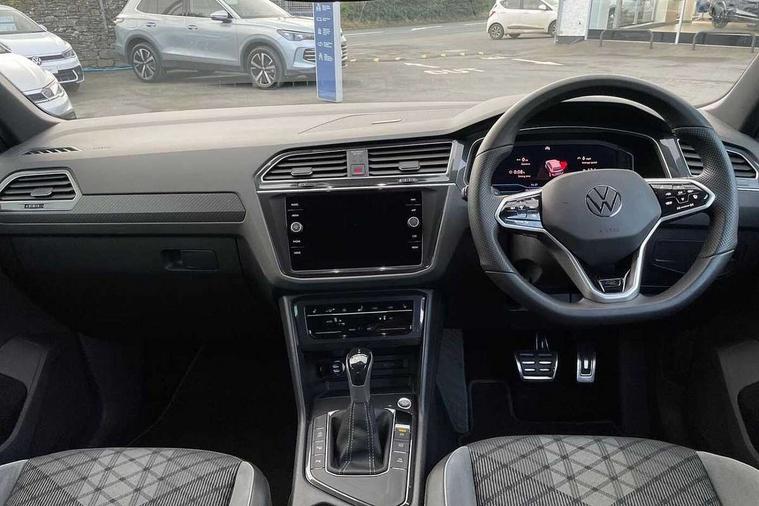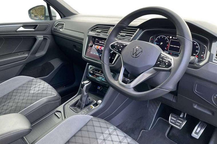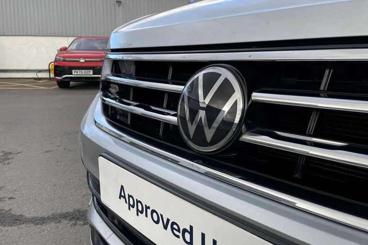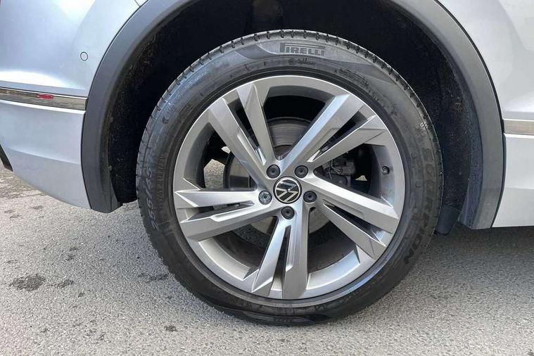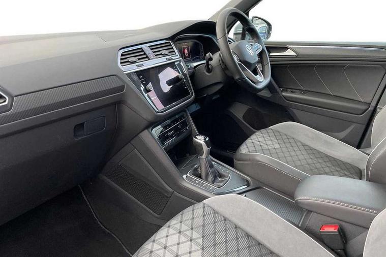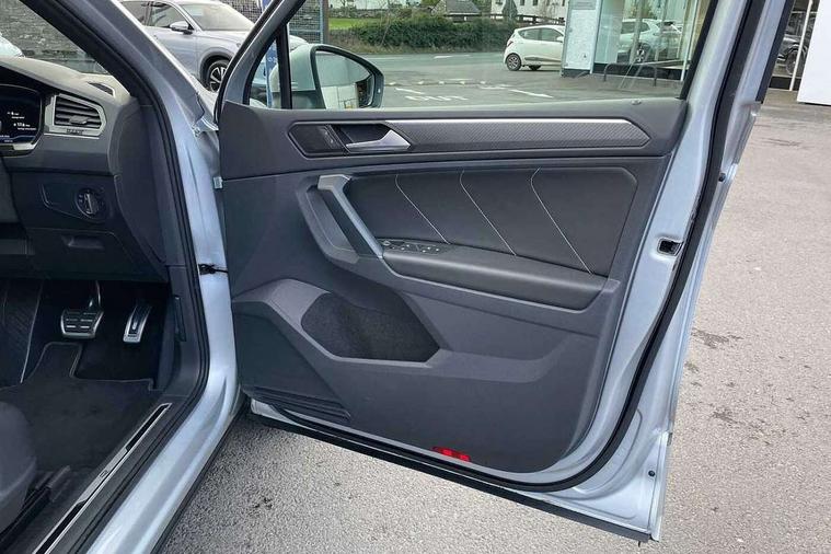 Adaptive cruise control ACC stop and go including speed limiter, App-Connect incl. App-Connect Wireless for Apple CarPlay and Android Auto, Bluetooth phone integration system, Comfort drive travel assist, Digital cockpit pro, Driver alert system, Driver profile selection, Dynamic road sign display, eCall emergency call system, Electromechanical speed sensitive power steering, Emergency assist, Front and rear parking distance sensors, Instrument cluster mph speedometer Great Britain, Lane keeping system Lane Assist, Lights on warning, Multifunction front facing camera, Outside temperature display, Premium multifunction display with multi colour display, Preparation for subsequent activation Navigation feature Discover Media includes Streaming and Internet, Remote control boot opening, Rev counter, Service interval indicator, Speed limit display, Start/stop system with regenerative braking, Tailgate/trunk lid unlocking from outside, Trip computer, Warning sound and light for doors and tailgate open, Battery regeneration during braking, Sports suspension, 8 Speakers, Digital radio reception DAB+, Diversity antenna for FM reception, Radio, Auto dimming interior rear view mirror, Automatic headlight control system, Body colored bumpers in R-Line style, Body colored exterior mirror housings, Body colour door handles, Chrome moldings on the side windows, Coming/leaving home lighting function, Dynamic headlight range control, Front and rear electric windows, Heated rear window, High level 3rd brake light, Laminated safety glass windshield, heat and sound insulating, LED headlamps with LED separate daytime running light and dynamic cornering light, LED rear combination lamps, LED rear number plate lights, License plate carrier in front and rear, Poor weather light and cornering light, Power adjustable, folding and heated door mirrors with surround lighting, front passenger exterior mirror lowering function, Privacy glass for rear side windows and rear window, R Line body kit, R Line side sills, Rain sensor, Rear exhaust tailpipe, Rear fog lamp, Rear side wing doors, Rear spoiler in R style, Rear windscreen washer and wiper with interval delay, Side and rear windows in heat insulating glass, Trailer Stability Programme, Unique R Line badging, Windscreen wipers/ intermittent wipe + 4 position delay, 12V outlet in center console rear and in luggage compartment, 12V outlet in front and tray, 2 LED front reading lights, 2 LED rear reading lights, 3 bench rear seats in 2nd row, 3 rear headrests, Air Care Climatronic 3 zone automatic climate control with enhanced air filter and controls in the rear, Art Velours greyson sports cloth upholstery, Backrest release for left front seat, Black headlining, Brushed stainless steel pedals and footrest, Carpet mats in front and rear with decorative stitching in Gray, Climate control unit rear with touch function, Door and side trim panel in foam film, insert in leatherette, Driver + front passenger lumbar support, Front footwell illumination, Front scuff plates in aluminum with R-Line logo, Front seats head restraints (x-adjustment), Height adjustable front seats, Height/reach adjust steering wheel, Isofix Preparation 2 Rear child seats, Leather gear knob, Rear bench seat asymetrically split folding, longitudinally movable and folding with load-through hatch and center armrest, Remote unlocking for rear seat backrest, Single front passenger seat, Sun visors with illuminated vanity mirrors, Top front comfort seats, Winter pack - Tiguan, 3 point seat belt for centre rear seats, 3 point seat belts with seat belt pretensioners for the outer rear seats, Curtain airbags for front and rear passengers, Driver/Front Passenger airbags, Drivers knee airbag, Electronic parking brake with auto hold, Electronic Stability Control with driver steering recommendation, ABS, ASR, EDL, EDTC and trailer stabilization, Front assist with autonomous emergency braking (for Adaptive Cruise Control ACC up to 130 mph), Front disc brakes, Front passenger airbag deactivation, Front side airbags, Height adjustable front 3 point seatbelts + pretensioners, Manual child proof rear door locks, Pedestrian monitoring system, Proactive passenger protection system in combination with front assist, Rear disc brakes, Two tone horn, Tyre pressure loss indicator, Warning sound and light for front seat belts if unfastened, Warning triangle, Anti theft alarm system with interior monitoring, backup horn and towing protection, Anti theft wheel bolts, Electronic engine immobiliser, Keyless locking and starting system keyless access with safelock, Chrome elements on the mirror switch power window switches and door pulls, Decorative inserts Carbon Gray for dashboard and front door trim panels, Interior door handle in matte chrome, 19" Valencia alloy wheels with AirStop tyres, Tool kit, Tyre mobility kit Includes 12V compressor and tyre sealant,
