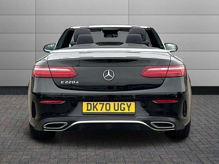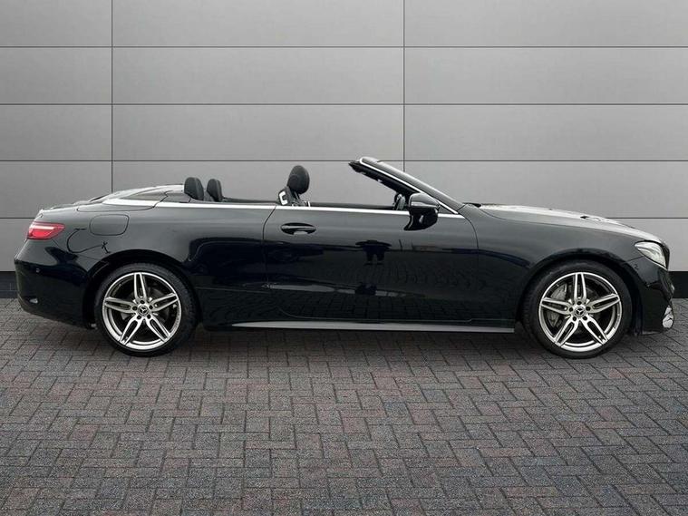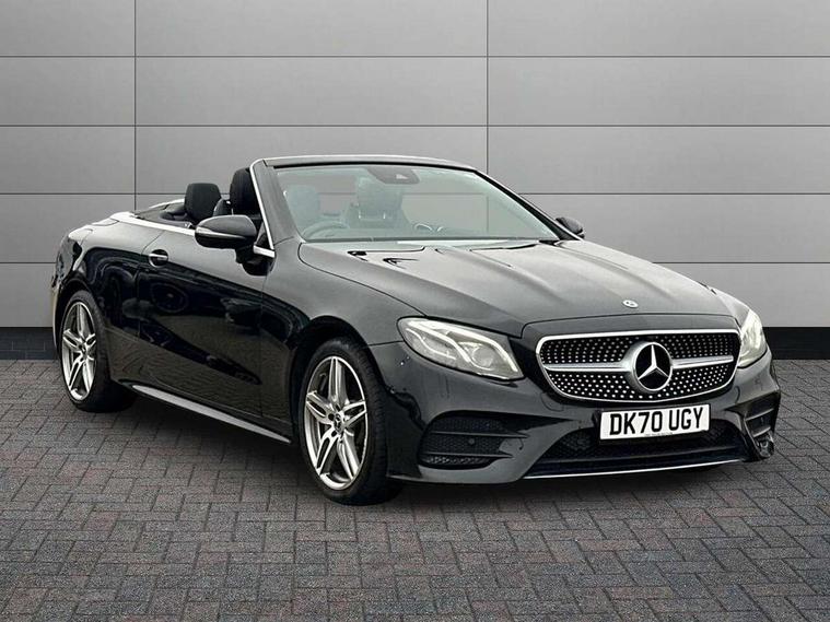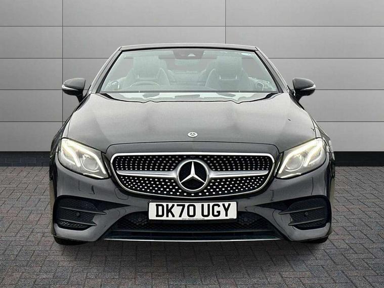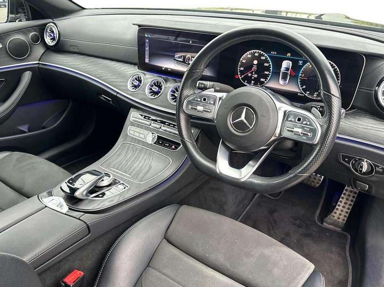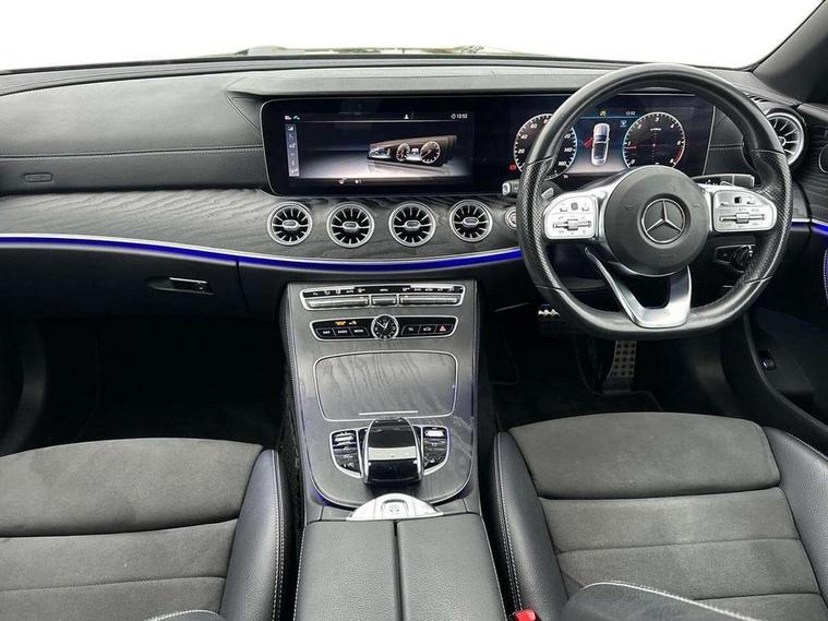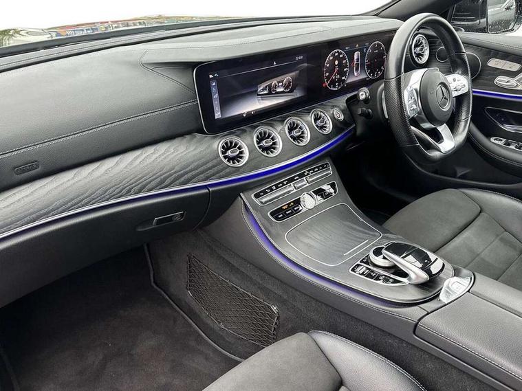 Active parking assist including front and rear parking sensors, Analogue clock, Attention assist, Automatic boot separator, Blind spot assist, Bluetooth interface for hands free telephone, Brake wear warning display, Cockpit display 12.3" widescreen digital instrument cluster, Collision prevention assist plus, Direct steer speed sensitive steering, Direct steering, DYNAMIC SELECT with a choice of driving modes (ECO, Comfort, Sport, Sport+ and Individual), ECO start/stop function, Engine start/stop button, High resolution 12.3" multimedia colour display, Mercedes connect me, Multi function trip computer, Outside temperature display, Remote boot release, Reversing camera, SD card based satellite navigation system, Service indicator (ASSYST), Status display for rear seat belts in instrument cluster, Touchpad with control wheel, 66 litre fuel tank, 8.5 litre AdBlue tank, Agility control sports suspension with selective damping system, Diesel particulate filter, Incorrect fuelling protection, 2 USB ports in centre console, Audio 20 with USB, touchpad and control wheel with Media Interface with Bluetooth interface and hands-free function, DAB Digital radio, Acoustic soft-top with enhanced climate and noise comfort, Adaptive brake lights, AIRCAP wind deflector and draught stop, AMG bodystyling front and rear aprons, side skirts, AMG boot lid spoiler in body colour, AMG front, rear apron and side skirts, Body colour door handles, Body coloured bumpers, Electric windows with one touch opening/closing and obstruction sensors, Exterior mirrors heated and electronically adjustable, Illuminated front door sill panels with Mercedes-Benz lettering, LED high performance headlamps with integrated LED daytime running lights, Magic Vision Control heated windscreen wiper system, Rain sensing windscreen wipers, Rear LED lights, Top surround of side windows in polished aluminium, Visible twin pipe exhaust system integrated into bumper, Waistline in polished aluminium, 3-spoke flat bottom multifunction AMG steering wheel with Touch Control buttons, trimmed in black nappa leather, 4 way adjustable front head restraints and 2 way rear head restraints, 50/50 split folding rear seat, Airscarf - neck level heating, Artico man-made leather upper dashboard and beltlines with contrast stitching, Automatic child seat recognition sensor, Automatic two zone climate control, Bag hook in luggage compartment, Belt feeder driver and front passenger seat belt automatically positioned within easier reach, Black roof lining, Central stowage compartment with 12 V socket in centre console, Centre armrest and door handle illumination, Chrome door pins, Easy entry seats, Floor mats with AMG lettering, Front and rear door pockets, Front centre armrest with stowage compartment, Front footwell lights, Glasses compartment in overhead control panel, Glove compartment - lockable, air conditioned and illuminated, Heated front seats, Interior lighting - 64 colour Ambient lighting, Interior rear light/integral reading lights, Isofix rear child seat fastenings, Multi contour front sports seats, Multi function steering wheel, Partial electric front seats/backrest/height adjust, Rear centre armrest with 2 cupholders + storage, Seat occupancy sensor for front passenger seat, Sports pedals in brushed stainless steel with black rubber studs, Steering column manually adjustable for height and reach, Steering wheel gearshift paddles, Steering wheel touch control buttons for audio and onboard settings, Storage net in luggage compartment, Sunvisors with illuminated vanity mirrors, Twin front cupholders, Mirror pack - E Class, Seat comfort pack - E Class, Stowage pack - E Class, 2 x 3-point rear seatbelts, Active bonnet, Active brake assist, Adaptive brake system, Adaptive driver and front passenger airbags, Anti-lock braking system (ABS), Crash sensor (auto door unlocking), Drivers knee airbag, Electric parking brake, Electronic Stability Programme, Front and rear window airbags, Front seatbelt pretensioners, Front side airbags, Head airbags, Hill hold function, Perforated front brake discs with "Mercedes-Benz" lettering, Seatbelt warning, Tyre pressure monitoring system, Warning triangle and first aid kit, Alarm system/interior protection/immobiliser, Central locking with interior switch, automatic locking and crash sensor with emergency opening function, Chrome surround in electric key, Keyless entry go starting function, Black open pore ash wood, Open pore black ash wood centre console, Run flat tyres,