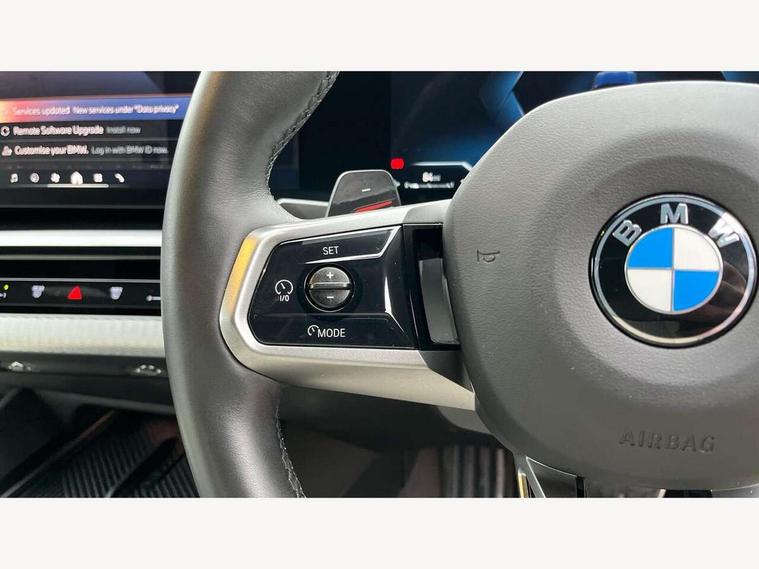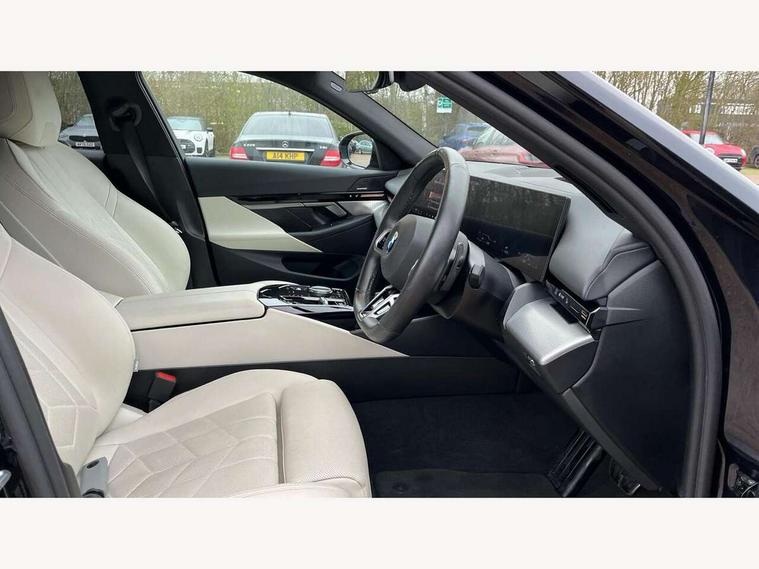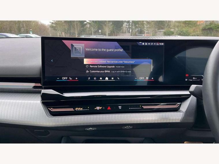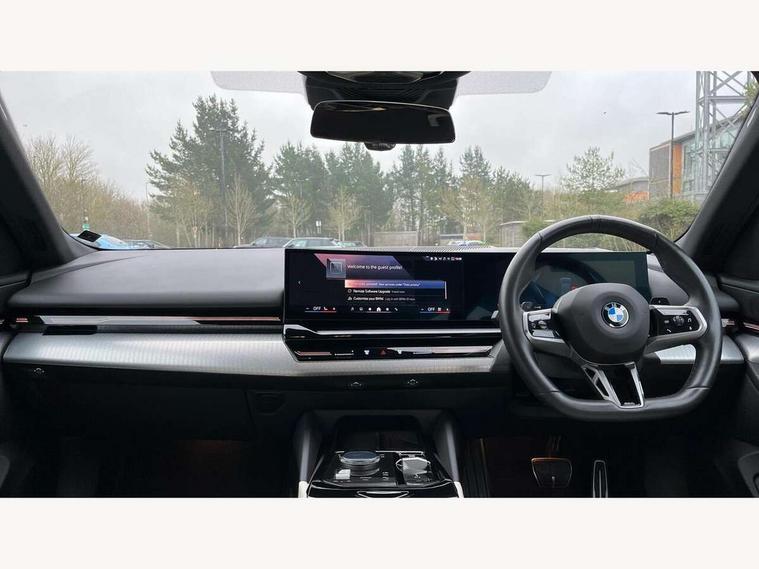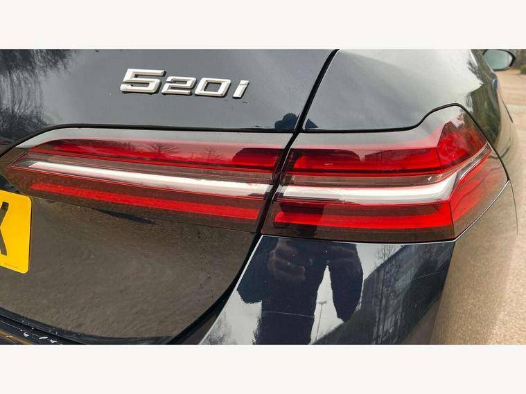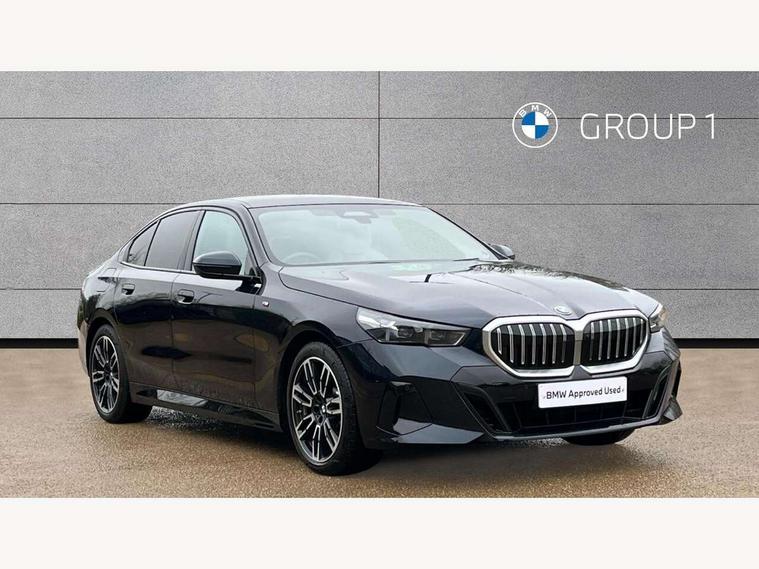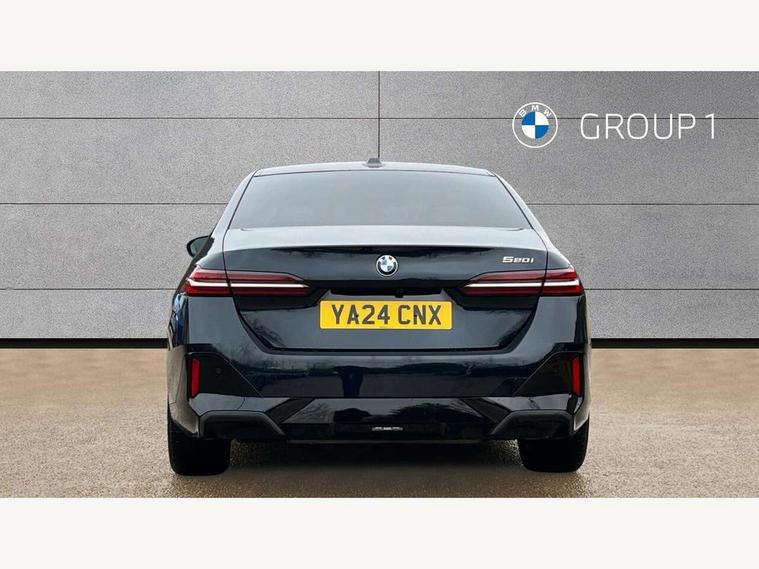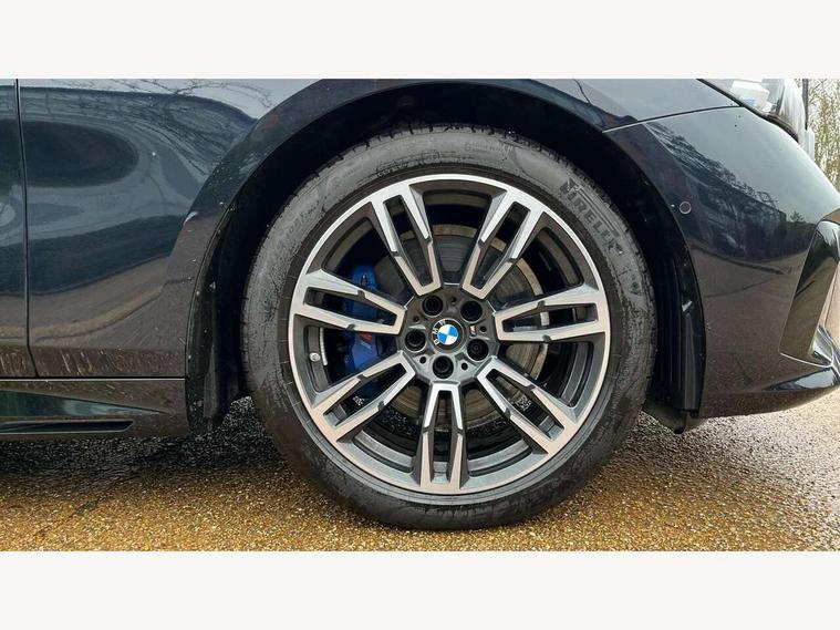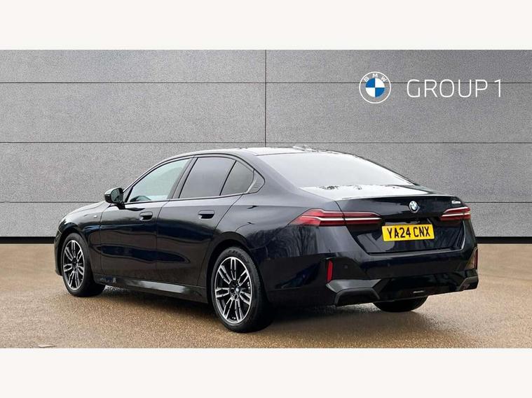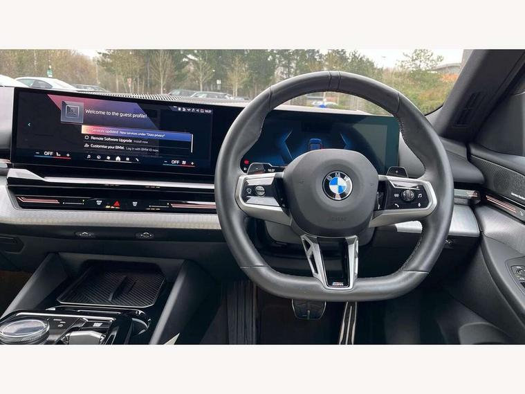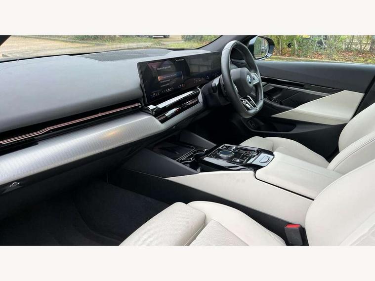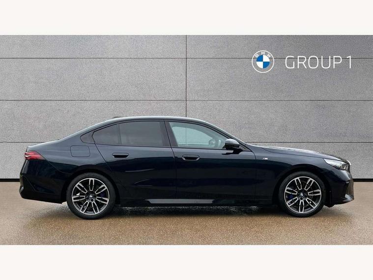 BMW ConnectedDrive online services, BMW legal emergency call, BMW Teleservices, Brake pad wear indicator, Cruise control with brake assist, Multifunctional instrument panel, Oil sensor for level and grade, On board computer inc. average speed, fuel consumption, liquid crystal Info display, journey computer, outside temperature display, personal profile, On-board diagnosis - OBD, PAS, Powered by Operating System 7.0, Run flat indicator, Service interval indicator, Stop/start button, 8 speed automatic steptronic transmission with gearshift paddles, DAB tuner, Personal eSim, Acoustic glazing, Adaptive LED headlights with high beam assist, Automatic cornering lights, Automatic windscreen wipers and automatic headlight, BMW selective beam, Body colour door handles, Body coloured bumpers, Dynamic brake lights with LED technology, Electric adjustable door mirrors, Electric front and rear windows with fingertip open/close + anti-trap facility and comfort closing function, Follow me home headlight function, Heated windscreen washer jets, LED daytime running lights, LED third brake light, Rear boot, Rear side wing doors, 2 zone automatic air conditioning, 3 seat bench in 2nd row, 3 spoke leather M steering wheel in BMW M specific design with M badge, 40/20/40 split folding rear seats with backrest, Armrest - front and rear integrated door trim, centre console includes storage compartment, rear centre includes 2 cupholders, Child seat ISOFIX attachment with rear outer seats includes top tether, Electric adjustable steering column, Electrically adjustable lumbar support for driver and front passenger, Front sport seats, Heated driver and front passenger seats, M Anthracite headlining, M anthracite in parcel shelf, pillar trims and sun visors, M Sport pedal covers in stainless steel, Partially electric front seat adjustment, Rear headrests, Single front passenger seat, Through load system, Velour floormats, Wireless charging tray, Connected package professional - 5 Series/I5, Driving assistance pack - 5 Series/I5, Expanded exterior mirror package - 5 series/I5, M high gloss shadow line pack - 5 Series/ I5, M Sport exterior styling pack - 5 Series/I5, 3 rear three point seatbelts, Active protection, Anti-lock braking system (ABS), Brake assist, Brake energy regeneration, Cornering brake control (CBC), Crash sensor activating central locking release, hazard warning lights, fuel cut off and interior lighting, Driver and front passenger airbags, Driver central airbag, Driver/front passenger side airbags, DSC - Dynamic Stability Control, Dynamic brake control, Dynamic Traction Control - DTC, Electromechanical parking brake with automatic drive away release and auto hold function, Electronic brake force distribution, Engine drag torque control, Front and rear brake discs with interior ventilation, Front and rear curtain airbags, Front head restraints with anti-whiplash, Head airbags for first and second row seats, Hill start assist, Locking of doors after driving off, M Sport brakes in dark blue metallic painted brake callipers with M designation, Mechanical child proof lock on rear doors, PC iBrake PostCrash approach control warning with light braking function, Side impact protection, Trailer stability control, Two tone horn, Tyre pressure monitoring system, Warning triangle and first aid kit, Alarm system, Locking wheel bolts, Tyre repair kit,