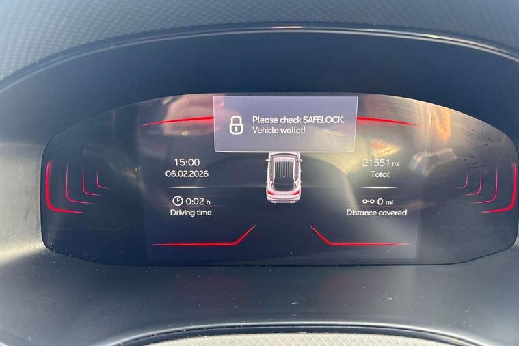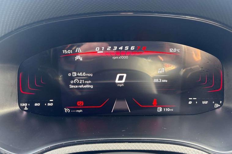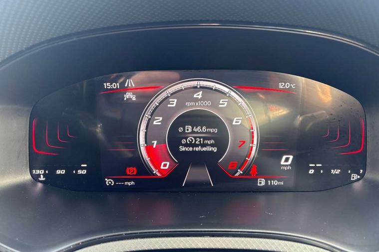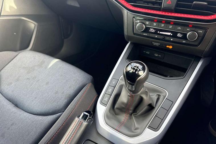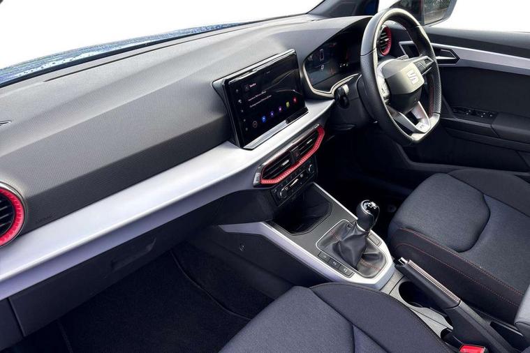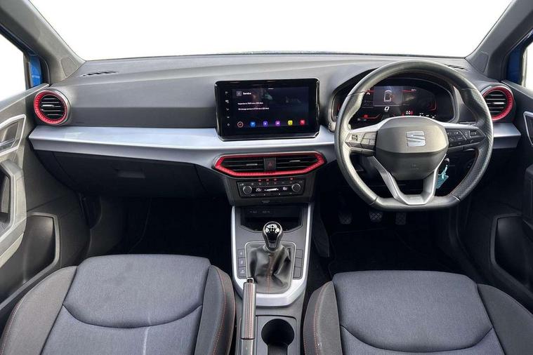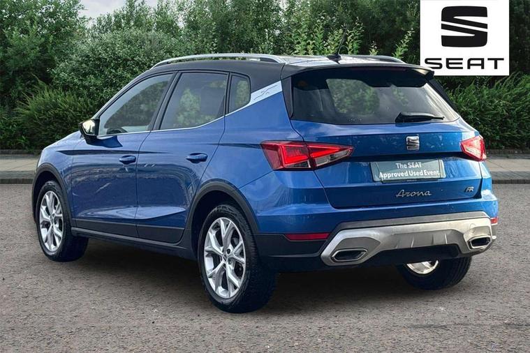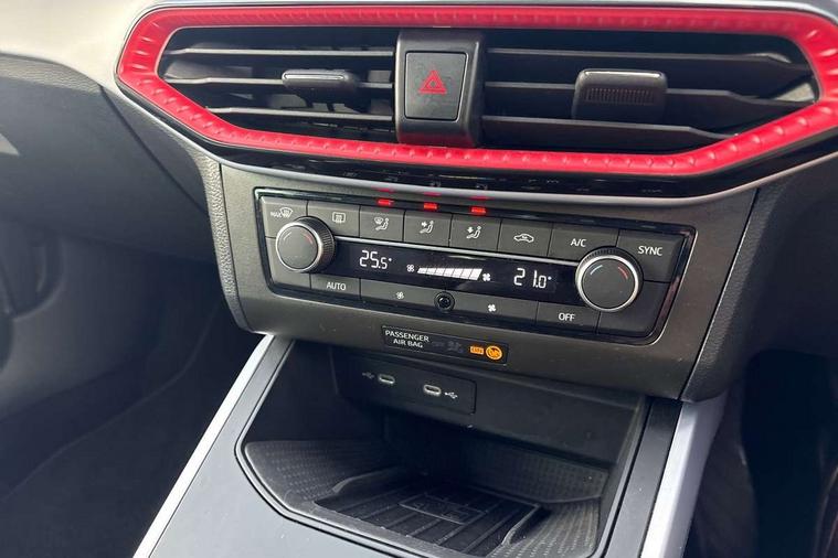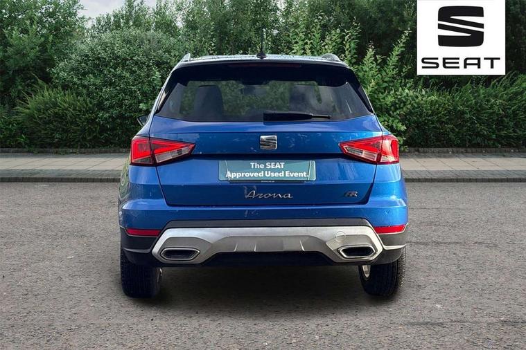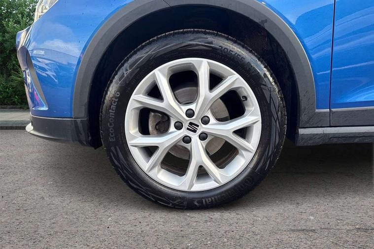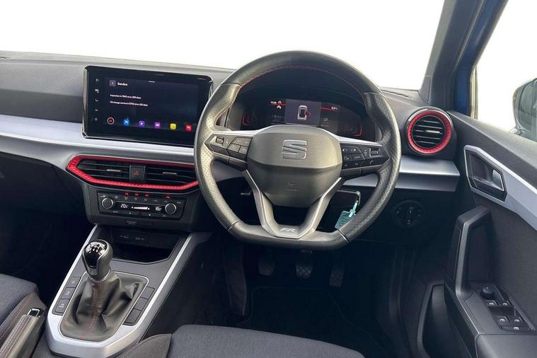 'Lights On' Reminder warning buzzer, 8" Digital cockpit, Digital clock, E-call, Electric speed sensitive power steering, Full Link Smartphone Integration with Mirror Link, Apple Car Play, Google Android Auto with USB Type C cable for Apple and Android compatibility, Lane keeping system, Low fuel warning light, Outside temperature display, Rear parking sensor, RPM counter, Seat connect with safety, service, remote and online, SEAT Drive profile - Four different models normal-sport-eco-individual, steering response, throttle response, Trip computer, Wireless phone charger, 9.2" colour touchscreen with navigation system, voice control and USB port (type c), Bluetooth interface for hands free and audio streaming, DAB digital radio and AM/FM radio, Steering wheel mounted audio controls, Anti theft roof antenna, Auto dimming interior rear view mirror, Automatic activation of hazard warning lights, Body coloured bumpers, Body coloured door handle inserts, Chrome roof rails and window surrounds, Dark tinted rear windows, Electric front/rear windows, Electrically adjustable, heated and folding door mirrors, Front fog lights with cornering function and rear fog light, FULL LED automatic headlights with dynamic headlight range control, coming and leaving home, LED daytime running lights, LED rear tail lights and licence plate lights, Protective side mouldings, Rain sensing wipers, Rear side wing doors, Rear spoiler, Rear window wash/wipe, Roof colour door mirrors, Third brake light, Twin exhaust pipe styling hidden exhaust pipe, Visible VIN plate, Windshield wiper with intermittent control and potentiometer, 2 cupholders, 3 seat bench in 2nd row, 60/40 split folding rear seat, Aircare filter, Black interior roof, Cloth upholstery, Double boot floor, Driver sunvisor with covered mirror + card holder, Dual zone climate control, Front courtesy light with front reading lights, Front sport seats, Gear shift indicator, Height adjustable front seats, Height/reach adjustable steering column, Illuminated boot, Instrument lighting with brightness control, Interior ambient lighting, Interior light in footwell, central console and door panel, ISOFIX points in outer rear seats with top tether anchorage points, Passenger sunvisor with vanity mirror, Perforated flat bottomed leather steering wheel/gear knob/handbrake with red stitching and FR logo, Single front passenger seat, Two front and three rear height adjustable headrests, Interior chrome pack - Arona, 3 point seatbelts on all rear seats, ABS, Active front headrests, Child locks on rear doors, Driver and front passenger airbags with front passenger airbag de activation, front side and curtain airbags, Electronic stability control, Emergency Brake Assist (EBA) and front assist, Front and rear seatbelt reminder, Hill hold control, Multi-Collision braking, Tiredness recognition system, Traction control, Tyre pressure monitoring system, Alarm with back-up horn, Electronic engine immobiliser, Locking wheel bolts, Remote central locking + deadlocks, Tow away protection, Titan black dashboard, 17" Dynamic alloy wheels,