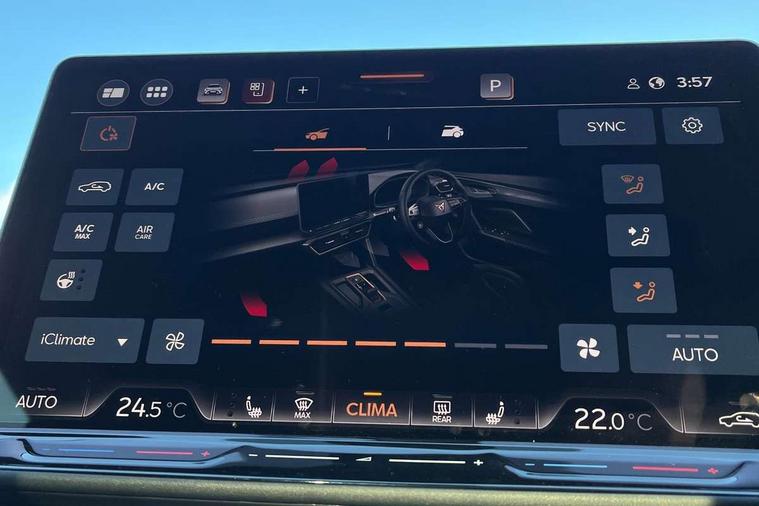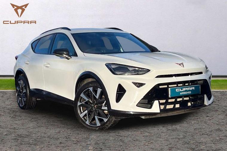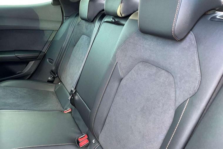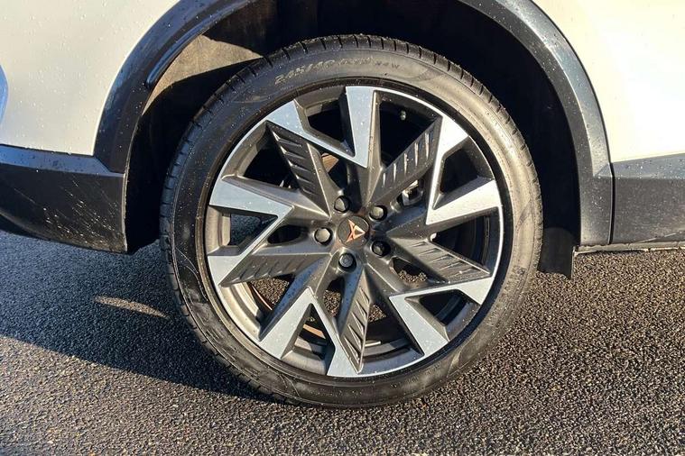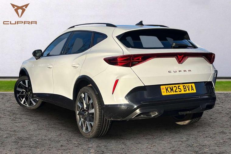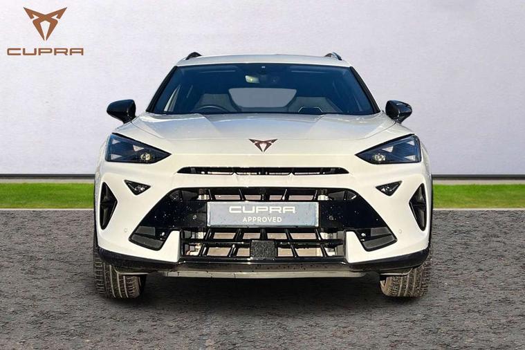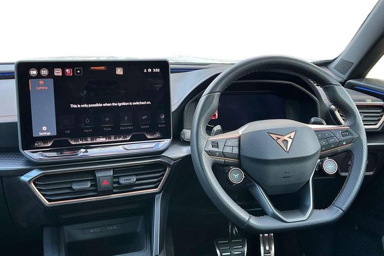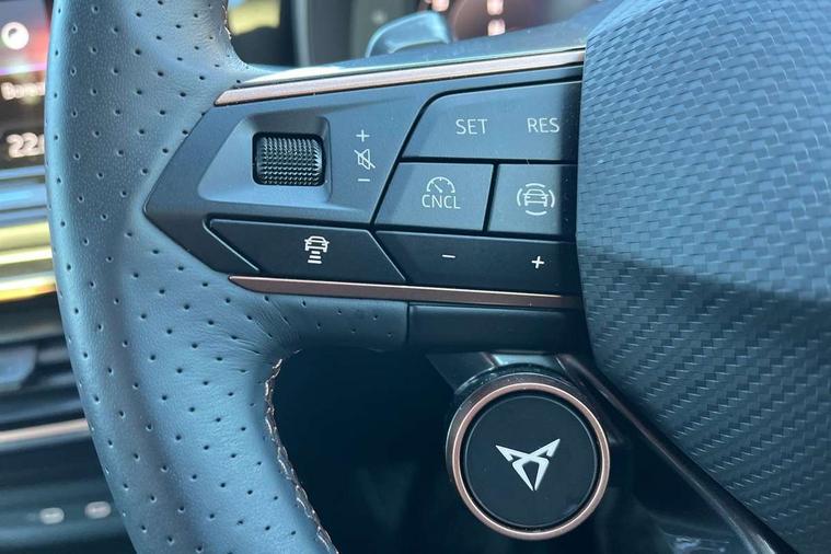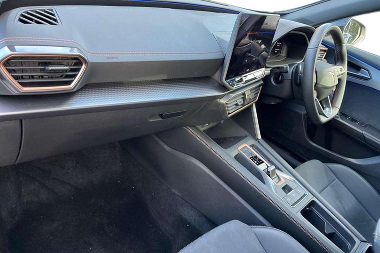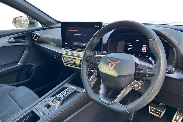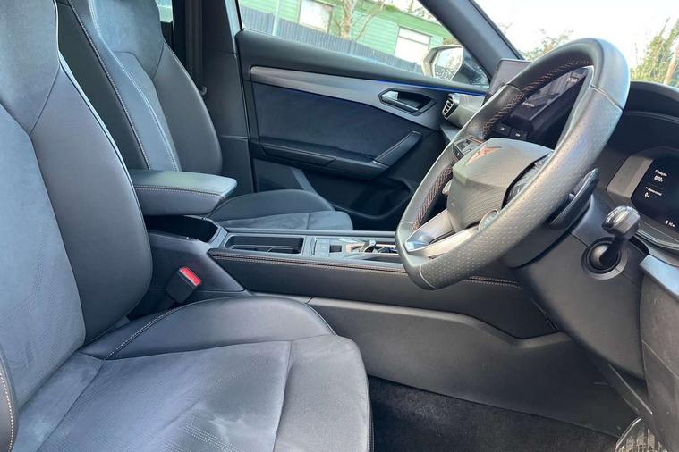 10.25" digital cockpit and configurable dashboard, Adaptive cruise control with follow-to-stop and speed limiter, Advanced driver alert system, Driving profile selection, Dynamic road sign display, Emergency steering support with turn assist, Forward collision warning with automatic braking, Front and rear parking sensors, Full link phone integration, Lane assist, Progressive steering, Rear view camera, RPM, trip computer, outside temp gauge, instrument light brightness, low fuel warning light, lights on reminder, gearshift indicator, Service interval indicator, Start/stop system with regenerative braking, Virtual pedal and electric tailgate, Voice control system, Wired Android Auto, Wireless apple carplay, Wireless phone charger, CUPRA sport suspension, Electronic locking differential and dynamic traction support, 2 front and 2 rear USB type C sockets, Media system with navigation, 12.9" touchscreen display, voice control, DAB, steering wheel mounted controls, Auto dimming rear view mirror, Body colour door handles, Body coloured bumpers, Dark grey wing mirror, Daytime running light with automatic headlight control and coming home feature, Door panel ambient lighting, Dynamic headlight range control, Electric front/rear windows, Electrically adjustable heated and folding door mirrors with memory function, Gloss black roof rails and window surrounds, High beam assist, LED 3rd brake light, LED front fog lamps with cornering function, LED Headlights, LED Taillights with dynamic indicator, Rain sensing wipers, Rear diffuser with black simulated exhaust pipes, Rear fog lights, Rear side wing doors, Rear wash/wipe, Tinted rear windows, Welcome lights (within exterior mirror housing), 12V socket, 2 front and 2 rear reading lights, 3 seat bench in 2nd row, 60/40 split rear bench seat with armrest and mechanical seat release, Black headlining, Black interior roof lining, Cupra sports pedals, Dust/pollen filter, Electrically adjustable driver's seat with memory and lumbar support, Front and rear head restraints, Front centre armrest, Heated front seats, Heated supersports multifunction leather steering wheel with satellite buttons and gear shift paddles, Height/reach adjust steering wheel, Illuminated aluminium doorsteps, Illuminated interior front door sills, Illuminated sunvisor with mirror, Isofix, Leather dashboard, door insert and side trim panel, LED smart wraparound lighting, PVC/Dinamica microfiber upholstery + bucket seats, Satellite steering wheel, Single front passenger seat, Storage pockets on rear of front seats, Three zone climate control with control panel in rear, Variable luggage/load compartment floor, 3 point seatbelts on all rear seats, ABS, Brake control system - ESC and brake booster, Child proof door locks, Driver and front passenger airbags with front passenger airbag de-activation, Electronic parking brake, Front and rear disc brakes, Front side curtain airbags, Hill hold control, Public e-call, Seat belt reminder for front and rear seats, Tyre pressure monitoring system, Anti theft alarm system, KESSY Advanced - Keyless start, keyless entry with SAFELOCK, Locking wheel bolts, Copper and aluminium interior detailing, 19" Sandstorm machined sport black and silver alloy wheels,