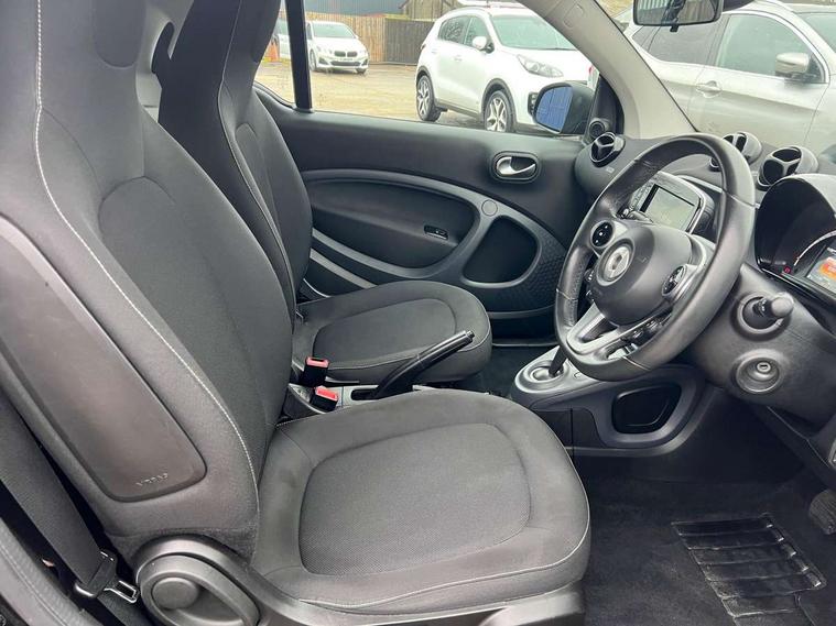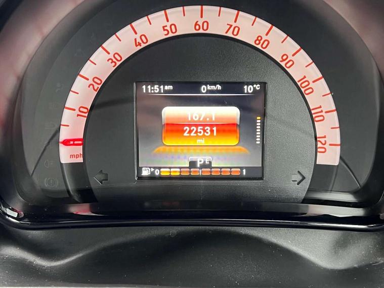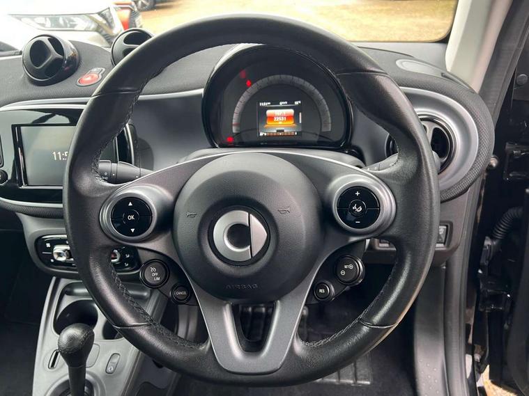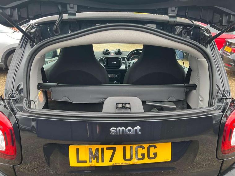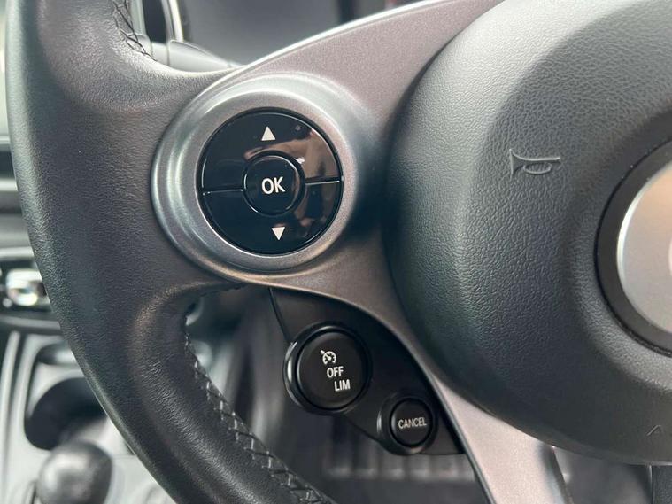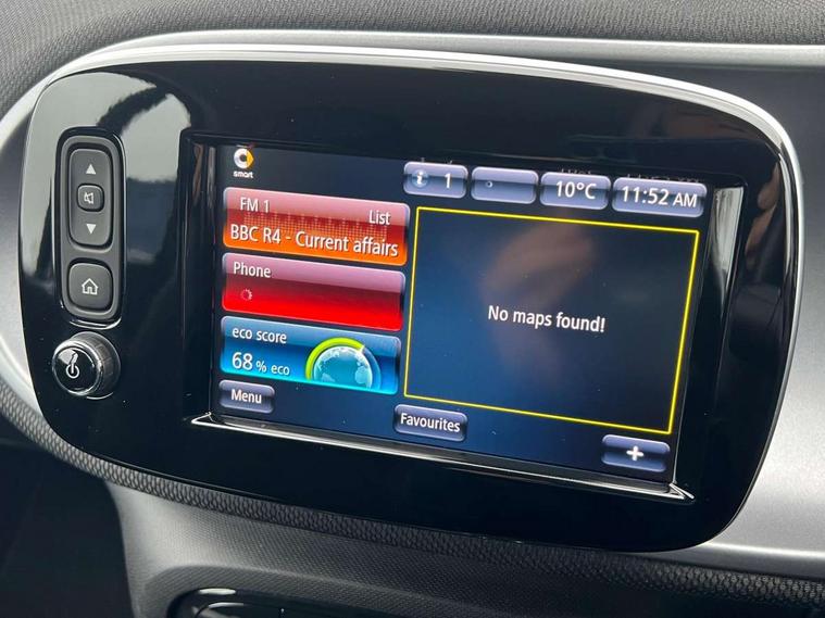 Bluetooth interface for hands free telephone, Crosswind Assist, Cruise control with speedtronic variable speed limiter, Instrument cluster with display, Mirror link for smart media system, On board computer, Outside temperature display, Rear park assist, Service interval indicator, Smart media navigation with 7" touch screen, Speed sensitive variable PAS, Voice control system, Bluetooth audio streaming, Smart audio system with aux/USB interface, Black fabric roof, Black radiator grille, Body coloured bumpers, Driving mirrors in tridion colour, Electric front windows, Heated rear window with timer, LED daytime running lights, Rear spoiler, Rear wash/wipe with intermittent wipe setting, White side indicators, 12V Accessory socket, 2 cupholders, 3 Spoke leather multi function steering wheel, Automatic climate control, Centre console storage tray, Cloth upholstery, Driver/passenger sunvisors with ticket holders + vanity mirrors, Front door storage bins, Front head restraints, Front seat and rear pockets, Isofix child seat attachment, Leather gear knob, Load lashing points, Lockable glovebox, Luggage compartment cover, Luggage compartment lighting, Matt Chrome interior door handles, Reading lights, Storage compartment in tailgate, Sunglasses holder, Through load facility, Comfort pack - ForTwo with Heated door mirrors, 3 point seatbelts, ABS with Brake Assist, Crash sensor (auto switch - on of hazard warning lights/interior lighting), Driver and passenger airbags, Drivers knee airbag, ESP + Hill Start Assist, Front side airbags(head+thorax), Seat belt force limiter, Seat belt tensioners, Seatbelt warning, Tyre pressure monitoring system, Automatic door locking, Folding key, Immobiliser, Remote central locking, 15" 8 spoke alloy wheels painted in silver, Tyre repair kit,