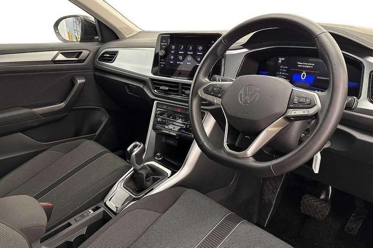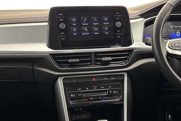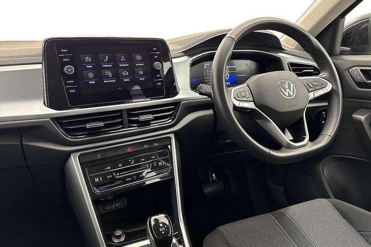 Advanced driver attention and drowsiness monitor, Dynamic road sign display, Emergency call service, Lane keeping system Lane Assist, Mobile phone interface, Modified key software - reduce switch off time for key status change to Long no motion, Online services, Park assist including front and rear parking sensors, Power assisted speed sensitive steering, Service interval indicator, Tailgate/trunk lid release from outside, Think blue trainer driver tips and journey analysis, Warning sound and light for front seatbelts unfastened, Wireless app connect, Battery regeneration during braking, Front shock absorption, Rear shock absorption chassis with increased ride height, Start/stop function with battery regeneration, DAB Digital radio, Diversity antenna for FM reception, Front and rear 6 speakers, Music playback - MP3, WMA and AAC files, Premium USB cable in choice of either Apple or Android smartphone compatibility, SD card slot, Simultaneous pairing of 2 compatible mobile devices, Title and cover art display, We Connect and We Connect Plus functionality, Auto dimming interior rear view mirror, Automatic hazard lights activation under emergency braking, Automatic headlight control with LED separate daytime running lights with coming/leaving home function, Black roof rails, Body coloured bumpers and radiator grille with chrome trim and front fog lamps with chrome bezel, Body coloured exterior mirror housings and door handles, Electrically adjustable and heated door mirrors, Extended roof spoiler, Exterior mirrors aspherical on driver side, convex on front passenger side, External USB type C socket and charging sockets, Front windscreen wiper with intermittent wipe and 4 position delay, Heated rear window, LED 3rd brake light, LED rear combination lamps, LED rear number plate lights, Power windows with comfort operation and circuit breaker, Rain sensor, Rear exhaust tailpipe, Rear fog light on one side and reversing lights on both sides, Rear side wing doors, Rear wash/wipe with intermittent wipe setting, Remote electrically foldable door mirrors, puddle lights and reverse activated passenger's door mirror, 12V power socket in centre console, 3 rear head restraints, 3 seat bench in 2nd row, 4 load lashing points in luggage compartment, Air care climatronic air conditoning system with active combination filter and 2-zone temperature control, Ambient lighting with mirror logo projection, Cloth upholstery, Door and side trim panel in cloth, Drawer under drivers seat, Driver/front passenger seat height adjustment, Front centre armrest, Front comfort sports seats, Front cupholders x 2, Front reading light, Front seat back storage pockets, Glove compartment door with light, Instrument lighting, white adjustable panel illumination, Interior light delay, Isofix child seat preparation, Leather gearshift handle, Load-through provision with cup holder when folded down ('Unsplit rear seat bench, split folding backrest, with centre armrest), Luggage compartment lighting, Lumbar support for driver's and front passengers seat, Non-folding front passenger seat backrest, Single front passenger seat, Storage compartment in left and right luggage area, Storage compartment in rear doors, Storage compartments in driver and front passenger doors, Sunvisors with illuminated vanity mirrors, Variable boot floor, height adjustable and removable, Driver assistance pack without proactive passenger protection - T-Roc Life/Match, 3 point height adj front seatbelts + pretensioners, 3 point seatbelts in outer rear with ECE label, ABS, Child locks on rear doors, City emergency braking and pedestrian monitoring, Driver and front passenger airbag with front passenger airbag deactivation, Driver and front passenger safety-optimised head restraints, Drivers seatbelt reminder, Electronic parking brake, Electronic Stability Control (ESC) inc EDL (Electronic Differential Lock) and ASR (Traction Control), Front and rear passengers curtain airbag system including front side airbags, Front disc brakes, Hill start assist, Predictive pedestrian protection, Rear disc brakes, Two tone horn, Tyre pressure loss indicator, Volkswagen roadside assistance, Alarm with interior protection, Pewter matt decorative inserts for intrument panel, centre console and door panels at the front, Trims for alloy wheels,