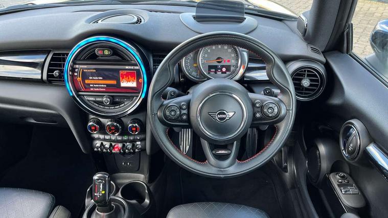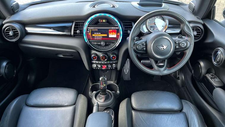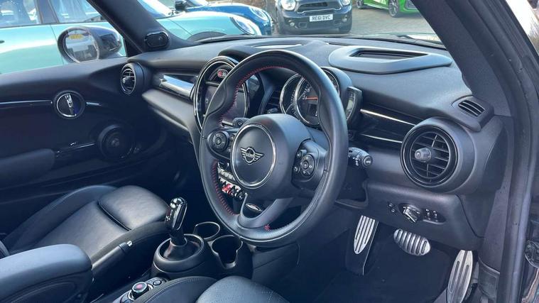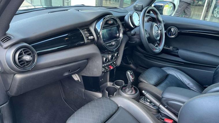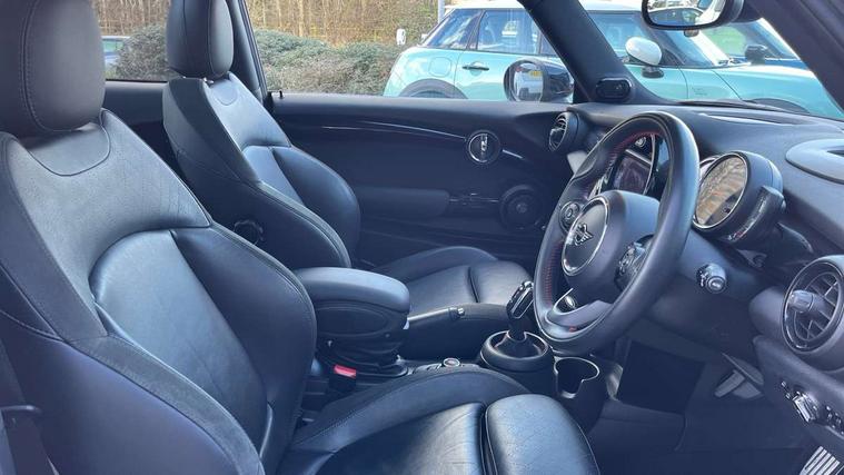 Automatic start/stop function with brake energy recuperation, Compatible mobile phone bluetooth with audio streaming, Electro-mechanical speed dependant steering assistance, Instrument cluster, Mini E-call, MINI TeleServices, On board computer, Service interval indicator, Double Vanos system, Fully variable valve control, High precision injection, Performance Control, Steptronic sport transmission with double clutch and steering wheel paddles, 6.5" touchscreen with LED ring, FM tuner and DAB digital radio, Automatic headlight activation switch, Bonnet scoop, Chrome border honeycomb structure radiator grille with S badge, Chrome plated fuel cap, Dynamic brake lights, Electric front+rear windows, Heated rear window, Heated windscreen washer jets, John Cooper Works - aerodynamic kit (front and rear apron, spoiler), front and rear sport bumpers and part-painted side sills with door sill finishers, John Cooper Works rear spoiler, LED headlight with closed ring and daytime driving lights, Metal door sill strips with Cooper S imprint, Model logo Cooper S on right of tailgate, Rain sensor window wipers, Rear fog lights, Rear LED lights with union jack design, Rear window wiper, Side scuttle panel with integrated indicator, Sun/heat protection glass, Two central exhaust tailpipes with chrome finisher, White indicator lenses, 12V Accessory socket in centre console, 4 lashing eyes in luggage compartment, 60/40 split folding rear seat, Anthracite headlining, Chrome interior highlights, Cupholders, Front and rear head restraints, Front and rear isofix with front passenger airbag deactivation, Glove compartment, Height and length steering column adjustment, Interior lighting with 12 basic colours selectable via toggle switch in roof, John Cooper Works leather steering wheel with contrasting stitching in Chilli Red with John Cooper Works logo, John Cooper Works Logo in seat, Leather gearshift lever and handbrake gaiters, LED reading lights, vanity mirror lights, front foot well light and spotlight on front seats, Manual air conditioning, Mechanical seat adjustment, driver seat height adjust, forward/back and front seats backrest, Mini logo projection on floor from drivers exterior mirror, Multifunction steering wheel, Storage compartments in doors, Storage pocket on back of front seats, Sunvisors with vanity mirrors, 3 point seatbelts on all four seats, 6 Airbags - front, side, head and seat belt tensioners, Anti-lock braking system (ABS), DSC - Dynamic Stability Control, Front and rear disc brakes, Hill start assist, Two tone horn, Tyre pressure monitoring system, Alarm system with tilt sensor, monitoring doors, bonnet interior and tailgate, Electronic vehicle immobiliser, Start/stop toggle with keyless go, Tool kit,