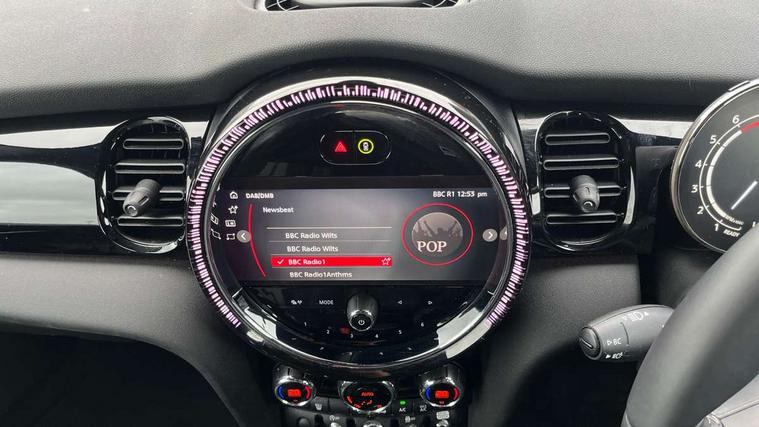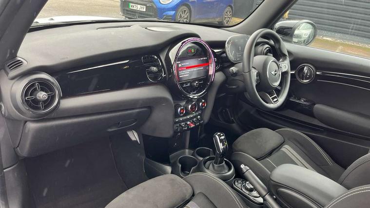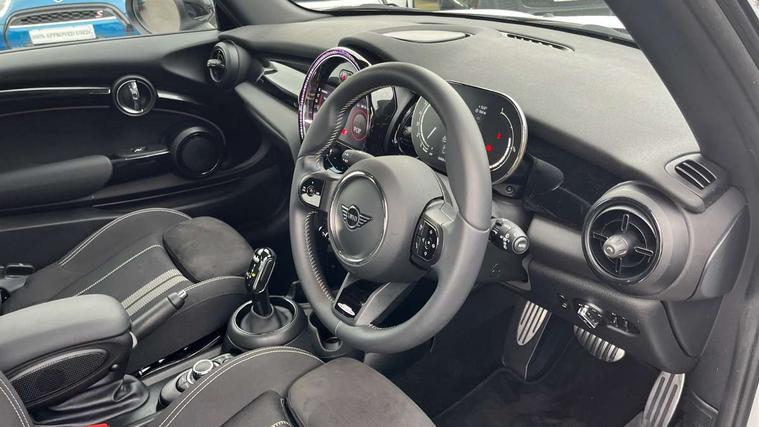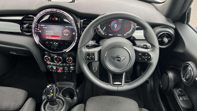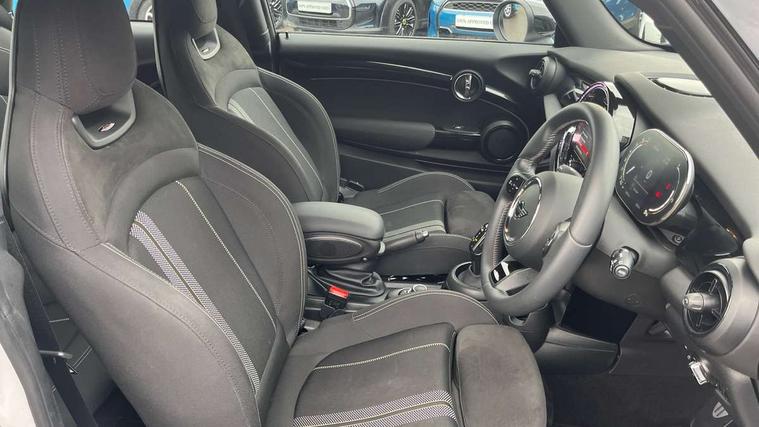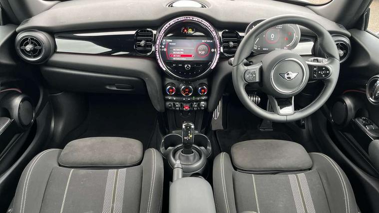 Apple CarPlay, Automatic start/stop function with brake energy recuperation, Compatible mobile phone bluetooth with audio streaming, Cruise control with brake assist, Electro-mechanical speed dependant steering assistance, Flexible car sharing preparation, Instrument cluster, MINI Driving Modes - centre toggle switch to control driving setting (sport, mid and green), Mini E-call, MINI TeleServices, On board computer, Rear park distance control, Service interval indicator, Double Vanos system, Fully variable valve control, High precision injection, Intelligent adaptive suspension, Performance Control, Steptronic transmission with double clutch, 8.8" touchscreen with LED ring, FM tuner and DAB digital radio, 3rd brake light, Automatic headlight activation switch, Body colour fuel filler cap, Chrome border high gloss black slats radiator grille, Dynamic brake lights, Electric front windows, Exhaust tailpipe on left with chrome finisher, Heated rear window, Heated windscreen washer jets, JCW Aerodynamic kit - Front and rear bumpers with sporty JCW styling and part-painted side sills with MINI John Cooper Works door sill finishers, John Cooper Works rear spoiler, LED headlight with closed ring and daytime driving lights, Metal door sill strips with MINI imprint, Model logo Cooper on right of tailgate, Rain sensor window wipers, Rear fog lights, Rear LED lights with union jack design, Rear window wiper, Side scuttle panel with integrated indicator, Sun/heat protection glass, White indicator lenses, 12V Accessory socket in centre console, 2 seat bench in 2nd row, 4 lashing eyes in luggage compartment, 60/40 split folding rear seat, Anthracite headliner including grab handles and clothes hooks, Carbon black colour line - Knee roll and door armrest, Chrome interior highlights, Cupholders, Front and rear isofix with front passenger airbag deactivation, Front floor mats in velour, Glove compartment, Height and length steering column adjustment, Interior lighting with 12 different colours across the dashboard, underneath door bezel with illuminated laser-engraved design on central display, JCW Sport seats with integrated headrests, adjustable thigh support and John Cooper Works logo, Leatherette gearshift lever and handbrake gaiters, LED reading lights, vanity mirror lights, front foot well light and spotlight on front seats, Manual air conditioning, Mechanical seat adjustment - forward/back & backrest for front seats and driver seat height adjust, Multifunction steering wheel, Passenger seat height adjuster, Single front passenger seat, Storage compartments in doors, Sunvisors with vanity mirrors, Tool kit, Walknappa leather steering wheel with grey seam and John Cooper Works badge on Piano Black lower steering wheel spoke, Navigation pack without Apple Carplay - Mini Hatchback, Piano black exterior pack - Mini Hatchback Cooper, 3 point seatbelts on all four seats, 6 Airbags - front, side, head and seat belt tensioners, Anti-lock braking system (ABS), DSC - Dynamic Stability Control, Front and rear disc brakes, Single tone fanfare horn, Tyre pressure monitoring system, Alarm system with tilt sensor, monitoring doors, bonnet interior and tailgate, Electronic vehicle immobiliser, Start/stop toggle with keyless go, Piano black interior trim,