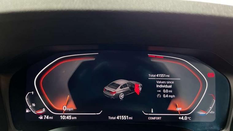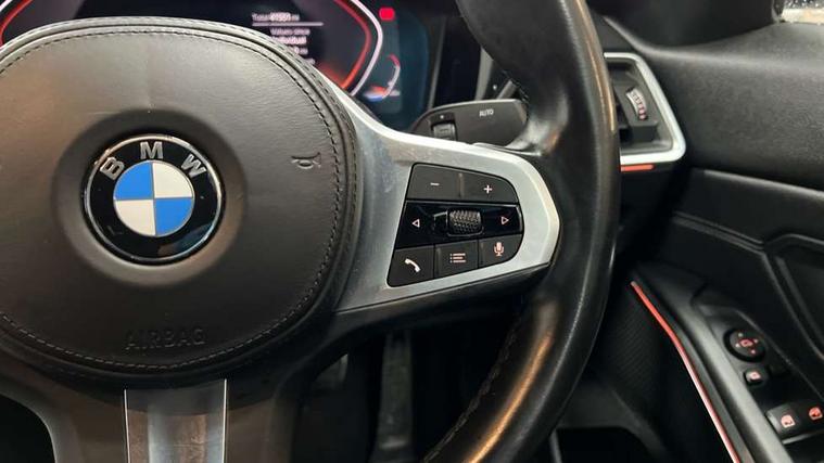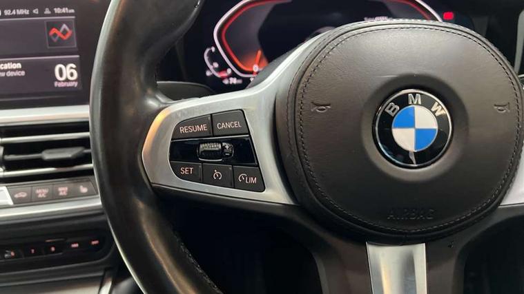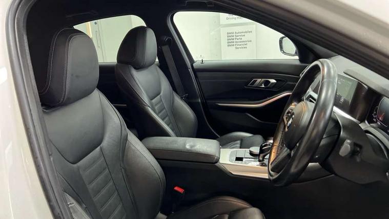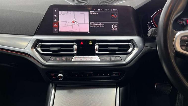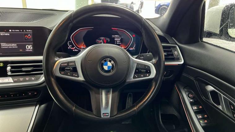 Active guard plus, Attentiveness assist, Auto start-stop, Bluetooth hands free facility with USB audio interface with audio streaming, BMW iDrive controller on centre console, BMW Live Cockpit Professional Nav with 12.3" instrument display + 10.25" display, Intelligent Voice Assist, BMW OS 7, HDD, 2USB, 4G LTE connect, BMW service history, BMW Teleservices, Brake pad wear indicator in front and rear, Check Control warning system for monitoring of lights and door/luggage compartment open warning, Condition based service, Cruise control with brake function + speed limiter, Electric power steering with Servotronic steering optimised at all speed ranges, Instrument cluster with speedometer with mph readout, tachometer, fuel gauge and oil temperature gauge, Integrated owners handbook, Oil sensor for level and grade, warning by check control system, On board computer - average speed+fuel consumption, service interval, clock/date, odometer/trip meter, outside temperature display and ice warning, Optimum shift indicator, Personal Profile - automatic lock when driving away selectable, Variable sport steering, Balanced 50/50 weight distribution, Battery cut-out switch, Drive performance control - ECO PRO, comfort and sport modes, Electronic differential lock control (EDLC), Larger capacity fuel tank, M sport suspension, Petrol Particulate Filter, Stroke dependent dampers, DAB tuner, Electronic service booklet, Acoustic glazing, Active airstream chrome frame kidney grille with 8 high gloss black vertical slats, Automatic headlight beam throw control with load dependent regulating reaction, dynamic compensation of braking dive and acceleration squat, Black roof mouldings, Body colour door handles, Body colour front and rear bumpers, Body colour fuel filler flap, Body colour mirror caps with bottom segment in matt black, Dynamic brake lights, Electric windows - front and rear, with open/close fingertip control, anti-trap facility and comfort closing, Exhaust tailpipe - split left and right, Exterior mirrors - electrically folding with anti-dazzle, Fading support, Front and rear bumper system with replaceable deformation elements, Front black door sill finishers with BMW designation, Green tinted heat protection glazing, High gloss shadow line exterior trim, Interior rear view electrochromatic mirror with automatic anti dazzle function, LED daytime running lights, LED front fog lights, LED third brake light, Lightweight engineering, M designation on front side panels, left and right, Matt black exterior B pillar, Model designation on right side of tailgate, Rain sensor with automatic headlight activation, Rear boot, Rear side wing doors, Shark fin antenna, Two part LED tailights in L-shape with components in smoked glass, brake light, LED turn indicator and rear fog light, Visible VIN plate, Welcome lights in interior and door handle area, Windscreen wipers with integrated washing jets, 12V power socket in front storage compartment, 2 front cupholder in centre console with clamping elements and matt black inlay, 3 rear seats with non folding headrests with 3 point seat belts, 3 seat bench in 2nd row, 3 zone automatic air conditioning, 4 pieces lashing eyelets in luggage compartment, 40:20:40 split folding rear seat with loading system, Ambient lighting with welcome carpet light, Anthracite headlining, Armrest integrated in front and rear door trim + front centre console armrest, Backrest width adjustment, Centred top Luggage compartment lights, Four grab handles integrated in roof lining, Front and rear door exit lighting (left / right), Front and rear door pockets, Front and rear reading lights, Front and rear velour floor mats, Front head restraints, Front sport seats, Heated front seats, Height adjustable mechanically and infinitely variable steering column, Illuminated armrest storage compartment, Illuminated glove compartment with separate small compartment, Interior lighting - front centre over interior mirror with soft light, rear centre and front and rear footwell lighting, M sport leather steering wheel, Make-up mirror lights, Rear centre armrest with 2 cupholders, Rear centre console with storage compartment and ventilation grille, Single front passenger seat, Sunvisors with vanity mirrors and ticket pocket, Toolkit located in luggage compartment, Connected pack professional - 3 Series Saloon/Touring, M sport exterior styling pack - 3 Series Saloon/Touring, Parking assistant pack - 3 Series, 2 tone horn, BMW emergency call, Brake energy regeneration, Braking pre-tensioning, Child proof locking system in rear door, Child seat ISOFIX attachment rear outer seats, Coasting in idle in ECO PRO mode, Crash sensor activating of airbags, Unlocking doors, hazard warning lights, interior light, safety battery terminal, Driver and front passenger side airbags, integrated in the door side seat backrest bolsters for all seat variants, Driver/Front Passenger airbags, Dry braking, Dynamic brake control, Dynamic stability control + (DSC+) - Anti-lock Braking System (ABS) with brake assist and cornering brake control + Automatic Stability Control (ASC), Dynamic Traction Control - DTC, Electric parking brake including automatic hold function and automatic release of the parking brake when driving off, Front passenger manual airbag deactivation, Head airbags for all 4 outer seats, Hill start assist, Seat belt security check for driver and front passenger, Side impact protection, Three 3 point seat belts on all seats including front belt stopper, pyrotechnic belt tensioners and belt force limiters, Tyre pressure monitoring with three level warning strategy, Ventilated front and rear disc brakes, Warning triangle and first aid kit, Alarm system (Thatcham 1) with remote control and electronic engine immobiliser, Central locking switch for all doors, fuel filler cap and luggage compartment, Remote control with integrated key one button open/close vehicle and windows, sole opening of the luggage compartment lid and 