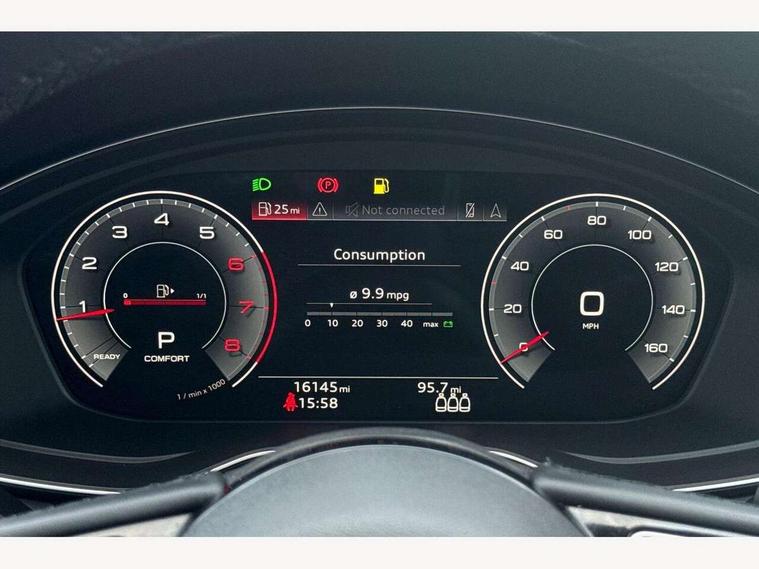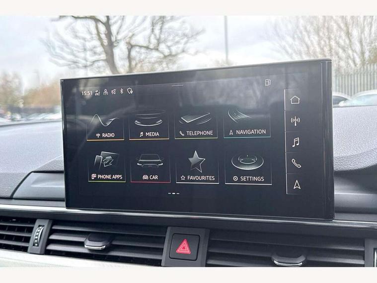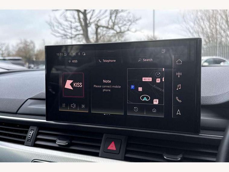 Audi connect safety and service (e-call), Audi connect with Amazon Alexa Integration, Audi drive select, Audi parking system plus with front and rear sensors, Audi smartphone interface, Audi virtual cockpit, Automatic start-stop system with coasting functionality and efficiency programme, Bluetooth interface, Cruise control system with speed limiter, Electric boot lid release, Electromechanical power steering, Email, calendar and text messages displayed via MMI, MMI Navigation plus with MMI touch includes 10.1" high resolution colour MMI display, 3D map, Rear view camera, Voice control system, 54 litre fuel tank, Comfort dynamic suspension, 2 USB charging ports, 8 passive loudspeakers, DAB digital radio reception, Auto dimming rear view mirror, Body coloured door mirrors, Electrically folding auto dimming/adjustable/heated door mirrors with LED side indicators and kerb view function for passenger side, LED headlights and rear lights with LED daytime running lights, LED third brake light, New design rear diffuser, Rain and light sensors, Rear boot, Rear side wing doors, Variable intermittent front wash/wipe, Windscreen with acoustic glazing, 3 spoke high multi-function leather sport steering wheel with paddle shift and height and reach adjustable, 4 way electric lumbar support for driver and front passenger, 40/20/40 split folding 3 rear seat bench in 3 parts with rear centre armrest, Deluxe 3 zone electronic climate control, Door sill trims with aluminium inlay, Front and rear head restraints, Front centre armrest, Heated front seats, Interior lighting, ISOFIX child seat mounting and top tether, Manual seat adjustment, Single front passenger seat, High gloss package - A4, 3 rear seatbelts, 6 airbags - Driver, front passenger, curtain and side windows, Electronic Stabilisation Control (ESC) including ABS, ASR and EDL, Hill hold assist, Multi collision brake assist, Pop-up bonnet for pedestrian protection, Pre sense city, Rear door child safety locks, Seatbelt monitoring, Warning triangle and first aid kit, Anti theft alarm, Anti theft wheel bolts, Central locking, Keyless Go, Tool kit, Tyre repair kit,