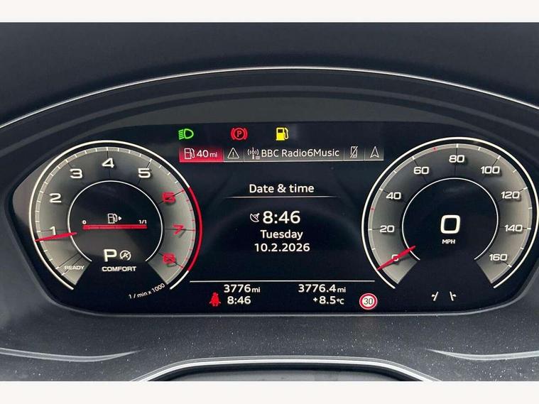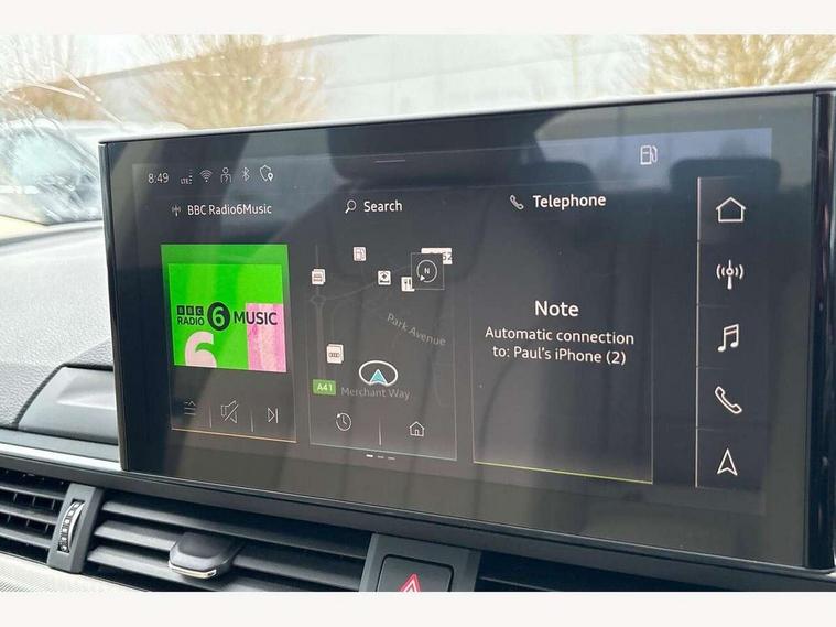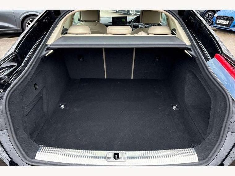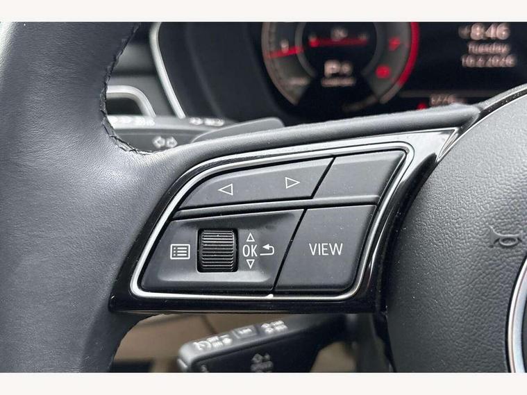 Audi connect safety and service (e-call), Audi drive select (Auto, Comfort, Dynamic and Individual), Audi smartphone interface, Audi virtual cockpit - 12.3" full colour digital instrument cluster, vehicle/engine speed, Radio/media information+Driver assistance systems, Automatic start-stop system with coasting functionality and efficiency programme, Bluetooth interface, Camera based traffic sign recognition, Electro-mechanical power steering, Email, calendar and text messages displayed via MMI, Front and rear parking sensors, Lane departure warning, MMI nav+ with MMI touch - 10.1" high resolution MMI display, touch sensitive, 3D map, route/country info, dynamic route guide, personal route assist, Power operated tailgate, Rear view camera, Service interval indicator, Voice control system, 54 litre fuel tank, Comfort dynamic suspension, 8 passive loudspeakers, CD player, DAB digital radio reception, Two additional USB ports for rear passenger in rear centre console, Two SDXC card slots, Auto dimming door mirrors, Auto dimming rear view mirror, Body colour bumpers, Body colour door handles, Body colour side sill trim, Body coloured door mirrors, Electric adjustable heated door mirrors, Electric folding door mirrors, Electric front windows, Front fog lights, Kerb-view function for passenger side, LED headlights and rear lights with LED daytime running lights, LED side indicator lights integrated into door mirrors, LED third brake light, Matt aluminium silver tailpipe trim, Radiator grille in matt anthracite black and air inlets with inserts in matt aluminium silver, Rain and light sensors, Rear diffuser in matt anthracite black with trim strip in matt aluminium silver, Rear side wing doors, Rear wiper, Sport front and rear bumpers with side skirts, Variable front intermittent wipers, Windscreen with acoustic glazing, 3 seat bench in 2nd row, 3 spoke high multi-function leather sport steering wheel with paddle shift and height and reach adjustable, 4 way electric lumbar support for driver and front passenger, 40/20/40 split folding 3 seater rear bench seat, Black carpets, Deluxe 3 zone electronic climate control, Front centre armrest, Front door sill trims with aluminium inlay, Front head restraints, Front/rear floor mats, Heated front seats, ISOFIX child seat mounting and top tether, Luggage compartment mat, Manual seat adjustment, Rear centre armrest, Rear headrests, Single front passenger seat, Sunvisors with vanity mirrors, Twin leather upholstery + front sports seats, LED interior light pack - A5/RS5, 3x3 point rear seatbelts, 6 airbags - Driver, front passenger, curtain and side airbags, Attention and drowsiness assist, Electromechanical parking brake, Electronic Stabilisation Control (ESC) including ABS, ASR and EDL, Front passenger airbag deactivation, Height adjustable front seatbelts, Hill hold assist, Manual child lock in rear doors, Multi collision brake assist, Pop-up bonnet for pedestrian protection, Pre sense city, Seatbelt monitoring, Tyre pressure warning, Variable restraint system, Warning triangle and first aid kit, Anti theft alarm system, Anti theft wheel bolts, Immobiliser, Keyless Go, Remote central locking, Aluminium ellipse silver inlays, Tool kit, Tyre repair kit,