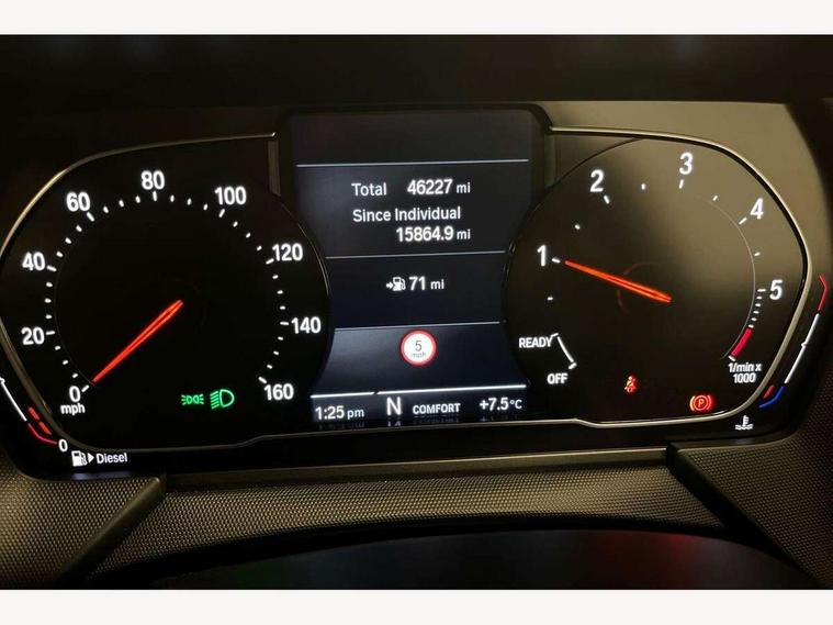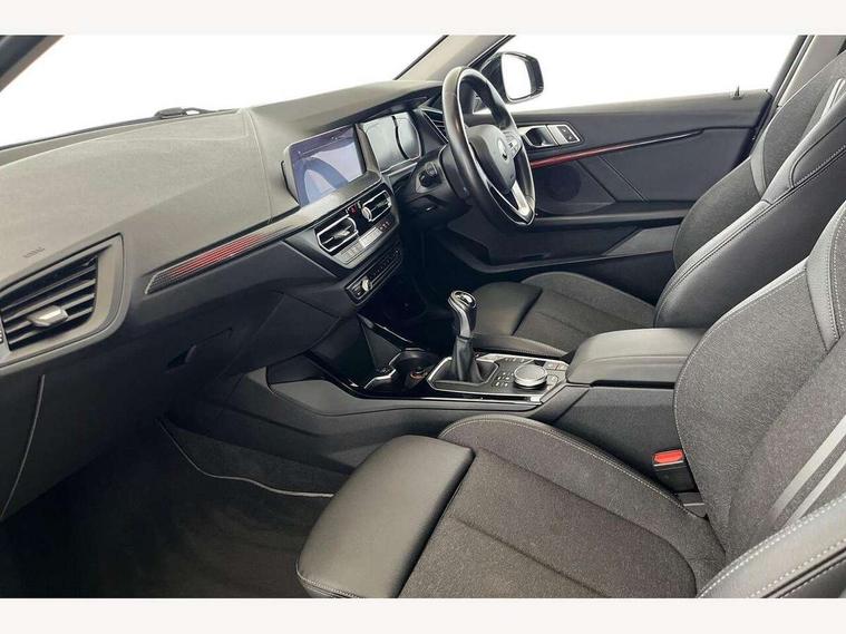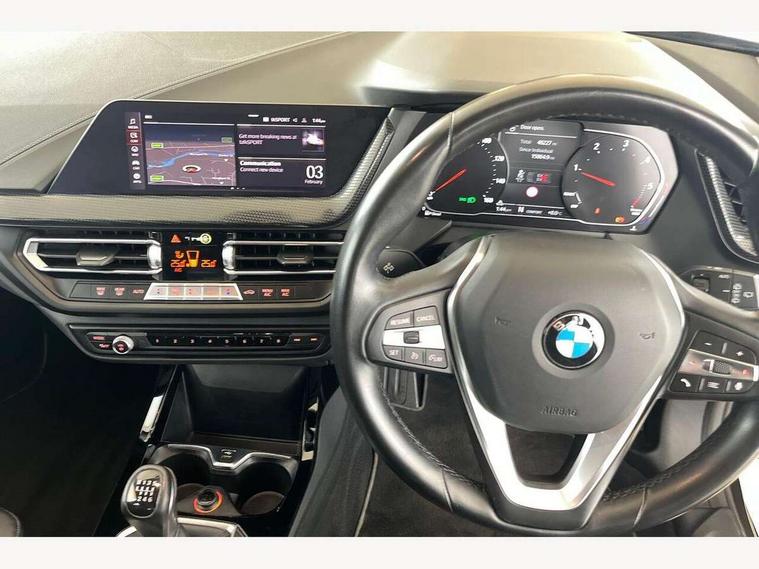Active guard plus, Attentiveness assist, BMW Online services, BMW Teleservices, Check Control warning system for monitoring of lights and door/luggage compartment open warning, Connected eDrive Services, Cruise control with brake assist, Eco pro mode, Electric power steering with Servotronic steering optimised at all speed ranges, Integrated owners handbook, Lane departure warning system, Oil sensor for level and grade, On board computer, Optimum shift indicator, Personal Profile, Pull away assistant, Speed limiter, 6 speed manual transmission, Aluminium lightweight construction, Anti roll bar front and rear, Balancer shaft, Diesel particulate filter, Drive Performance Control, Electronic differential lock, Bluetooth audio streaming, DAB Digital radio, Auto dimming rear view mirror, Body colour door handles, Body colour mirror caps, Chrome exhaust tailpipe in single, round (Exhaust tailpipe, stainless steel - single, round), Chrome kidney grille with extra wide black, high gloss black vertical slats, Direction indicator side lights in exterior mirrors, Fading support, Follow me home headlights, Front and rear electric windows with open and close fingertip control, anti trap facility and comfort closing, Front bumper in Body colour with exclusive Sport air inlets finished in High gloss Black, Front door sill finishers in black plastic with BMW designation, Green tinted heat protection glazing, Heated, electrically adjustable exterior mirror aspheric on driver side, convex on passenger side, High gloss shadow line exterior trim, High level third brake light, LED daytime running lights, LED eyebrow turn indicators, LED front fog lights, Lightweight engineering, Manual headlight beam throw control, Matt black air guide grilles, Matt black roof moulding, B pillar finisher and wheel arch trim, Matt black window frame, Model designation on right side of tailgate, Nearside reverse light in rear light cluster, Preparation for high beam assistant, Rain sensor including auto headlights activation, Rear bumper in Body colour with exclusive Sport design elements finished in High gloss Black, Rear fog lights, Rear window wiper, Shark fin antenna, Visible VIN plate, Welcome lighting, Windscreen wipers with integrated washing jets, 12V power socket in centre console, 2 cupholders in front centre console, 3 rear seat head restraints, 3 spoke sports leather steering wheel in pearl Chrome, Child seat ISOFIX attachment for two outer rear seats and front passenger seat with anchorage points, Conditioned based service, Driver side folding compartment in instrument panel, Folding rear clothes hook, Folding rear seats, Four grab handles integrated in roof lining, Front and rear door pockets, Front and rear side armrest integrated into door trim, Front armrest foldable with integrated storage compartment, Front sports seats with electric side bolster adjustment, Glove compartment, Height adjustable front head restraints, Manual adjust steering wheel, Multi-function controls for steering wheel, Rear seat backrest with manual 60:40 split folding with 3 top tether clips integrated on rear of seat panels, Storage compartment in centre console, Sun visors with vanity mirrors and insert tab, Two zone automatic air conditioning, Velour floor mats, Connected pack professional - 1 Series, Extended storage pack - 1 Series, Interior lights pack - 1 Series, 2 tone horn, 3 point seatbelts on all seats, front pyrotechnic belt tensioners, stopper and belt force limiters, rear coded belt buckles, Airbags - Front driver and passenger, front and rear head, front side, curtain head protection, Anti lock braking system (ABS) with brake assist, BMW emergency call, Brake drying, Braking readiness, City braking function, Crash sensor activating central locking release, hazard warning lights, fuel cut off, interior lighting + activation of safety battery terminal clamp, Driver and front passenger seat belt security check, Dynamic stability control + (DSC+), Dynamic Traction Control - DTC, Electrically operated hand brake, Front and rear disc brakes, Front passenger manual airbag deactivation, Rear child proof door locks, Seatbelt warning, Side impact protection, Tyre pressure monitoring system, Warning triangle and first aid kit, Automatic drive away locking facility, Central locking switch for all doors, fuel filler cap and luggage compartment, Deadlocking function system to all doors, Incorrect fuel protection system, Locking wheel bolts, Remote central locking with two Integrate key, one button for opening and closing all lock, open and close window, button for open luggage compartment, Start/stop button with comfort go keyless engine start and auto start stop deactivation button, Thatcham Cat.1 alarm and immobiliser, Contrast stitching on instrument panel, Illuminated Berlin interior trim, Reduced rolling resistance tyres,
