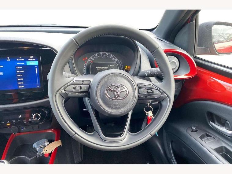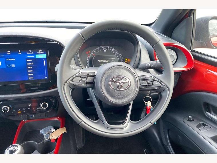 4.2" TFT colour screen, Adjustable speed limiter, Analogue speedometer, Bluetooth connectivity, Digital tachograph, Driver attention alert system, eCall emergency call system, Electric power steering, Intersection turn assist, Key reminder warning, Noise reduction kit, Pre collision system with emergency steering assist, Reversing camera with static guide lines, Smart phone integration with Apple car play/Android Auto, Speed limit display, Start and stop, Vehicle Stability Control (VSC), 4 speakers, 9" HD multimedia display touch screen with Toyota smart connect, DAB digital audio broadcast, USB connector, Auto headlights, Auto wipers, Automatic headlights cut-off, Bicycle towing hook, Black contrast roof, Black side protection mouldings, Black wheel arch mouldings, Body colour door handles, Body coloured front bumper, Boot door scuff plate, Eclipse black rear bumper, Electric heated door mirrors, Follow me home headlights, Front fog lights, Front power windows, Gloss black door mirrors, Gloss black upper front grille, Headlight cut-off reminder, LED daytime running lights, LED front light guide, LED High mounted stop lamp, Manual day/night rear view mirror, Manual headlight levelling, Pagoda roof, Power adjustable door mirrors, Power back door, Privacy glass, Projector halogen headlights, Rain sensor, Rear combination lights LED bulb type, Rear side wing doors, Rear windscreen defogger, Rear windscreen wiper, Short antenna, Variable intermittent windscreen wipers, 12v power outlet - front, 2 seat bench in 2nd row, 3 spoke leather steering wheel, 50/50 split folding rear seat, Adhesive roof headlining, Adjustable speed limiter switch on steering wheel, Audio and telephone switches on steering wheel, Auto air conditioning, Black insert on steering wheel, Black roof lining, Boot light, Centre room light, Chrome interior door handles, Chrome surround on air conditioning buttons, Clean air filter, Console box storage in body color, Fabric upholstery, Floor mats, Front and rear cup holders, Front head rest deco art, Front head restraints, Height adjustable driver seat, Intelligent adaptive cruise control switch on steering wheel, ISOFIX child restraint system on rear seats, Lane departure alert switch on steering wheel, Leather gearshift knob, Manual tilt steering wheel, Manually reclining and sliding driver seat, Manually reclining and sliding front passenger seat, Multimedia switches on steering wheel, Pollen filter, Rear door pockets, Rear head restraints, Satin silver insert on gear shift knob, Single compartment glovebox with lights, Single front passenger seat, Soft tonneau cover, Sun visors with mirror on driver and passenger side, Voice recognition switch on steering wheel, Toyota safety sense pack - Aygo X, Anti lock braking system + Electronic brake force distribution, Child safety door lock, Emergency brake light signal (EBS), Hill start assist control (HAC), Passenger airbag on/off switch, Seat belt reminder for front and rear seats, Supplement restraints system (SRS) - 6 airbags, Traction control, Tyre pressure warning system, Immobiliser, Remote power door locks, Black wheel centre caps, Tyre repair kit,