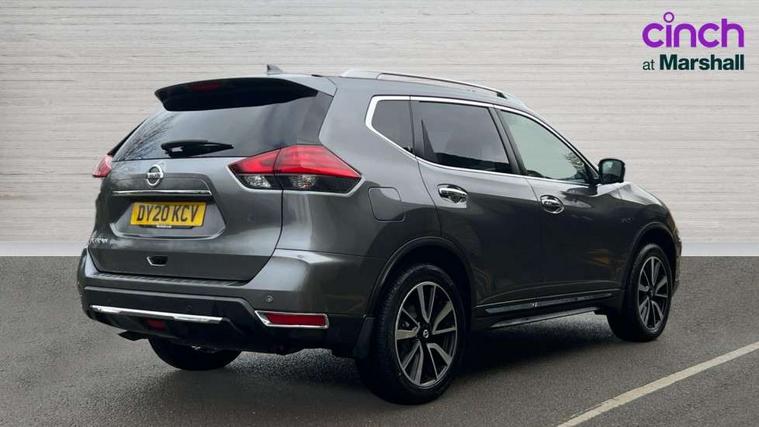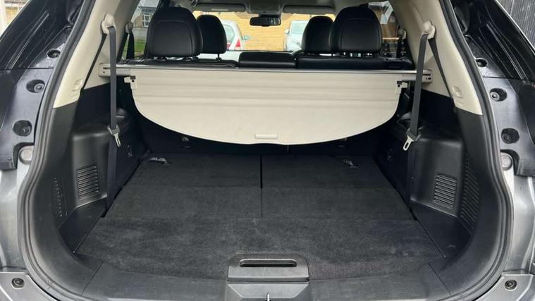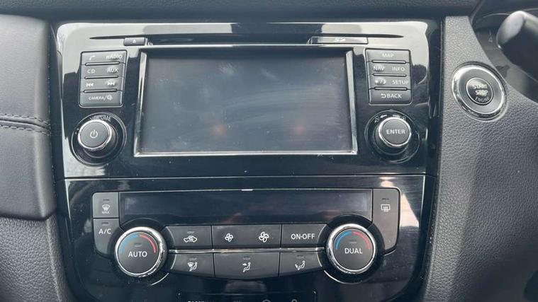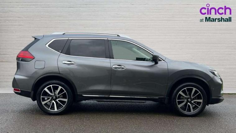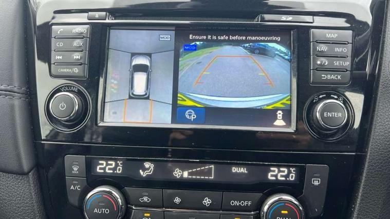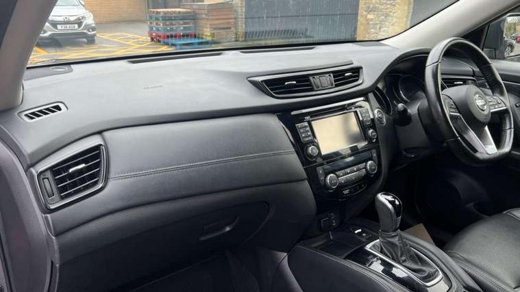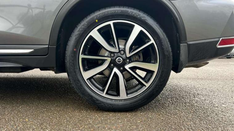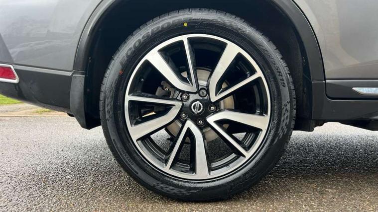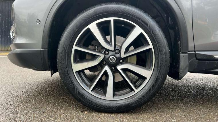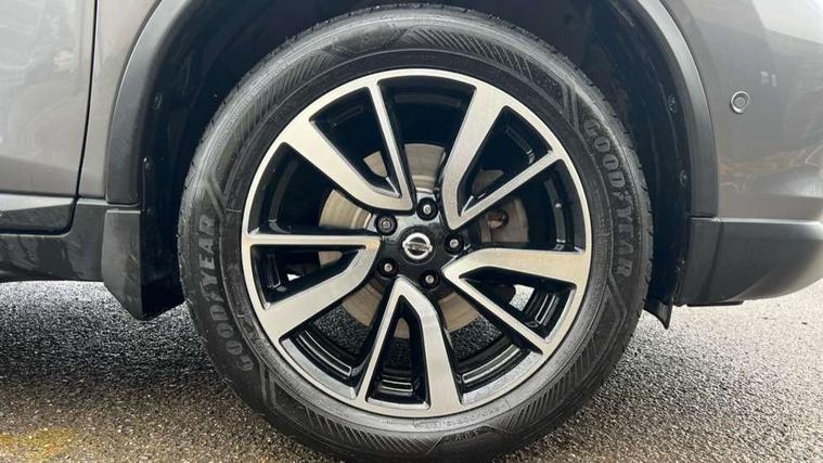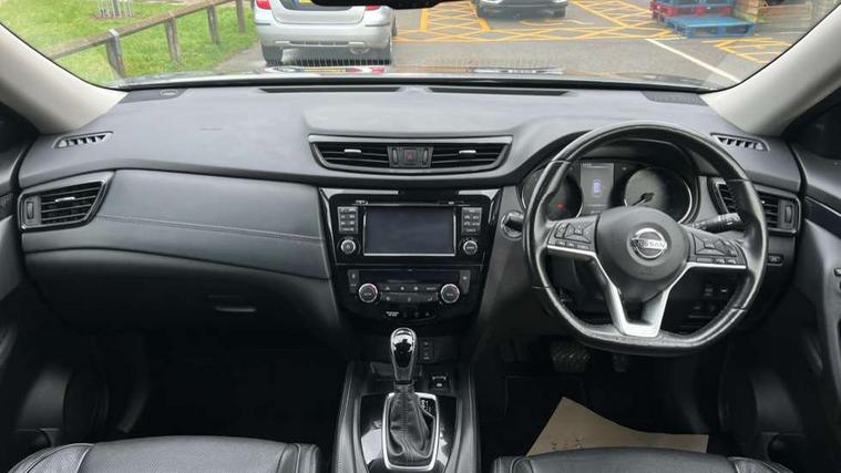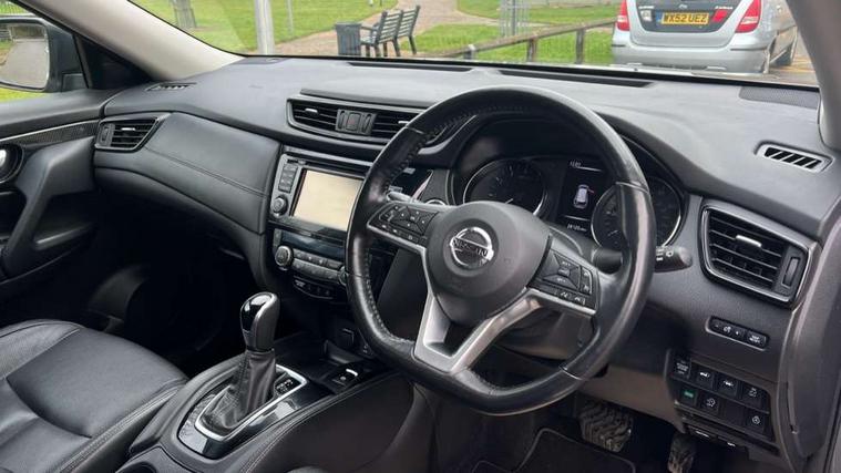5" TFT driver information centre, Automatic tailgate opening, Blind spot monitoring, Bluetooth phone integration system, Cruise control + speed limiter, Driver attention alert system, Front and rear parking sensors, Intelligent around view monitor, Intelligent parking assist, Lane departure warning system, Moving object detection, Nissan connect evo 7" touchscreen navigation and entertainment system, PAS, Push button start, Rear cross traffic alert, Traffic sign recognition, Trip computer, Nissan chassis control (intelligent ride control, intelligent trace control, intelligent engine brake), DAB Digital radio, Radio/CD, Smartphone apps, Steering wheel mounted audio controls, USB/aux input socket, Adaptive front lighting system, Anti dazzle rear view mirror, Automatic headlights, Automatic rain sensing wipers, Black honeycomb front grille, Body colour door mirrors, Chrome door handles, Chrome side mouldings, Chrome window surround, Electric folding door mirrors, Electric heated door mirrors, Front and rear electric windows, Front fog lights, LED daytime running lights, LED Headlights, Panoramic sunroof with one touch shade, Rear privacy glass, Satin silver roof rails, Shark fin roof aerial, 3 rear headrests, 60/40 split rear bench seat, Centre console storage box/armrest, Configurable luggage board system, Driver's electric lumbar adjustment, Dual zone climate control, Electric adjustable front seats including height adjust, Front and rear door pockets with bottle holders, Front cupholders, Front/rear armrests, Heated front seats, Heated rear seats, Height adjustable front headrests, Individual rear reading lights, Isofix child seat attachment, Leather D shaped steering wheel, Leather steering wheel and gear knob, Pollen filter, Tilt/telescopic adjustable steering wheel, 3 point seatbelts on all seats, 6 airbags - Driver, front passenger, curtain and side airbags, ABS, Child locks on rear doors, EBD + Brake Assist, Electric parking brake, ESP + traction control, Intelligent emergency braking with pedestrian recognition, Seatbelt warning, Tyre pressure monitoring system, Immobiliser, Intelligent Key, Remote central locking, Thatcham Cat.1 alarm, Full size spare wheel,