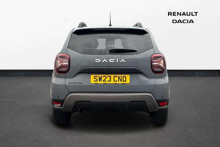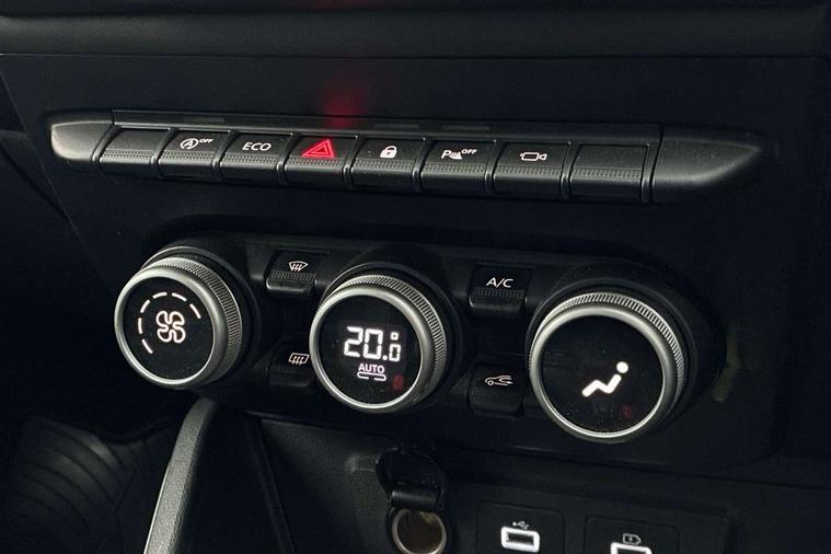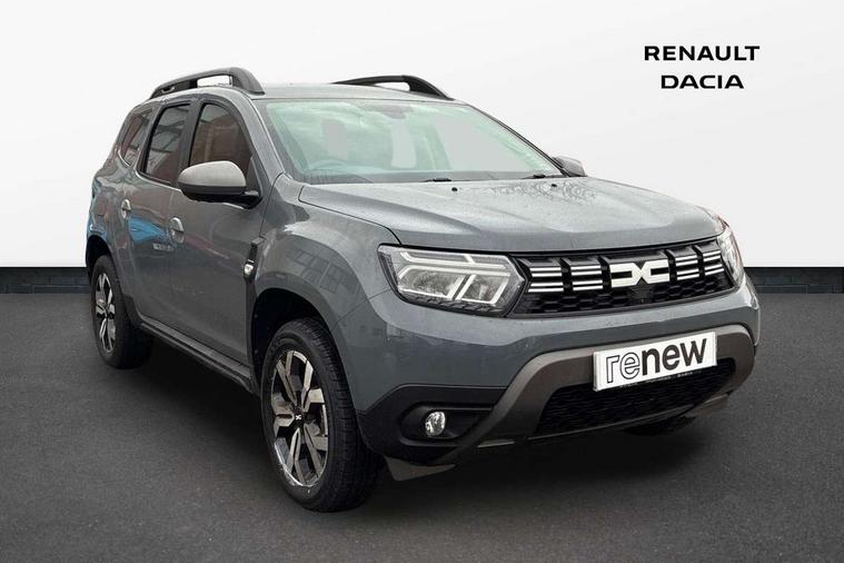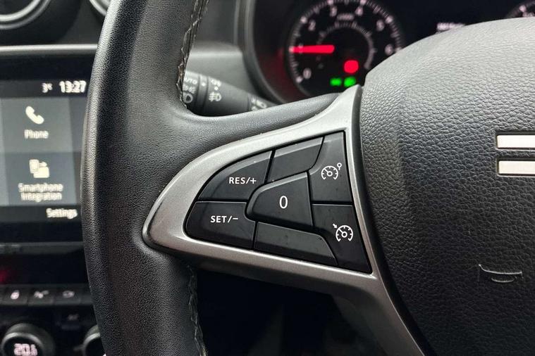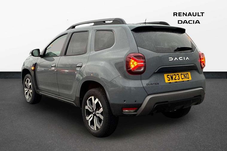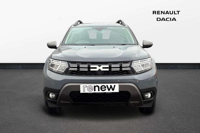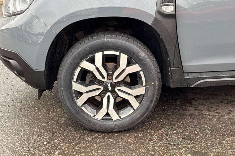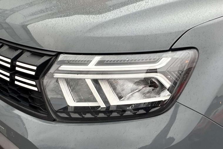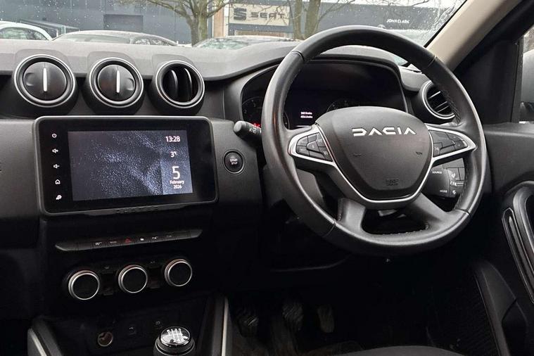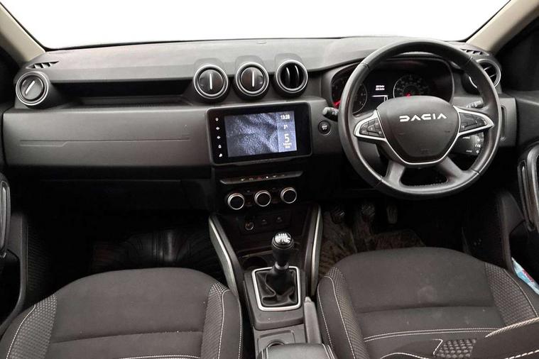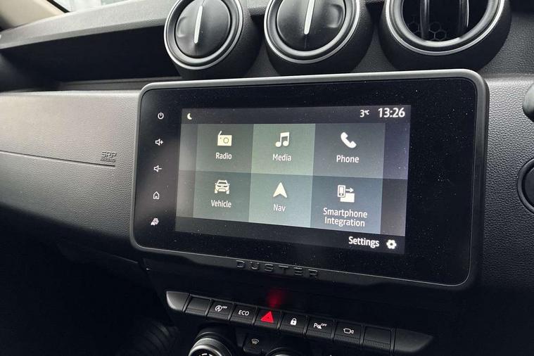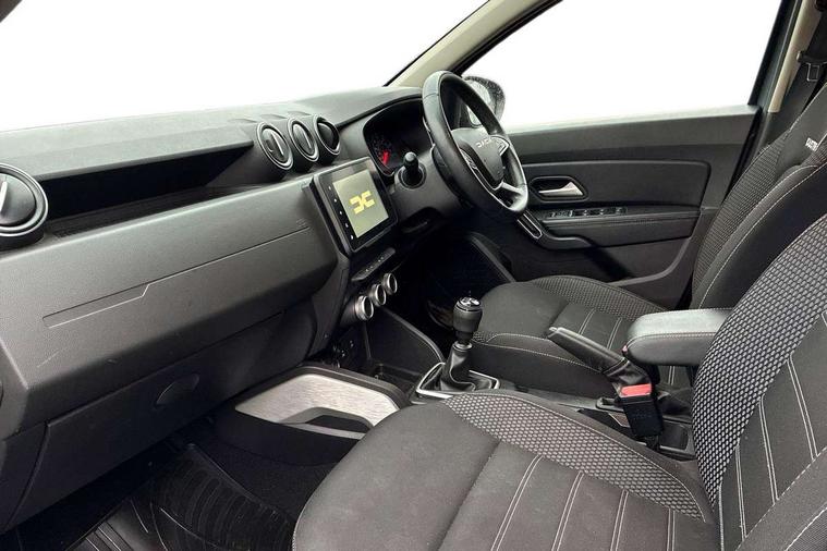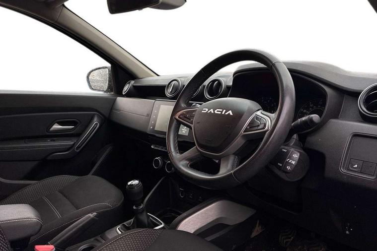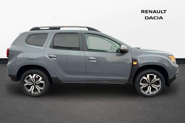 Blind spot warning, Cruise control and speed limiter, eCall emergency system, Eco mode, Electric power assisted steering, Multi view camera, On board computer, odometer, trip computer, average fuel consumption, average speed, service indicator, outside temperature gauge, Rear parking sensors, Rev counter, Reversing camera, Stop/start system, 8" Media Navigation with wireless smartphone replication, Dacia plug and radio/MP3/USB/bluetooth/DAB/steering wheel control, 3 speed windscreen wipers, Acoustic windshield, Automatic front wipers, Black side sills, Black/satin chrome tailgate trim with Duster inscription in black background and lettering, Body coloured door handles, Chrome front grille with hot stamping, Chrome logo surround on steering wheel, Dark glass on lateral rear windows, Daytime running lights, Drivers window one touch up/down, Dusk sensor, Electric adjustable/heated door mirrors, Electric folding door mirrors, Electric front windows, Electric rear windows, Front and rear body coloured bumpers, Front door sill protection strip, Front fog lights, Grey quartz longitudinal roof bars with Duster inscription, Heated rear window, High level third rear brake light, Modular roof bars, Rain sensor, Rear side wing doors, Rear spoiler, Rear wash/wipe, Satin chrome door mirrors, Underbody protection skid plates, Y shaped LED headlights with rear LED lights, 3 rear height adjustable headrests, 3 seat bench in 2nd row, 60/40 split folding rear seat, Automatic air conditioning, Backlighted steering wheel buttons, Boot light, Driver seat lumbar adjustment, Fabric decorative insert on door panels, Fabric upholstery, Front head restraints, Front passenger reading light, Gear shift indicator, Glovebox light, Heated seats, Height adjustable driver seat, Height adjustable front and rear headrests, Height and depth adjustable steering wheel, High centre console with driver armrest, Isofix points for child seats in both outer rear seats, Map pocket on front seat backs, Passenger sunvisor with vanity mirror, Rear passenger reading light, Satin chrome gear lever cap insert, Satin chrome interior door handles, Satin chrome lower steering wheel insert, Single front passenger seat, Soft feel leather steering wheel, 3x3 point rear seatbelts, ABS and Emergency brake assist, ASR traction control with Electronic stability control, Child locks on rear doors, Door open visual and audible warning, Driver airbag, Driver and passenger seatbelt not fastened - visual and audible warning, EBD - Electronic brakeforce distribution, Front passenger airbag, Front passenger airbag deactivation, Front seatbelt pretensioners, Front side airbags, Height adjustable front seatbelts, Hill start assist, Tyre pressure monitor, Keyless entry, Remote central locking, Thatcham approved engine immobiliser, Charcoal grey central console surround, Matt black central console fascia, Matt black decorative insert on rear door panels, Piano black decorative insert on front door panels, Satin chrome air vent surround, Satin chrome instrument dial surrounds, 17" Alloy wheels,