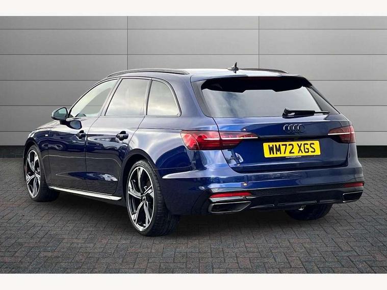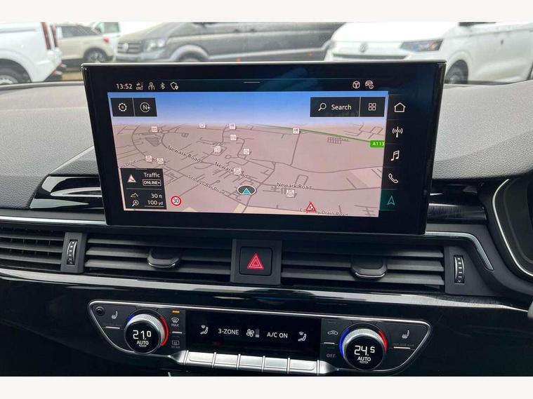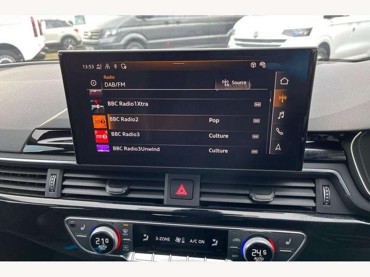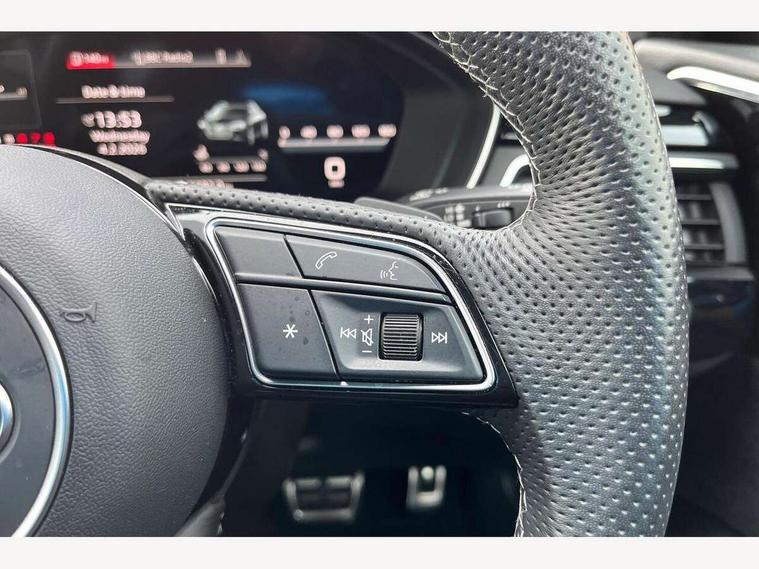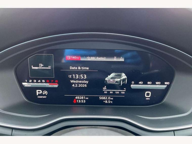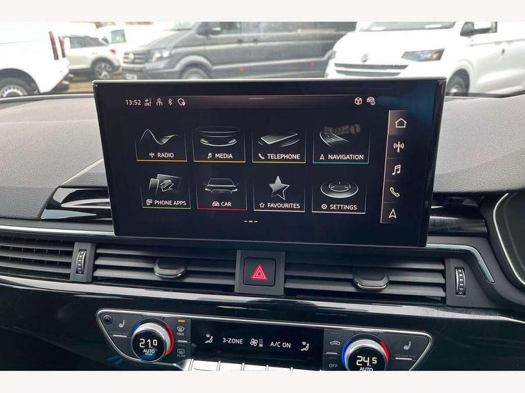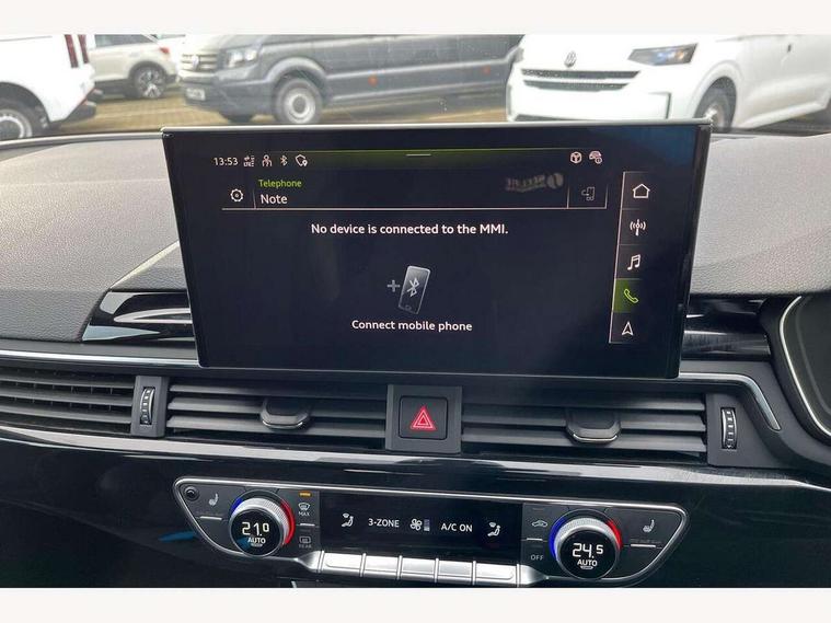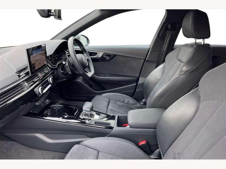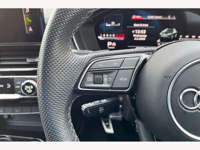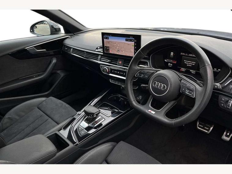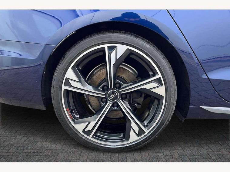 Audi connect safety and service (e-call), Audi connect with Amazon Alexa Integration, Audi drive select, Audi smartphone interface, Audi virtual cockpit, Automatic start-stop system with coasting functionality and efficiency programme, Bluetooth interface, Electromechanical power steering, Email, calendar and text messages displayed via MMI, MMI Navigation plus with MMI touch includes 10.1" high resolution colour MMI display, 3D map, Power operated tailgate, Voice control system, 54 litre fuel tank, Sports suspension lowered by 23mm, 2 USB charging ports, 8 passive loudspeakers, DAB digital radio reception, Audi beam uses LEDs to project the audi logo onto the ground as you exit your A4, Auto dimming rear view mirror, Black Audi rings and black badging (model name in black badging, no engine badging), Body colour door handles, Body colour front spoiler lip, Body colour side sill trim, Electrically folding auto dimming/adjustable/heated door mirrors with LED side indicators and kerb view function for passenger side, Exhaust tailpipes in high dark chrome, Front and rear bumpers with side skirts, Grained matt black side air inlets with matt aluminium silver inlay, High beam assistant, High gloss black B pillar trims and triangular rear door trim, LED headlights with LED rear lights + dynamic rear indicators + headlight adjustment and high beam, turning light + LED daytime running lights, LED third brake light, Privacy glass, Rain and light sensors, Rear diffuser in matt black with trim strip in matt aluminium silver, Rear side wing doors, Rear wiper, RS4 rear spoiler in body colour, S Line badges on the front wings, S Line roof edge spoiler, Variable intermittent front wash/wipe, Windscreen with acoustic glazing, 4 way electric lumbar support for driver and front passenger, 40/20/40 split folding 3 rear seat bench in 3 parts with rear centre armrest, Black cloth headlining, Black perforated leather gearknob, Contrast stitching on seats, steering wheel and gear lever gaiter, Deluxe 3 zone electronic climate control, Door sill trims with aluminium inlay, Electric load area cover, Front and rear head restraints, Front centre armrest, Heated front seats, Illuminated door sill trims with S logo, ISOFIX child seat mounting and top tether, Manual seat adjustment, Single front passenger seat, Stainless steel pedals and foot rest, Black styling pack - A4 Avant, LED Interior light pack - A4/S4, 3 rear seatbelts, 6 airbags - Driver, front passenger, curtain and side windows, Electronic Stabilisation Control (ESC) including ABS, ASR and EDL, Hill hold assist, Multi collision brake assist, Pop-up bonnet for pedestrian protection, Pre sense city, Rear door child safety locks, Seatbelt monitoring, Warning triangle and first aid kit, Anti theft alarm, Anti theft wheel bolts, Central locking, Keyless Go, Piano black finish inlay, 19" 5 arm flag design Audi sport diamond cut alloy wheels in gloss anthracite black, Tool kit, Tyre repair kit,