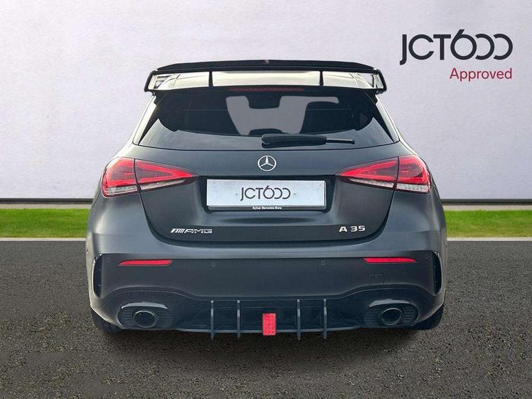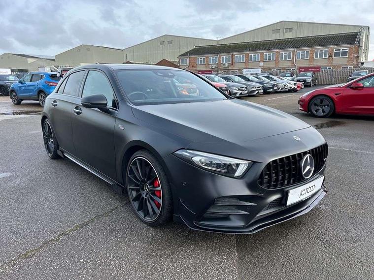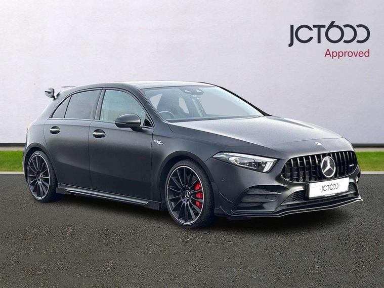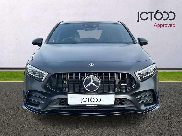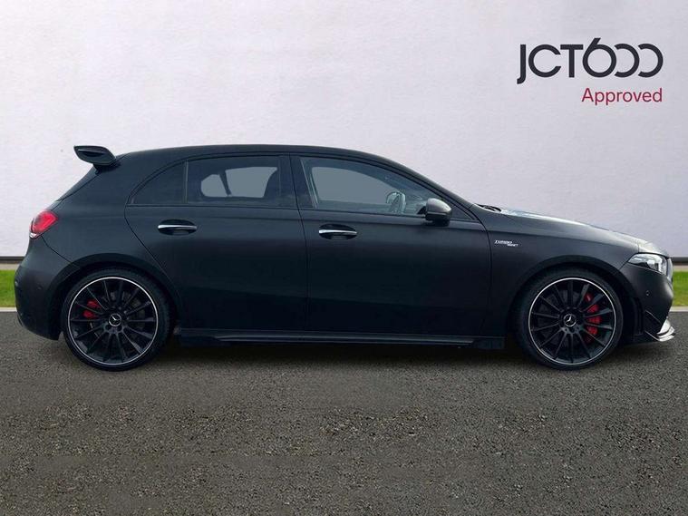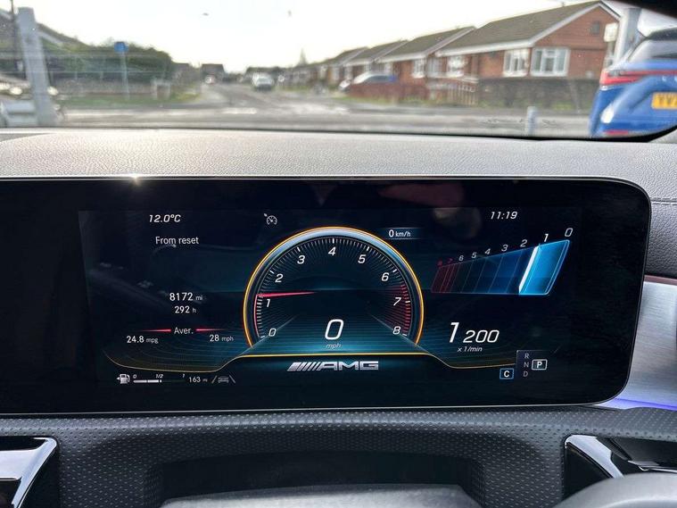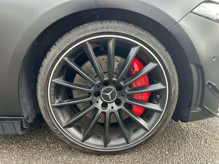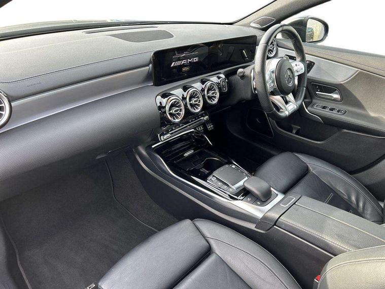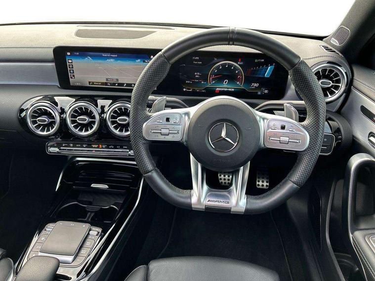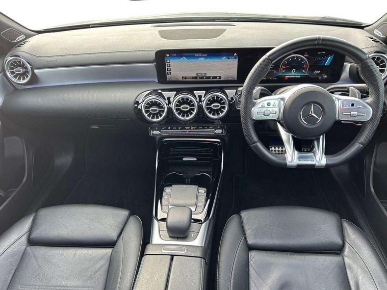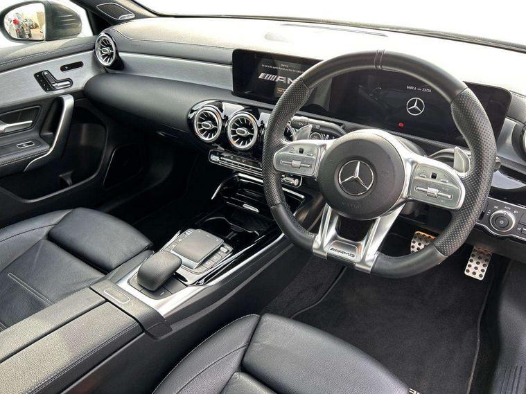 10.25" Digital instrument cluster display screen, 10.25" media display, 180 degree rear view camera with parking guidelines, Active lane keep assist, Active park assist with parktronic system including front and rear parking sensors, Attention assist, Brake pad wear indicator warning light, Car wash mode, Direct steering, Dual bluetooth interfaces, DYNAMIC SELECT with driving programs (Slippery, Comfort, Sport, Sport+ and Individual), ECO start/stop function, Fluid level warning indicator for fuel, oil, coolant and washer fluid, Hard-disk navigation, Hey Mercedes Voice activation, Lamp failure indicator, MBUX augmented reality for navigation, Mercedes me connect including emergency call system, accident recovery, breakdown management and maintenance, Outside temperature gauge, Owners manual in English, Pre-installation for car sharing, Pre-installation for Vehicle Monitoring, Pre-installation for Vehicle Setup, Preinstallation for Mercedes Benz link, Service indicator (ASSYST), Smartphone integration with Apple CarPlay and Android auto, Traffic sign assist, Trip computer, Wireless charging, Rear axle multi-link, 2 USB ports (type C) in rear stowage compartment and one in front of center console, Burmester surround sound system - 590W, DAB Digital radio, MBUX multimedia system with DAB digital radio and touchpad including satellite navigation, 4 Electric Front and Rear windows, Adaptive brake lights, AMG bodystyling - Front apron with splitter in chrome, rear apron with chrome trim and chrome visible trim elements in tailpipe, AMG Front apron with flics as air deflector elements on the outer air intakes, AMG radiator grille with twin blade lamella and AMG Lettering, AMG Rear apron with specific diffuser look with four vertical fins and two round chrome plated tailpipe trim elements with a diameter of 90 mm, AMG spoiler lip on roof, AMG Sports exhaust system with two round tailpipes measuring 90 mm in diameter attached in rear apron, AMG lettering plus ribbing on the inside of the, Black weather strip, Body colour bumpers, Body colour door handles, Body colour side skirt, Electric adjustable and heated door mirrors with integrated LED side indicators, Front wings wheel arches with TURBO 4MATIC lettering, Headlamp assist automatic headlamp activation, Heated glass rear windscreen + timer control, High gloss black beltline, Illuminated front door sill panels with Mercedes-Benz lettering, LED high performance headlamps with integrated LED daytime running lights, LED tail lamp, LED third brake light, Multibeam LED with adaptive highbeam assist plus, Panoramic sliding sunroof, Privacy glass, Radio aerial, Rain sensing windscreen wipers with two sensitivity settings, Rear fog lights, Rear wiper, Trim elements on louvres in outer air inlets in silver chrome, Wider wheel arches for AMG wheels, Window line trim strip in high gloss black, 40:20:40 split folding rear seats, AMG Performance steering wheel in nappa leather, Auto Mercedes-Benz child seat recognition sensor, Black air vents with surround in silver chrome, Black roof lining, Brushed stainless steel sports pedals with rubber studs, Controller on centre console with chrome surround, Electrically adjustable front memory seats including lumbar support, Floor mats with stitched edging and AMG lettering, Front centre armrest with storage compartment, Front seat backs luggage nets, Front seat cushion length adjustment, Heated front seats, Height/reach adjustable steering column, Interior lighting - 64 colour Ambient lighting, Interior mirror with reading lamps in black and frameless, ISOFIX and top tether child seat fixing points in two outer rear seats, Rear armrest with 2 cupholders, Rear head restraints, Seat occupancy sensor for front passenger seat, Silver coloured aluminium gear shift paddles on steering wheel, Sports seats with integrated headrests, Stowage compartment in centre console with retractable cover, Sunvisors with illuminated vanity mirrors, Touchpad on center console, Twin front cupholders, Two zone thermotronic luxury automatic climate control, Aerodynamic pack - A Class, AMG night pack - A Class, Light and sight pack - A Class, Mirror package - A Class, Seat comfort pack - A Class, 3 rear 3 point seatbelts, ABS with Brake Assist, Active bonnet, Adaptive brake assist with hold function and hill start assist, Black seatbelts, Childproof locks manually operated for rear doors and electrically operated for rear power windows, Crash responsive emergency lighting, Driver and passenger head and side airbags, Drivers knee airbag, Dual stage driver/passenger airbags, Electronic parking brake, ESP curve dynamic assist, ESP with ASR, Front and rear seatbelt reminder, Front brake calipers with AMG lettering, Perforated front brake discs, Tyre pressure monitoring system, Warning triangle and first aid kit, Window airbags, Alarm system/interior protection/immobiliser, Keyless entry lock/unlock, Keyless Go, Remote central locking and crash sensor with emergency opening function, Urban guard vehicle protection system with immobiliser and interior protection, Light aluminium with longitudinal grain interior trim, 19" AMG multi-spoke matt black painted light alloy wheels with high sheen finish, Summer tyres, Tirefit sealant kit,