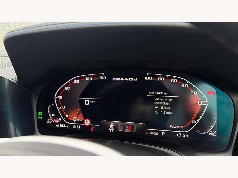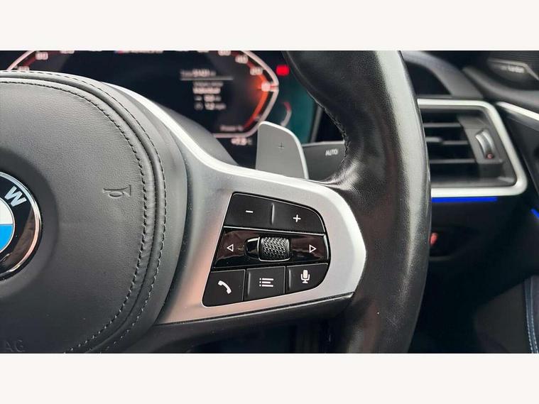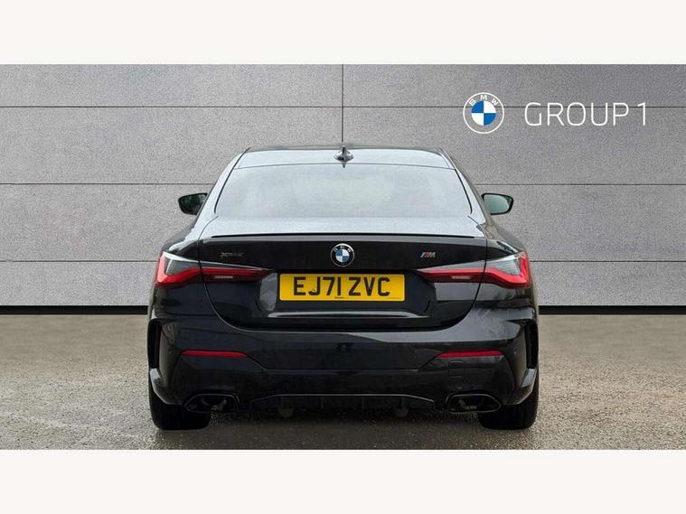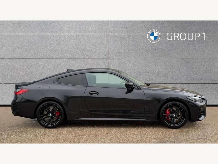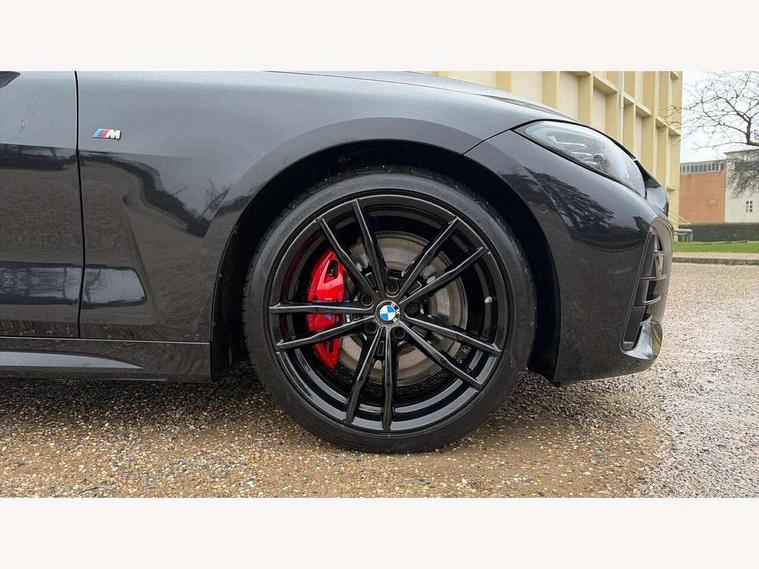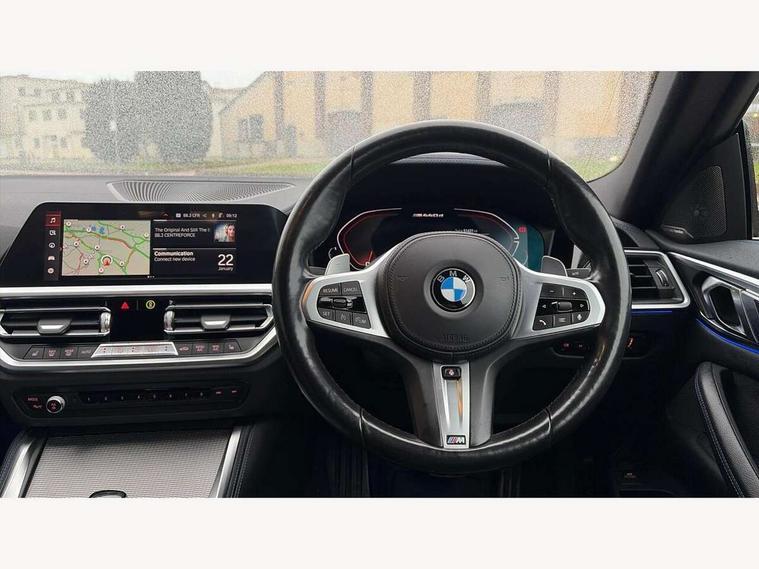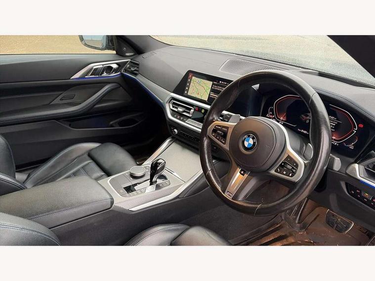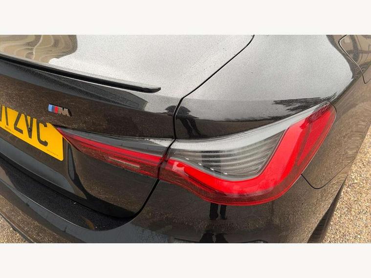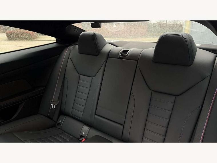 Active guard plus, Attentiveness assist, Auto start-stop, BMW ConnectedDrive online services, BMW iDrive controller on centre console, BMW Live Cockpit Professional Nav with 12.3" instrument display + 10.25" display, Intelligent Voice Assist, BMW OS 7, HDD, 2USB, 4G LTE connect, BMW service history, BMW Teleservices, Brake pad wear indicator in front and rear, Check Control warning system for monitoring of lights and door/luggage compartment open warning, Condition based service, Electric power steering with Servotronic steering optimised at all speed ranges, Gearshift time display in manual mode, Instrument cluster with speedometer with mph readout, tachometer, fuel gauge and oil temperature gauge, Integrated owners handbook, Oil sensor for level and grade, warning by check control system, On board computer - average speed, fuel consumption, outside temp display with acoustic warning, clock/date, service interval, odometer/trip meter, Optimum shift indicator, Reverse Assistant functionality for BMW Live Cockpit Professional Nav, Touch control functionality for BMW Live Cockpit Professional Nav, Variable sport steering, 48V Mild hybrid technology, 8 speed automatic steptronic transmission with gearshift paddles, Adaptive M suspension, Balanced 50/50 weight distribution, Diesel particulate filter, Driving experience modes - Comfort, ECO PRO, Sport and Sport+ mode, Low centre of gravity, Stroke dependent dampers, DAB tuner, Electronic service booklet, 3rd brake light, Acoustic glazing, Automatic headlight beam throw control with load dependent regulating reaction, dynamic compensation of braking dive and acceleration squat, Automatic windscreen wipers and automatic headlight, Automatically dimming electrochromatic rear view mirror, BMW emblem on engine compartment lid and tailgate, Body colour fuel filler flap, Body colour roof fin, Brushed aluminium inserts in the front door sill finishers with BMW designation, Daytime running lights, Dynamic brake lights, Electric windows - front and rear, with open/close fingertip control, anti trap facility and comfort closing function all round, Exterior mirrors - electrically folding with anti-dazzle, Fading support, Front and rear bumper system, Front apron plastic in body colour, Green tinted heat protection glazing, Illuminated bow type door handles in body colour drivers side with door lock, Interior rear view electrochromatic mirror with automatic anti dazzle function, Licence plate panel integrated into front bumper and tailgate, Lightweight engineering, M designation on front side panels, left and right, M rear spoiler in high gloss black, One piece front bumper cover including towing eye cover in body colour, Preparation for high beam assistant, Rear boot, Side frame decorative moulding black matt, Sun protection glass, Twin exhaust tailpipes x2, Two part LED tailights in L-shape with components in smoked glass, brake light, LED turn indicator and rear fog light, Visible VIN plate, Welcome lights in interior and door handle area, Widened track and increased camber values for max transverse dynamics, agility and steering precision, Window recess cover black high gloss, Windscreen wipers with integrated washing jets, xDrive designation on left tailgate, 12V power socket in front centre console, 2 front cupholder in centre console with clamping elements and matt black inlay, 2 Rear seat headrests, 2 seat bench in second row, 3 spoke M sport leather multifunction steering wheel, 3 zone automatic air conditioning, 4 pieces lashing eyelets in luggage compartment, 40:20:40 split folding rear seat and rear centre armrest with two cupholders, Ambient lighting with welcome carpet light, Anthracite headlining, Armrest integrated in front and rear door trim + front centre console armrest, Four grab handles integrated in roof lining, Front and rear door exit lighting (left / right), Front and rear door pockets, Front and rear footwell lights, Front and rear reading lights, Front headrests, Front passenger seat, Heated driver and front passenger seats, Height adjustable mechanically and infinitely variable steering column, Illuminated armrest storage compartment, Illuminated glove compartment with separate small compartment, Luggage compartment light, Make-up mirror lights, Storage compartment in rear centre console, Sunvisors with vanity mirrors and ticket pocket, Toolkit located in luggage compartment, Velour front floor mats, Connected professional package - 4 Series, M sport exterior styling pack - 4 Series, 2 x 3-point rear seatbelts, Battery safety cut-off, BMW emergency call, Brake energy regeneration, Braking pre-tensioning, Child seat ISOFIX attachment for the two outer rear seats, Coasting in idle in ECO PRO mode, Cornering brake control (CBC), Crash sensor activating of airbags, Unlocking doors, hazard warning lights, interior light, safety battery terminal, Driver and front passenger side airbags, integrated in the door side seat backrest bolsters for all seat variants, Driver/Front Passenger airbags, Dry braking, Dynamic brake control, Dynamic stability control + (DSC+) - Anti-lock Braking System (ABS) with brake assist and cornering brake control + Automatic Stability Control (ASC), Dynamic Traction Control - DTC, Electric parking brake including automatic hold function and automatic release of the parking brake when driving off, Electronic differential lock control (EDLC), Front and rear ventilated brake disc, Front passenger manual airbag deactivation, Head airbags for all 4 outer seats, Hill start assistant, M Sport seatbelts, Seat belt security check for driver and front passenger, Seat belt with belt stopper, pyrotechnic belt tensioners and belt force limiters, Side impact protection, Tyre pressure monitoring with three level warning strategy, Warning triangle and first aid kit, Alarm system (Thatcham 1) with remote control and electronic engine immobiliser, Central locking switch for all doors, fuel filler cap and luggage compartment, R