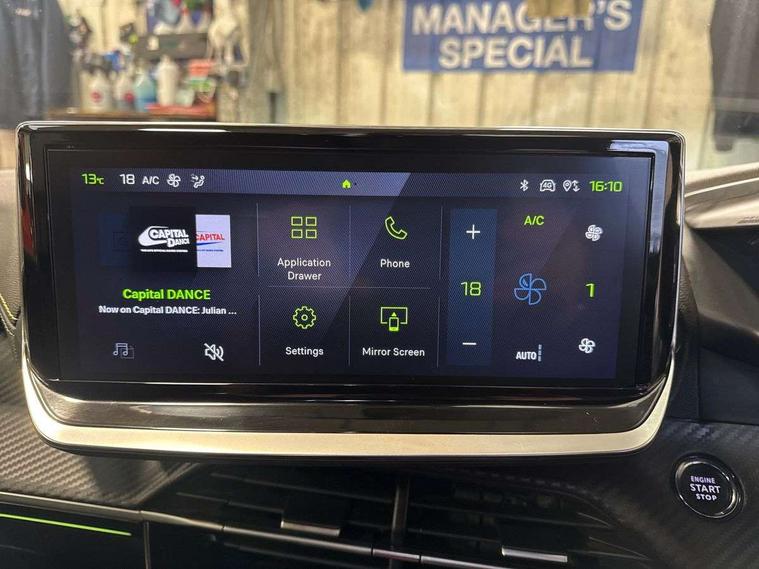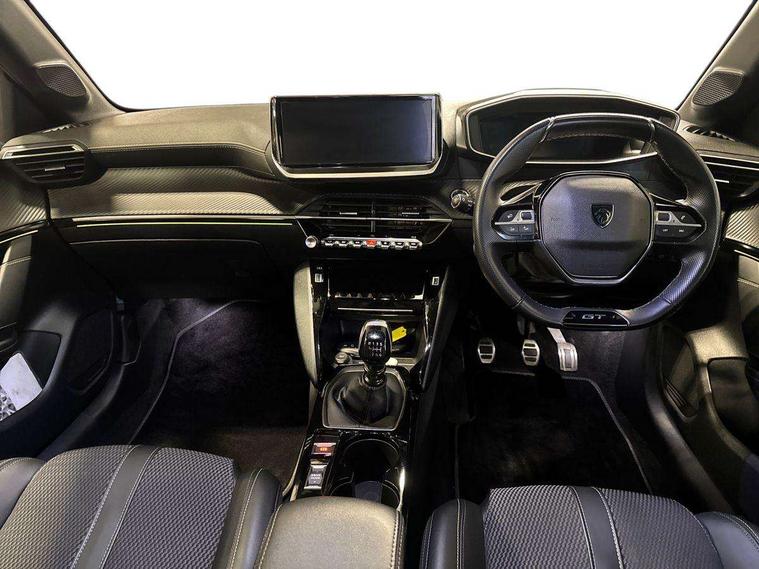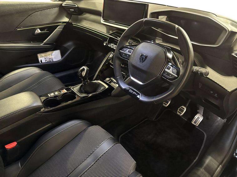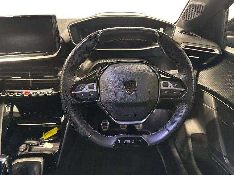 Bluetooth telephone facility, Drive mode select (Eco/Normal/Sport), Driver attention warning, Emergency call service, Exterior temperature indicator with ice warning, Front and rear parking sensors, Multi function trip computer, PEUGEOT i-Cockpit with 10" configurable 3D colour head up instrument panel, PEUGEOT i-Cockpit with 10" HD capacitive colour touchscreen, PEUGEOT i-Cockpit with compact steering wheel, PEUGEOT SOS and assistance, Push button start, Smart phone docking station, Smartphone 15W wireless charging plate, Speed limit recognition and recommendation, Start/stop system, Wireless mirror screen with apple carplay and android auto, 6 Speakers - 2 tweeters and 4 door speakers, DAB Digital radio, Peugeot i-connect infotainment system - 10in HD touchscreen, AM/FM/DAB digital radio, Wifi Mirroring, Bluetooth & 2 USB connection, USB-A socket (x1) and USB-C socket (x1) - rear, USB-C data and charge socket and USB-C charge socket in front, Voice recognition for radio, navigation and telephony features, 2 X Rear number plate lights, Acoustic windscreen, Antenna - Gloss Black 'fin' design, Automatic hazard light activation upon heavy brake application, Body coloured exterior door handles, Dark tinted rear side and tailgate windows, Diamond black rear spoiler (roof), Door sills protection with PEUGEOT signature lettering, Electric heated and power folding door mirrors with courtesy floor lighting, Frameless electrochrome interior rear view mirror, Full LED headlights with automatic height adjustment and PEUGEOT smartbeam assist, Gloss black B pillar, Gloss black door mirror shells, Gloss black front bumper grille with body colour accents, Gloss black rear cluster connecting strip, Gloss black wheel arch extensions, Gloss black window weatherstrips, GT model designation badging on C pillar, GT model designation badging on tailgate, Headlights left on audible warning, LED 3 claw horizontal rear lighting signature (with daylight function) and LED brake lights, indicators and reversing lights, LED daytime running lights with distinctive 3 claw signature, LED front indicators, LED third brake light, Model designation badges front and rear in basalt grey, One touch electric front/rear windows with pinch protection, Rear bumper with gloss black finish, Rear reversing lights, Rear side wing doors, Rear windscreen wiper triggered automatically in reverse gear, Roof spoiler, Tailgate with heated rear windscreen and wiper blade, Variable front intermittent wipers, 1/3 to 2/3 split folding rear seats, 12V socket, 3 seat bench in 2nd row, 8 Colour personalisable ambient lighting, Adamite green contrast stitching to front and rear armrest, front centre console, dashboard facia, Aluminium pedals, Automatic mono zone climate control air condition, Boot lighting, Driver and front passenger dynamic seats, Driver and front passenger seat manual adjustment in longitudinal and back rest angle, Driver and front passenger seat mechanical height adjustment, Driver and passenger sun visors, front footwells and central storage with LED lighting, Electric power steering with reach and rake adjustable steering column, Front centre armrest with storage compartment, Front LED interior light, front LED reading spotlights(x2), rear LED reading spotlight(x2), Gear shift indicator, High centre console with 2 cup holders, Luxury carpet mats, Map pockets on the backs of the front seats, Multi function full grain perforated leather steering wheel with adamite green stitch detail and 'GT' emblem, Passenger seat height adjuster, Piano keys gloss black plated toggle switches to access main functions of the vehicle, Rear centre headrest, Roof lining - Mistral black, Seatbelt unfastened on the move audible and visual alert for front and rear seats, Single front passenger seat, Visibility pack - 208, 2x Isofix child seat fitting on outer rear seats, 3 rear 3 point seatbelts, ABS (Anti-lock Braking System) with EBD (Electronic Brakeforce Distribution) and EBA (Emergency Braking Assistance), Active safety brake with night function/cyclists/pedestrians, Child locking functionality on rear doors, Driver and front passenger airbag with passenger airbag deactivation, Driver/front passenger side airbags, Electric parking brake, ESP with Hill Assist, Front and rear curtain airbags, Front and rear disc brakes, Front optimised safety headrests and 3 x rear retractable headrests with height adjustable, Front three point retractable seatbelts with force limiters, Remote plip(x2) for locking, unlocking, includes emergency key blade, Tyre pressure monitoring system, Acoustic vehicle alert system (AVAS), Alarm - Connected, volumetric , perimetric, anti lift sensor, Automatic door locking when moving off, Deadlock, Electronic code immobiliser, Peugeot Open and Go System, Remote central locking, Carbon effect Dashboard, front and rear door panel finish, 17" Yanaka two tone diamond cut alloy wheels wheels includes gloss black inserts, Space saver spare wheel,