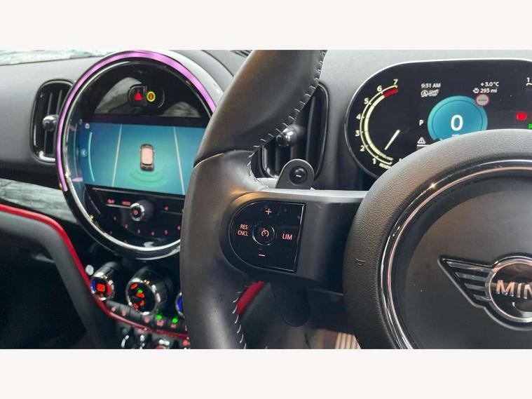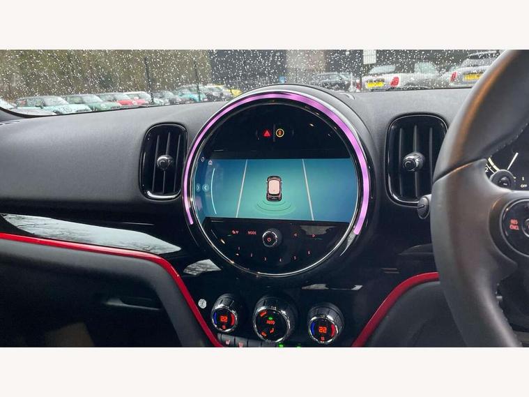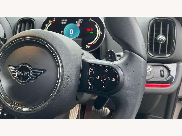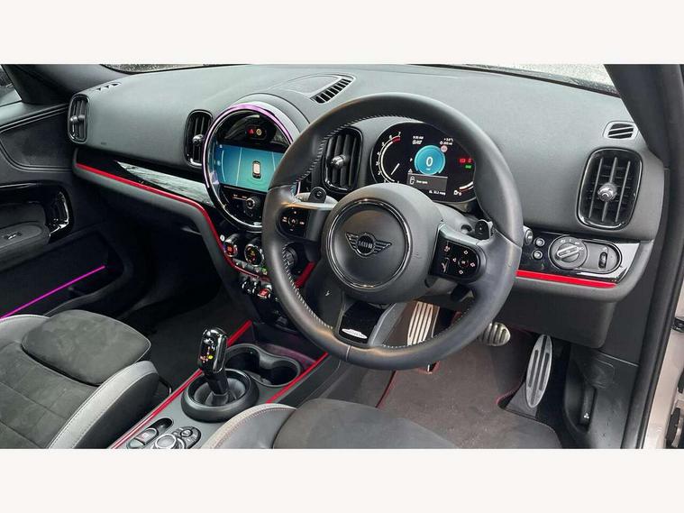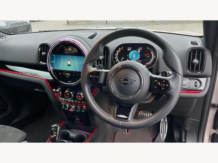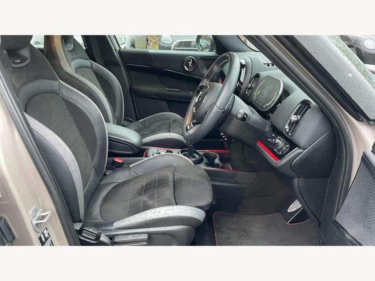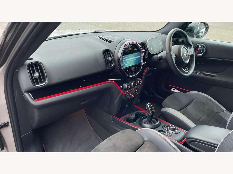 Active Guard incl speed limiting and lane departure functions with auto steering, and front collision warning with brake intervention, Automatic start/stop function with brake energy recuperation, Compatible mobile phone bluetooth with audio streaming, Cruise control with brake assist, Electro-mechanical speed dependant steering assistance, Instrument cluster, MINI Driving Modes - centre toggle switch to control driving setting (sport, mid and green), Mini E-call, On board computer, Double Vanos system, Fully variable valve control, High precision injection, Performance Control, Steptronic sport transmission with double clutch and steering wheel paddles, FM tuner and DAB digital radio, 3rd brake light, Bonnet scoop, Chrome fuel filler cap, Day time driving lights, Dynamic brake lights, Electric windows, Heated rear window, Heated windscreen washer jets, John Cooper Works - aerodynamic kit (front and rear apron, spoiler), front and rear sport bumpers and part-painted side sills with door sill finishers, John Cooper Works Logo, LED fog lights, Metal door sill strips with Cooper S imprint, Model logo, Model logo on Tailgate, Rain sensor with auto headlights, Rear fog lights, Rear side wing doors, Rear window wiper, Side scuttle panel with integrated indicator, Split rear doors, Sun/heat protection glass, White indicator lenses, 12V socket in centre console, 3 seat bench in 2nd row, 360L luggage compartment capacity, 4 lashing eyes in luggage compartment, 40:20:40 split folding rear seats, Anthracite headlining with grab handles and clothes hooks, Chrome interior highlights, Colour line - Carbon black, Cupholders, English handbook, Front headrests, Glove compartment, Height and length steering column adjustment, Interior lighting with 12 basic colours selectable via toggle switch in roof, Isofix rear child seat preparation, LED reading lights, vanity mirror lights, front foot well light and spotlight on front seats, Mini John Cooper Works leather gearshift lever and handbrake gaiters, Multifunction steering wheel, Nappa leather steering wheel with MINI Yours logo, Rear headrests, Single front passenger seat, Stainless steel pedals and foot rest, Storage compartments in doors, Sunvisors with vanity mirrors, Excitement pack - Countryman, Navigation pack - Countryman, Piano black exterior pack - Countryman Cooper S/SD/SE/Boardwalk, 2 tone horn, 3 point seatbelts on all seats, 6 Airbags - front, side, head and seat belt tensioners, Anti-lock braking system (ABS), DSC - Dynamic Stability Control, Electronic handbrake, Front and rear disc brakes, Hill start assist, Manual rear child locks, Tyre pressure monitoring system, Alarm system with tilt sensor, monitoring doors, bonnet interior and tailgate, Auto drive away locking, Deadlocking function, Electronic vehicle immobiliser, Locking wheel bolts, Start/stop toggle with keyless go, Piano black JCW interior trim, Tool kit,
