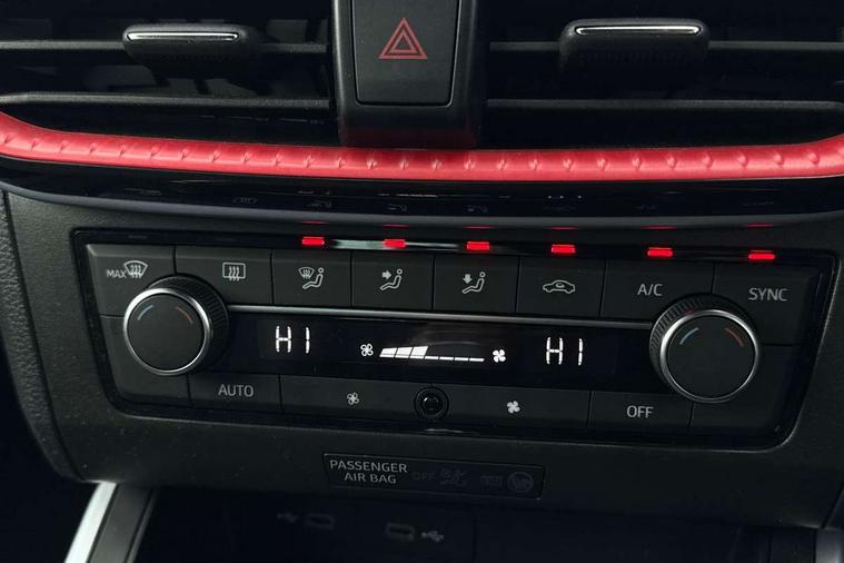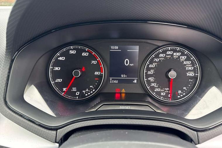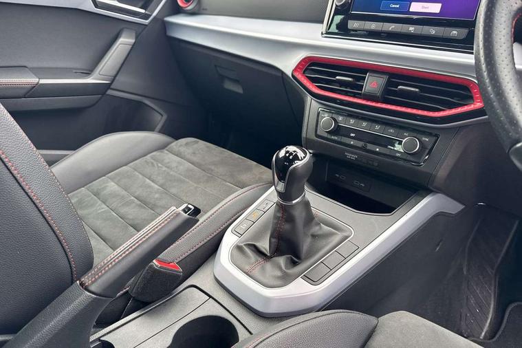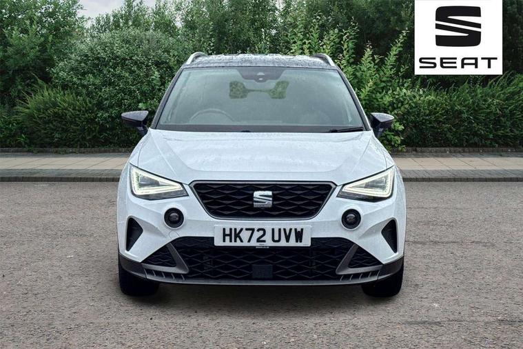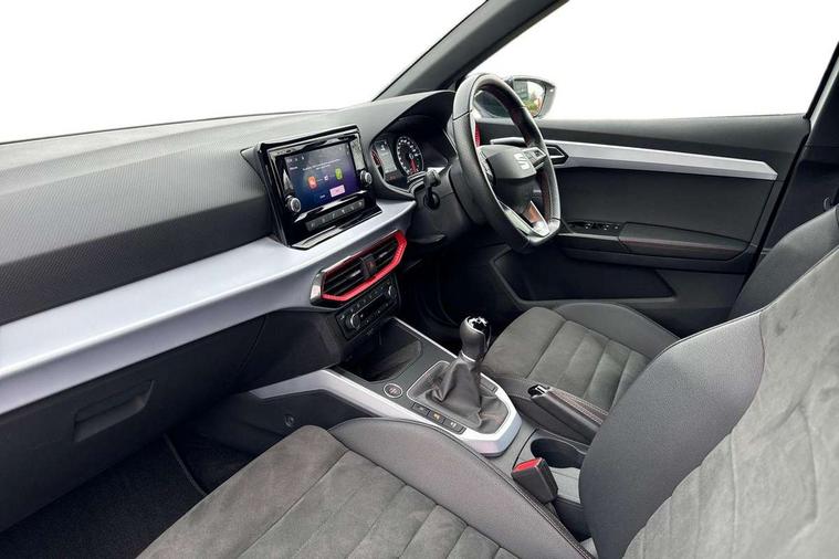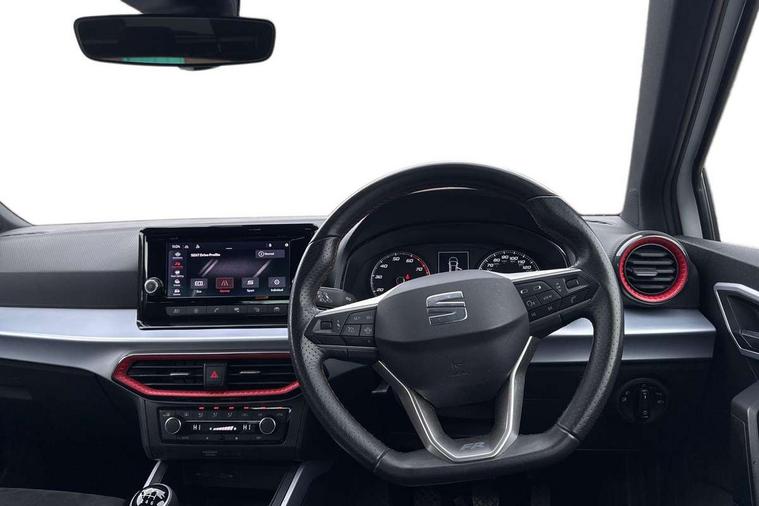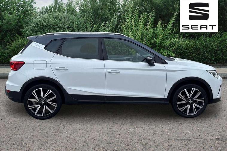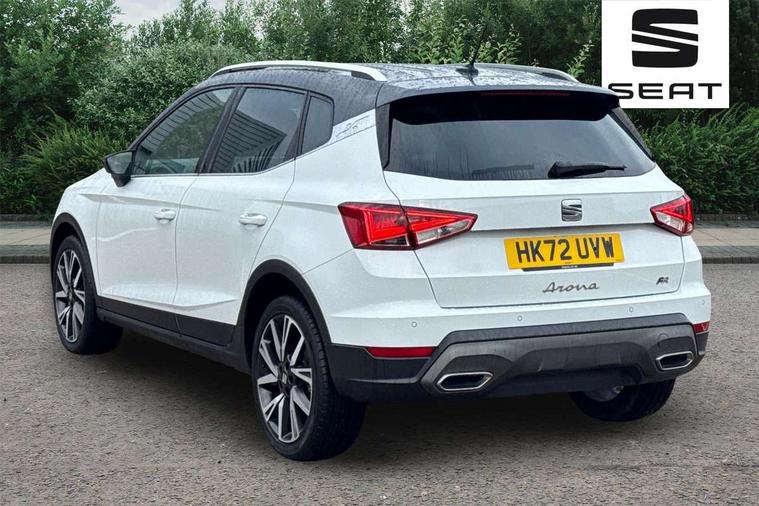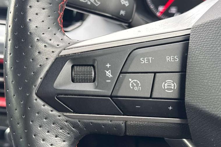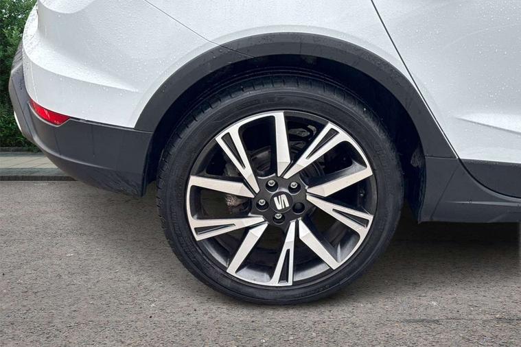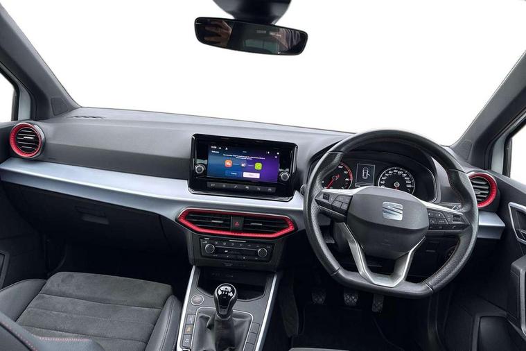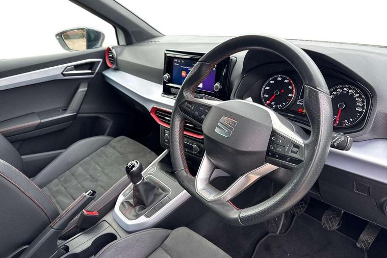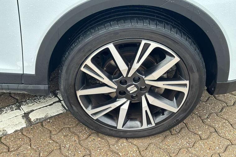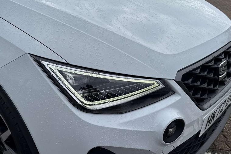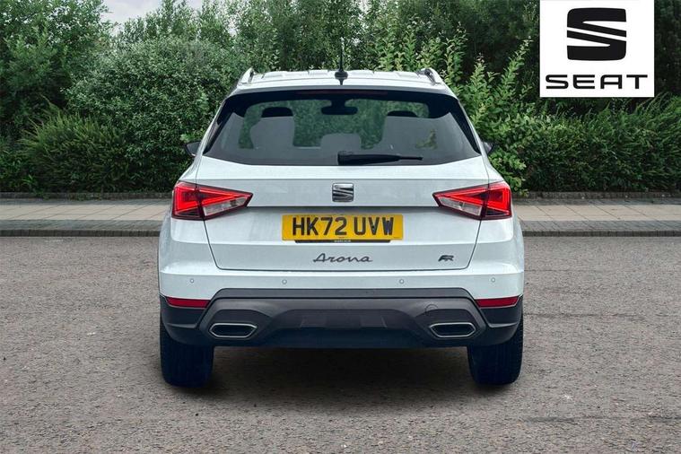 'Lights On' Reminder warning buzzer, Analogue cockpit with physical dials, Digital clock, E-call, Electric speed sensitive power steering, Full Link Smartphone Integration with Mirror Link, Apple Car Play, Google Android Auto with USB cable for Apple and Android compatibility, Lane keeping system, Low fuel warning light, Outside temperature display, Rear parking sensor, RPM counter, Seat connect with safety, service and remote, SEAT Drive profile - Four different models normal-sport-eco-individual, steering response, throttle response, Trip computer, Wireless phone charger, Bluetooth interface for hands free and audio streaming, DAB digital radio and AM/FM radio, Media system with 8.25" colour touchscreen with USB port (type c), Steering wheel mounted audio controls, Anti theft roof antenna, Automatic activation of hazard warning lights, Body coloured bumpers, Body coloured door handle inserts, Chrome roof rails and window surrounds, Dark tinted rear windows, Dimming rear view mirror, Electric front/rear windows, Electrically adjustable and heated door mirrors, Front fog lights with cornering function and rear fog light, FULL LED automatic headlights with dynamic headlight range control, coming and leaving home, LED daytime running lights, LED rear tail lights and licence plate lights, Protective side mouldings, Rear side wing doors, Rear spoiler, Rear window wash/wipe, Roof colour door mirrors, Third brake light, Twin exhaust pipe styling hidden exhaust pipe, Visible VIN plate, Windshield wiper with intermittent control and potentiometer, 2 cupholders, 3 seat bench in 2nd row, 60/40 split folding rear seat, Aircare filter, Black interior roof, Double boot floor, Driver sunvisor with covered mirror + card holder, Dual zone climate control, Front comfort seats, Front courtesy light with front and rear reading lights, Gear shift indicator, Height adjustable front seats, Height/reach adjustable steering column, Illuminated boot, Instrument lighting with brightness control, Interior ambient lighting, Interior light in footwell, central console and door panel, ISOFIX points in outer rear seats with top tether anchorage points, Microsuede cloth upholstery, Passenger sunvisor with vanity mirror, Perforated flat bottomed leather steering wheel/gear knob/handbrake with red stitching and FR logo, Single front passenger seat, Two front and three rear height adjustable headrests, Interior chrome pack - Arona, 3 point seatbelts on all rear seats, ABS, Active front headrests, Child locks on rear doors, Driver and front passenger airbags with front passenger airbag de activation, front side and curtain airbags, Electronic stability control, Emergency Brake Assist (EBA) and front assist, Front and rear seatbelt reminder, Hill hold control, Multi-Collision braking, Tiredness recognition system, Traction control, Tyre pressure monitoring system, Alarm with back-up horn, Electronic engine immobiliser, KESSY Keyless entry and go, Locking wheel bolts, Remote central locking + deadlocks, Tow away protection, Titan black dashboard,