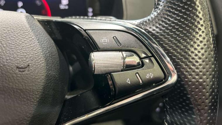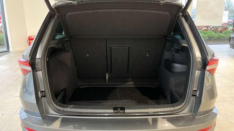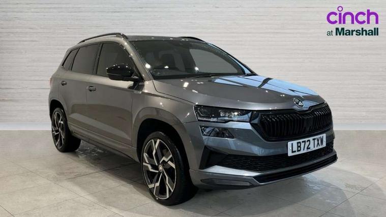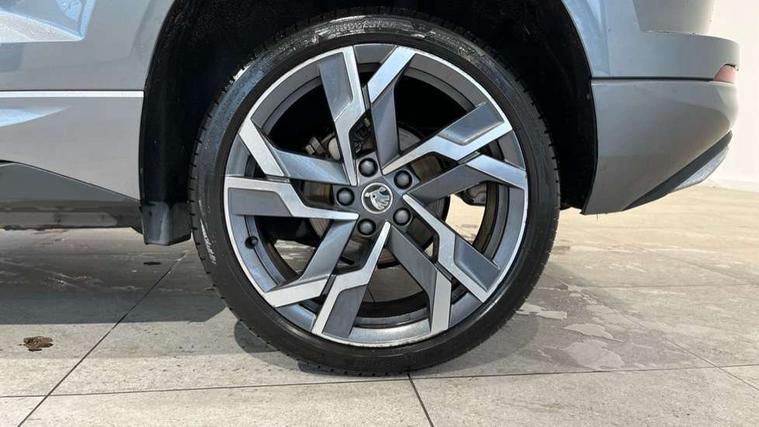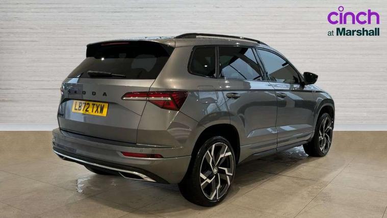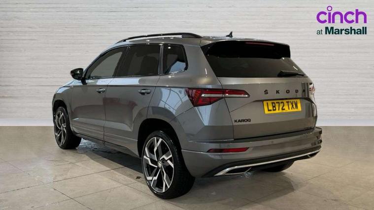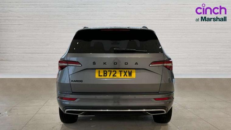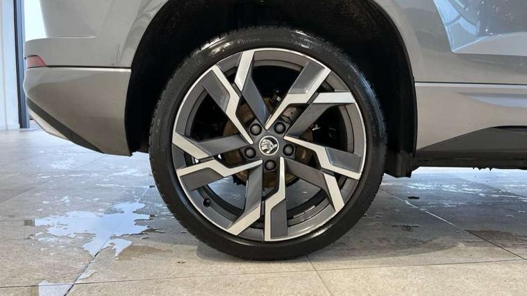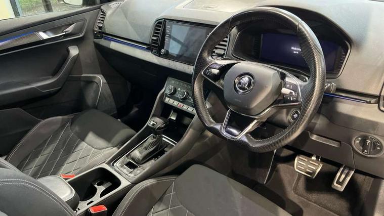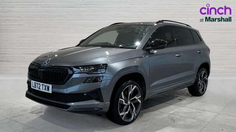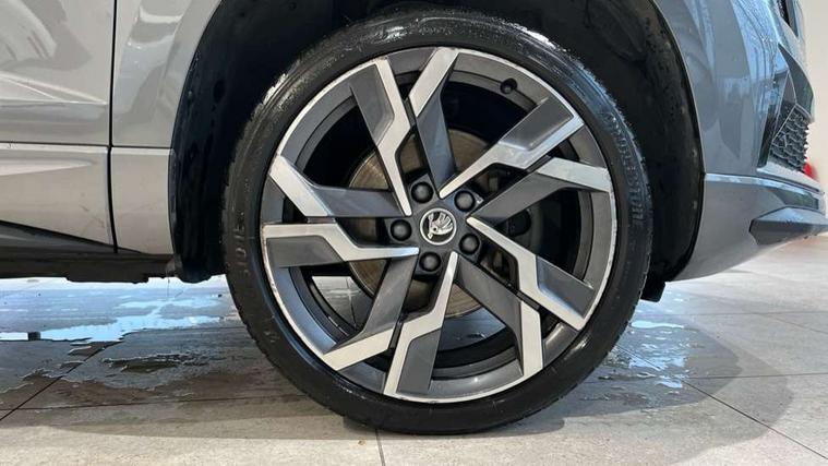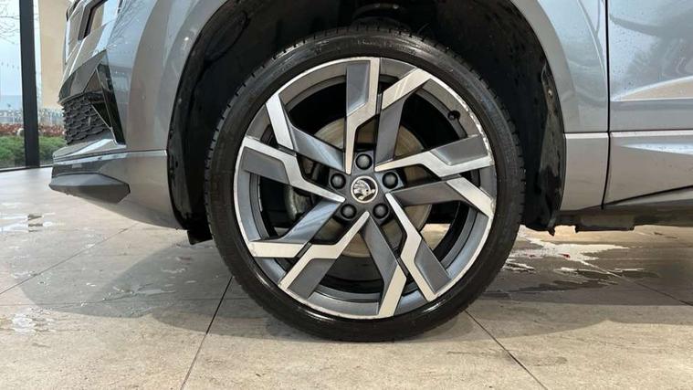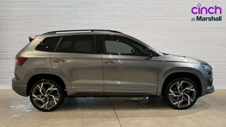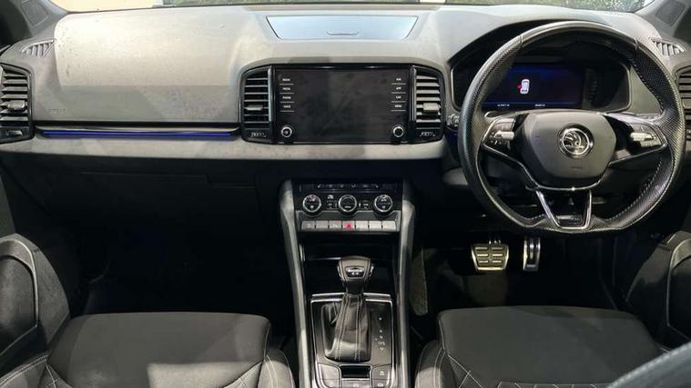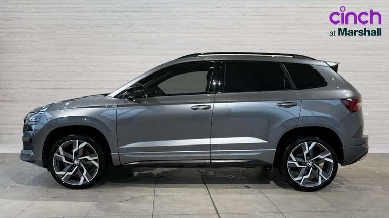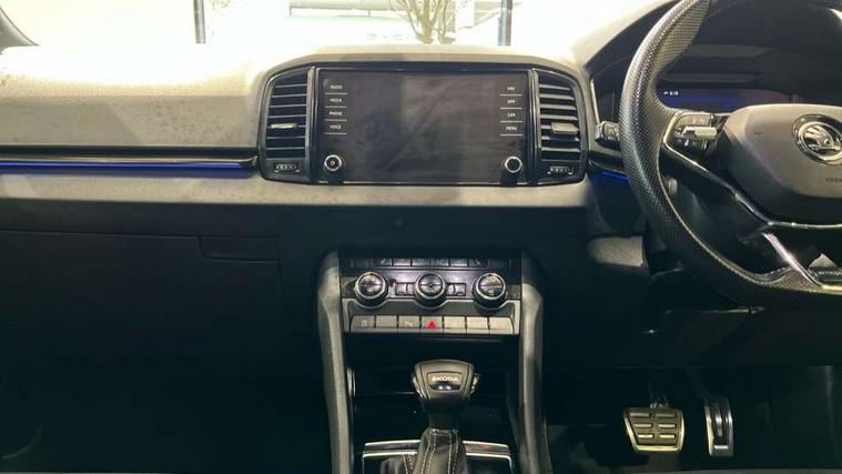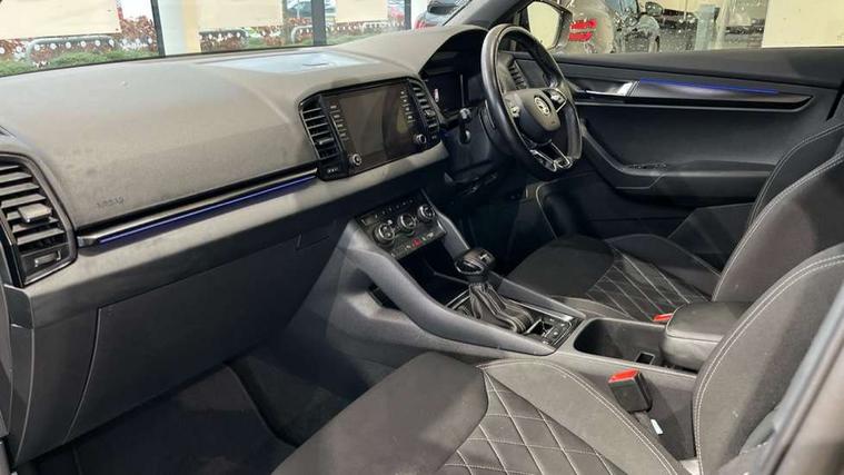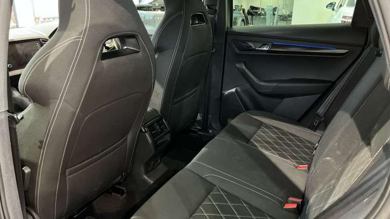 8" Digital display, Care connect, Driver fatigue sensor, Emergency services call system, Outside temperature gauge, Service interval indicator, SmartLink wireless for Apple and wired for Android, Start/stop system with regenerative braking, USB C Port x 2 in front centre console, Virtual pedal with electrically operated boot door, 8 Speakers, DAB radio with Bluetooth, USB connection, Acoustic glass, Aero front windscreen wipers with intermittent function, Auto dimming rear view mirror with light and rain sensors, Black door mirrors, Black electric window control buttons, Black radiator grille, Black roof rails, Body colour door handles, Dynamic headlight range control with cornering light function, Electric front and rear windows with child proof lock, Front door steps with SportLine logo, Heated rear windscreen, LED daytime running lights, LED rear lights with high functionality welcome effect and dynamic indicators, Light assistant (coming/leaving home/tunnel light), Panoramic sliding sunroof, Plastic scuff plates, Privacy glass, Protective door side sills in body colour, Rear diffuser, Rear side wing doors, Rear spoiler, Rear window wiper with washer system and intermittent control, Safety reflectors on front doors, Skoda lettering on tailgate in black, Sportline badge on front fender, Sportline decorative inserts with badging, Sports front and rear bumpers, 1.5 litre bottle holders in driver and front passenger door panels, 12V socket in boot, 12v socket in front centre armrest with storage compartment and rear air vents, 2 Folding hooks and nets in boot, 3 rear height adjustable headrests, 3 seat bench in 2nd row, 3 spoke leather sports multifunction steering wheel and silver stitching with gear shift paddles, 4 foldable roof handles with rear coat hooks, Black floor carpet, Black roof headlining, Chrome inner door handles, Double sided boot floor, Foldable hooks in the boot, Front head restraints, Height adjustable front three point seats belts with tensioners, Height/reach adjust steering wheel, Ice scraper, Illuminated glovebox, Illuminated luggage compartment, Isofix child seat preparation outer rear, Manual lumbar support for front seats, Pen holder, Pollen filter, Rear boot cover, Rear reading lights, Rear seats fixed folding and divided 60:40, Rubbish bin door, Safety vest holder, Single front passenger seat, Storage box in upper central dashboard closed, Sunvisors with illuminated vanity mirrors, Textile floor mats, Ticket holder, Titan black interior ceiling, Welcome animation with sportline logo, Light Pack - Karoq, Parking pack - Karoq, Automatic door unlocking in case of crash, Automatic fuel cut off in case of crash, Child locks on rear doors, Driver airbag, Electronic parking brake with auto hold function, Emergency rear braking signal, ESC including ABS, MSR, ASR, EDS, HBA, DSR, RBS, MKB and traction control, Front side airbags, Hill hold control, Knee airbags, Passenger airbag with switch-off function, Pedestrian monitor, Seatbelt reminder signalisation and pretensioner for all seats, Three point seatbelts rear, Two tone horn, Tyre pressure display, Tyre pressure monitor, Alarm with interior monitoring, back up horn and tilt sensor with safe function, Electronic engine immobiliser, Keyless entry and start/stop, Remote central locking with 2 remote folding keys, Black air vent surround, Black centre console, Satin black dashboard, Satin black door trim, 19" Vega black polished alloy wheels, Anti-theft wheel bolts protection, Matt black aero hub caps, Storage on wheel cover, Tool kit,
