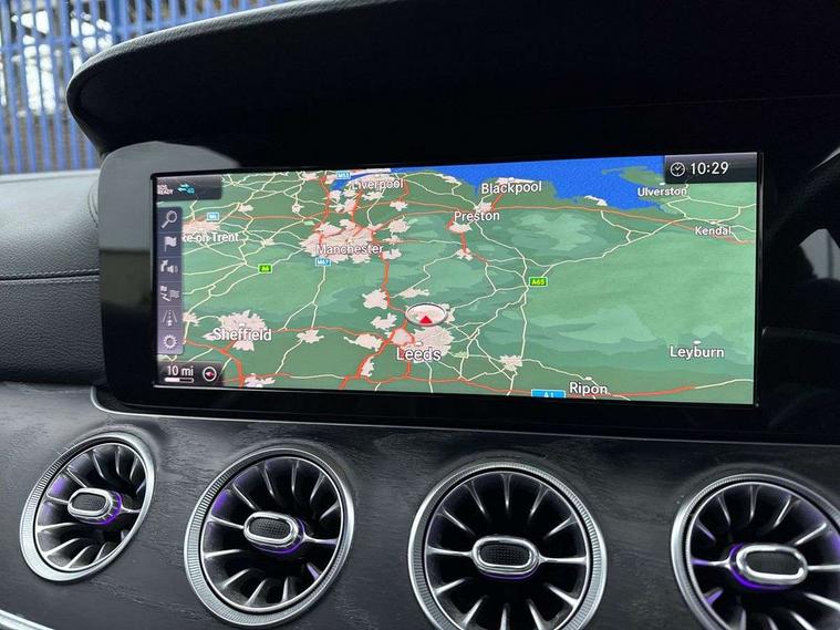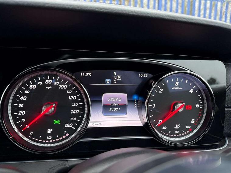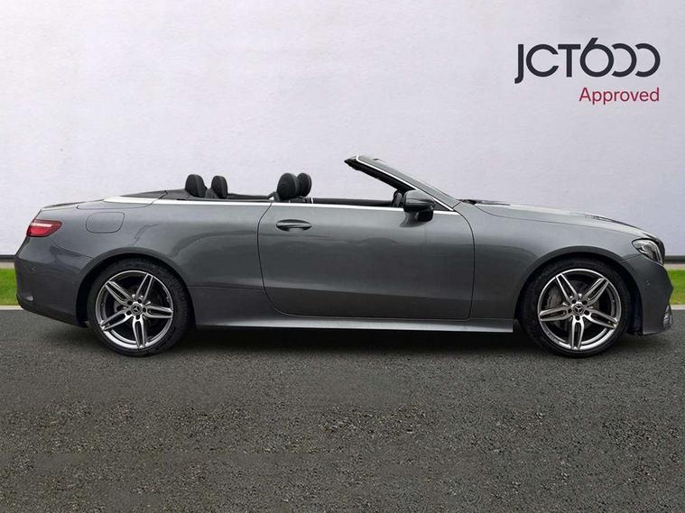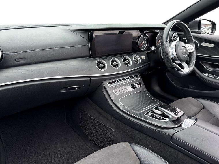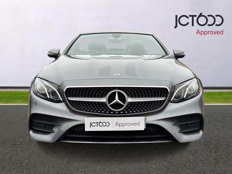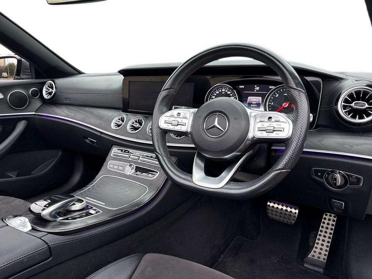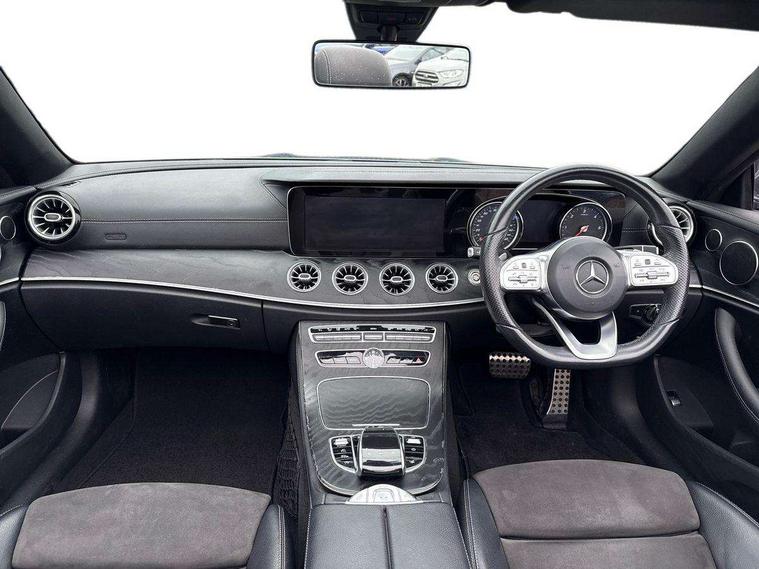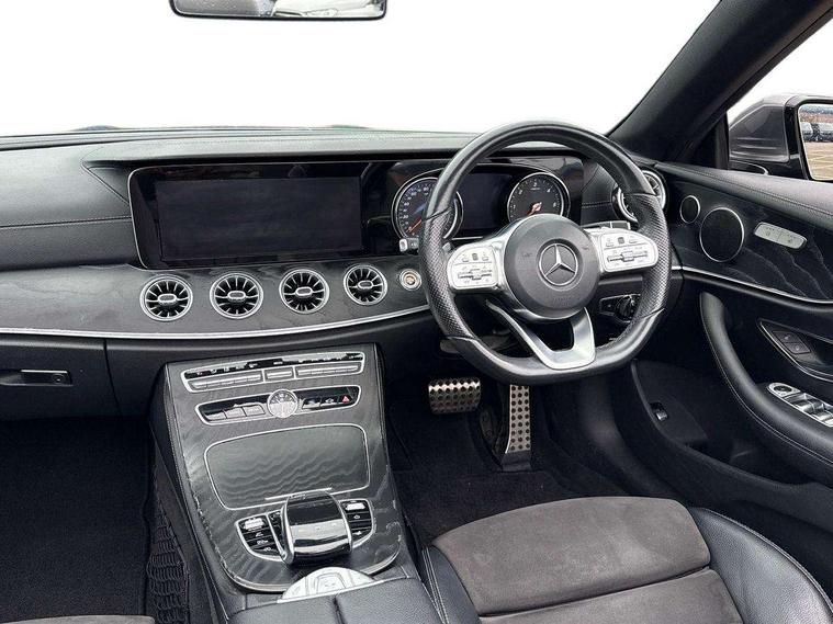 Active park assist with parktronic system, Analogue clock, Attention assist, Automatic boot separator, Bluetooth interface for hands free telephone, Brake wear warning light, Collision prevention assist plus, Direct steering, DYNAMIC SELECT with a choice of driving modes (ECO, Comfort, Sport, Sport+ and Individual), Engine start/stop button, Instrument cluster with two tube-design round dials and 8.4-inch TFT multifunction display, Mercedes connect me, Multi function trip computer, Outside temperature display, Remote boot release, Service indicator (ASSYST PLUS), Touchpad with control wheel, Diesel particulate filter, Incorrect fuelling protection, 2 USB ports in centre console, Audio 20 with USB, touchpad and control wheel with Media Interface with Bluetooth interface and hands-free function, DAB Digital radio, Steering wheel mounted audio controls, Acoustic soft-top with enhanced climate and noise comfort, Adaptive brake lights, AIRCAP wind deflector, AMG bodystyling, AMG boot lid spoiler in body colour, AMG front, rear apron and side skirts, Automatic rain sensing wipers, Body colour door handles, Body coloured bumpers, Electric adjustable heated door mirrors, Electric front/rear windows with one touch/auto up/down, Electric soft-top with auto roll-over bar, Illuminated front door sill panels with Mercedes-Benz lettering, LED daytime running lights, LED Headlights, LED tail lights, Magic Vision Control heated windscreen wiper system, Polished aluminium upper window surround, Polished aluminium waistline, Twin exhaust pipes, 2 way rear head restraints, 3-spoke flat bottom multifunction AMG steering wheel with Touch Control buttons, trimmed in black nappa leather, 4 way adjustable front head restraints, 50/50 split folding rear seat, Airscarf - neck level heating, AMG floormats, Artico man-made leather upper dash trim, Bag hook in luggage compartment, Black roof lining, Centre armrest and door handle illumination, Child seat recognition sensor, Chrome door pins, Cupholders in centre console, Dual zone automatic climate control, Easy entry seats, Front and rear door pockets, Front centre armrest with storage compartment, Front footwell lights, Front seat back map pockets, Front seatbelt electric feeders, Heated front seats, Height/reach adjust steering wheel, Height/reach adjustable steering column, Illuminated air conditioned glovebox, Interior lighting - 64 colour Ambient lighting, Interior rear light/integral reading lights, Isofix rear child seat fastenings, Lockable glovebox, Multi contour front sports seats, Multi function steering wheel, Partial electric front seats/backrest/height adjust, Rear centre armrest with 2 cupholders + storage, Sports pedals with stainless steel surfaces and rubber studs, Steering wheel gearshift paddles, Storage net in luggage compartment, Stowage compartment with 12V socket, Sunglasses holder, Sunvisors with illuminated vanity mirrors, Twin front cupholders, Mirror pack - E Class, Seat comfort pack - E Class, 3 point seatbelts, ABS, Active bonnet, Active brake assist, Adaptive brake system, Adaptive driver and front passenger airbags, Crash sensor (auto door unlocking), Drivers knee airbag, Electronic parking brake, ESP with ASR, Front and rear window airbags, Front seatbelt pretensioners, Front side airbags, Head airbags, Hill hold function, Perforated front brake discs with "Mercedes-Benz" lettering, Seat occupancy sensor, Seatbelt warning, Tyre pressure monitoring system, Warning triangle and first aid kit, Alarm system/interior protection/immobiliser, Chrome surround electric key, Keyless Go access/ignition system, Remote central locking, Open pore black ash wood centre console, Run flat tyres,