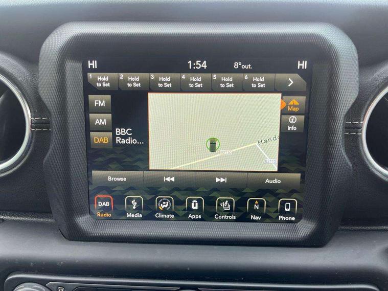 Active speed limiting device, Apple car play/Android Auto, Emergency response assistance system, Exterior temperature gauge, Instrument cluster with 7" colour TFT Display, Parksense rear park assist system, Parkview rear backup camera, Power Steering, Trip computer, Uconnect 8.4" with navigation with DAB+ Radio, Uconnect live - Europe, Vehicle information centre, Alpine premium audio system with subwoofer + 9 speakers, Steering wheel mounted audio controls, USB port, Auto dimming rear view mirror, Automatic headlights, Black door mirrors, Body colour fender flares, Body colour front grille, Daytime running lamp system, Deep tint sunscreen glass, Headlamp levelling, Headlamp off time delay, LED fog lights, LED tail lamp, Power adjustable heated door mirrors, Power front windows with one touch, Premium LED headlamps, Tow hooks, Tubular side steps, Windshield wipers with intermittent and variable, 12V auxiliary power outlet in centre console, 12V auxiliary power outlet in rear, 2 way manual adjustable drivers lumbar support, 4 way manually adjustable passenger seat with height, reach, tilt, backrest and headrest, 6 way manually adjustable drivers seat, 60/40 split folding rear seat, Cargo compartment floor mat, Centre console storage, Climate control, Cloth upholstery with bucket seats + jeep logo, Front centre armrest, Front headrests, Illuminated front cupholders, Isofix child seat preparation, Leather wrapped steering wheel with shift knob, LED ambient lighting, Lockable glovebox, Rear compartment storage system, Rear headrests, Rear luggage cover, Reclining front seats, Storage nets, Storage trays, Sunvisors with illuminated vanity mirrors, Tilt adjustable steering column, 3x3 point rear seatbelts, ABS, Driver / front passenger multi stage airbags, Electronic stability control, Front side airbags, Hill descent control, Hill start assist, Traction control, Tyre pressure monitoring warning lamp, Keyless entry, Keyless go with 'push to start' button, Locking fuel filler cap, Locking wheel nuts, Premium security alarm, 18" Polished alloy wheels with grey spokes, Full size spare wheel, Vinyl spare wheel Cover,