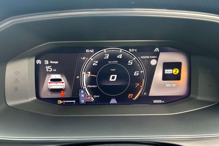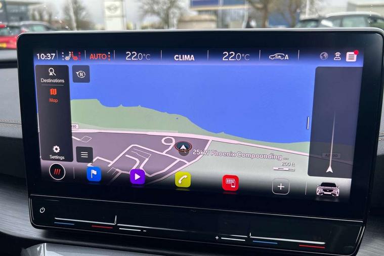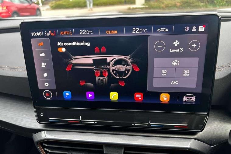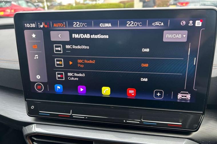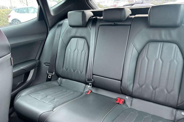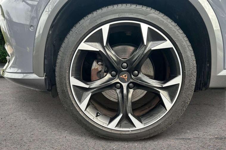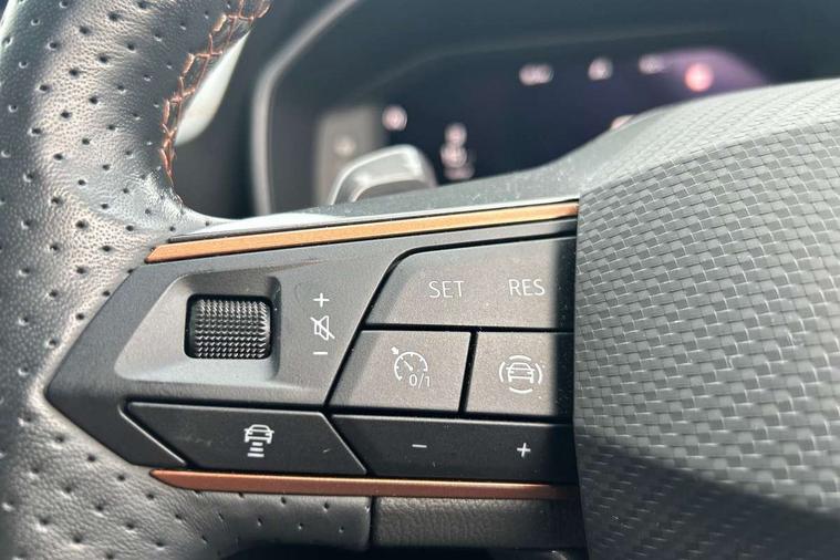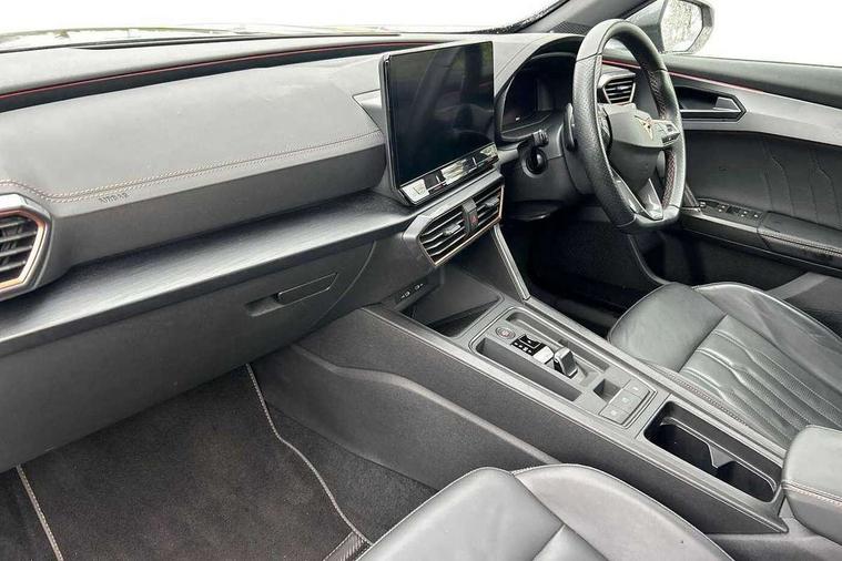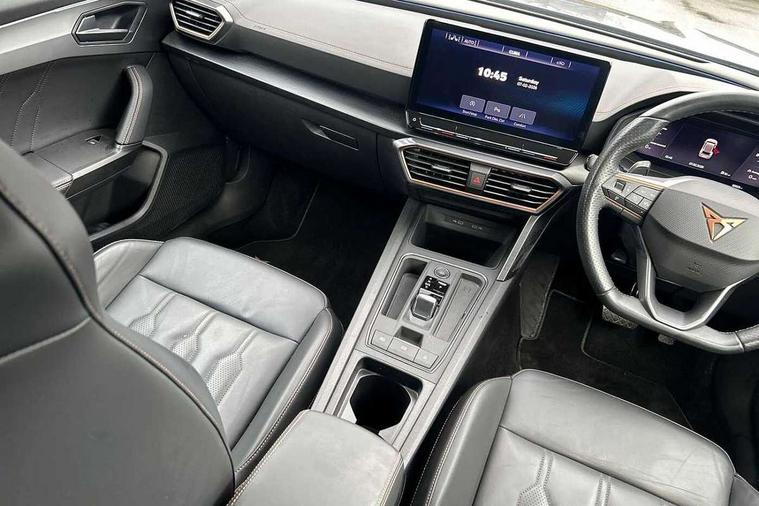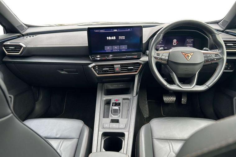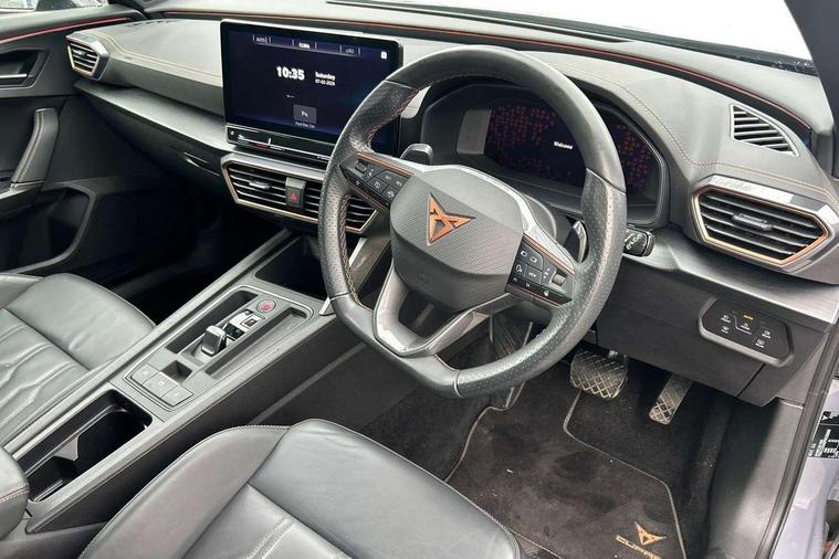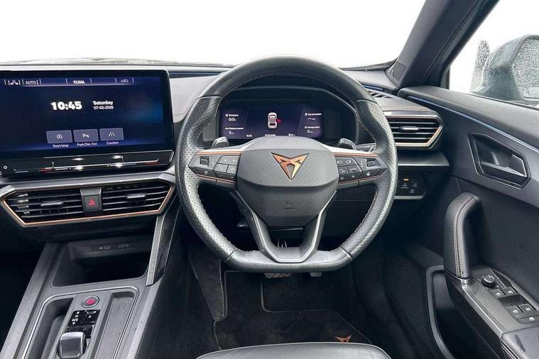 Digital cockpit and configurable dashboard, Driver alert system, Driving profile selection, Forward collision warning with automatic braking, Lane assist, Navigation system with 12'' Touchscreen Display, Park assist (inc front/rear parking sensors), PAS, Predictive adaptive cruise control with speed limiter, Rear view camera, RPM, trip computer, outside temp gauge, instrument light brightness, low fuel warning light, lights on reminder, gearshift indicator, Service interval indicator, Start/stop system with regenerative braking, Voice control system, Wireless apple carplay, Wireless phone charger, Electronic locking differential and dynamic traction support, Standard suspension, 2 front and 2 rear USB type C sockets, Auxiliary input socket, DAB radio, Auto dimming rear view mirror, Body colour door handles, Body coloured bumpers, Dark grey wing mirror, Daytime running light with automatic headlight control and coming home feature, Dynamic headlight range control, Electric front/rear windows, Electrically adjustable heated and folding door mirrors with memory function, Front fog lamps with cornering function, Gloss black roof rails and window surrounds, LED Headlights, LED Taillights with dynamic indicator, Rain sensing wipers, Rear diffuser with black simulated exhaust pipes, Rear side wing doors, Rear wash/wipe, Third brake light, Tinted rear windows, Welcome lights, 12v power supply in centre console, 12V socket, 12v socket in loadspace, 2 front and 2 rear reading lights, 230V socket, 3 seat bench in 2nd row, 60/40 split rear bench seat with armrest and mechanical seat release, Black headlining, Dust/pollen filter, Front and rear head restraints, Front centre armrest, Height/reach adjust steering wheel, Illuminated interior front door sills, Illuminated sunvisor with mirror, Isofix, Leather multi function heated steering wheel with gear shift paddles, Luggage tie-down hooks, Single front passenger seat, Three zone climate control with control panel in rear, Variable luggage/load compartment floor, Wraparound lighting, Genuine Nappa leather Pack - Cupra, 3 point seatbelts on all rear seats, ABS, Brake control system - ESC and brake booster, Child proof door locks, Driver and front passenger airbags with front passenger airbag de-activation, Electronic parking brake, Front and rear disc brakes, Front side curtain airbags, Hill hold control, Public e-call, Seat belt reminder for front and rear seats, Tyre pressure monitoring system, Anti theft alarm system, Keyless entry and start system (KESSY), Locking wheel bolts, Copper and aluminium interior detailing, 19" 'Exclusive' machined sport matte black and silver alloy wheels,