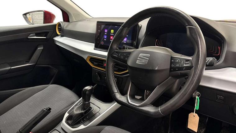 'Lights On' Reminder warning buzzer, 8" Digital cockpit, Cruise control and speed limiter, Digital clock, E-call, Electric speed sensitive power steering, Full Link Smartphone Integration with Mirror Link, Apple Car Play, Google Android Auto with USB Type C cable for Apple and Android compatibility, Lane keeping system, Low fuel warning light, Outside temperature display, Rear parking sensor, RPM counter, Seat connect with safety, service, remote and online, Trip computer, Wireless phone charger, 9.2" colour touchscreen with navigation system, voice control and USB port (type c), Bluetooth interface for hands free and audio streaming, DAB digital radio and AM/FM radio, Steering wheel mounted audio controls, Anti theft roof antenna, Automatic activation of hazard warning lights, Black roof rails and window surrounds, Body coloured bumpers, Body coloured door handle inserts, Body coloured door mirrors, Dimming rear view mirror, ECO LED automatic headlights and LED daytime running lights, Electric adjustable door mirrors, Electric front/rear windows, Hidden exhaust pipe, Licence plate lights, Protective side mouldings, Rain sensing wipers, Rear fog lights, Rear side wing doors, Rear spoiler, Rear window wash/wipe, Third brake light, Visible VIN plate, Windshield wiper with intermittent control and potentiometer, 2 cupholders, 3 seat bench in 2nd row, 60/40 split folding rear seat, Air conditioning, Cloth upholstery, Double boot floor, Driver sunvisor with covered mirror + card holder, Dust/pollen filter, Front courtesy light with front reading lights, Gear shift indicator, Grey interior roof, Height adjustable front seats, Height/reach adjustable steering column, Illuminated boot, Instrument lighting with brightness control, ISOFIX points in outer rear seats with top tether anchorage points, Leather steering wheel/gear knob/handbrake, Passenger sunvisor with vanity mirror, Single front passenger seat, Two front and three rear height adjustable headrests, Interior chrome pack - Arona, 3 point seatbelts on all rear seats, ABS, Active front headrests, Child locks on rear doors, Driver and front passenger airbags with front passenger airbag de activation, front side and curtain airbags, Electronic stability control, Emergency Brake Assist (EBA) and front assist, Front and rear seatbelt reminder, Hill hold control, Multi-Collision braking, Tiredness recognition system, Traction control, Tyre pressure monitoring system, Electronic engine immobiliser, Locking wheel bolts, Remote central locking + deadlocks, Titan black dashboard, 17" Dynamic machined alloy wheels,