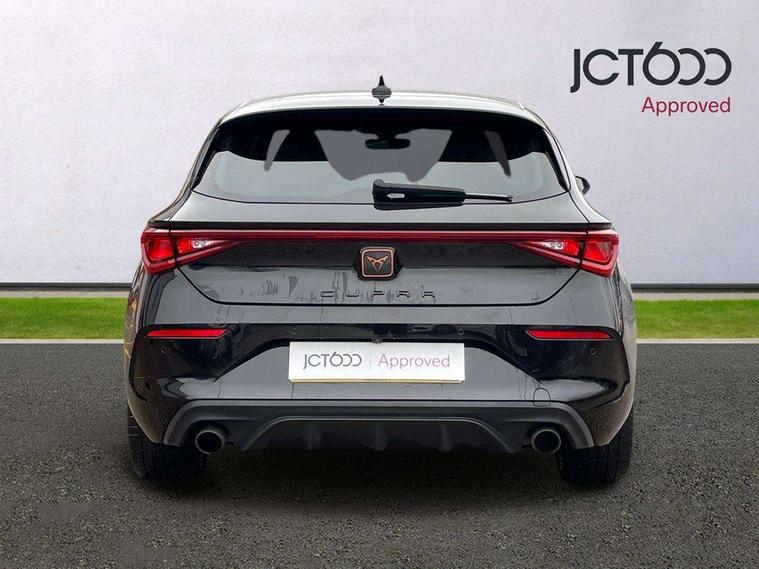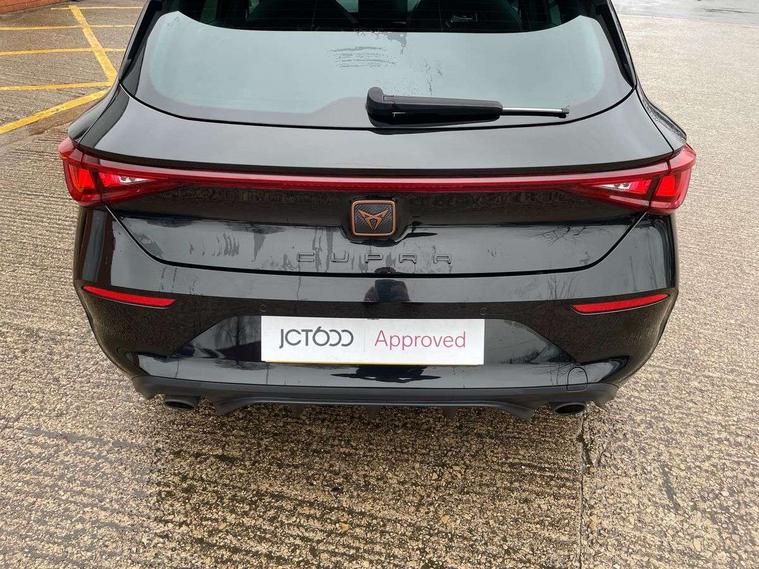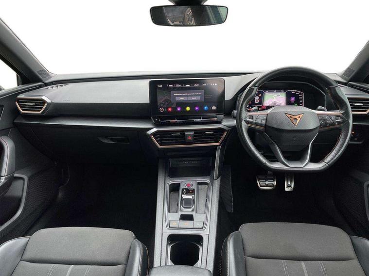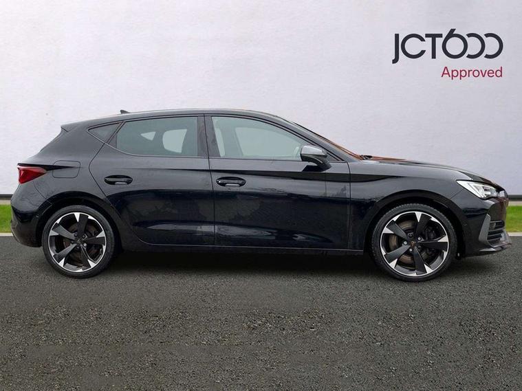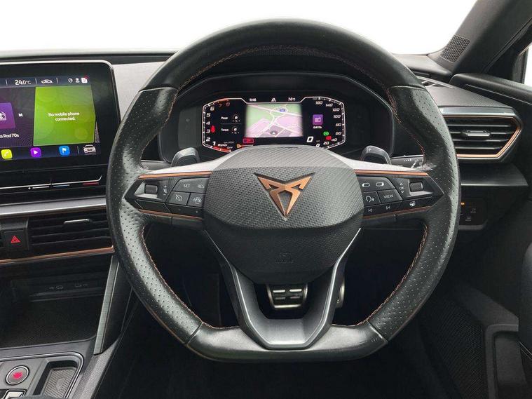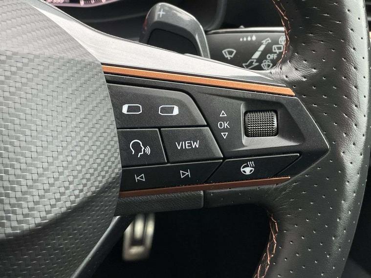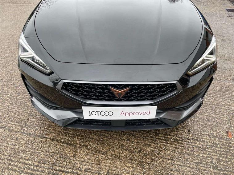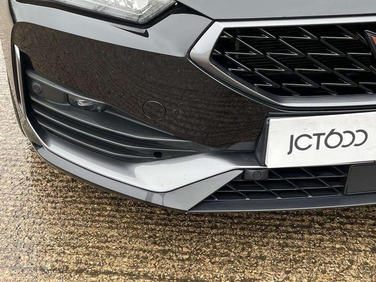 CUPRA drive profile selection with 4 modes (Comfort/Cupra/Sport/Individual), throttle response and gearshift mode, Digital cockpit, E-call, Electro mechanical speed sensitive power steering, Front assist with forward collision warning braking reaction to vehicles, pedestrians and cyclists, Full link smartphone integration with Mirror Link, wireless Apple CarPlay and wired Google Android Auto, Lane assist, Lockable tailgate, Park assist (inc front/rear parking sensors), Rear view camera, RPM, trip computer, outside temp gauge, instrument light brightness, low fuel warning light, lights on reminder, gearshift indicator, Service interval indicator, Start/stop system with regenerative braking, Sports suspension, XDS electronic differential lock and dynamic traction support, 7 speakers, Auxiliary input socket, Auto dimming rear view mirror, Body colour door handles, Body coloured bumpers, Cupra sports bumpers, Dark tinted rear windows, Electric front/rear windows, Electrically adjustable, heated and folding door mirrors, LED front fog lamps with cornering function, LED headlights and tail lights with dynamic turn signals, welcome light silhouette from exterior mirrors and dynamic headlight range control, LED rear fog lamp, Rain sensing wipers, Rear coast to coast lighting, Rear diffuser with twin exhaust pipe on each side, Rear side wing doors, Rear wash/wipe, Separate daytime running light with automatic headlight control and coming home feature, Third brake light, 12v power supply in centre console, 3 seat bench in 2nd row, 5 headrests, 60/40 split rear bench seat with armrest, Ambient lighting (glovebox, footwell, ambient lighting multicoloured), Black headlining, CUPRA Leather flat bottomed, heated, perforated steering and gearshift paddles, Cupra sports pedals, Driver/passenger manual seat height adjustment, Dust/pollen filter, Folding boot cover, Four x USB Type C ports, Front and rear reading lights X 4, Front centre armrest, Front seats manual lumbar adjustment, Height/reach adjust steering wheel, Illuminated interior front door sills, Interior wraparound lighting, ISOFIX points in outer rear seats with top tether anchorage points, Jack and tool kit, Luggage tie-down hooks, PVC/Cloth upholstery with copper stitching + Cupra embossed logo on headrest, Single front passenger seat, Sports bucket seats, Storage pockets on rear of front seats, Sunvisors with illuminated mirror, Three zone climate control, Media system plus with navigation pack - Leon Cupra, 3 point seatbelts on all rear seats, ABS, Brake control system - ESC and brake booster, Child proof door locks, Cupra black brake calipers, Driver and front passenger airbags with front passenger airbag de-activation, front side and curtain airbags, Electronic parking brake, Extended safety system - seat belt tensioner, window closure and hazard lights, Hill hold control, Rear disc brakes, Seat belt reminder for front and rear seats, Tiredness recognition system, Tyre pressure monitoring system, Anti theft alarm system with interior monitoring in cab, backup horn and towing protection, KESSY Advanced - Keyless start, keyless entry, Locking wheel bolts, Chrome and copper interior detailing, 18" Machined sport black and silver alloy wheels with 92Y tyres, Space saver spare wheel,