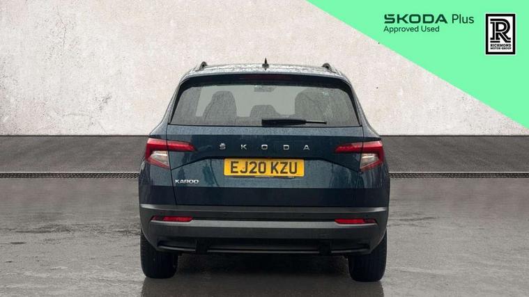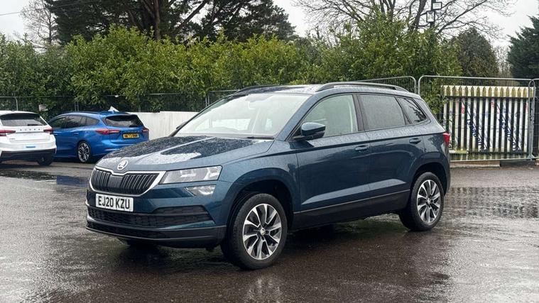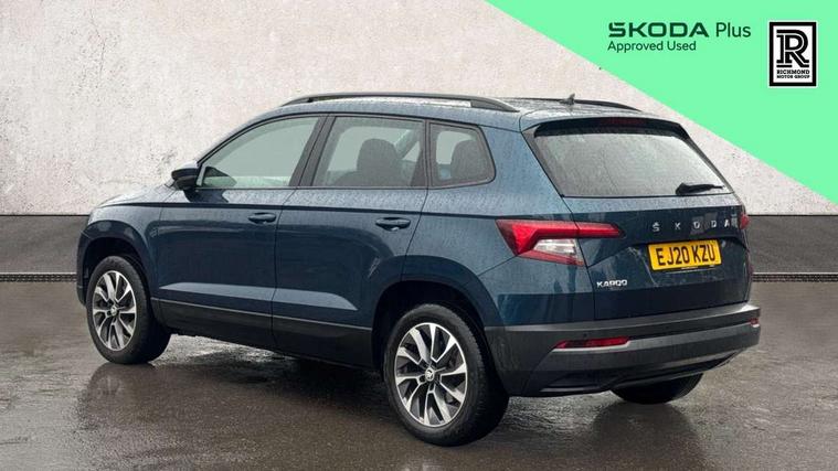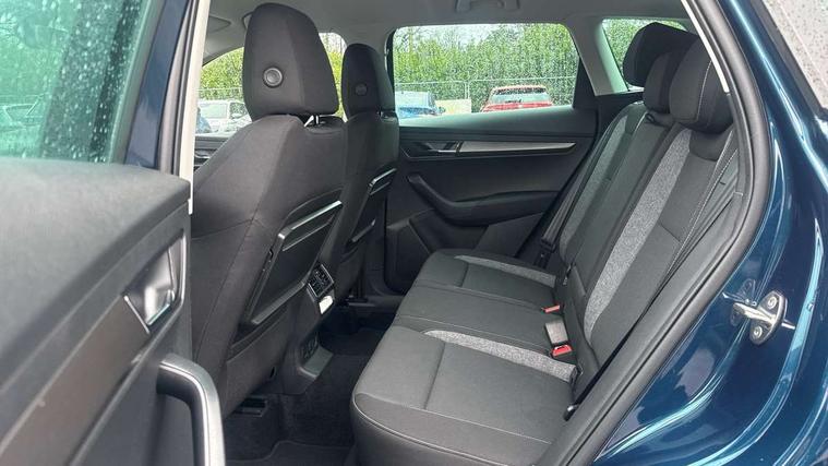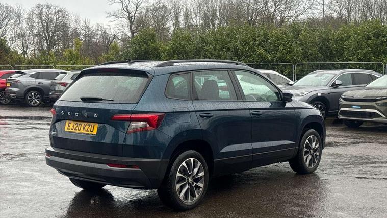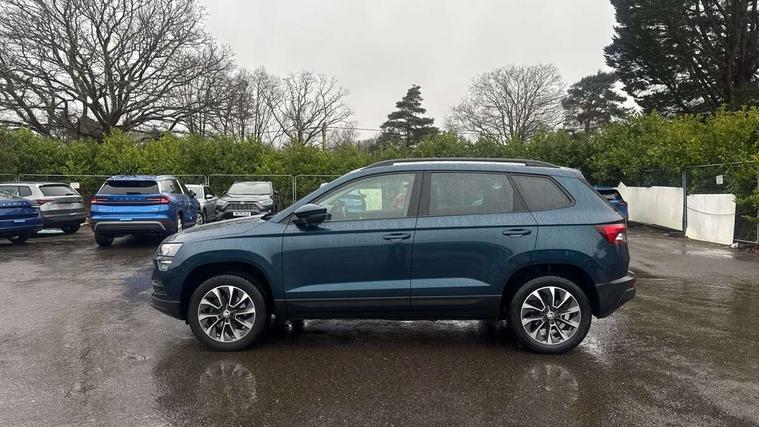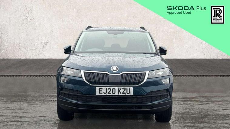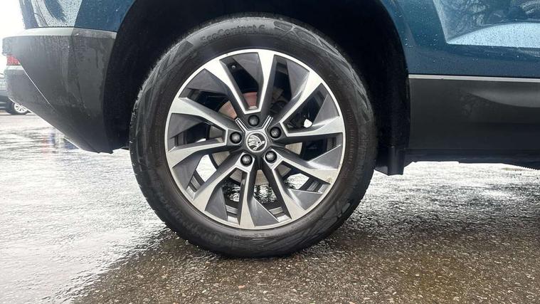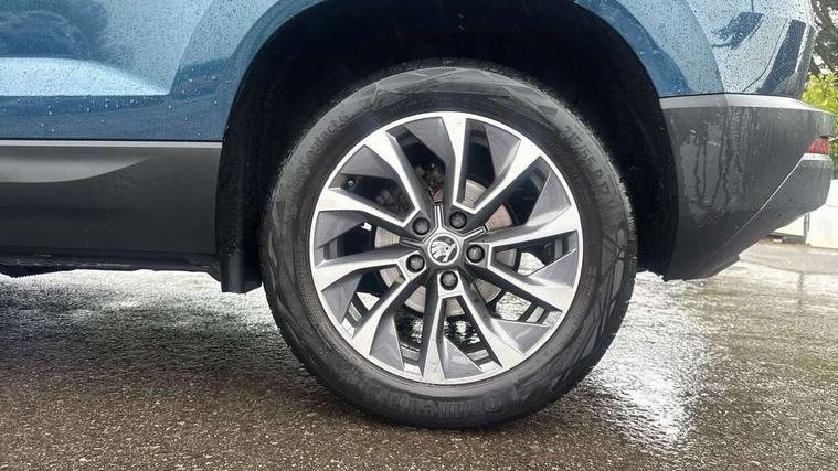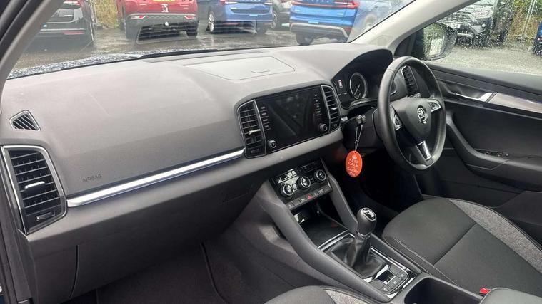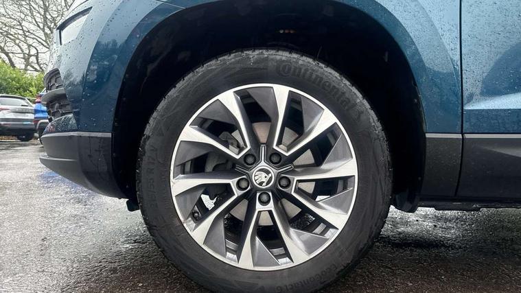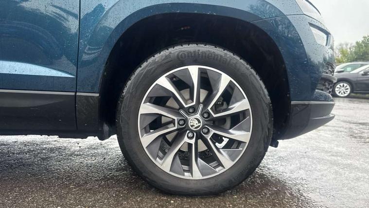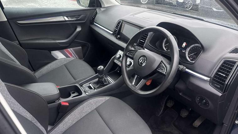 Amundsen satellite navigation with 8" touchscreen display with maps Europe, WLAN and web radio, Care connect, Driver alert system, Driver fatigue sensor, Driver profile selection, Electro-mechanical PAS, Multifunction colour trip computer, Outside temperature gauge, Rear view camera, Service interval indicator, SmartLink + wireless for Apple and wired for Android, Start/stop system with regenerative braking, USB C Port x 2 in front centre console, DAB radio with Bluetooth, SD card slot, USB connection, Acoustic glass, Aero front windscreen wipers with intermittent function, Automatic headlight control system, Black electric window control buttons, Body colour door mirrors and handles, Body coloured bumpers, Doors steps in front with Karoq badging, Electric front and rear windows with child proof lock, Electrically adjustable heated folding and auto dimming door mirrors, Heated rear windscreen, LED rear lights with high functionality, Light assistant (coming/leaving home/tunnel light), Privacy glass, Safety reflectors on front doors, Third brake light, 1.5 litre bottle holders in driver and front passenger door panels, 12V socket in boot, 12v socket in front centre armrest with storage compartment and rear air vents, 2 Folding hooks and nets in boot, 2 Front readings lights for driver and passenger, 3 rear height adjustable headrests, 4 foldable roof handles with rear coat hooks, 4 lashing points on luggage floor, Backrest release, Cargo elements in boot, Chrome inner door handles, Driver and passenger seats height adjust, Fabric upholstery, Folding tables on the front seat backrests, Front head restraints, Front seat and rear pockets, Height adjustable front three point seats belts with tensioners, Height/reach adjust steering wheel, Ice scraper, Illuminated and cooled glovebox, Illuminated luggage compartment, Isofix child seat preparation outer rear, Manual lumbar support for front seats, Net programme in boot, Pen holder, Pollen filter, Rear boot cover, Rear reading lights, Rear seats fixed folding and divided 60:40, Safety vest holder, Storage box in upper central dashboard closed, Sunvisors with illuminated vanity mirrors, Textile floor mats, Umbrella under passenger seat, LED Interior lighting pack with Skoda welcome logo - Karoq, Airbags - Front side, head, knee and curtain, Automatic door unlocking in case of crash, Automatic fuel cut off in case of crash, Driver airbag, Electronic parking brake with auto hold function, Emergency rear braking signal, ESC including ABS, MSR, ASR, EDS, HBA, DSR, RBS, MKB and traction control, Front assist radar scanning of the space in front of the car with automatic braking, Hill hold control, Passenger airbag with switch-off function, Pedestrian monitor, Seatbelt reminder signalisation and pretensioner for all seats, Three point seatbelts rear, Two tone horn, Tyre pressure display, Tyre pressure monitor, Alarm with interior monitoring, back up horn and tilt sensor with safe function, Electronic engine immobiliser, Remote central locking with 2 remote folding keys, Chrome framed air vents, 17" Aero alloy wheels with anti theft wheel bolts, Storage on wheel cover,