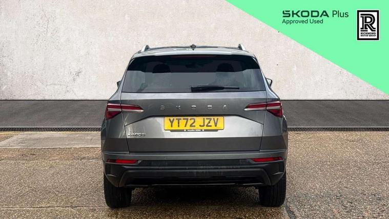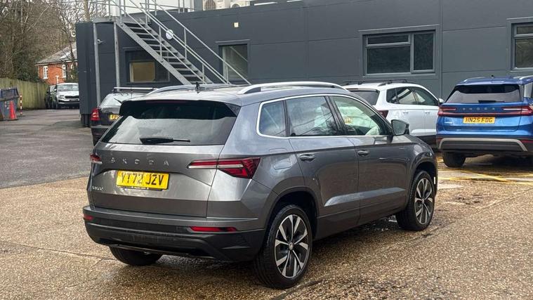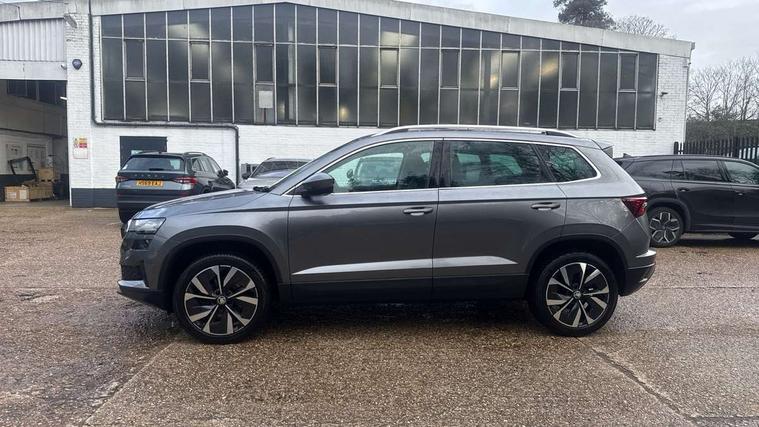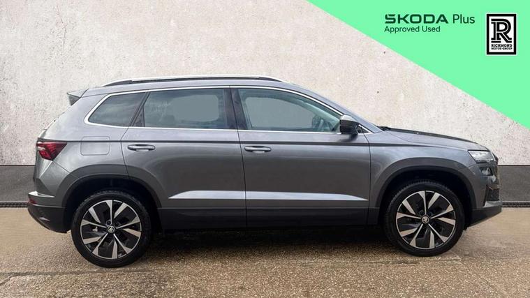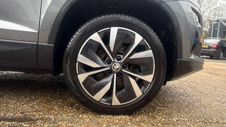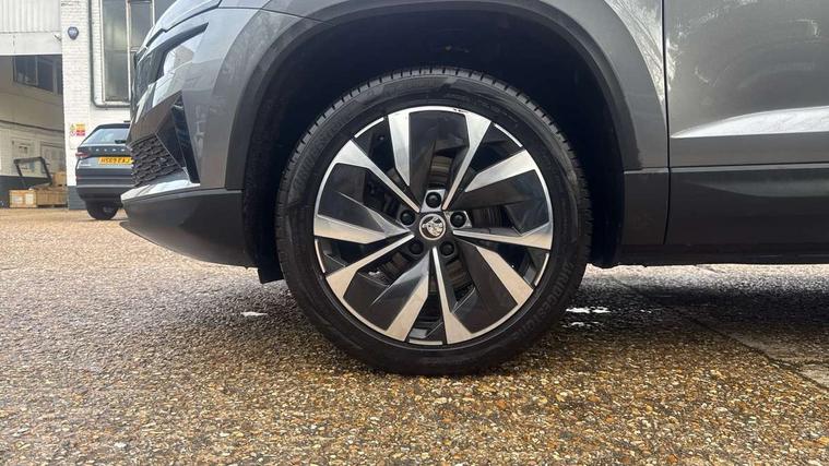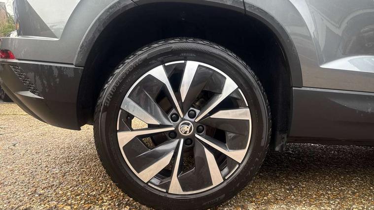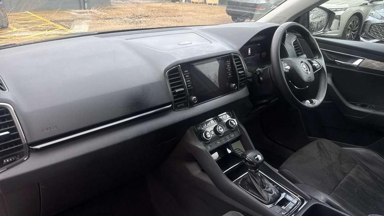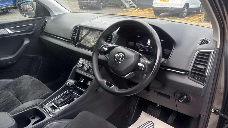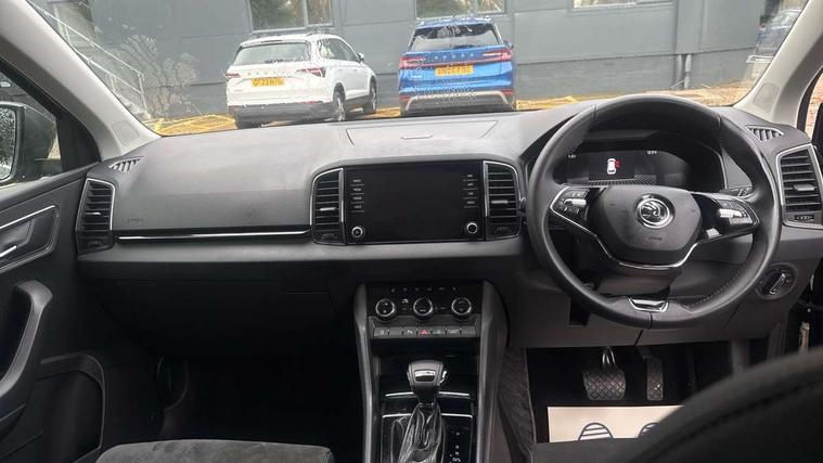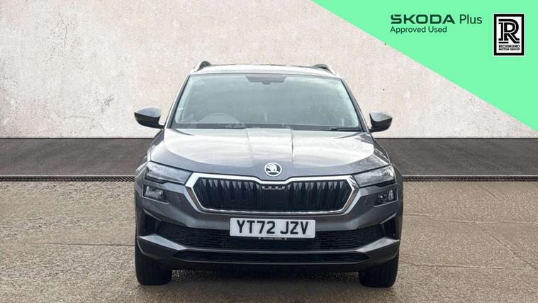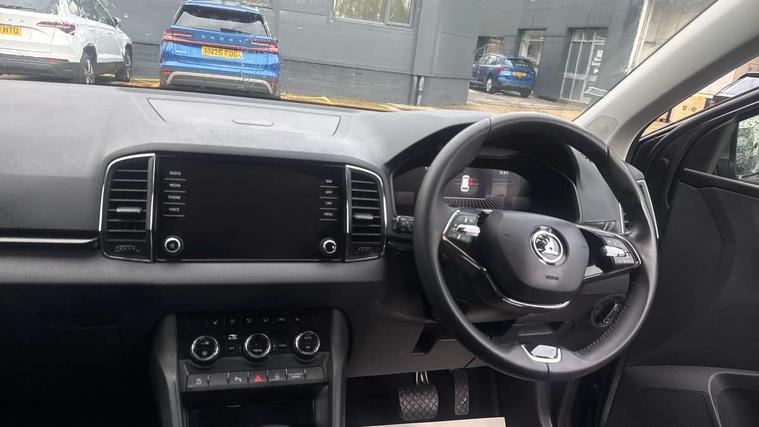 8" Digital display, Care connect, Colour multifunction trip computer, Driver fatigue sensor, Emergency services call system, Outside temperature gauge, Service interval indicator, SmartLink wireless for Apple and wired for Android, Start/stop system with regenerative braking, USB C Port x 2 in front centre console, 8 Speakers, DAB radio with Bluetooth, USB connection, Acoustic glass, Aero front windscreen wipers with intermittent function, Auto dimming rear view mirror with light and rain sensors, Automatic headlight control system, Black electric window control buttons, Body colour door mirrors and handles, Electric front and rear windows with child proof lock, Heated rear windscreen, LED daytime running lights, LED rear lights with high functionality welcome effect and dynamic indicators, Light assistant (coming/leaving home/tunnel light), Plastic scuff plates, Privacy glass, Rear side wing doors, Rear spoiler, Rear window wiper with washer system and intermittent control, Safety reflectors on front doors, 1.5 litre bottle holders in driver and front passenger door panels, 12V socket in boot, 12v socket in front centre armrest with storage compartment and rear air vents, 2 Folding hooks and nets in boot, 2 spoke leather heated multifunction steering wheel with DSG paddles, 2 x Tablet holder, 3 rear height adjustable headrests, 3 seat bench in 2nd row, 4 foldable roof handles with rear coat hooks, Black floor carpet, Chrome inner door handles, Decorative door sills with KAROQ badging, Double sided boot floor, Foldable hooks in the boot, Front head restraints, Height adjustable front three point seats belts with tensioners, Height/reach adjust steering wheel, Ice scraper, Illuminated glovebox, Illuminated luggage compartment, Isofix child seat preparation for front passenger seat, Isofix child seat preparation outer rear, Manual lumbar support for front seats, Pen holder, Pollen filter, Rear boot cover, Rear reading lights, Rubbish bin door, Safety vest holder, Single front passenger seat, Storage box in upper central dashboard closed, Sunvisors with illuminated vanity mirrors, Textile floor mats, Ticket holder, VarioFlex seats with standard rear seat release, Chrome roof rails + chrome pack - Karoq, Parking pack - Karoq, Automatic door unlocking in case of crash, Automatic fuel cut off in case of crash, Child locks on rear doors, Driver airbag, Electronic parking brake with auto hold function, Emergency rear braking signal, ESC including ABS, MSR, ASR, EDS, HBA, DSR, RBS, MKB and traction control, Front side airbags, Hill hold control, Knee airbags, Passenger airbag with switch-off function, Pedestrian monitor, Seatbelt reminder signalisation and pretensioner for all seats, Three point seatbelts rear, Two tone horn, Tyre pressure display, Tyre pressure monitor, Alarm with interior monitoring, back up horn and tilt sensor with safe function, Electronic engine immobiliser, Keyless entry and start/stop, Remote central locking with 2 remote folding keys, Chrome framed air vents, Anti-theft wheel bolts protection, Storage on wheel cover, Tool kit,