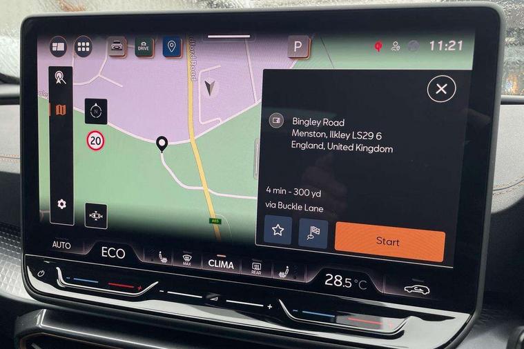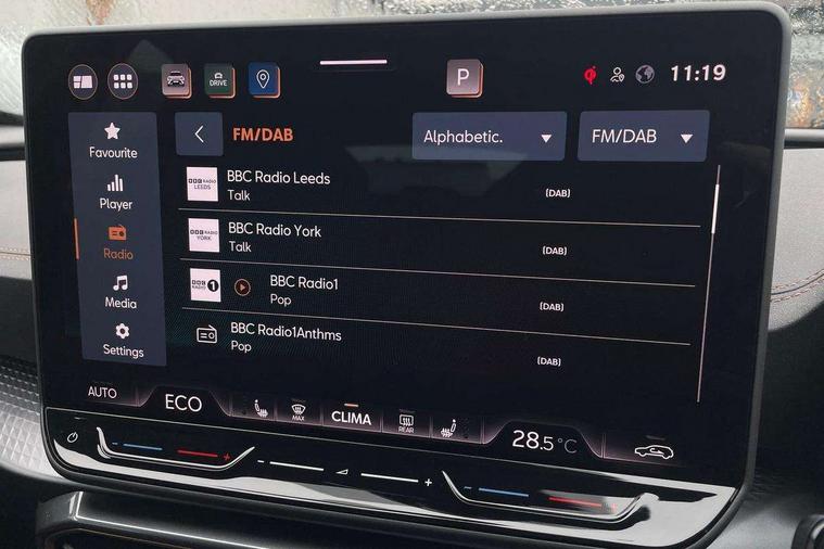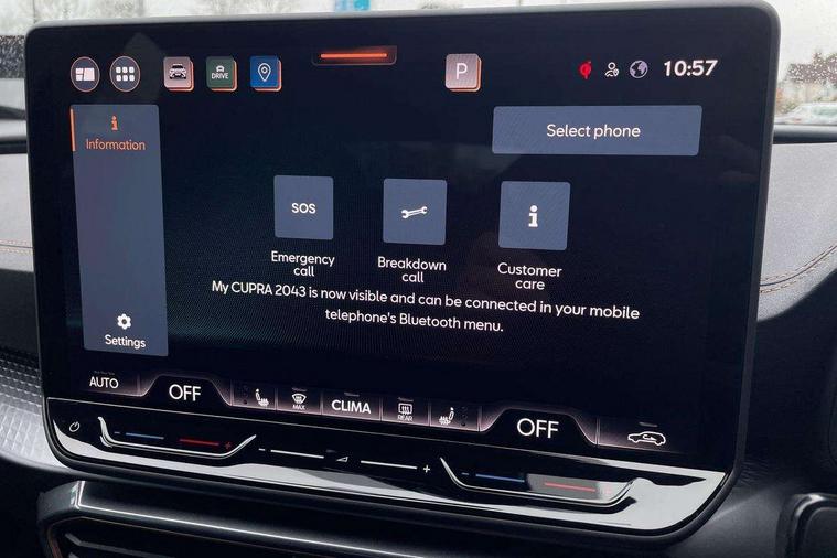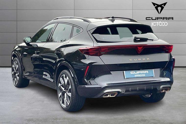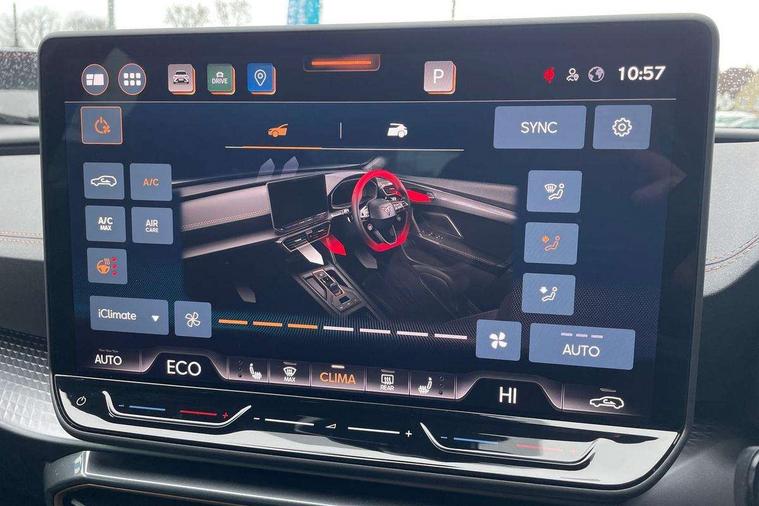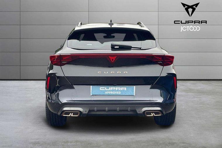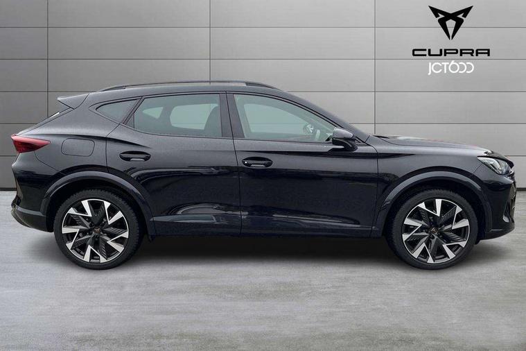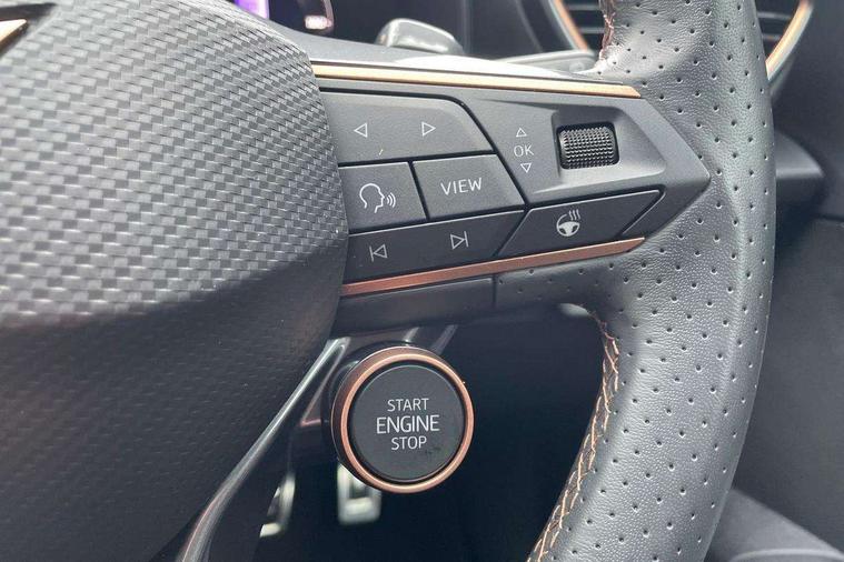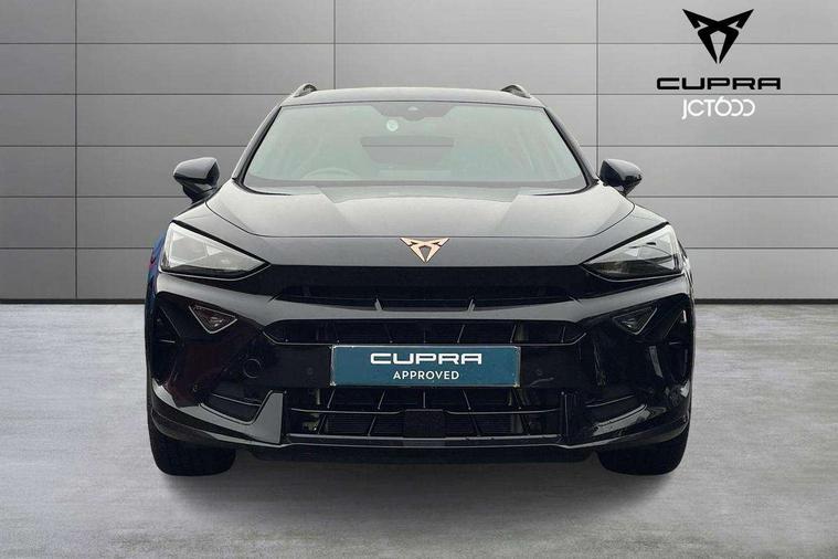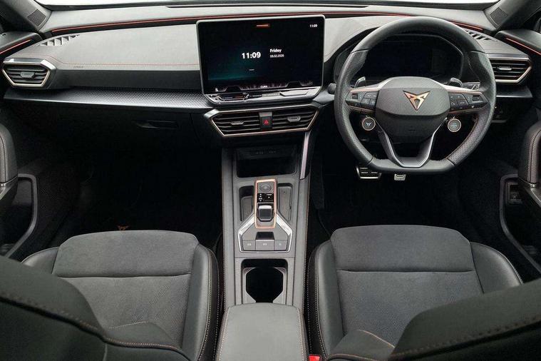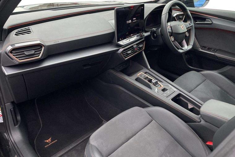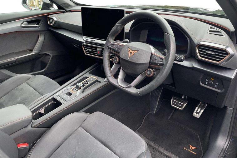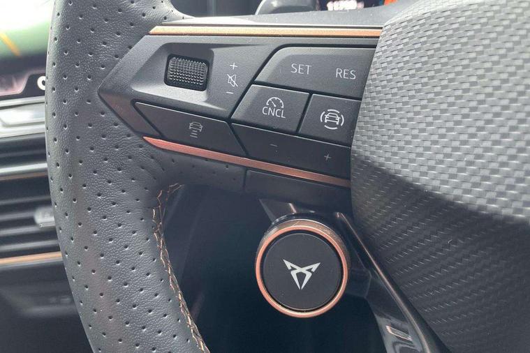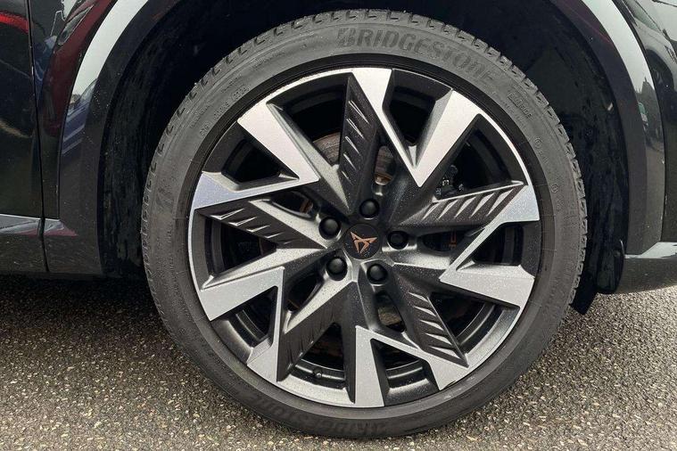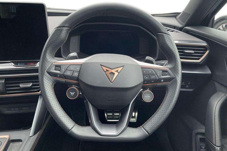 10.25" digital cockpit and configurable dashboard, Adaptive cruise control with follow-to-stop and speed limiter, Advanced driver alert system, Dynamic chassis control with driving profile selection (Comfort, Sport, CUPRA, Individual), Dynamic road sign display, Emergency steering support with turn assist, Forward collision warning with automatic braking, Front and rear parking sensors, Full link phone integration, Lane assist, Rear view camera, RPM, trip computer, outside temp gauge, instrument light brightness, low fuel warning light, lights on reminder, gearshift indicator, Service interval indicator, Speed sensitive power steering, Start/stop system with regenerative braking, Virtual pedal and electric tailgate, Voice control system, Wired Android Auto, Wireless apple carplay, Wireless phone charger, 10 amp mode 2 charging cable, 32 amp mode 3 charging cable, Adaptive chassis control with continuous operation, CUPRA sport suspension, Electronic locking differential and dynamic traction support, 2 front and 2 rear USB type C sockets, Media system with navigation, 12.9" touchscreen display, voice control, DAB, steering wheel mounted controls, Auto dimming rear view mirror, Body colour door handles, Body coloured bumpers, Dark grey wing mirror, Daytime running light with automatic headlight control and coming home feature, Door panel ambient lighting, Dynamic headlight range control, Electric front/rear windows, Electrically adjustable heated and folding door mirrors with memory function, Gloss black roof rails and window surrounds, High beam assist, LED 3rd brake light, LED front fog lamps with cornering function, LED Taillights with dynamic indicator, Matrix LED headlights with multifunction camera, Rain sensing wipers, Rear diffuser with copper simulated exhaust pipes, Rear fog lights, Rear side wing doors, Rear wash/wipe, Tinted rear windows, Welcome lights (within exterior mirror housing), 12V socket, 2 front and 2 rear reading lights, 3 seat bench in 2nd row, 60/40 split rear bench seat with armrest and mechanical seat release, Black headlining, Black interior roof lining, Cupra sports pedals, Dust/pollen filter, Electrically adjustable front seats with lumbar support and memory function, Front and rear head restraints, Front centre armrest, Heated front seats, Heated supersports multifunction leather steering wheel with satellite buttons and gear shift paddles, Height/reach adjust steering wheel, Illuminated aluminium doorsteps, Illuminated interior front door sills, Illuminated sunvisor with mirror, Isofix, Leather dashboard, door insert and side trim panel, LED smart wraparound lighting, PVC/Dinamica microfiber upholstery + bucket seats, Satellite steering wheel, Single front passenger seat, Storage pockets on rear of front seats, Three zone climate control with control panel in rear, 3 point seatbelts on all rear seats, ABS, Brake control system - ESC and brake booster, Child proof door locks, Driver and front passenger airbags with front passenger airbag de-activation, Electronic parking brake, Front and rear disc brakes, Front side curtain airbags, Hill hold control, Public e-call, Seat belt reminder for front and rear seats, Tyre pressure monitoring system, Anti theft alarm system, KESSY Advanced - Keyless start, keyless entry with SAFELOCK, Locking wheel bolts, Copper and aluminium interior detailing, 19" Sandstorm machined sport black and silver alloy wheels, Breakdown and tool kit,