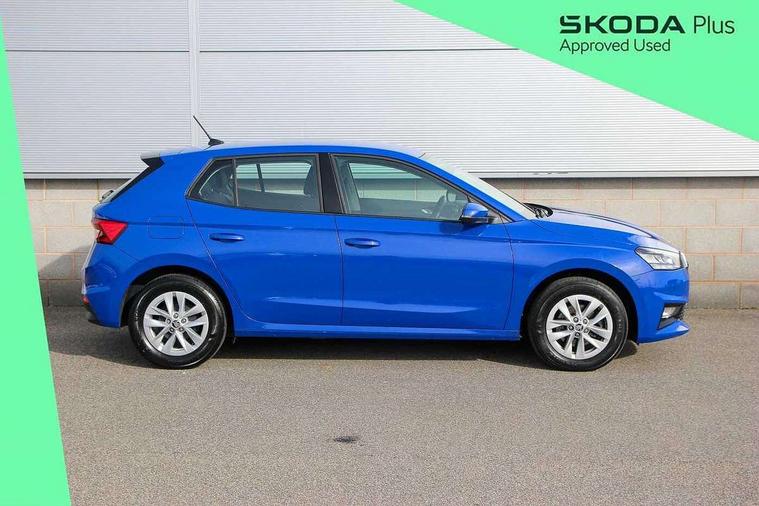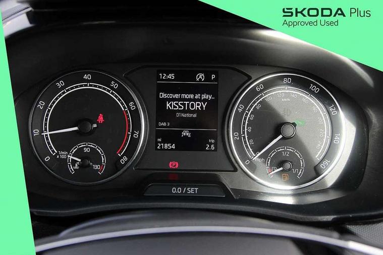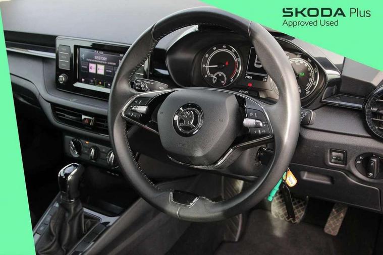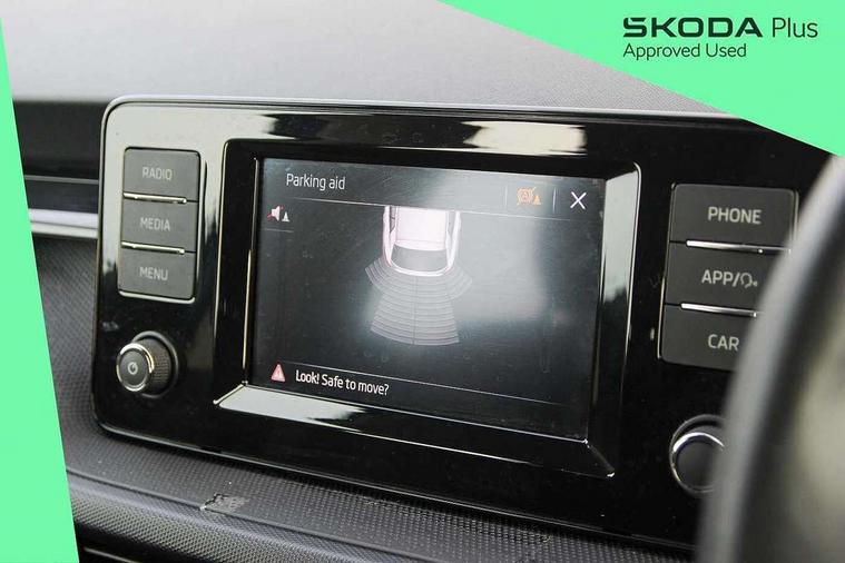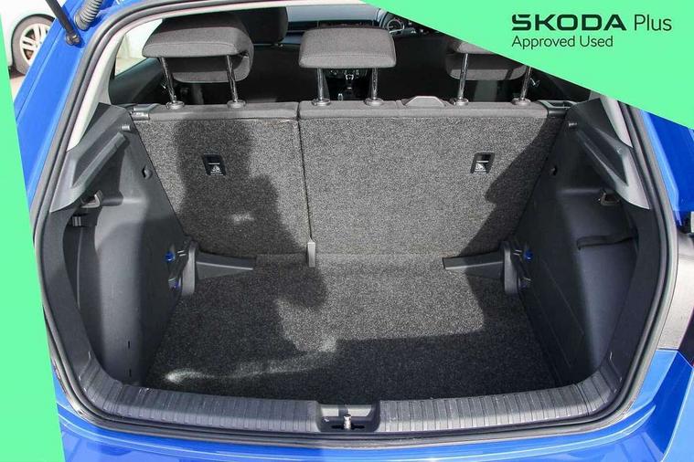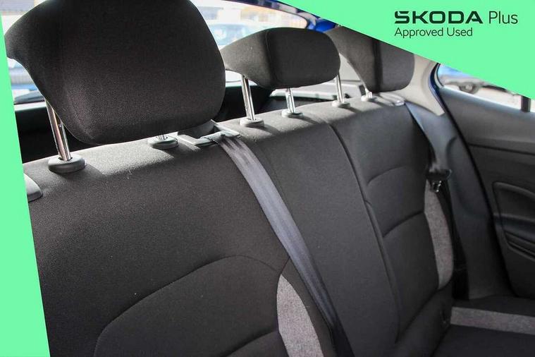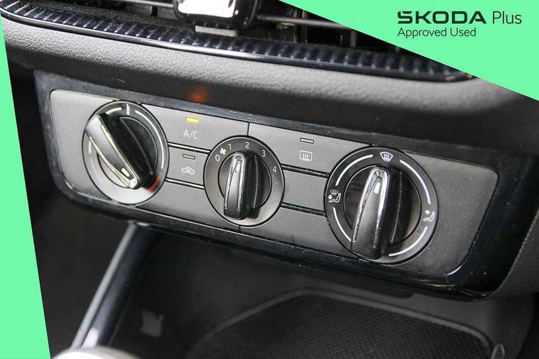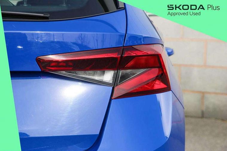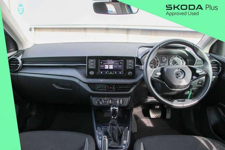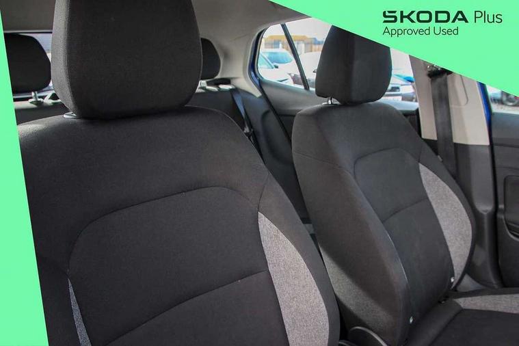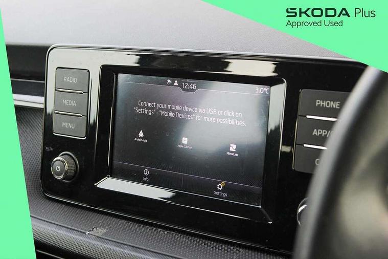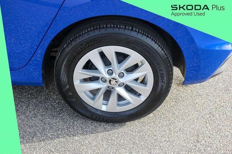 Bluetooth connection, Driver alert system - DAS, Electromechanical power steering, Exterior temperature gauge, Lane assist including road edge detection, Multifunction trip computer in black and white, Rear parking sensors, Service interval indicator, Speed limiter, 2x USB-C in the front (for data transmission and charging), 4 speakers in front, Auxiliary socket for external MP3 player, DAB digital radio reception, Radio Swing with 6.5" colour display, Basic LED Headlights, Basic rear lights, Body colour door mirrors, Body coloured bumpers, Dimming rear view mirror with black frame, Door mirror integrated indicators, Electrically adjustable and heated door mirrors, Electrically adjustable front windows with function auto up/down, Front fog lights, Front window wiper intermittent control, Headlight range control - Automatic, Ice scraper in fuel cap, LED daytime running lights with coming and leaving home feature, Mechanical adjustable rear windows, Rain sensor, Rear LED fog light, Rear side wing doors, Rear window wiper with washing nozzles, Roof mounted spoiler, SKODA tailgate lettering in chrome, Third brake light, 2 reading lights in front and 2 reading lights in rear, 2 spoke leather multifunction steering wheel, 3 rear headrests, Backrest split and folding, Central console with fixed cup holder and storage box, Chrome handbrake release button, Fabric upholstery, Gearshift knob/handle in leather, Grain satin black interior door handles, Hand brake lever handle in leather, Height adjustable front headrests, Height adjustable front seats, Height adjustable steering wheel, ISOFIX and TopTether anchorage points to the outer rear seats, ISOFIX and TopTether on the front passenger seat, Luggage compartment lighting, Manual air conditioning, Manually adjustable lumbar support in front seats, Pollen filter, Rear seat bench unsplit, Single front passenger seat, Storm grey headlining, Sun visors with mirror and airbag label on passenger side, Ticket holder, 3-point height adjustable front seats belts with pretensioner and force limiter, Automatic warning lights in case of crash, Driver and passengers airbag with switch off function, e-Call+, ESC including ABS, MSR, ASR, EDS, HBA and XDS, Front and rear seat belt warning, FRONT ASSIST (AEB City and AEB Inter Urban), Front side airbags, Head airbags, Hill hold assist, One tone horn, Pedestrian protection, Three rear 3-points safety seat belts with pretensioner and force limiter including stop function for outer rear seat belts, Tyre pressure monitoring system, Anti-theft alarm system including immobiliser, interior monitoring, backup horn, and towing protection, Central locking with radio remote control, interior controls, SAFE function and 2 foldable keys, Black painted air vents, Glossy black decorative trim, Grain satin black central console cover, Grain satin black lower decorative trim, Satin black door and side trim panel in front, Anti-theft wheel bolts protection, Super-low rolling resistance tyres,